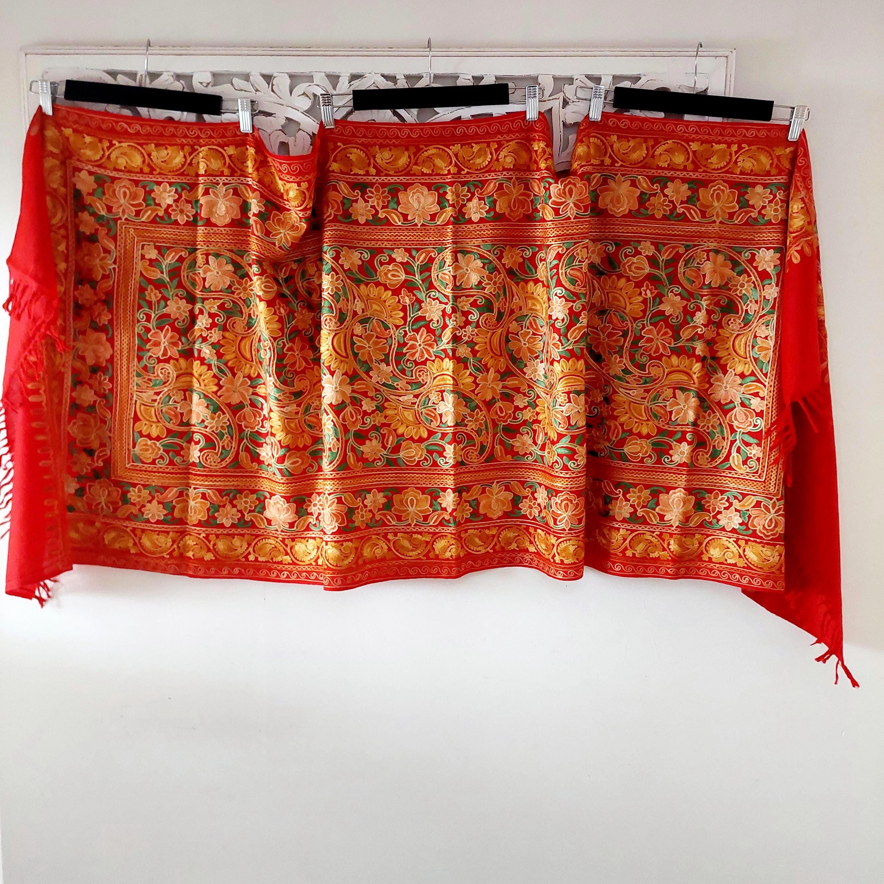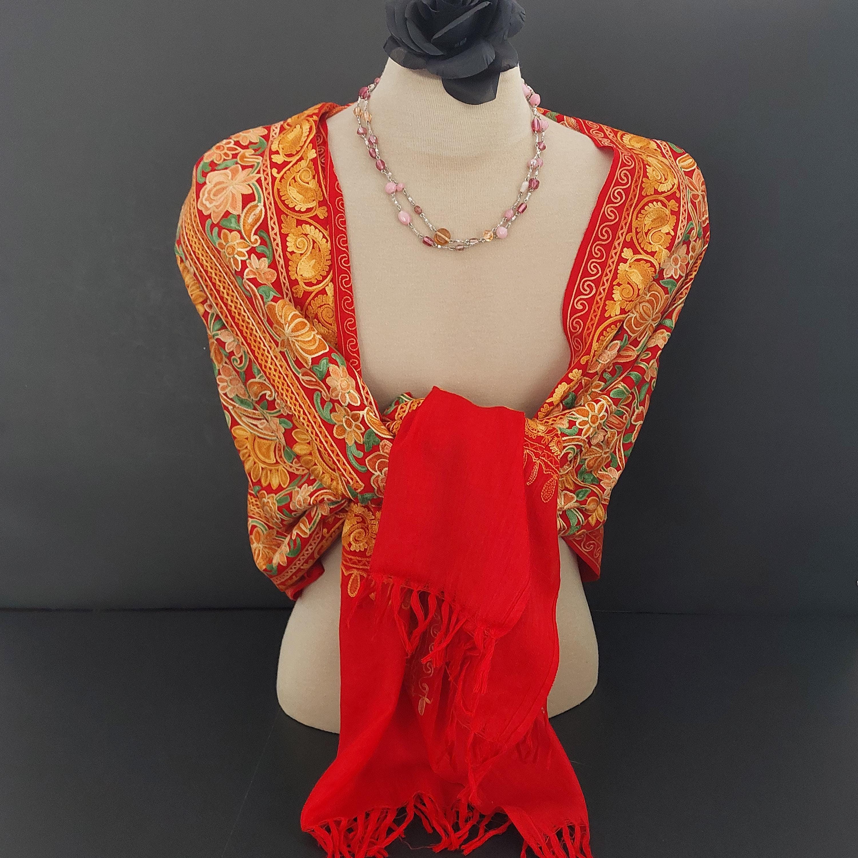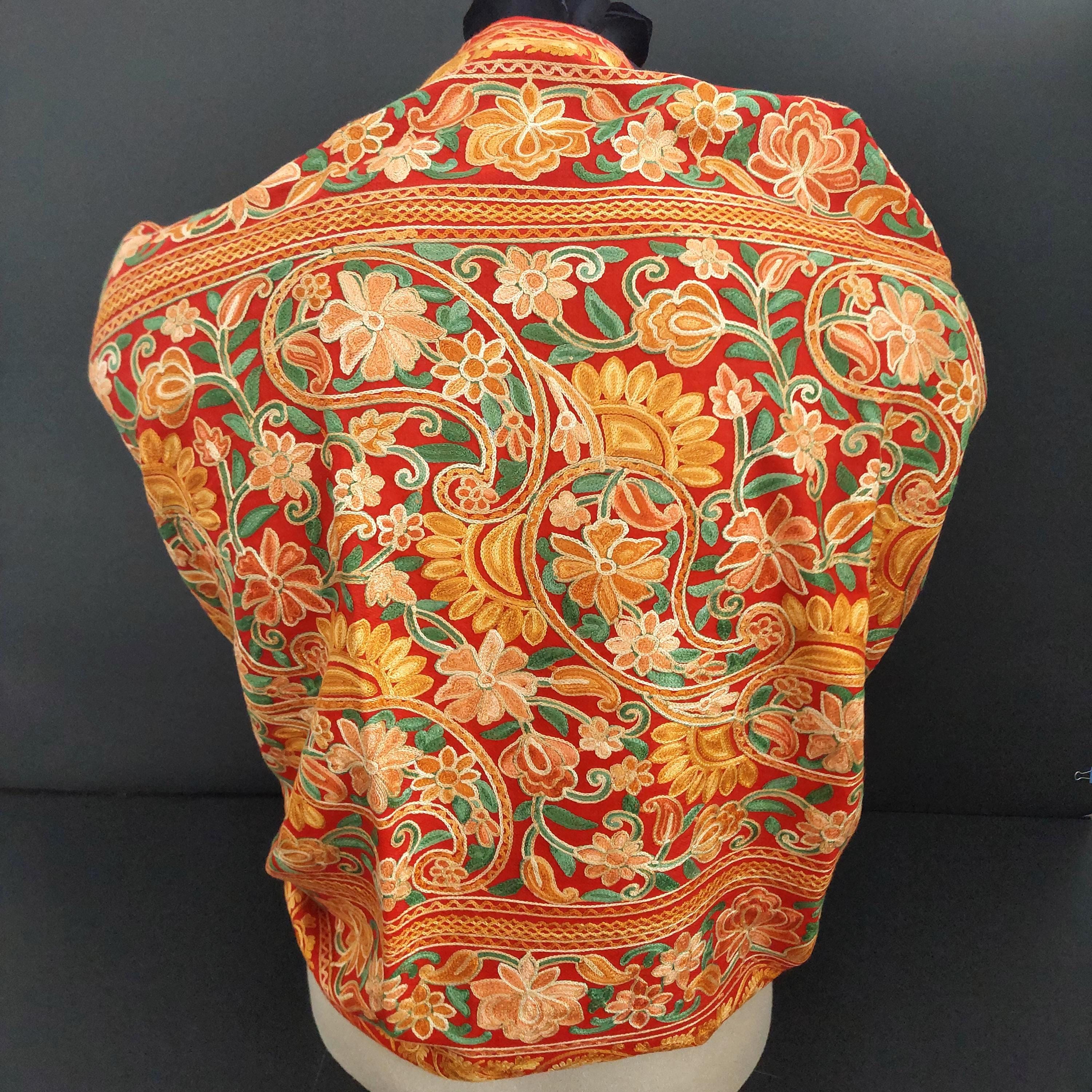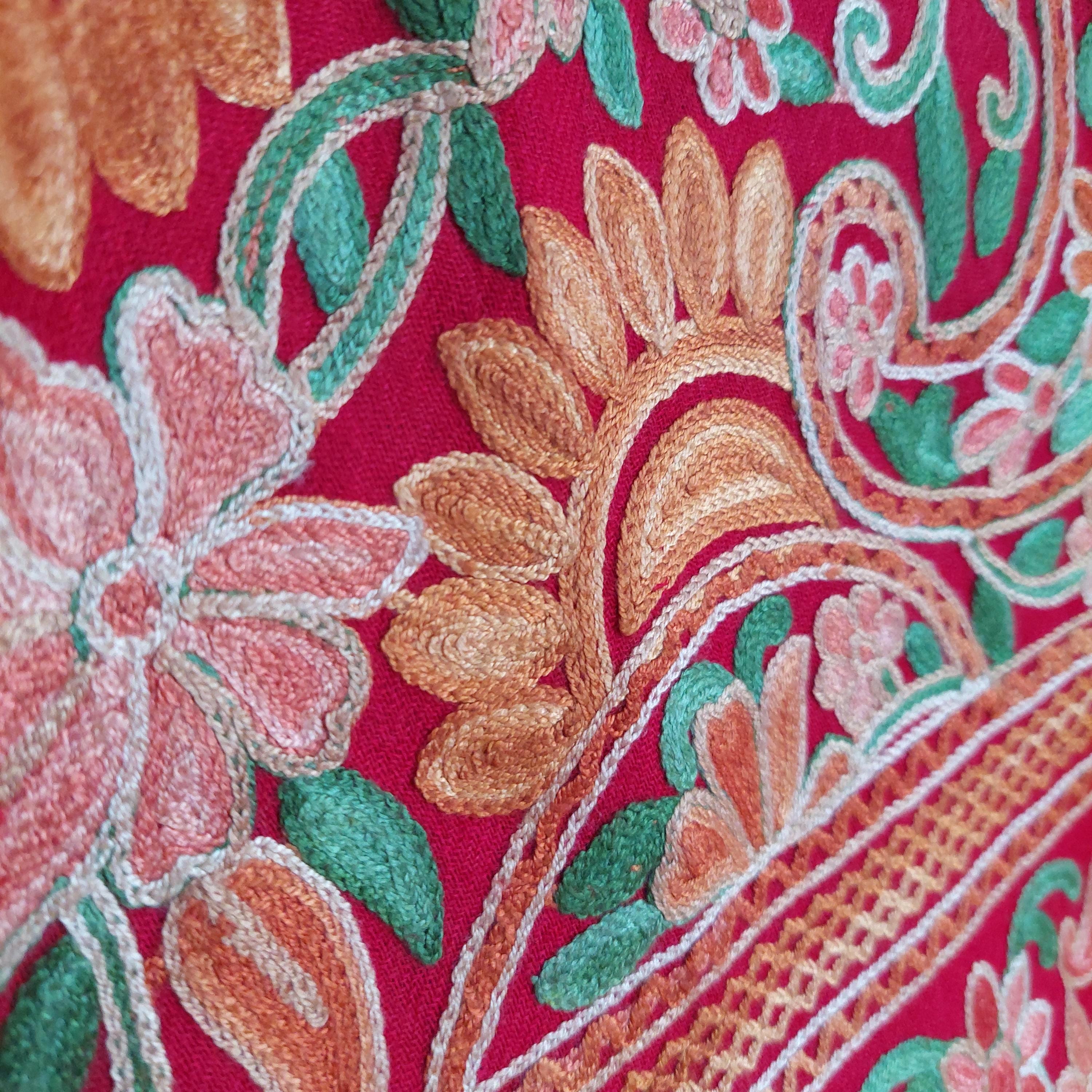 Red Kashmiri embroidered deep red shawl featuring Aari floral and paisley embroidery in yellow, orange and gold tones.