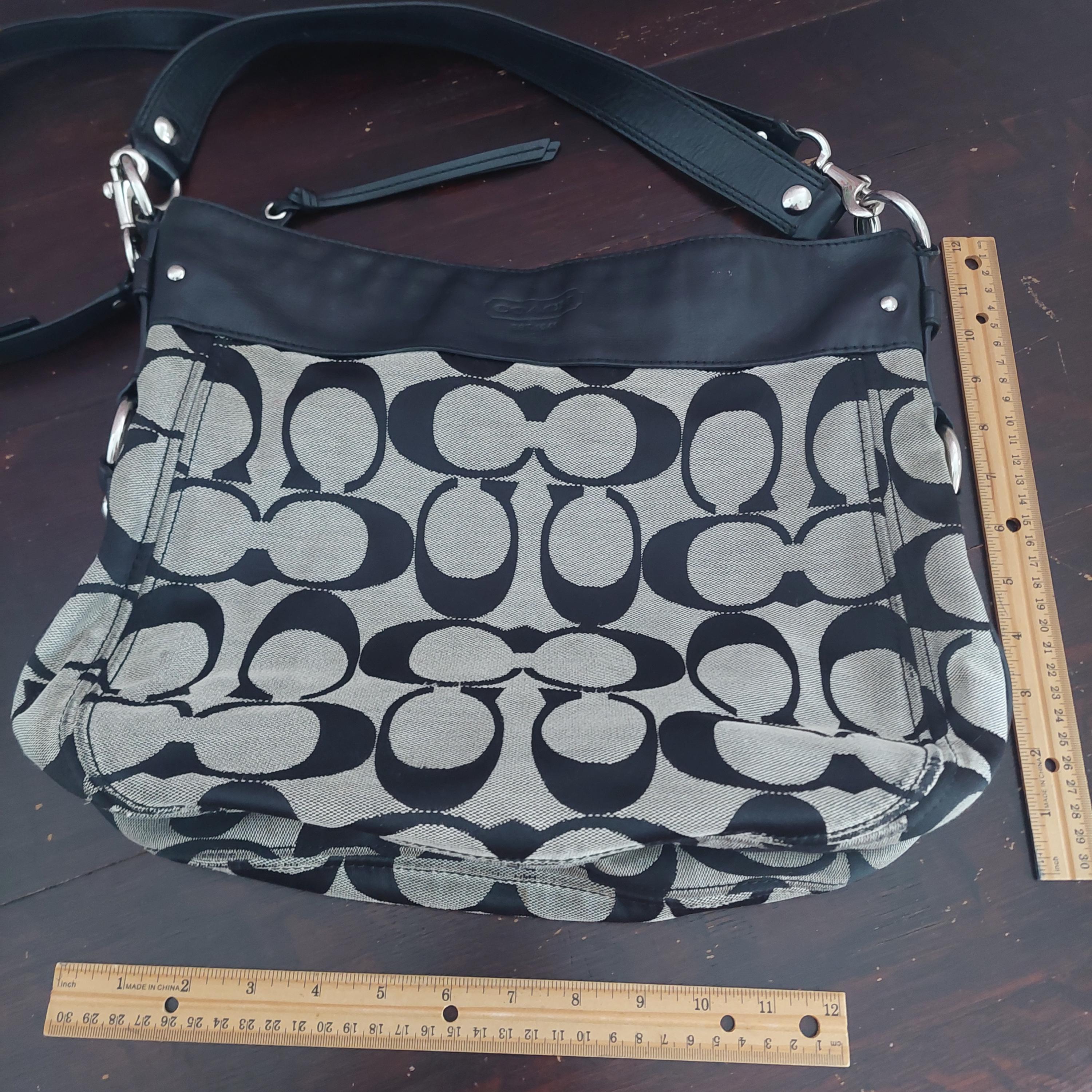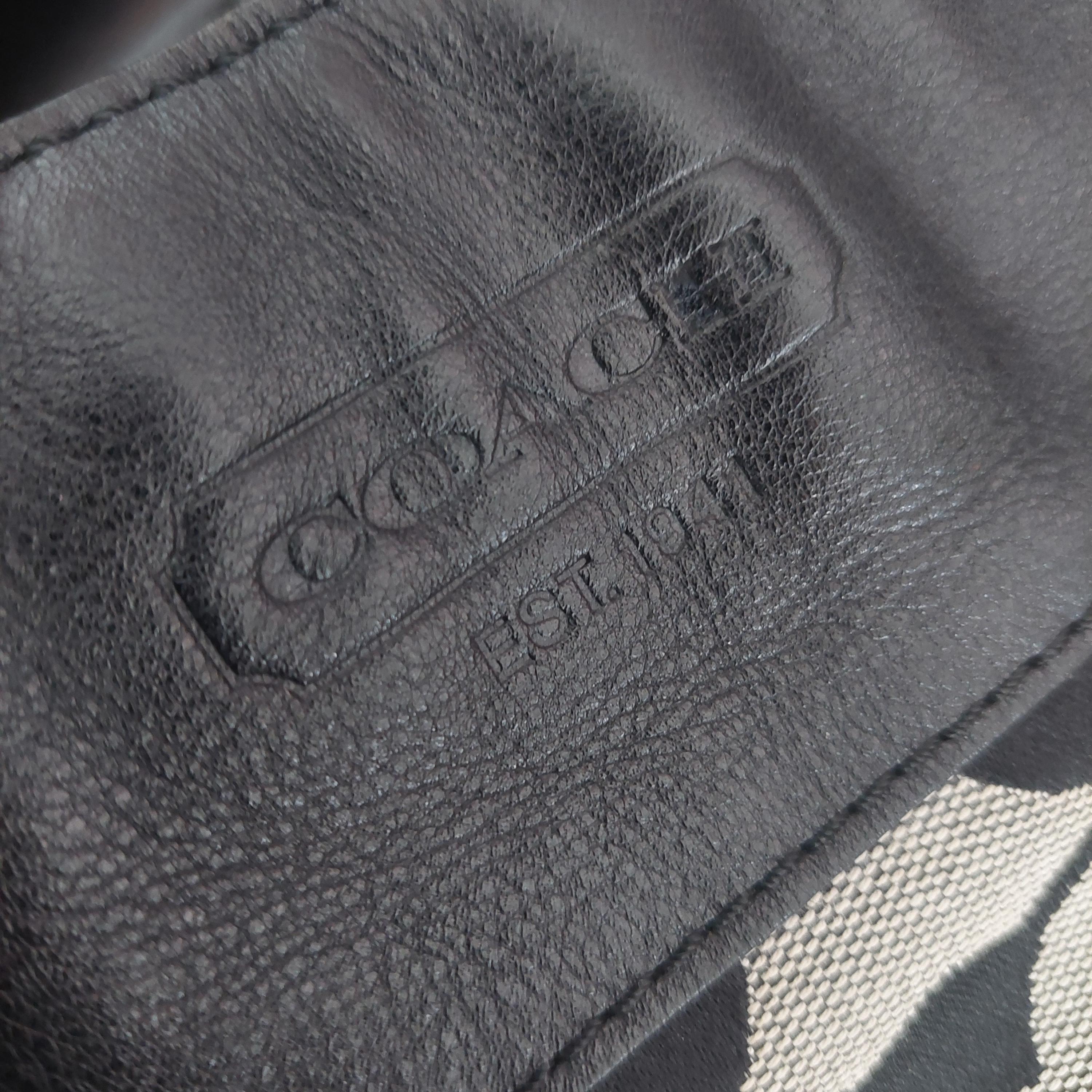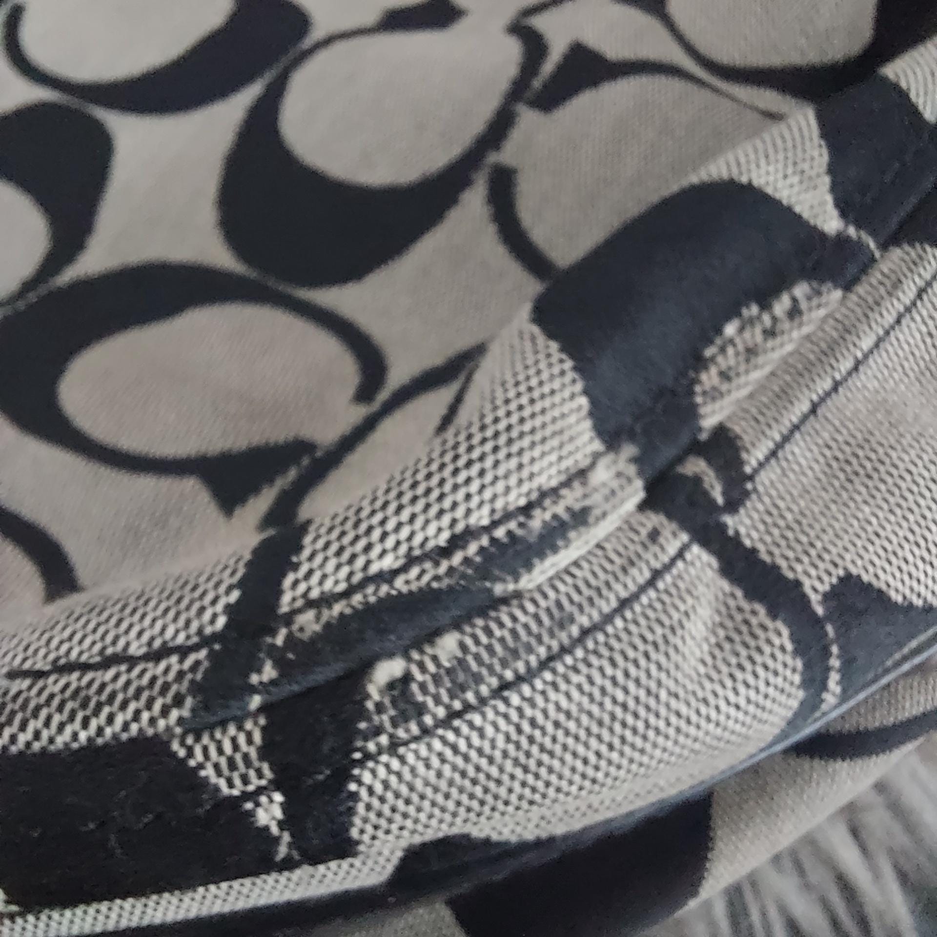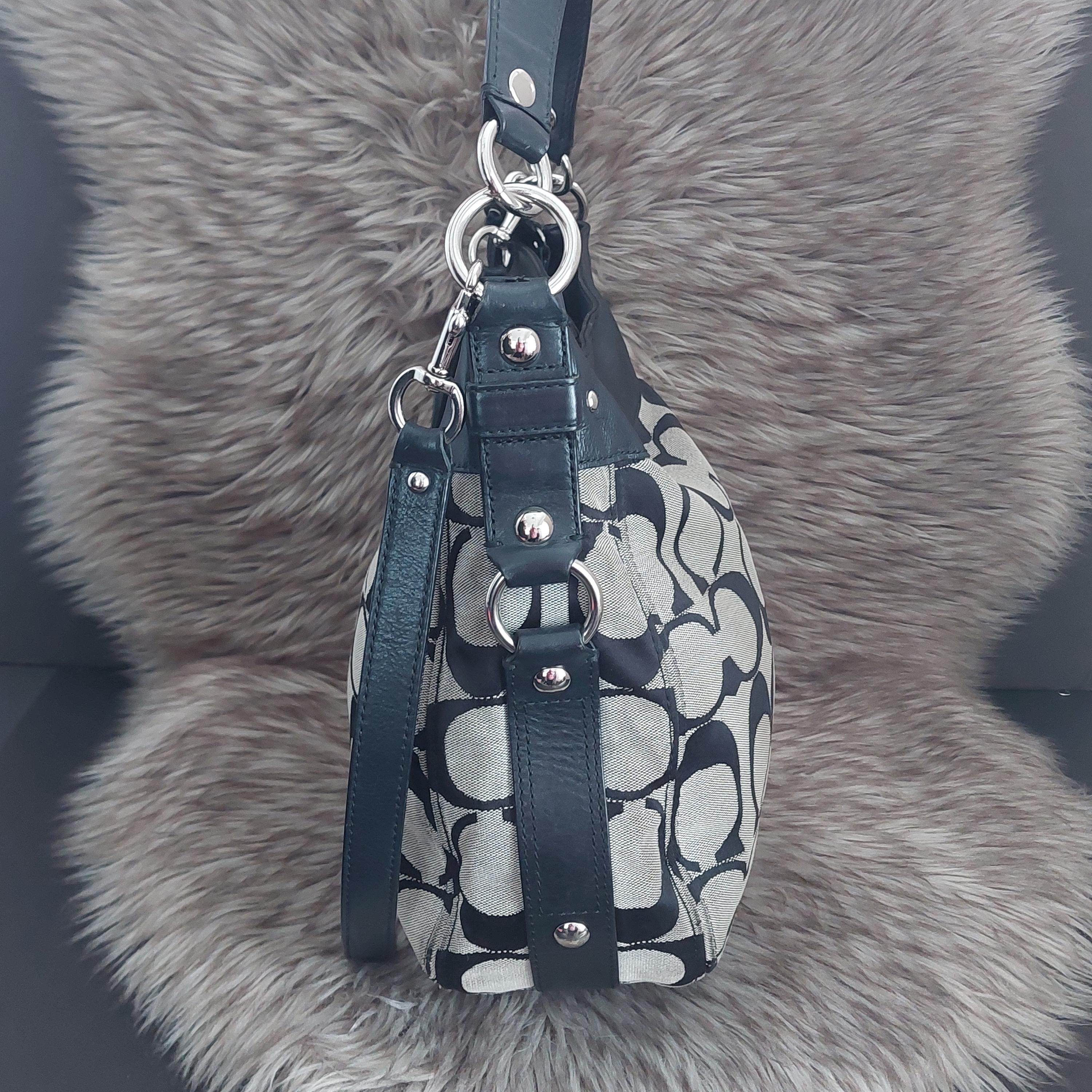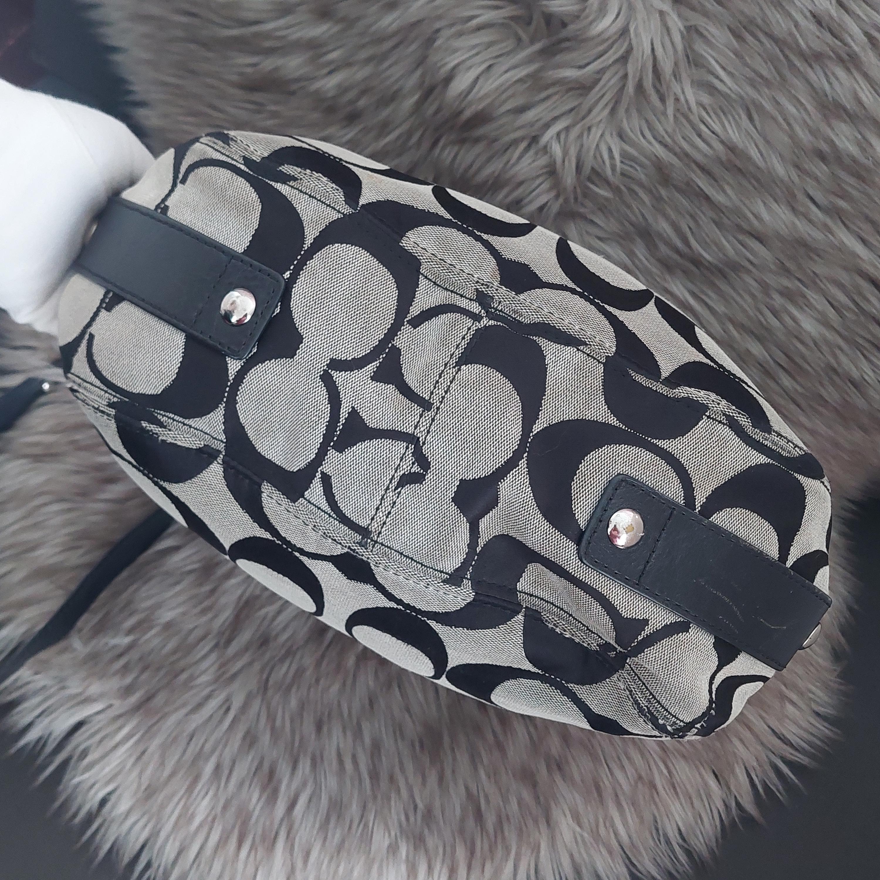 Coach Zoe hobo shoulder bag with slouchy silhouette and classic jacquard weave with the 'C' logo pattern on the gray canvas. Black pebbled leather trim, silver-tone hardware, single shoulder strap and detachable crossbody strap. Top zipper with light blue satin interior. One sidewall zippered pocket and 2 slip pockets.