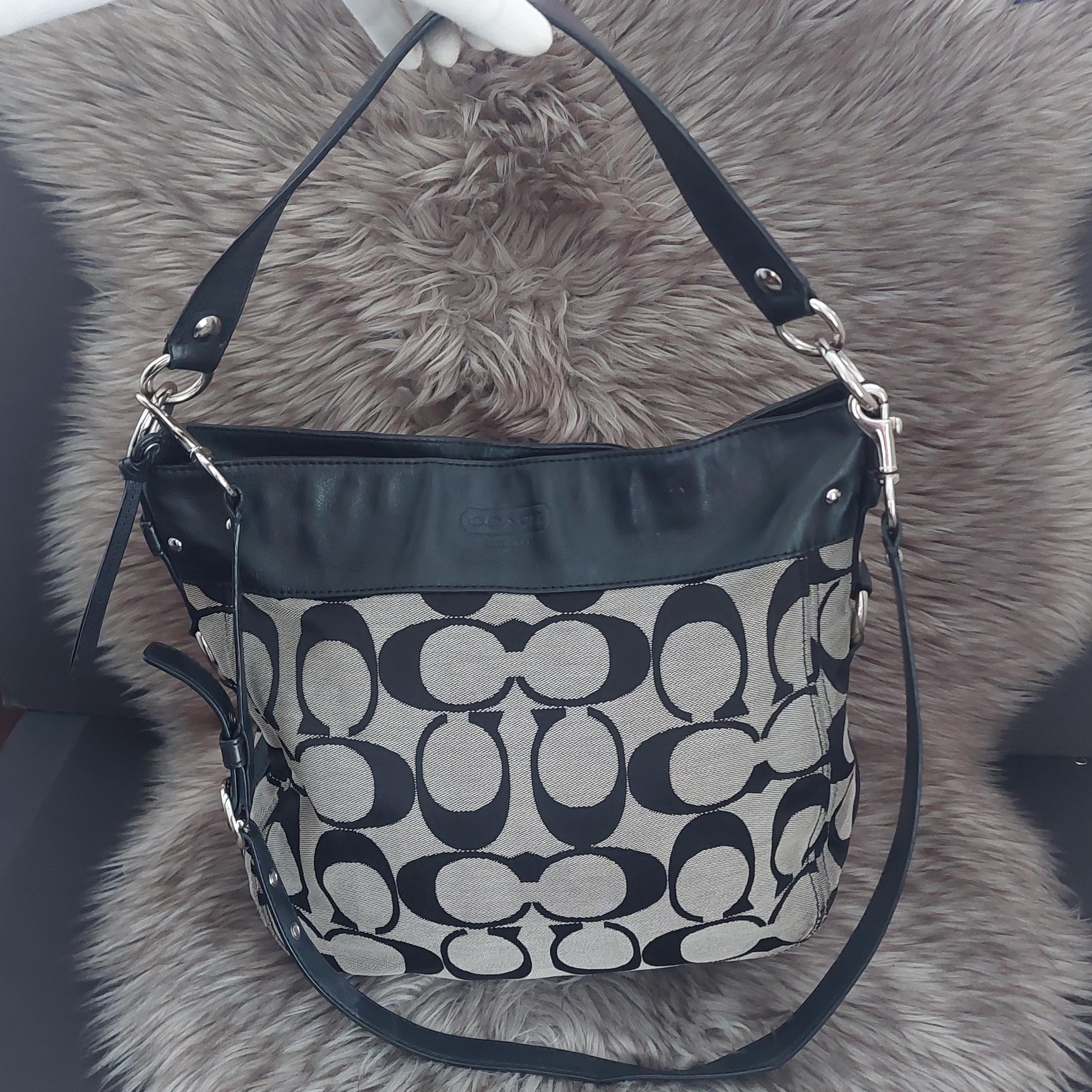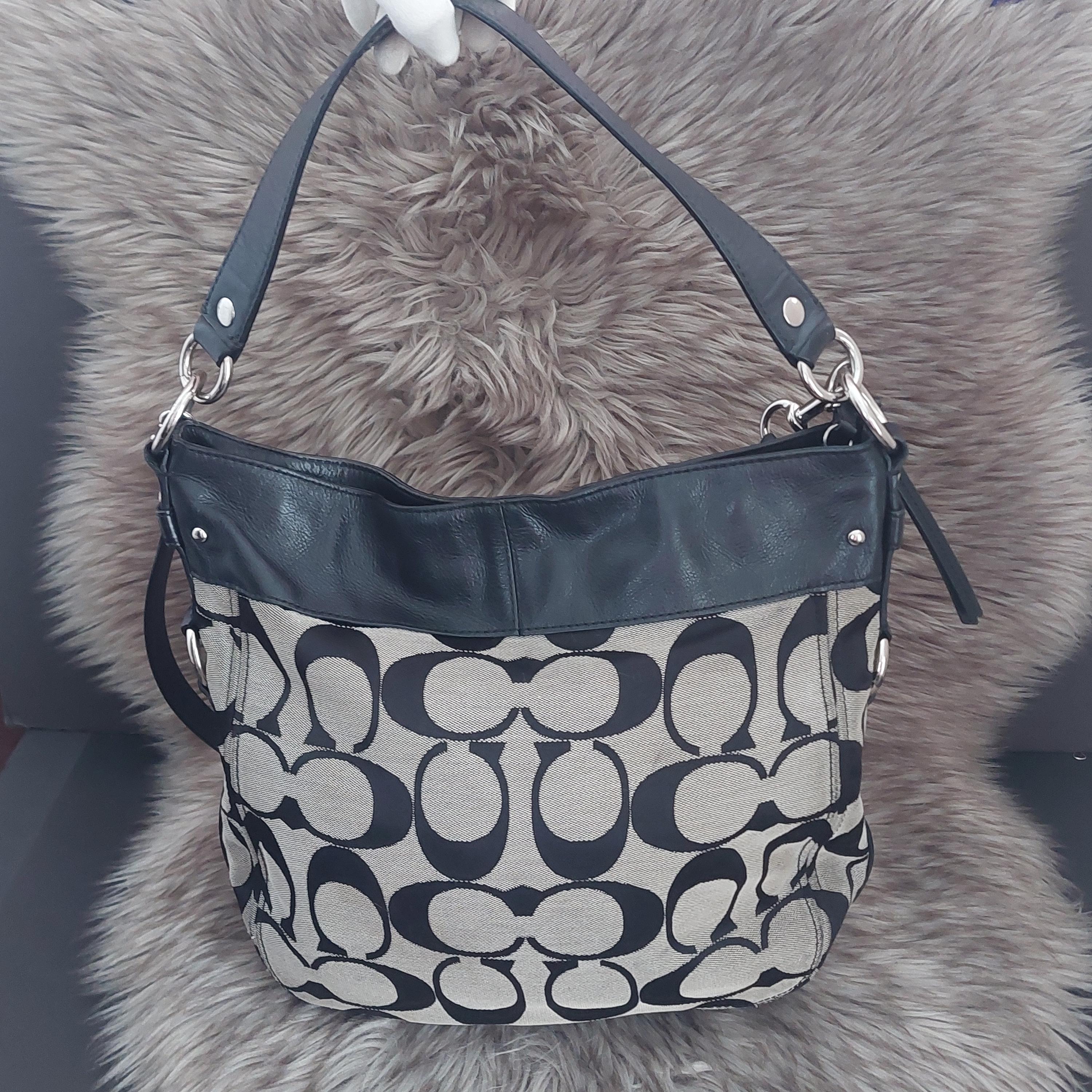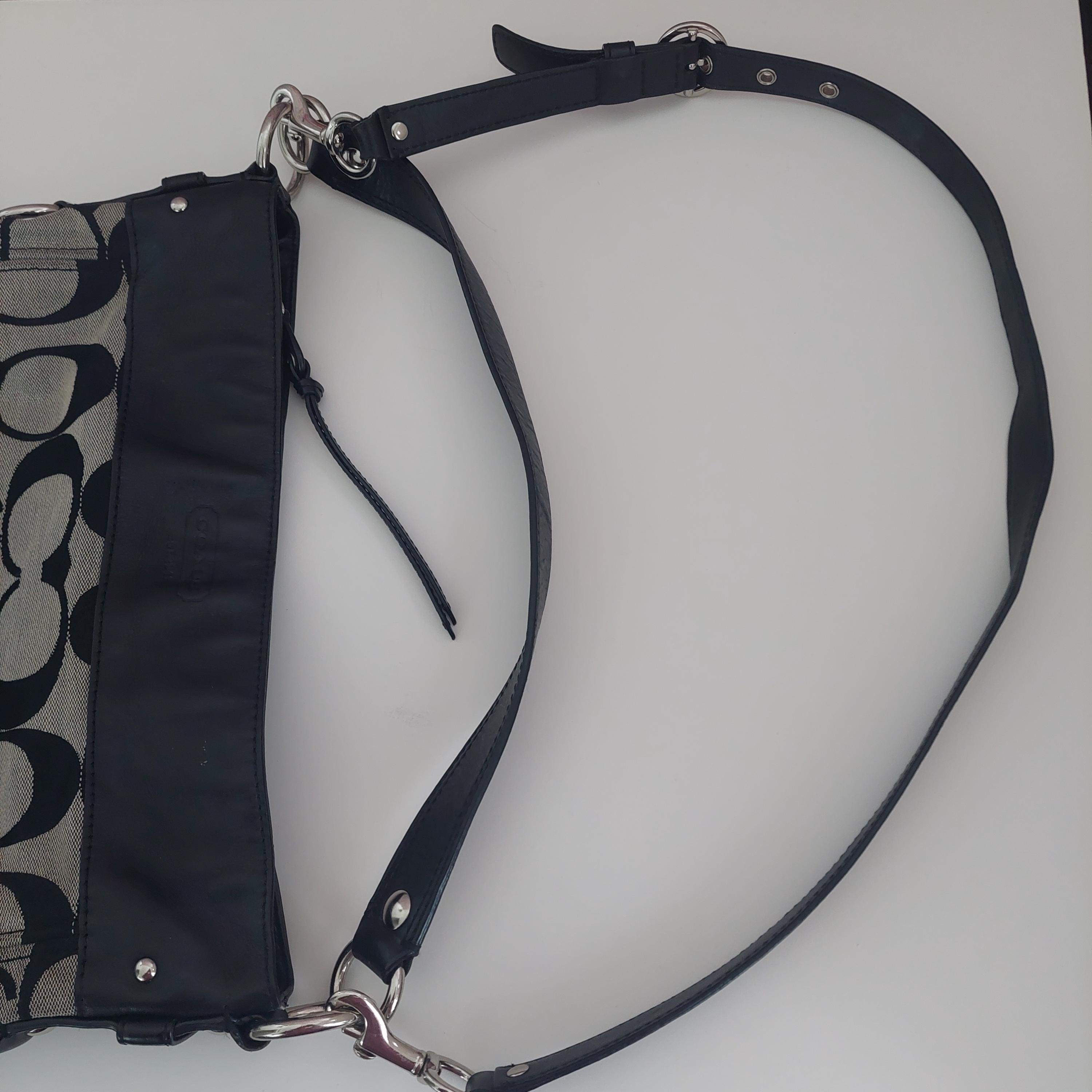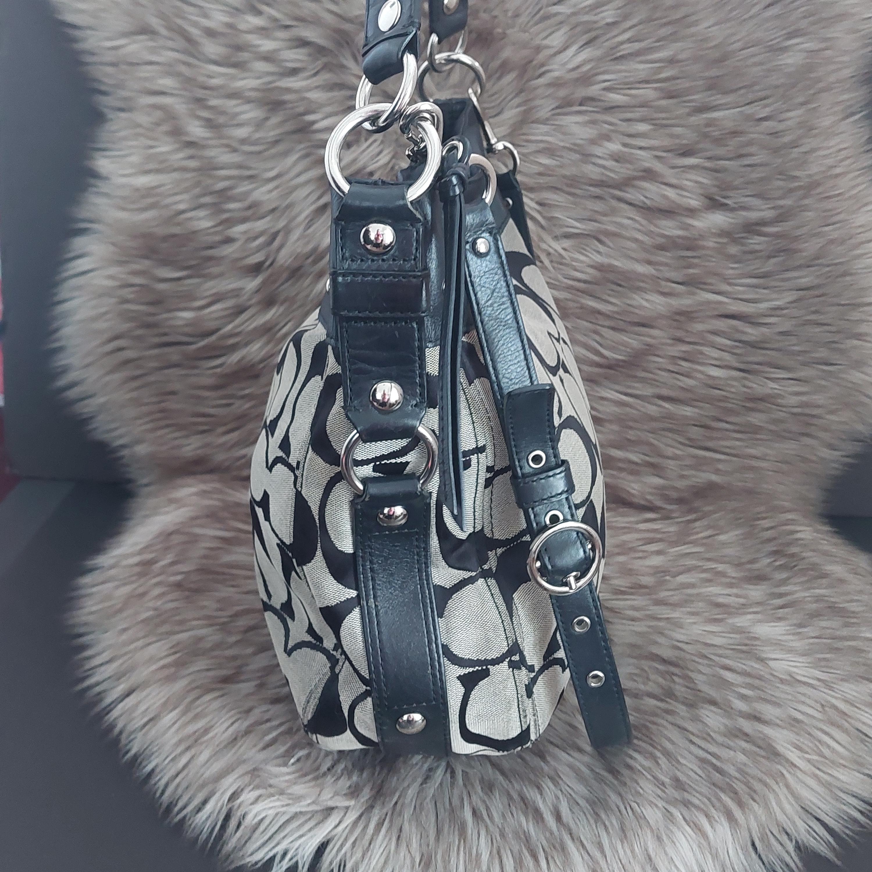 Coach Zoe hobo shoulder bag with slouchy silhouette and classic jacquard weave with the 'C' logo pattern on the gray canvas. Black pebbled leather trim, silver-tone hardware, single shoulder strap and detachable crossbody strap. Top zipper with light blue satin interior. One sidewall zippered pocket and 2 slip pockets.