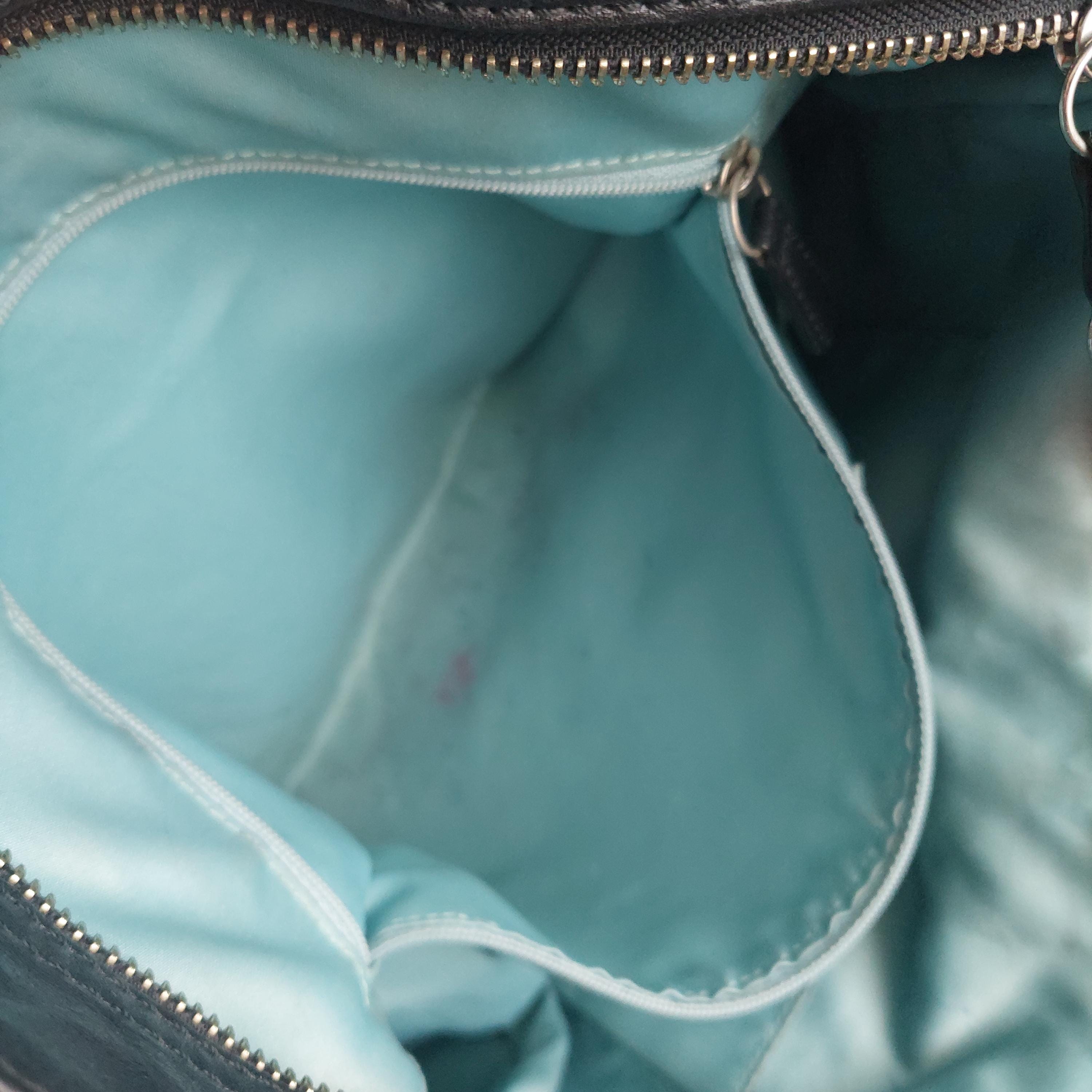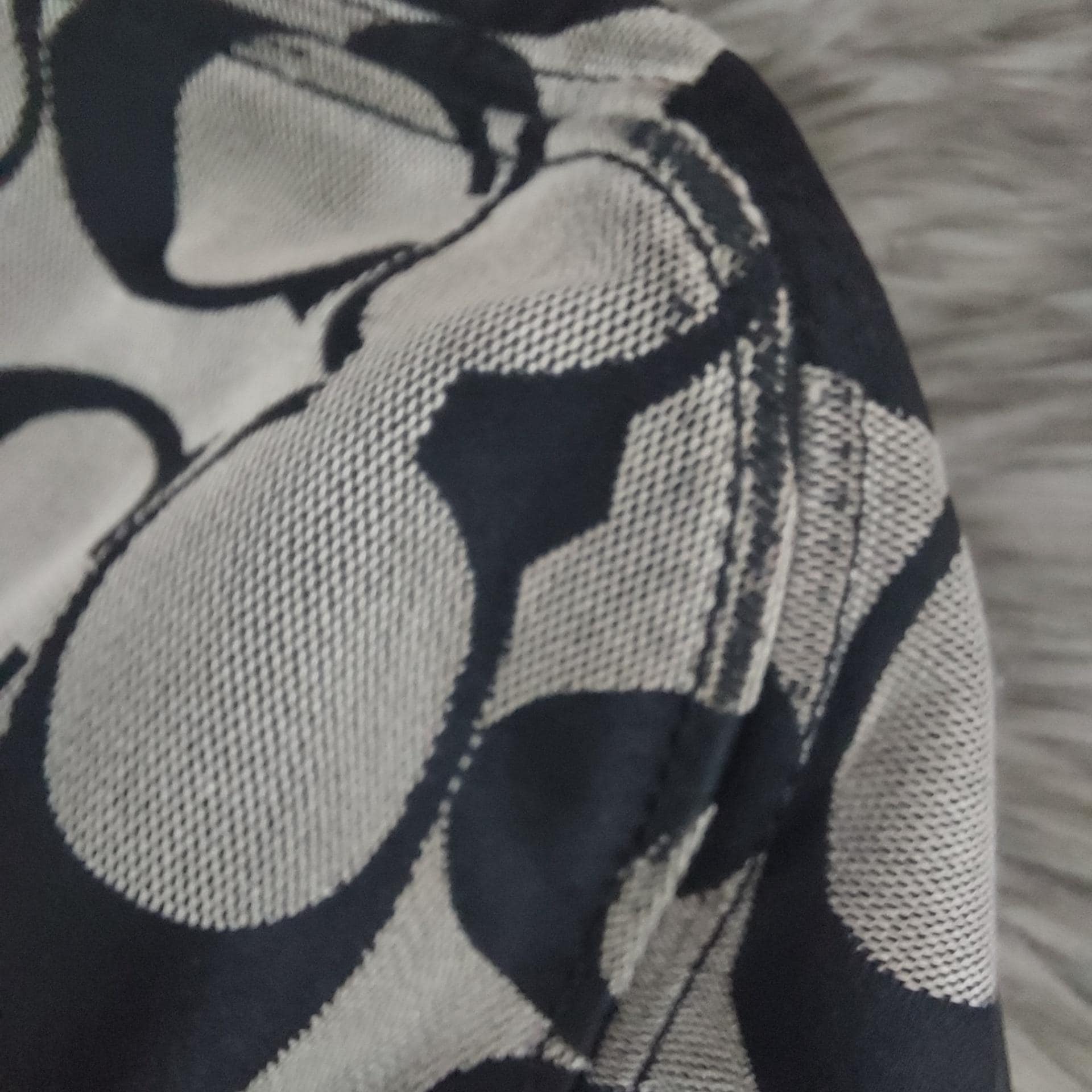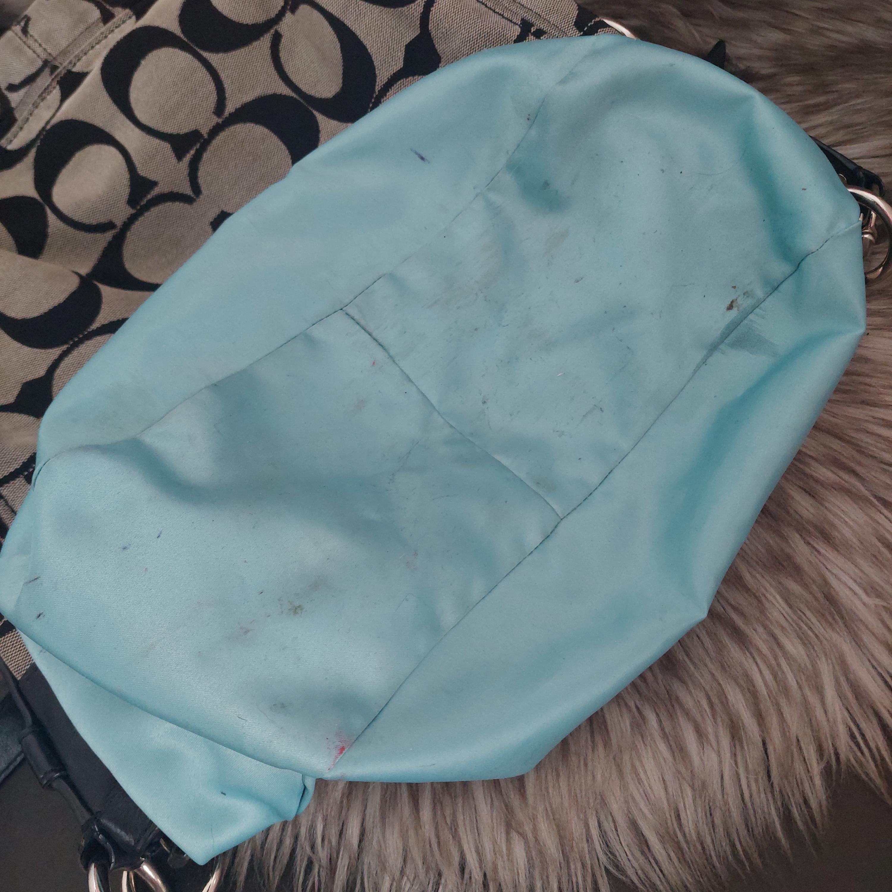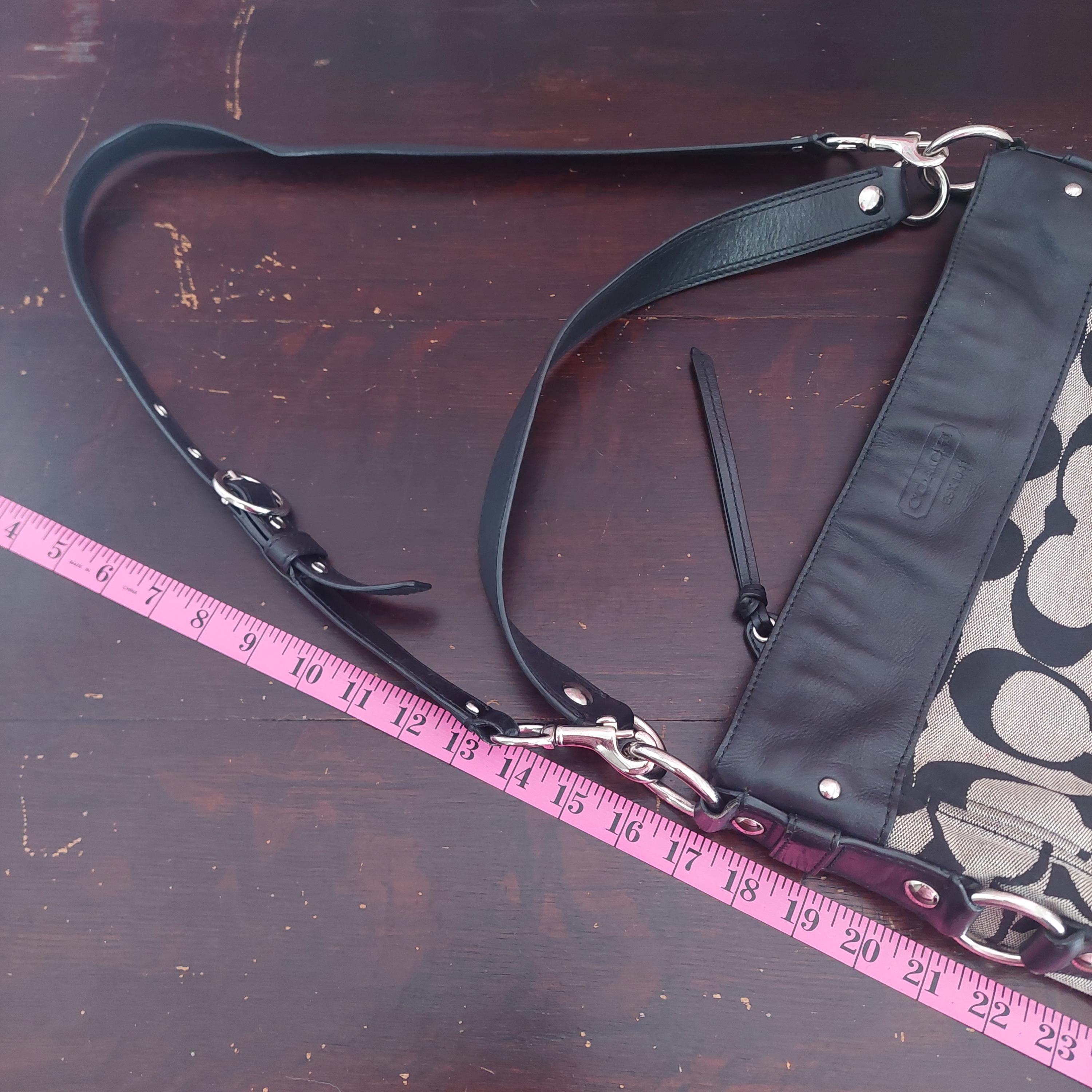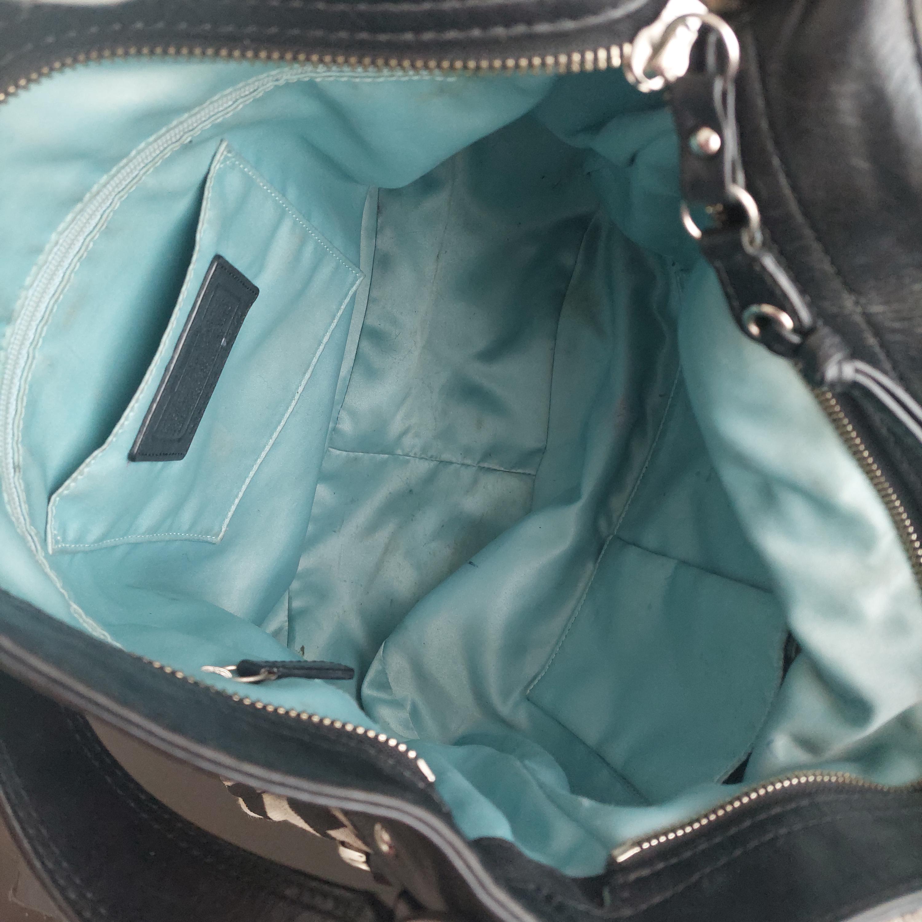 Coach Zoe hobo shoulder bag with slouchy silhouette and classic jacquard weave with the 'C' logo pattern on the gray canvas. Black pebbled leather trim, silver-tone hardware, single shoulder strap and detachable crossbody strap. Top zipper with light blue satin interior. One sidewall zippered pocket and 2 slip pockets.