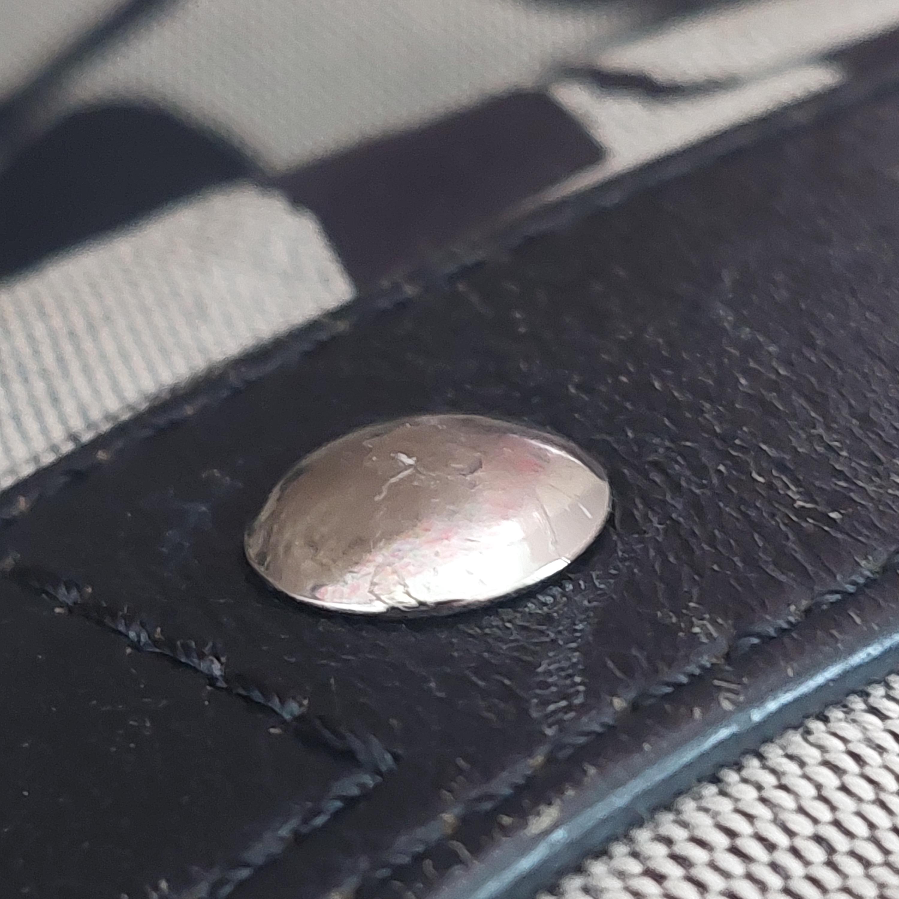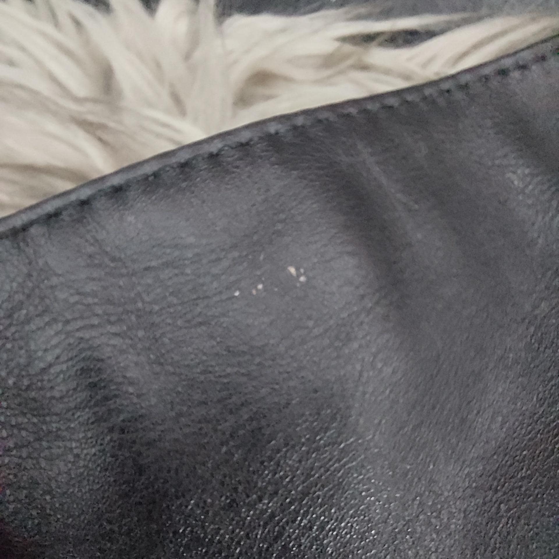 Vintage Condition: Scratches to leather on front of bag. Wear to bottom edges. Wear to edges of leather strap. Pen marks inside lining & bottom.