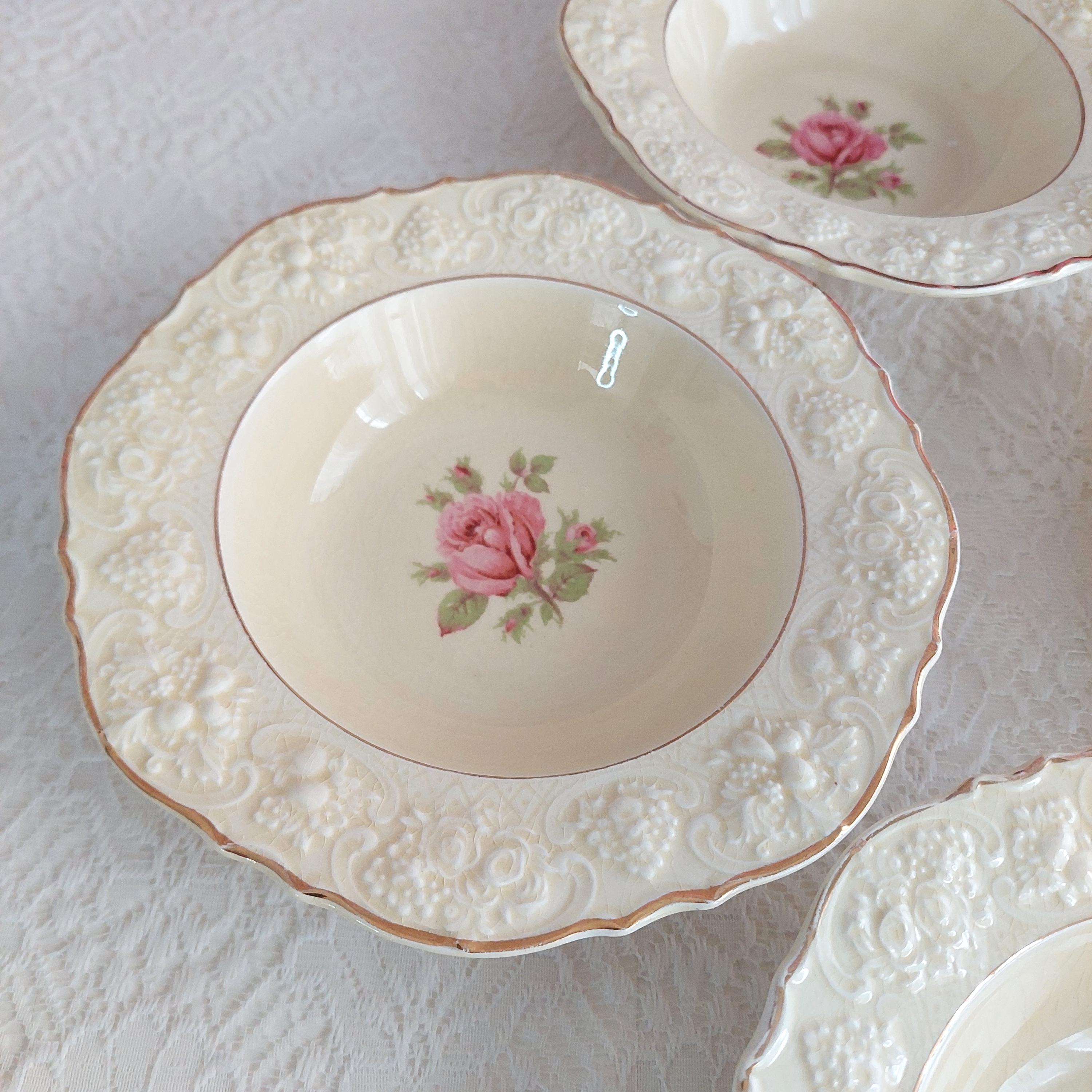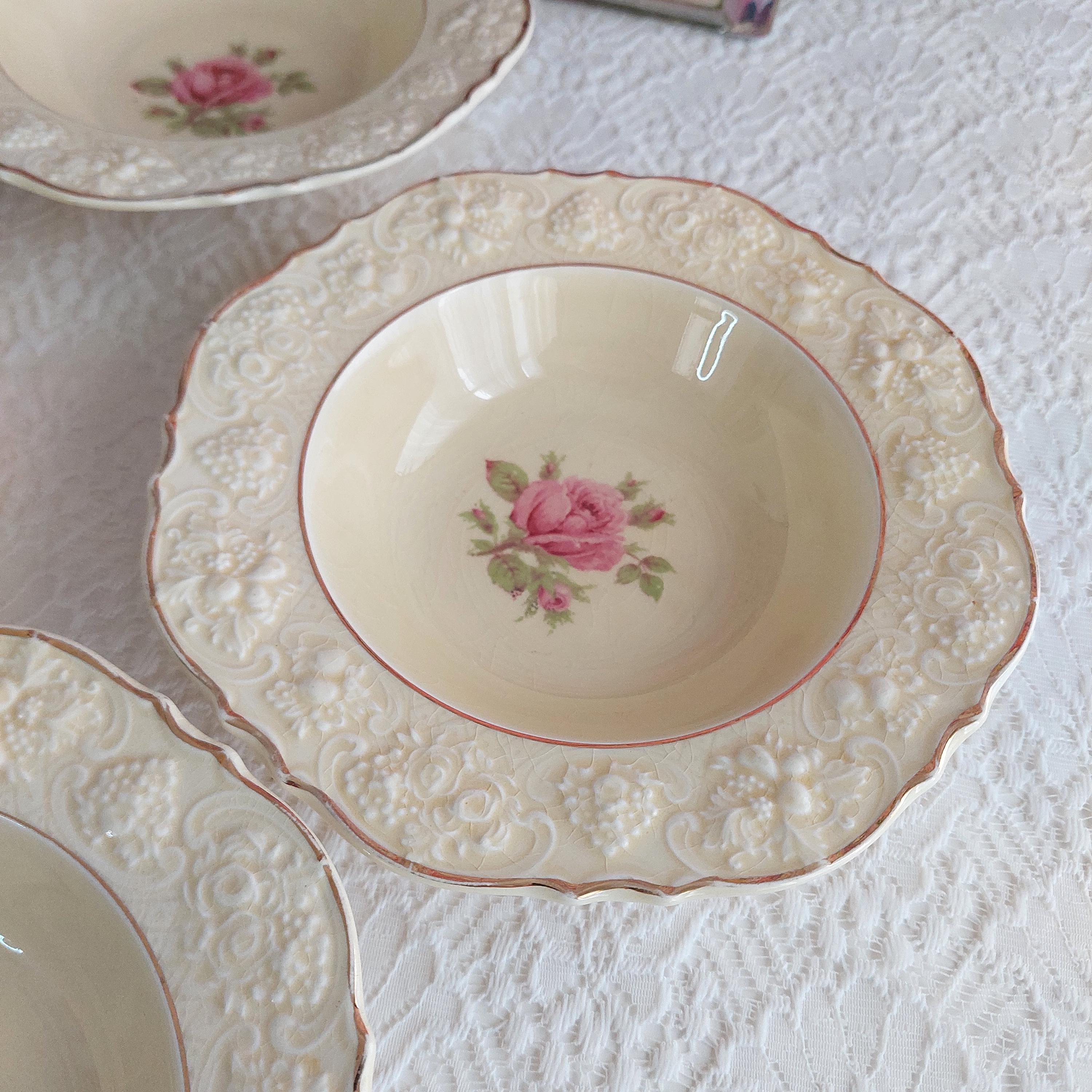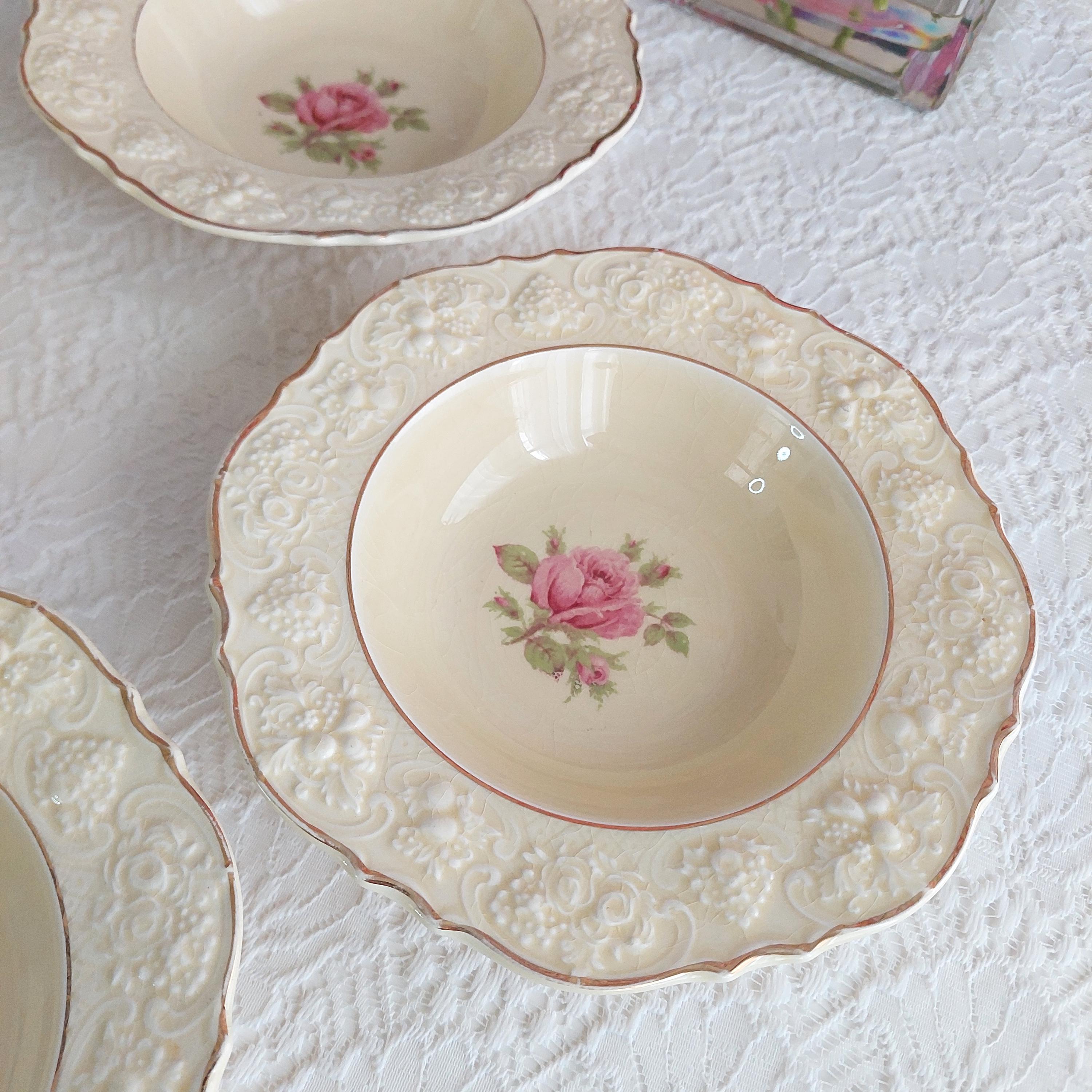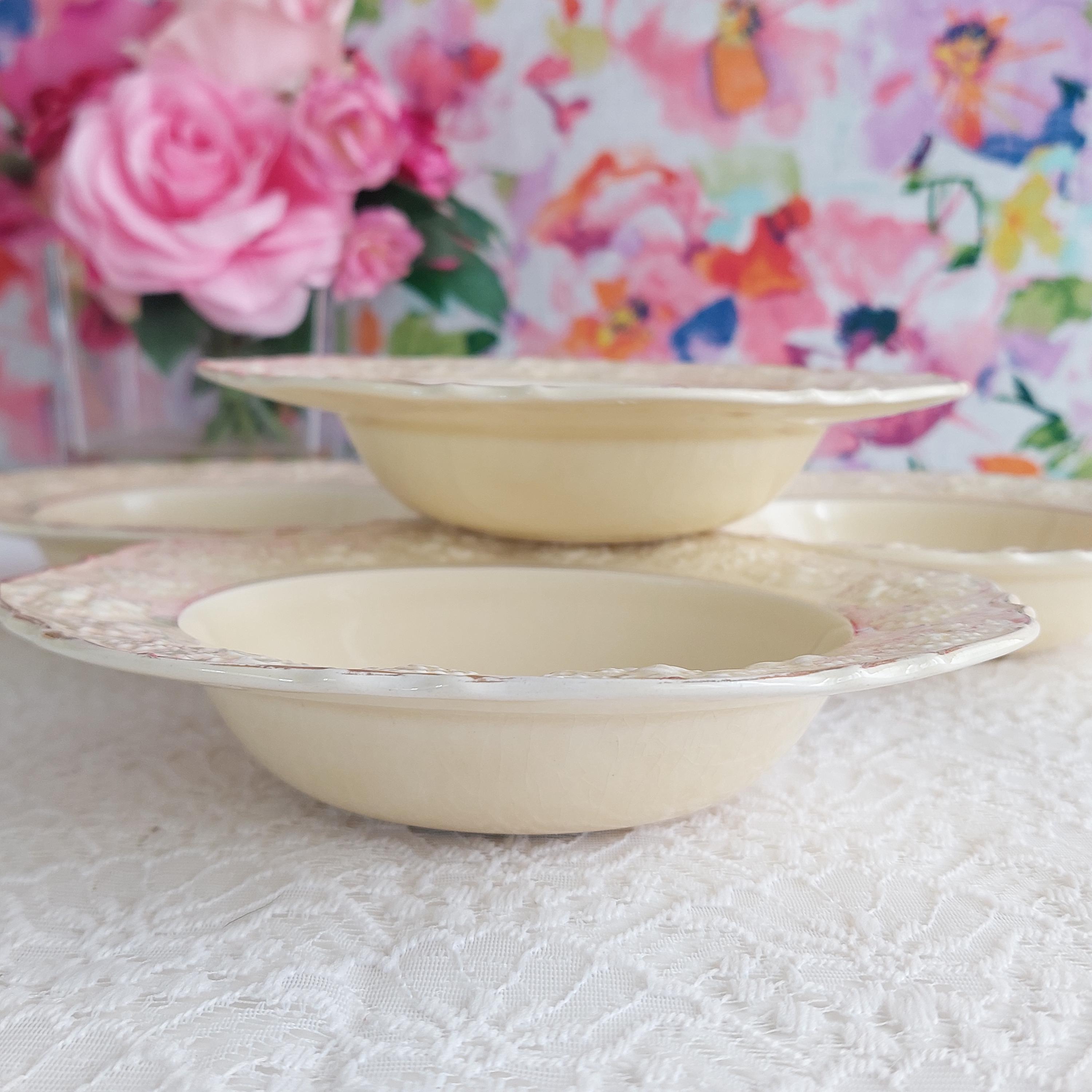 Crown Ducal Florentine Rose OR Rose Marie (pink) rimmed cereal bowls with pink rose in center of creamy background. Honey glazed ivory ceramic with a raised floral pattern on rim. Pattern is also known by pattern number 5379 or CRD 261 Rose. Made in England, circa 1915