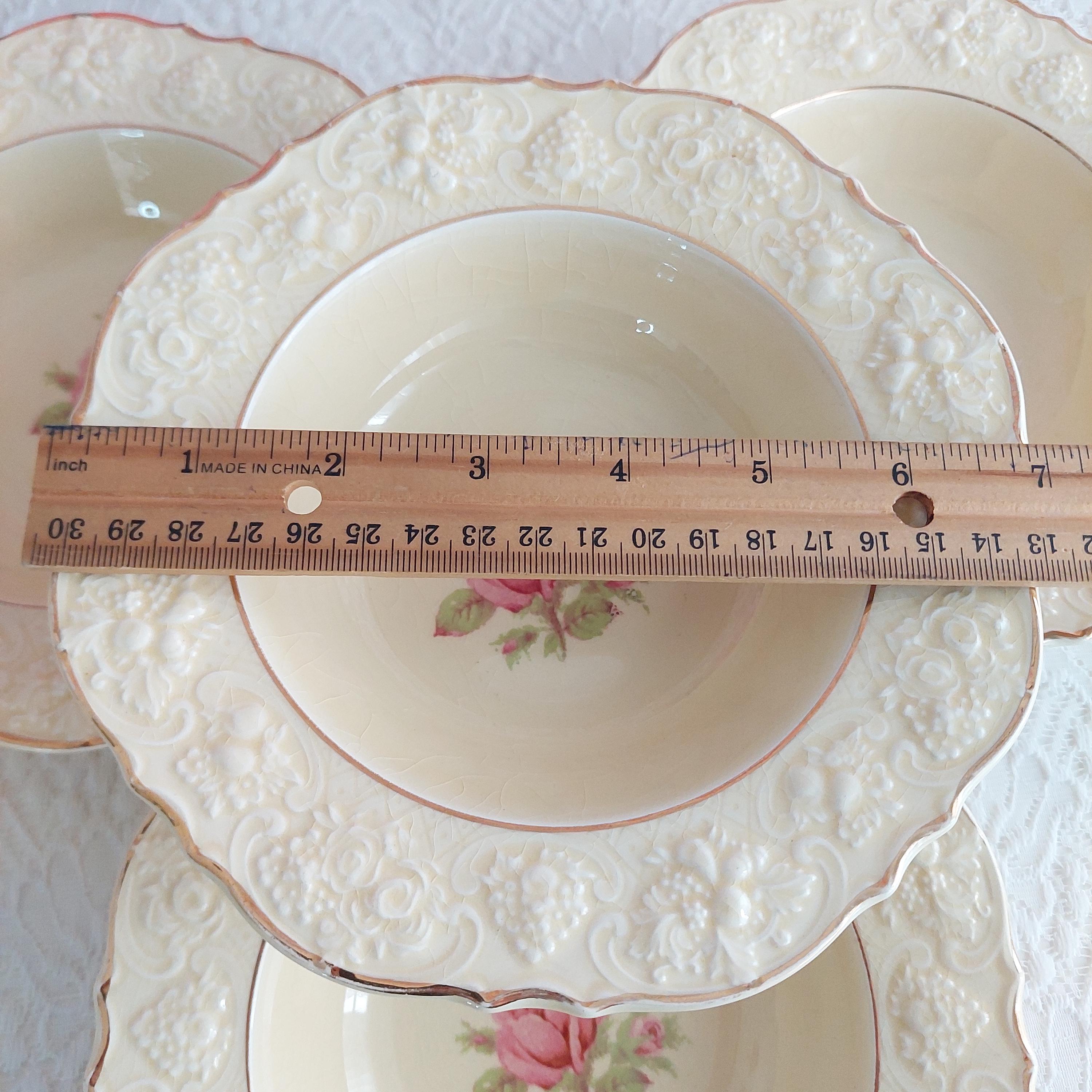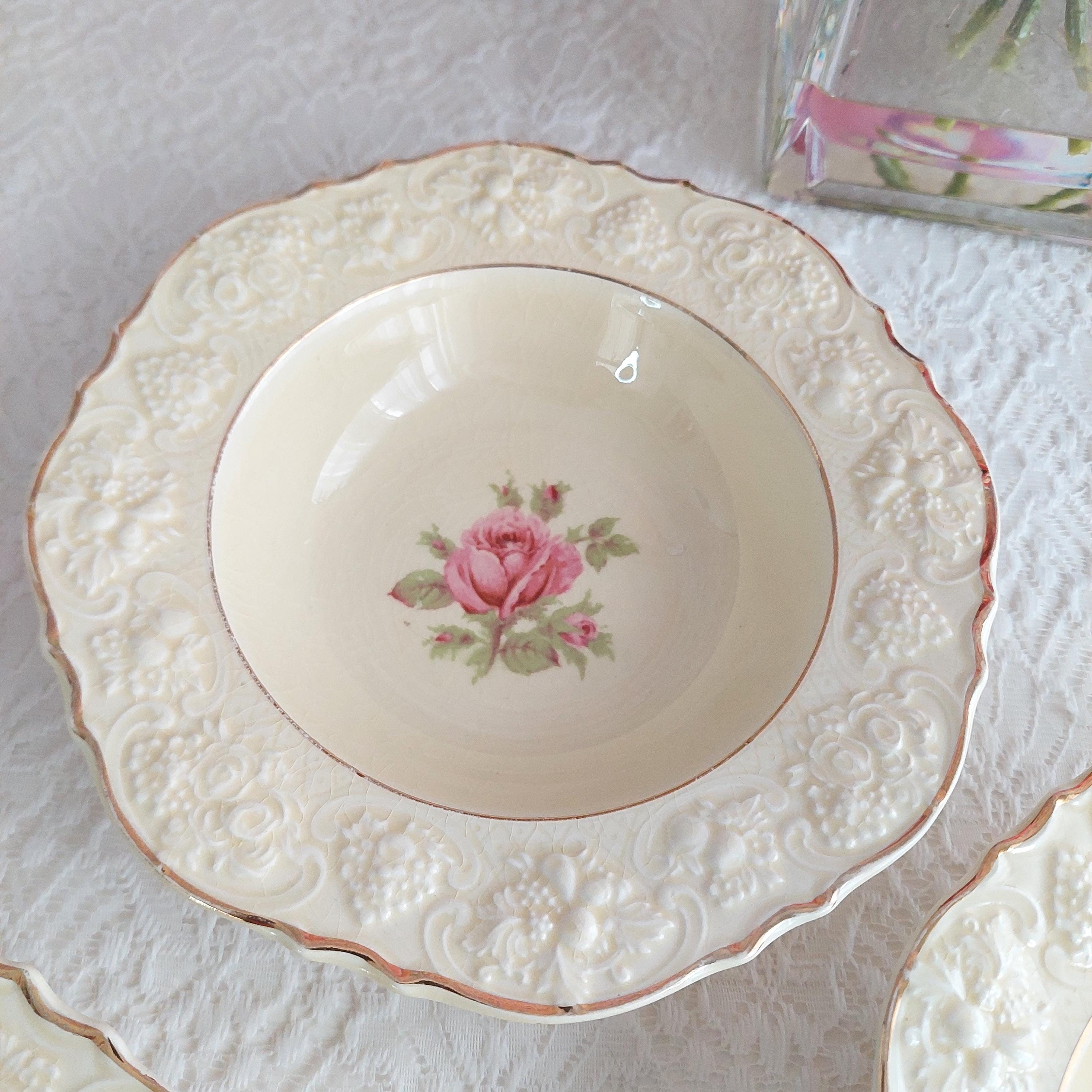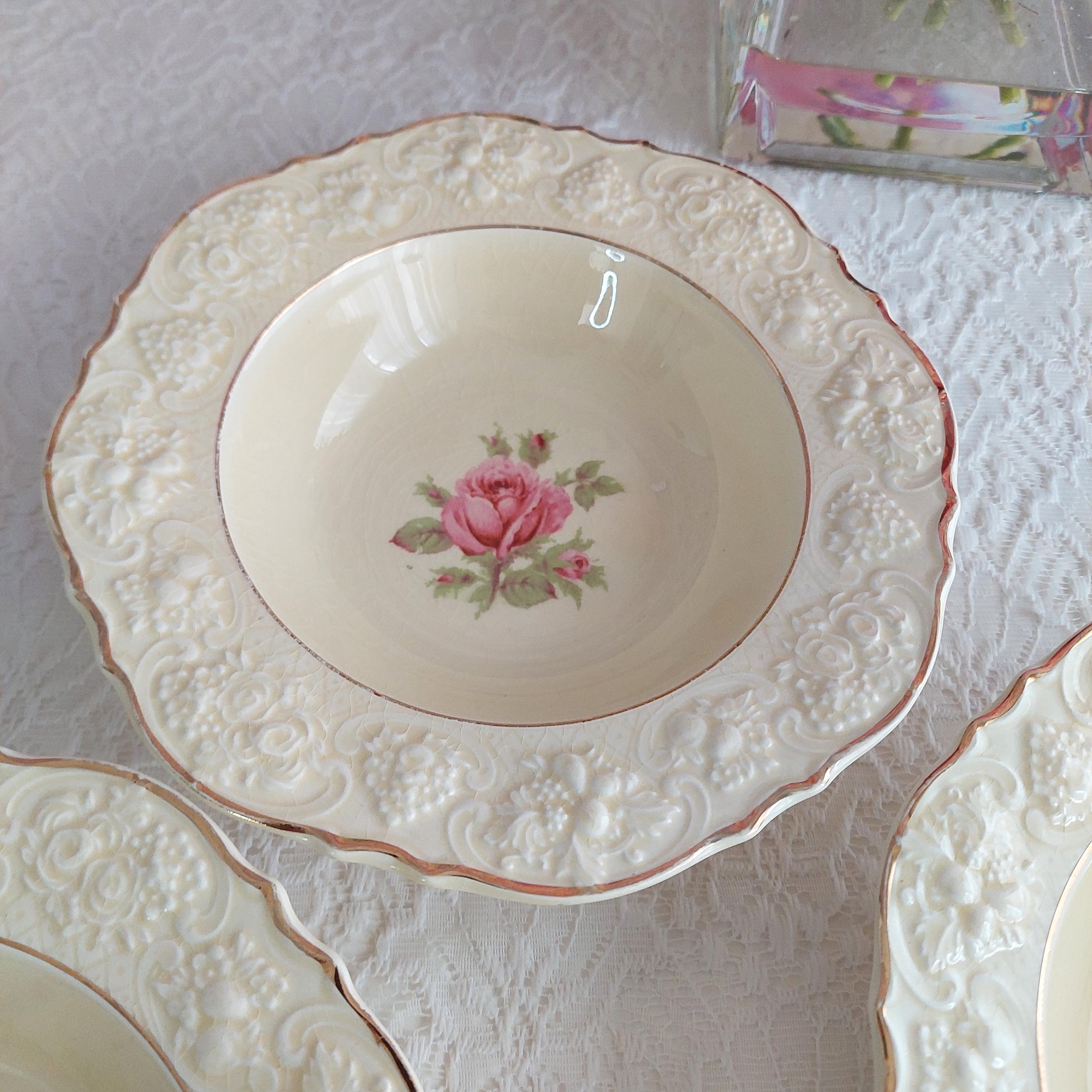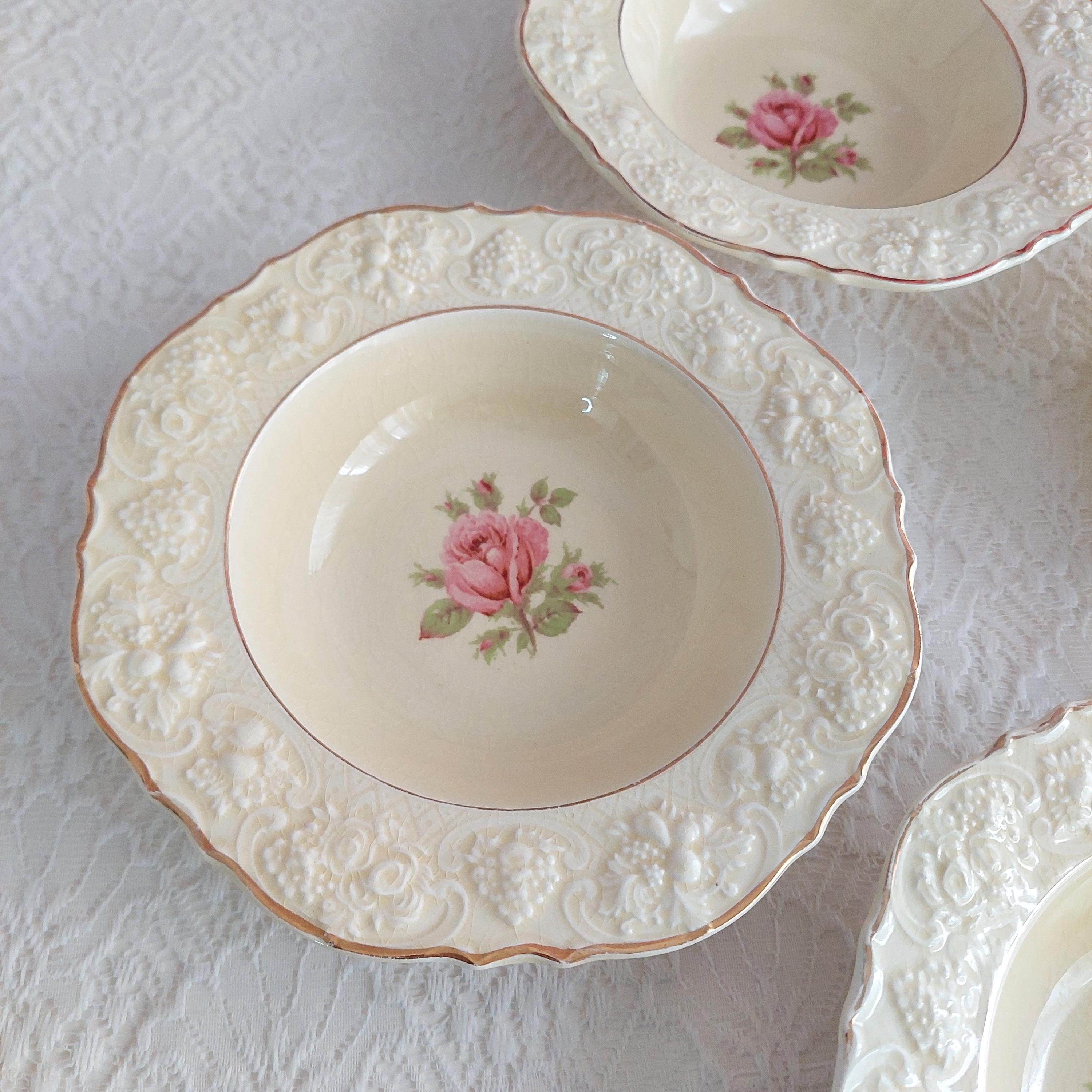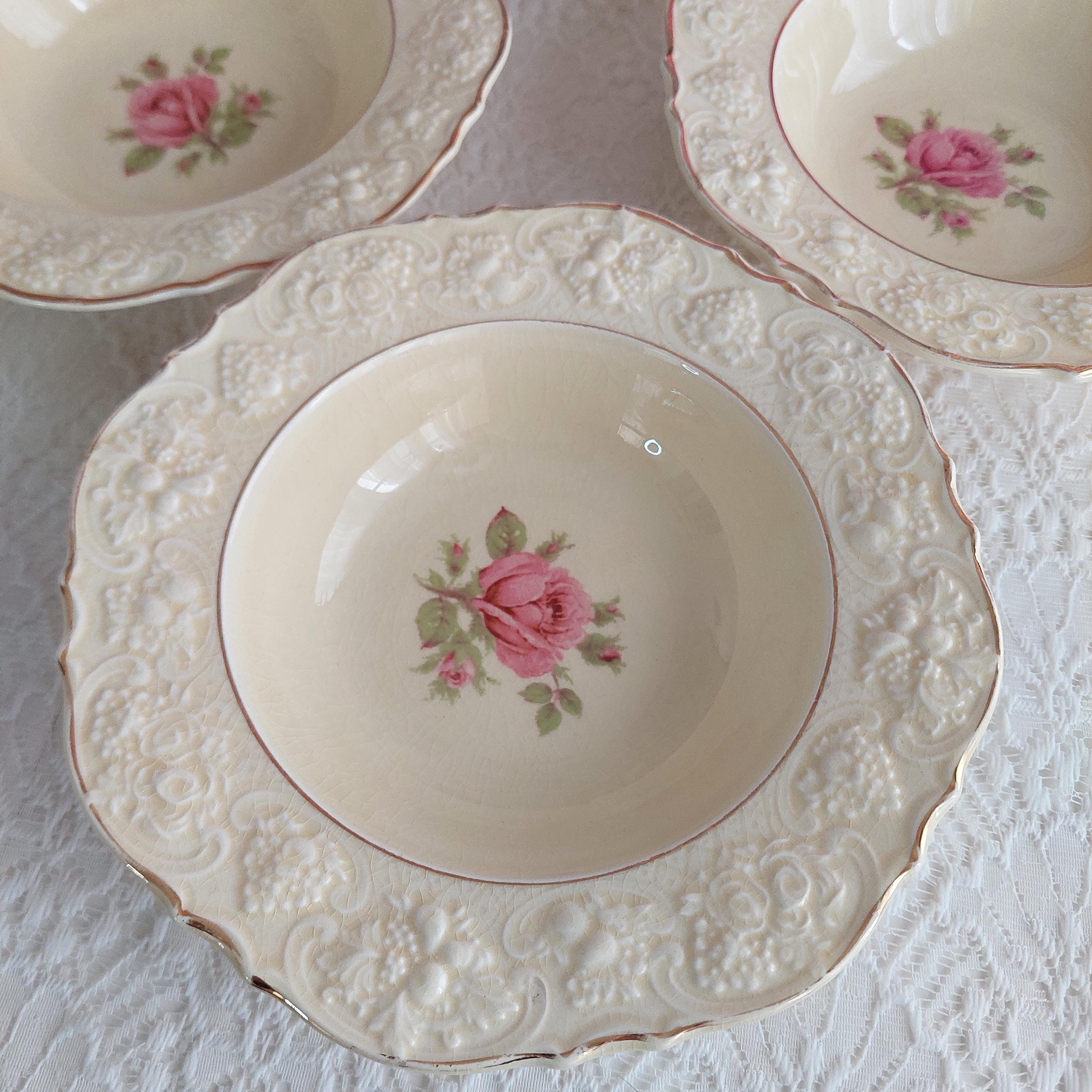 Crown Ducal Florentine Rose OR Rose Marie (pink) rimmed cereal bowls with pink rose in center of creamy background. Honey glazed ivory ceramic with a raised floral pattern on rim. Pattern is also known by pattern number 5379 or CRD 261 Rose. Made in England, circa 1915