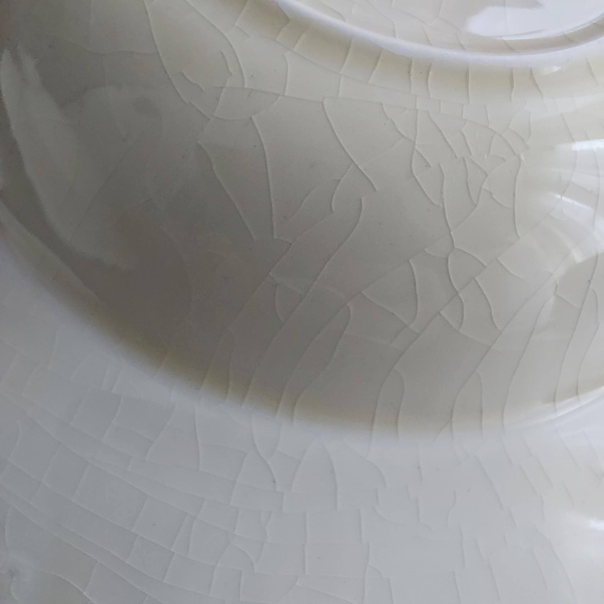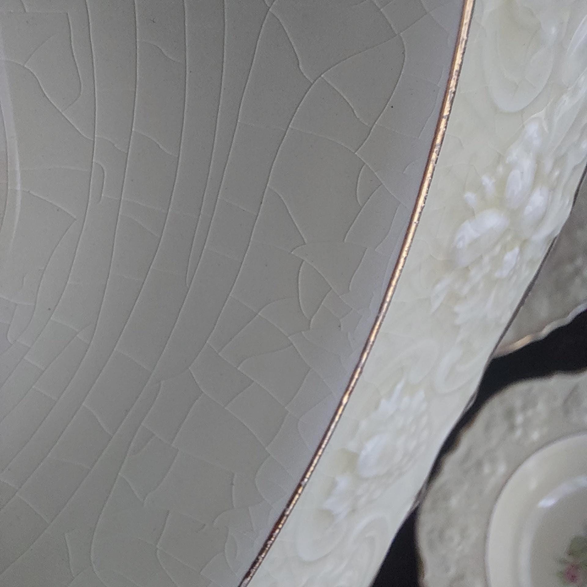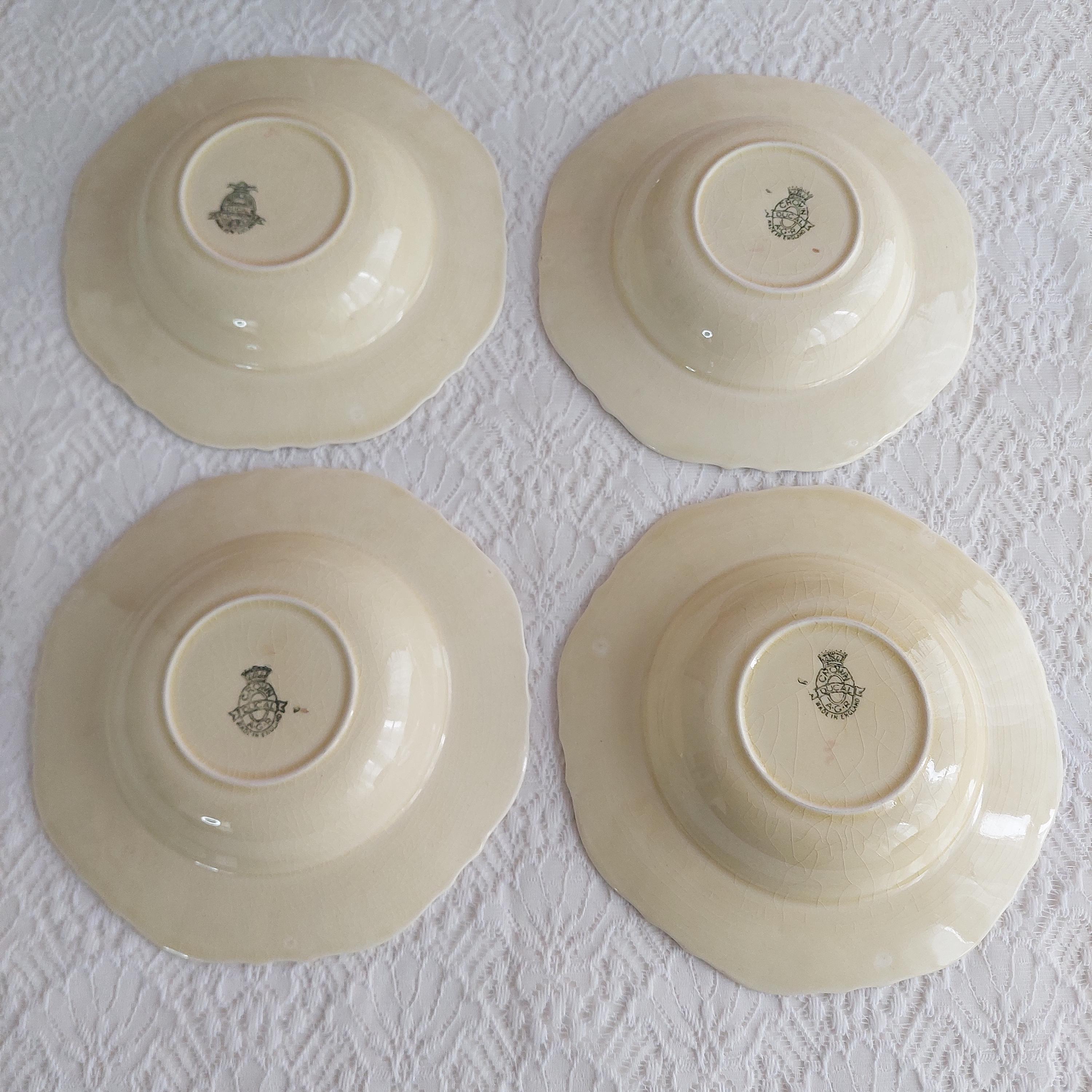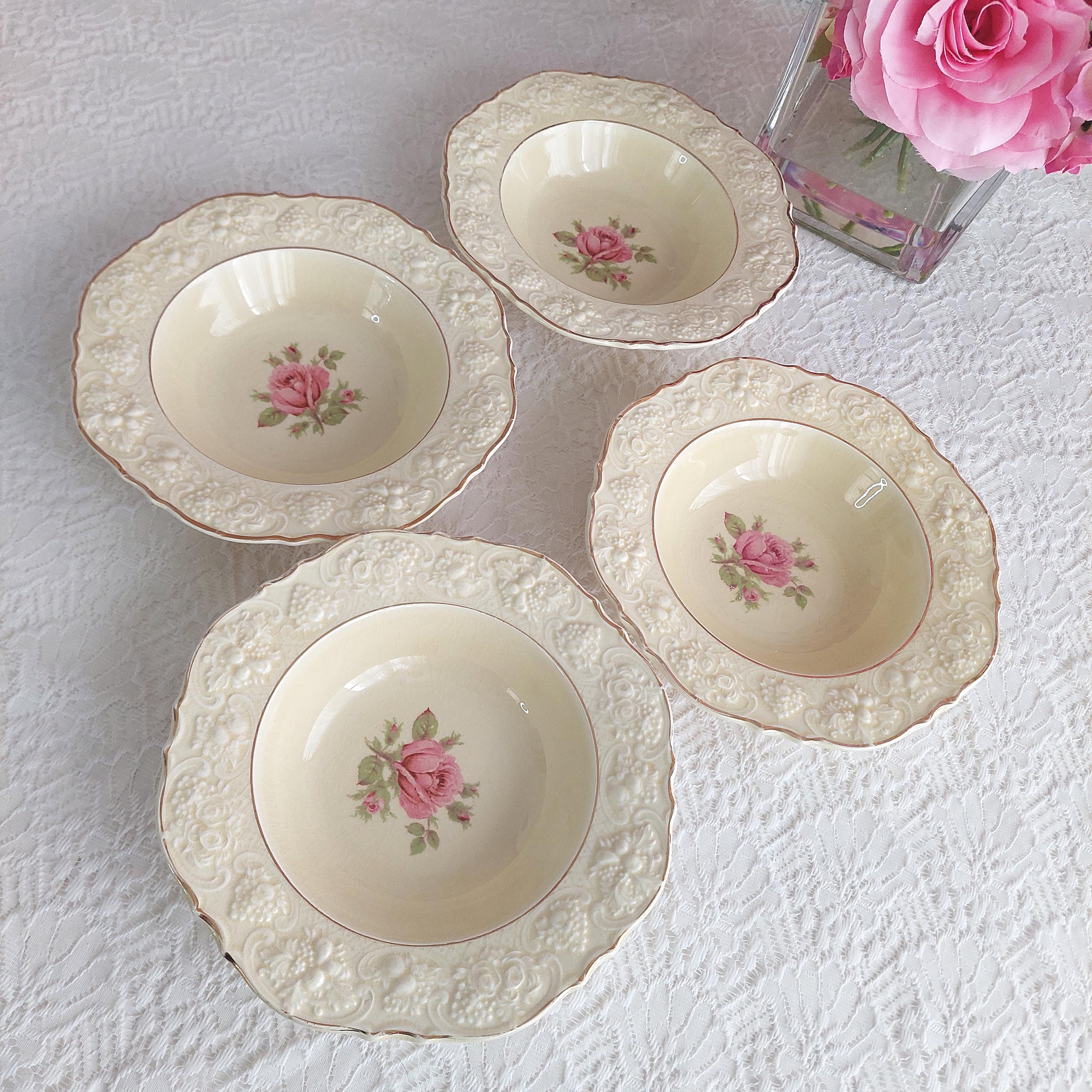 Crown Ducal Florentine Rose OR Rose Marie (pink) rimmed cereal bowls with pink rose in center of creamy background. Honey glazed ivory ceramic with a raised floral pattern on rim. Pattern is also known by pattern number 5379 or CRD 261 Rose. Made in England, circa 1915