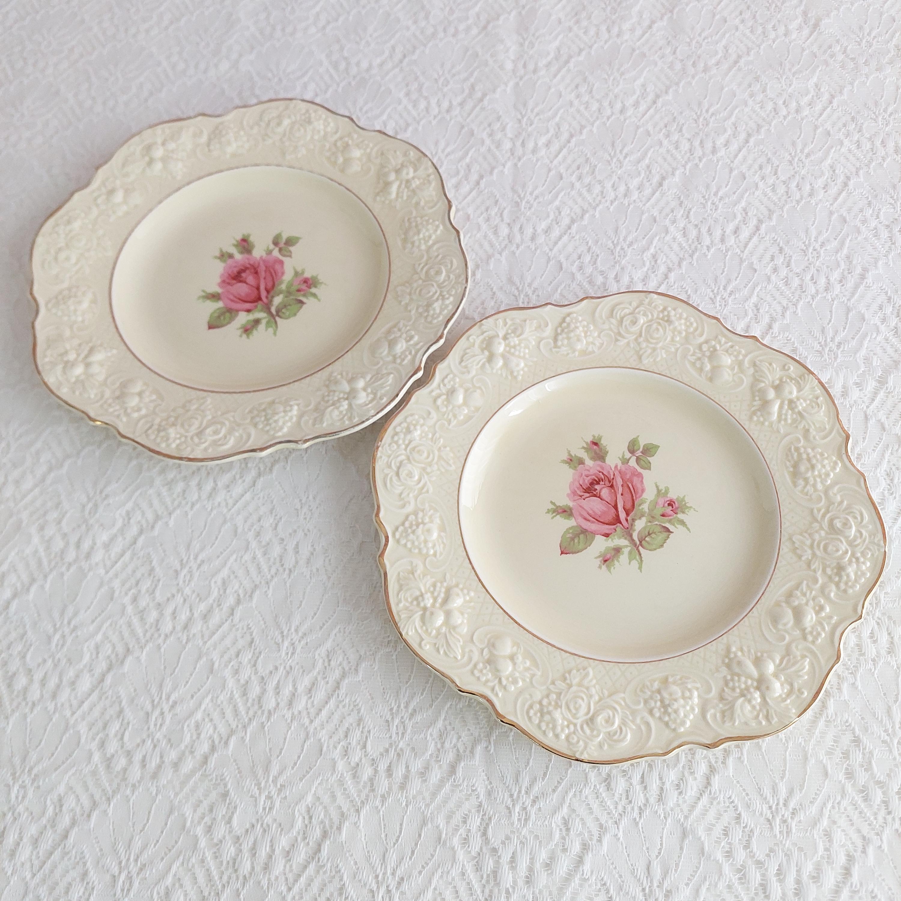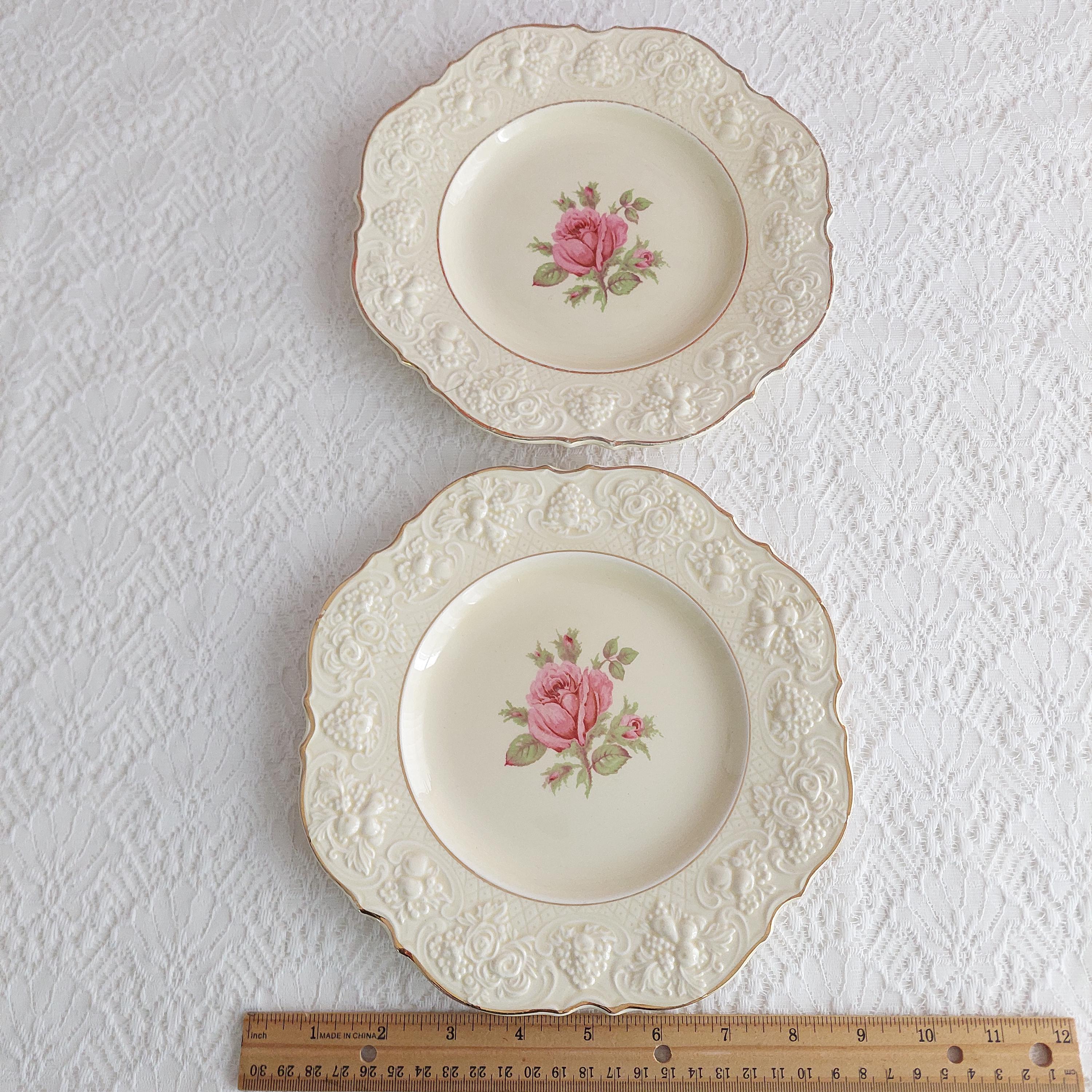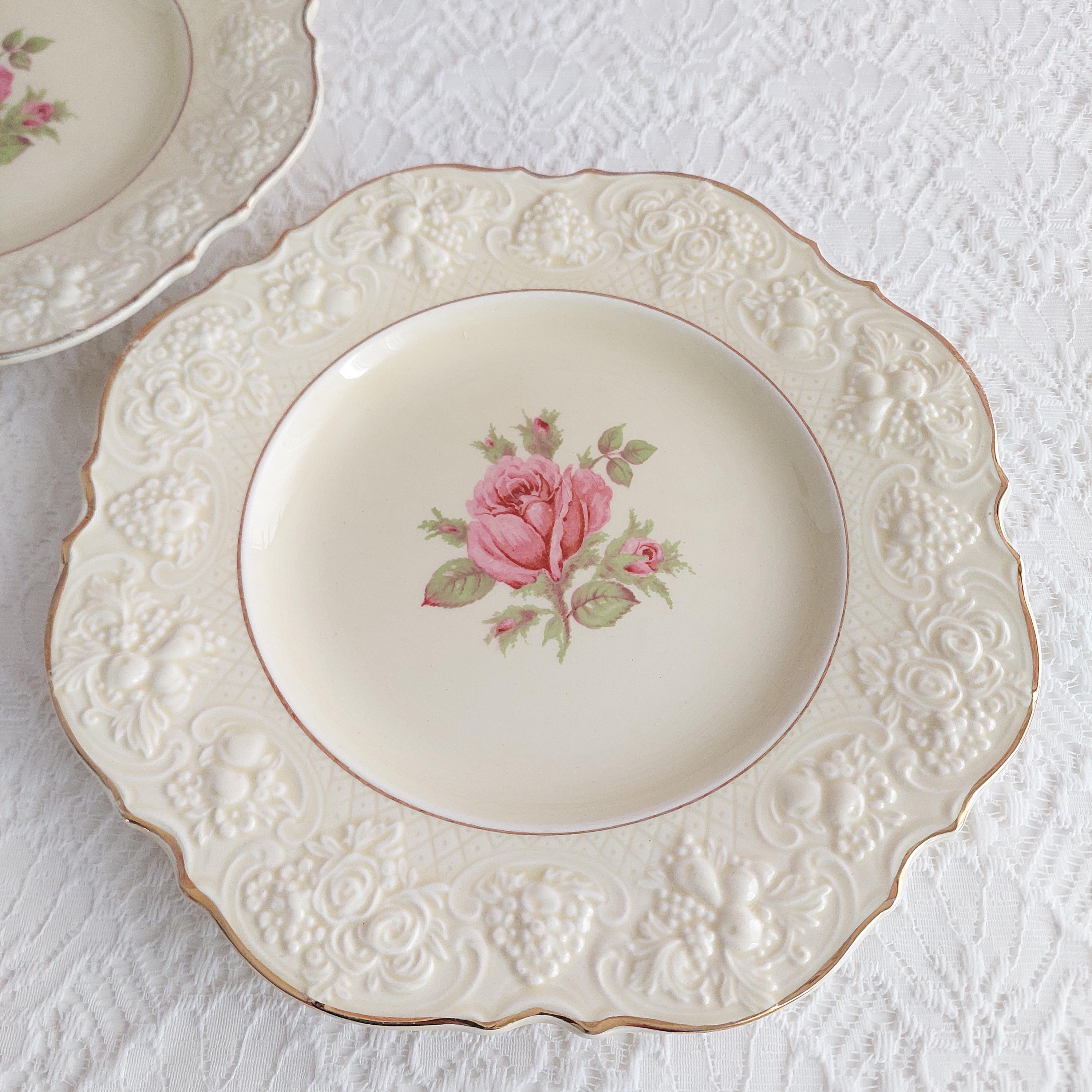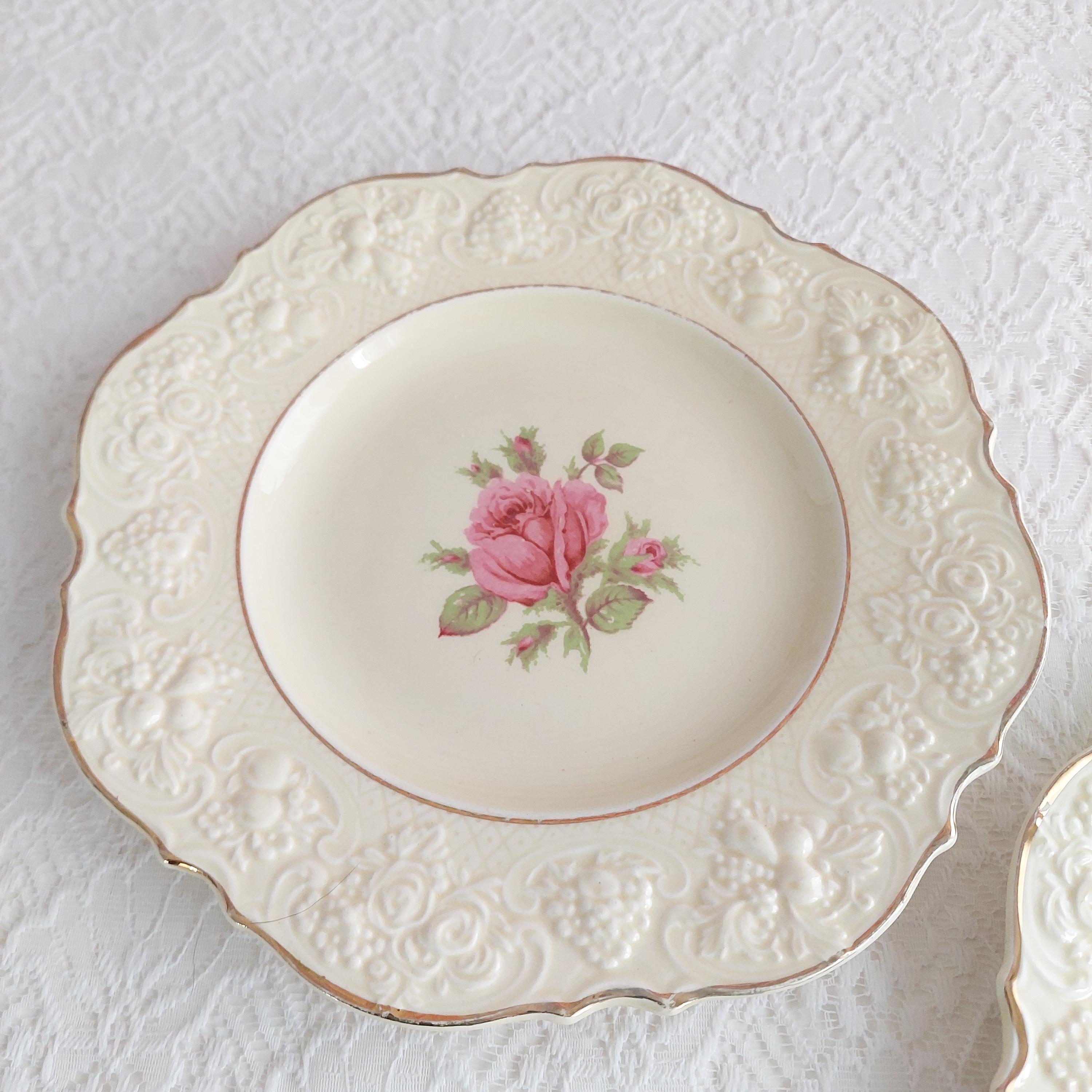 Crown Ducal Florentine Rose OR Rose Marie (pink) luncheon plates with pink rose in center of creamy background. Honey glazed ivory ceramic with a raised floral pattern on rim. Pattern is also known by pattern number 5379 or CRD 261 Rose. Made in England, circa 1915