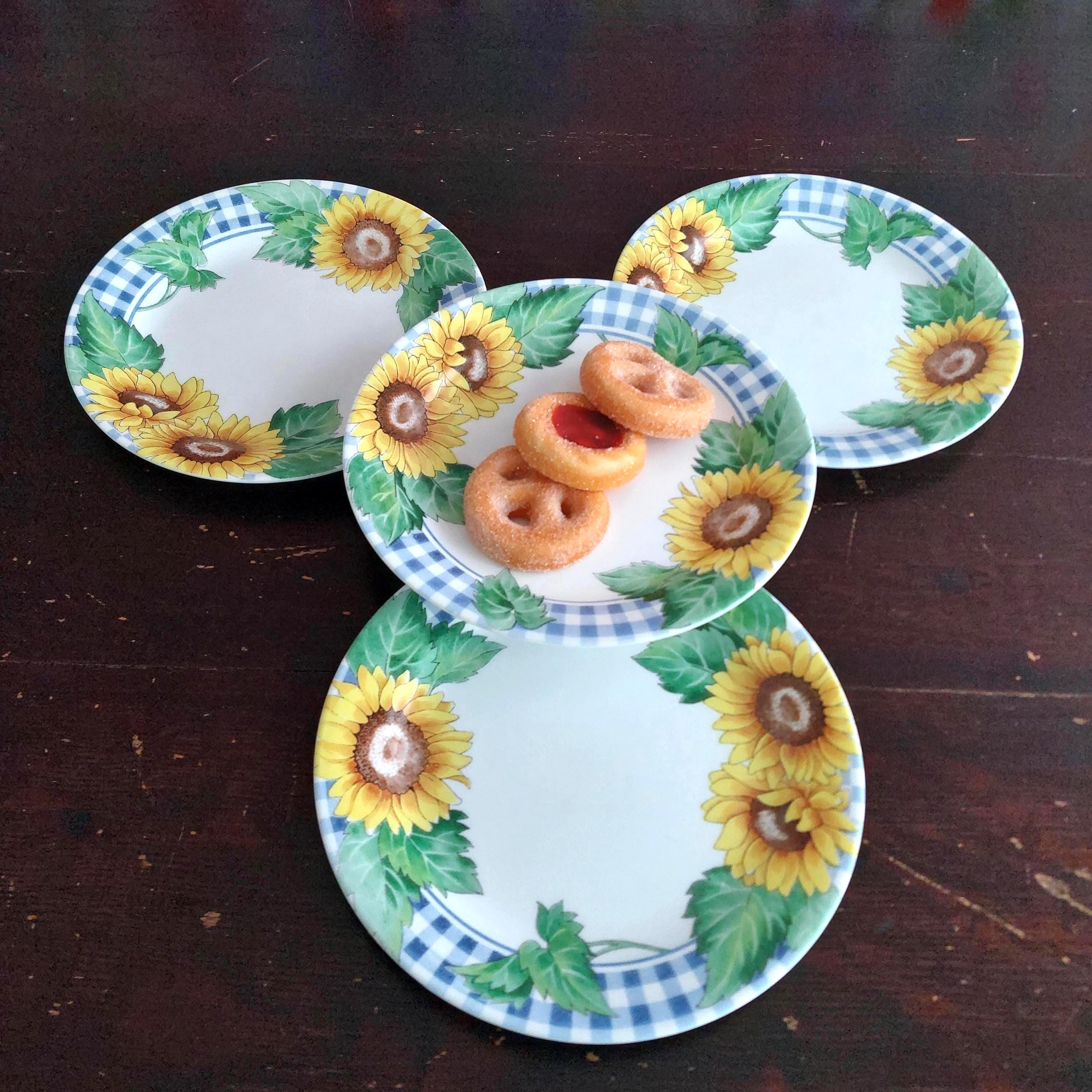 Corelle Sunsations 7.25 inch salad plates, featuring vibrant yellow sunflowers and green leaves set against a blue and white checkered (gingham) border.