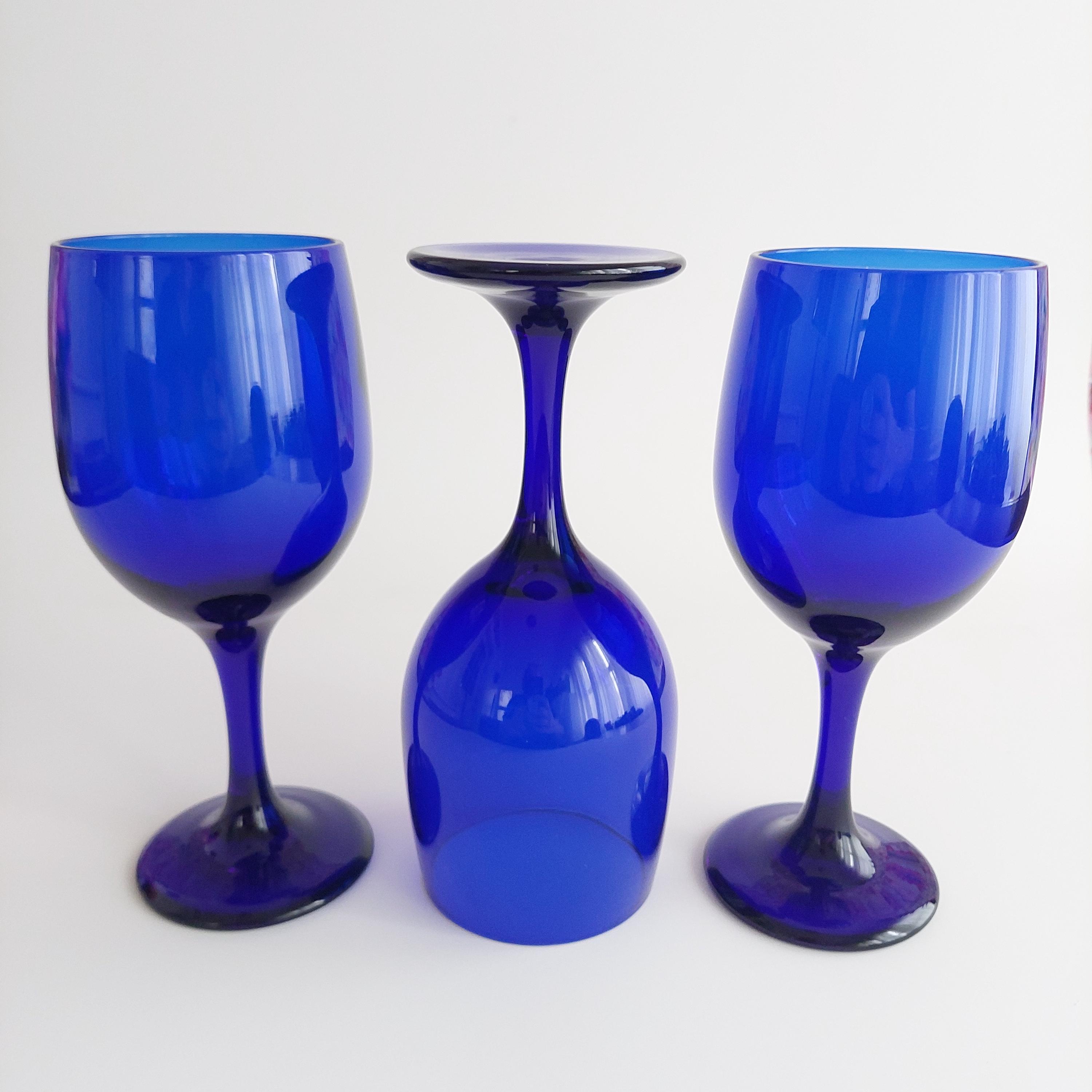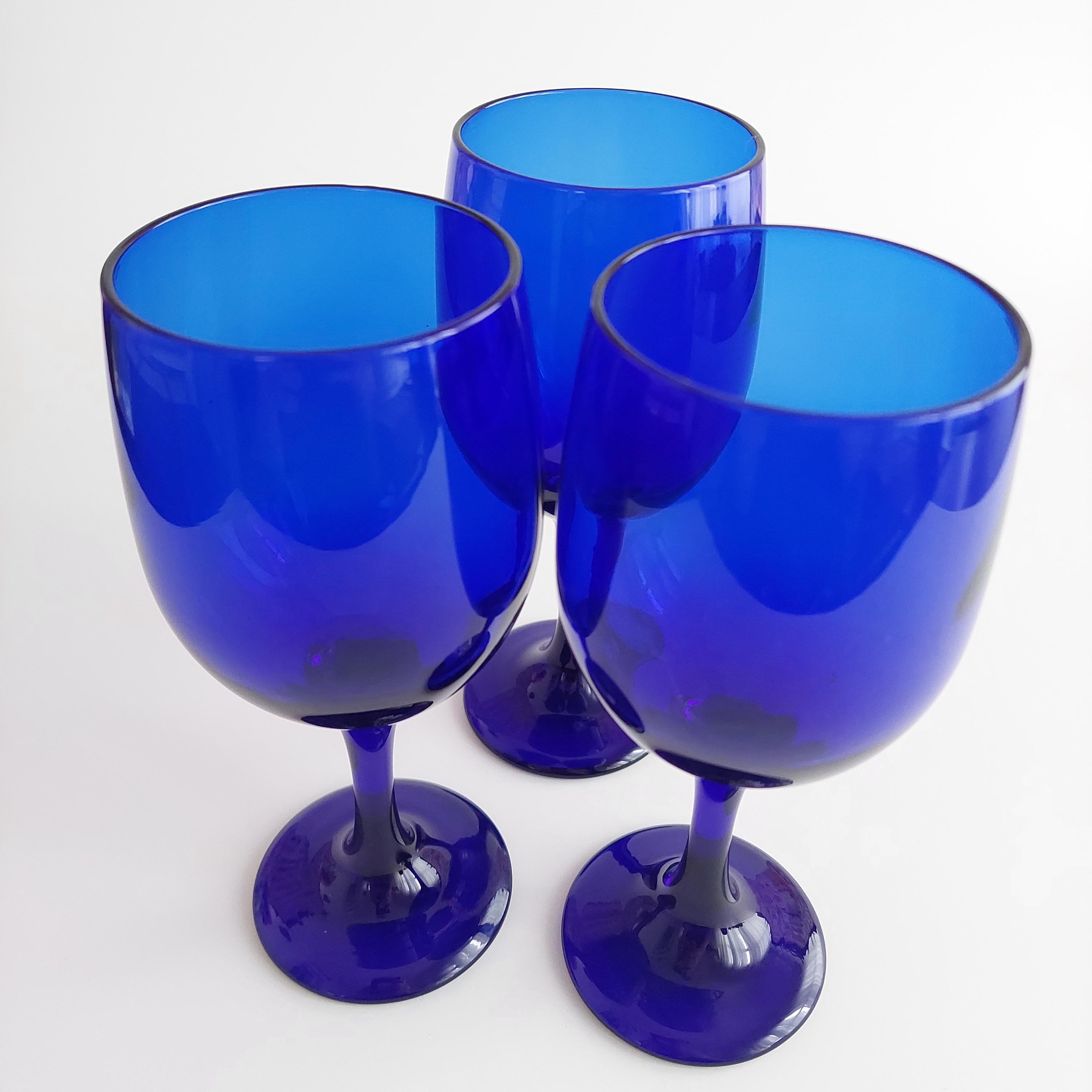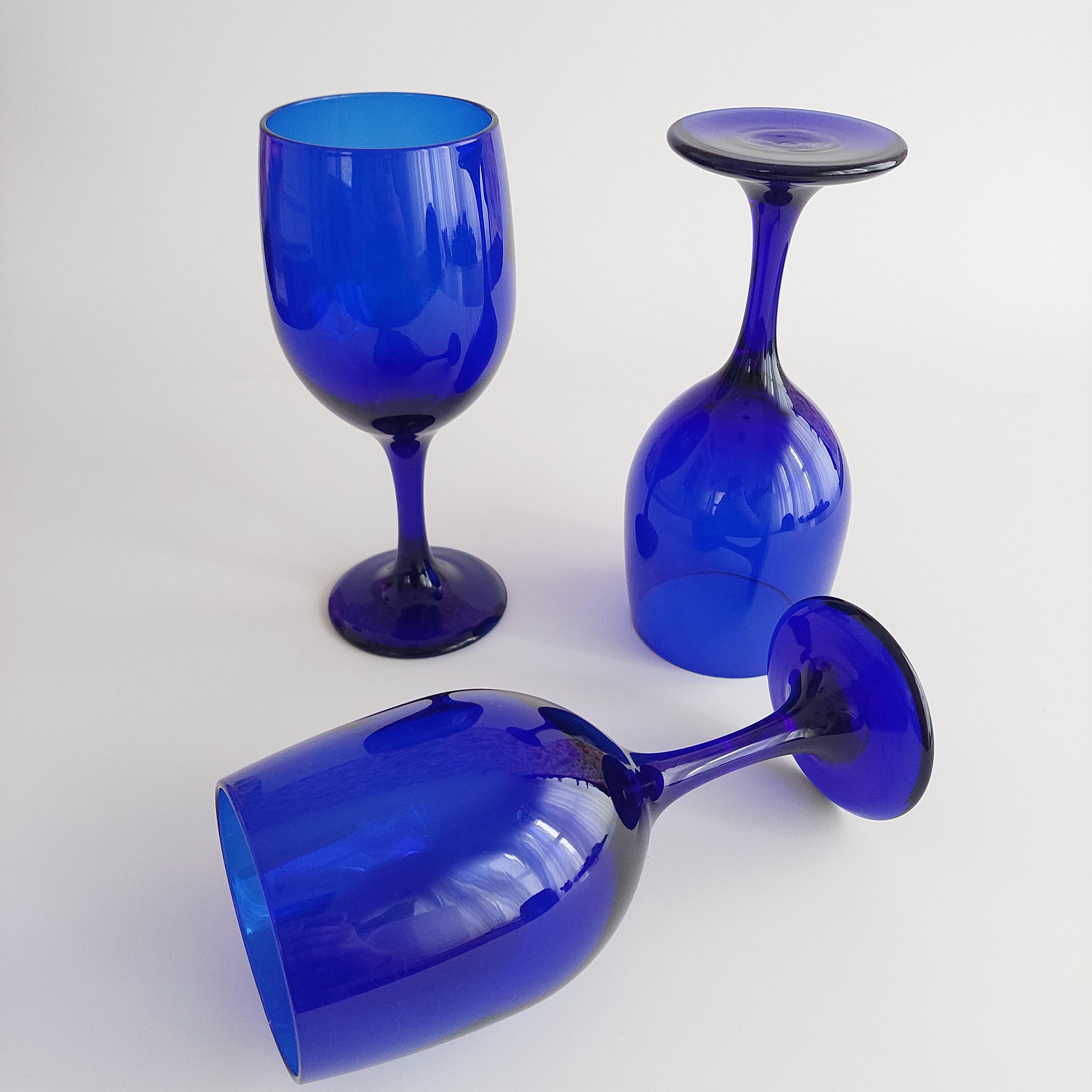 Vintage hand blown wine glass set, featuring a solid vibrant blue color and tulip shape.
