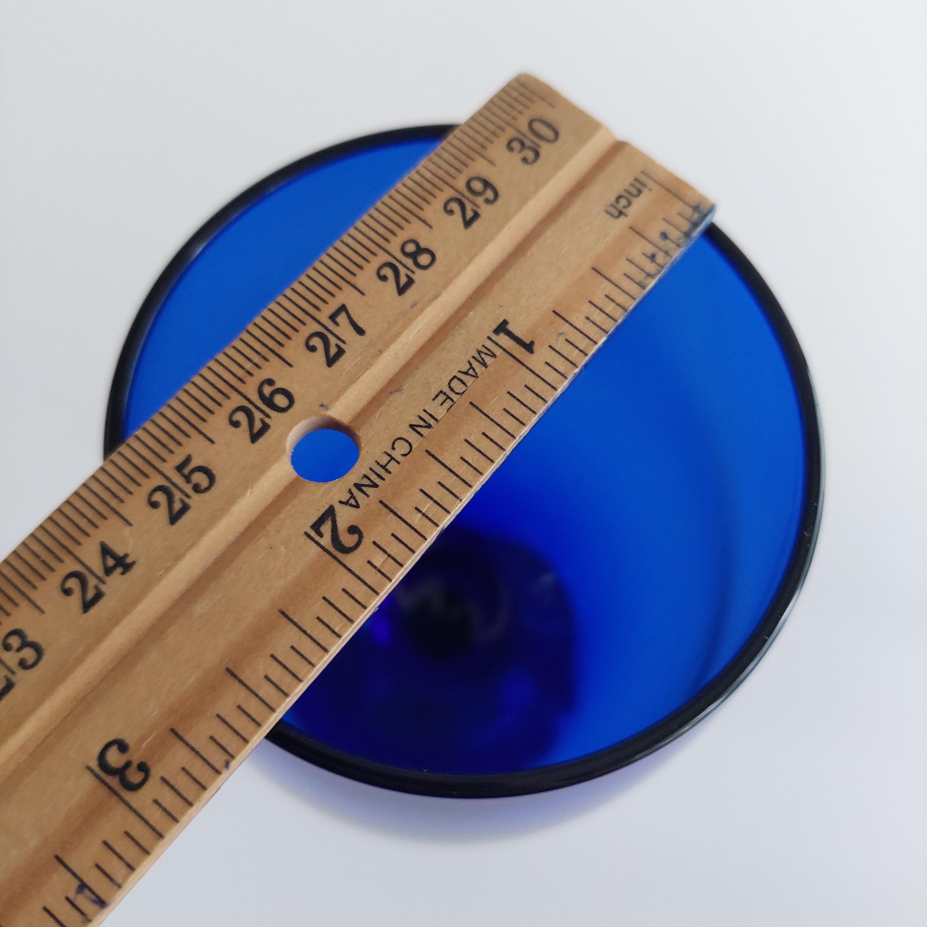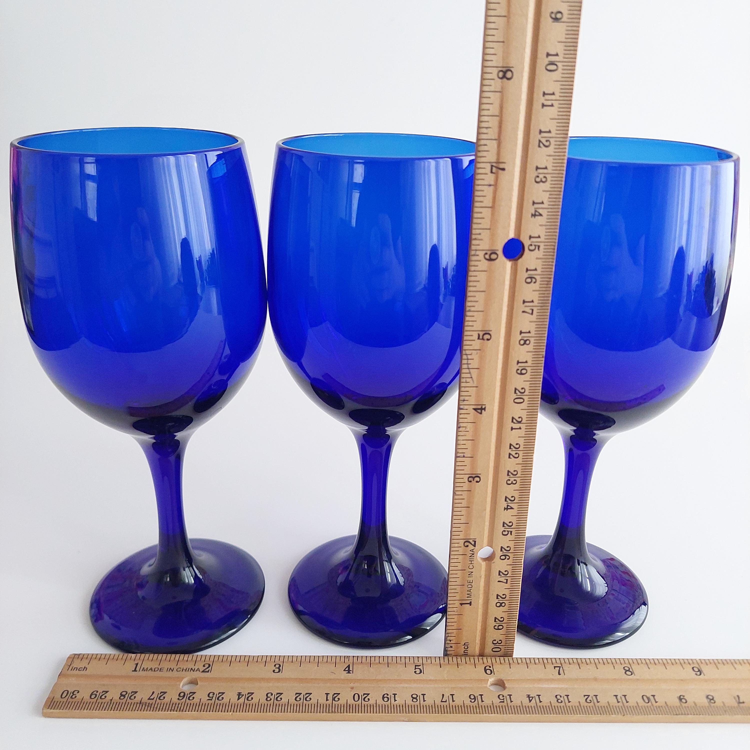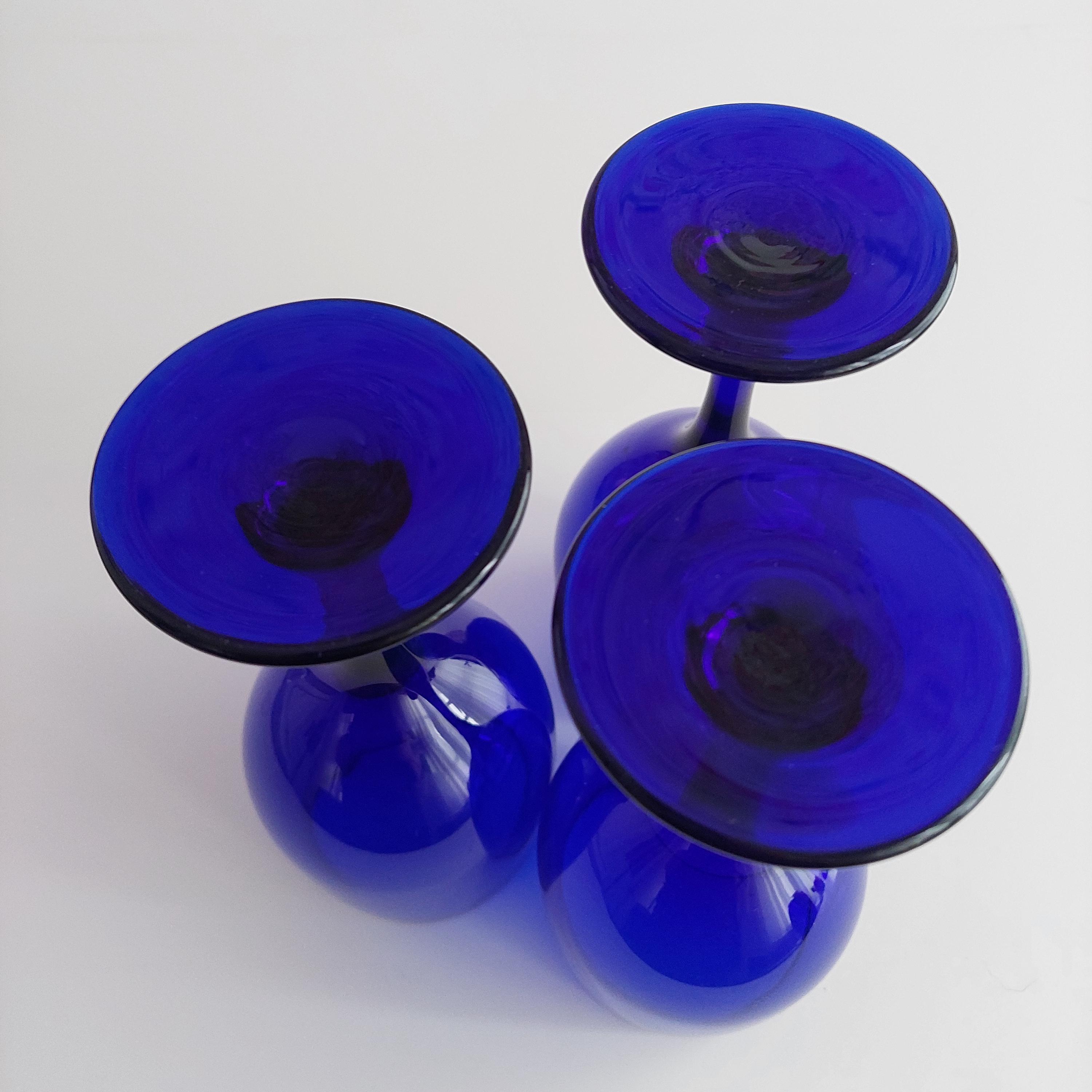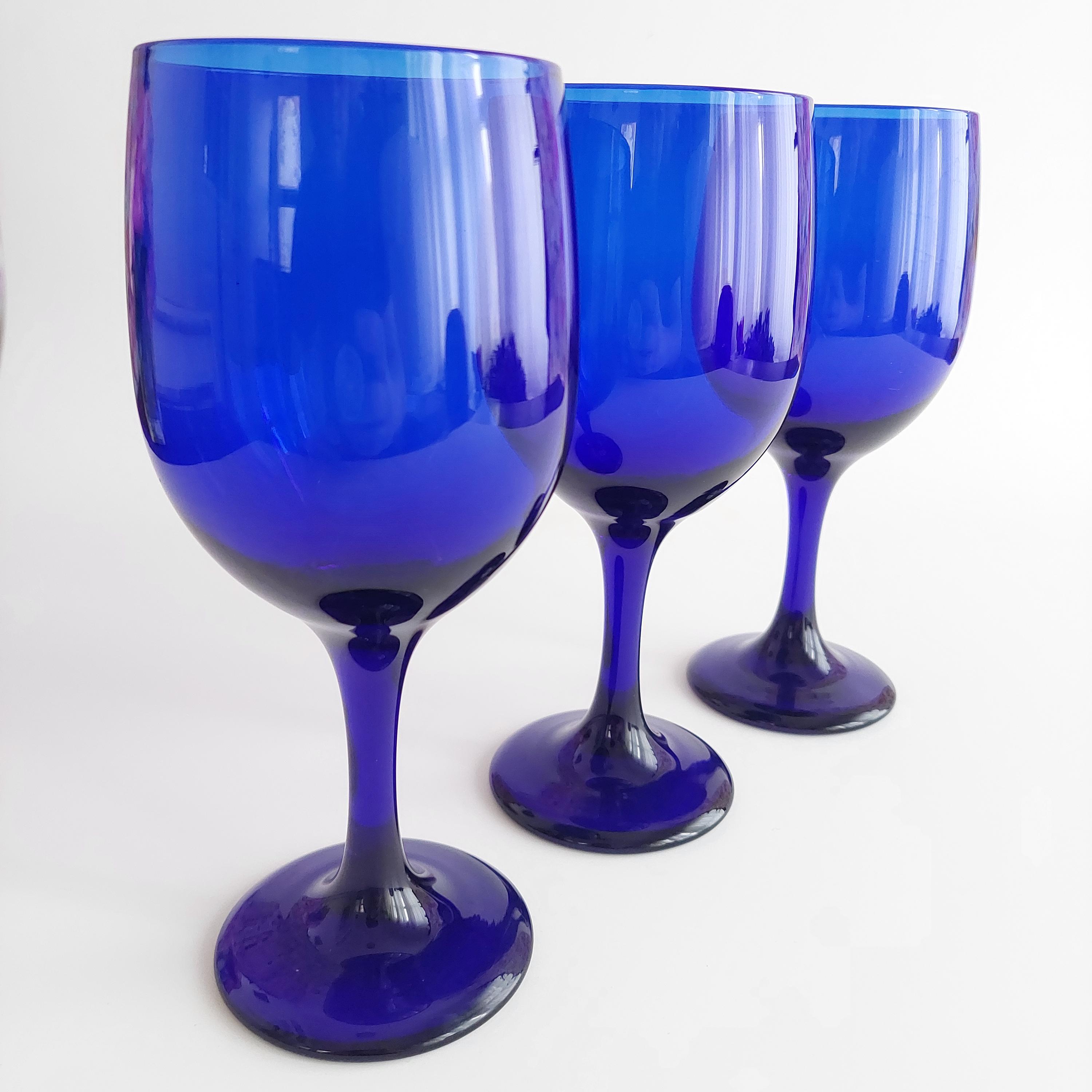 Vintage hand blown wine glass set, featuring a solid vibrant blue color and tulip shape.