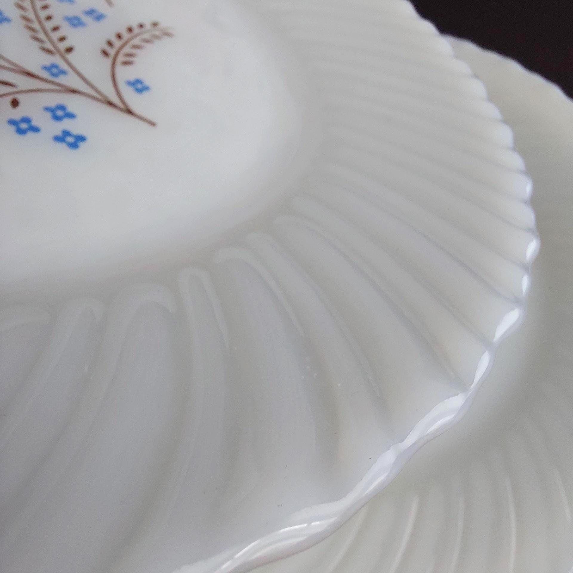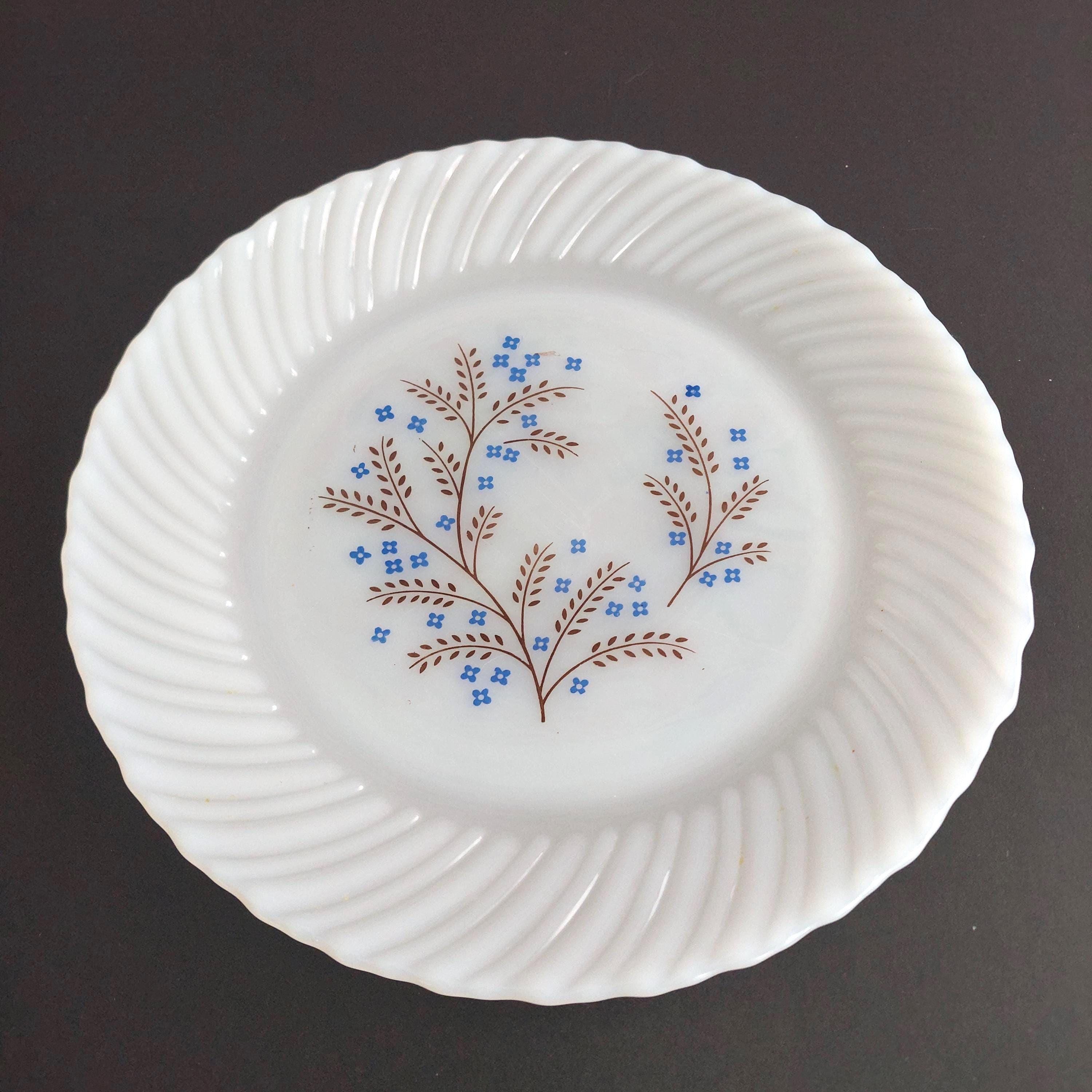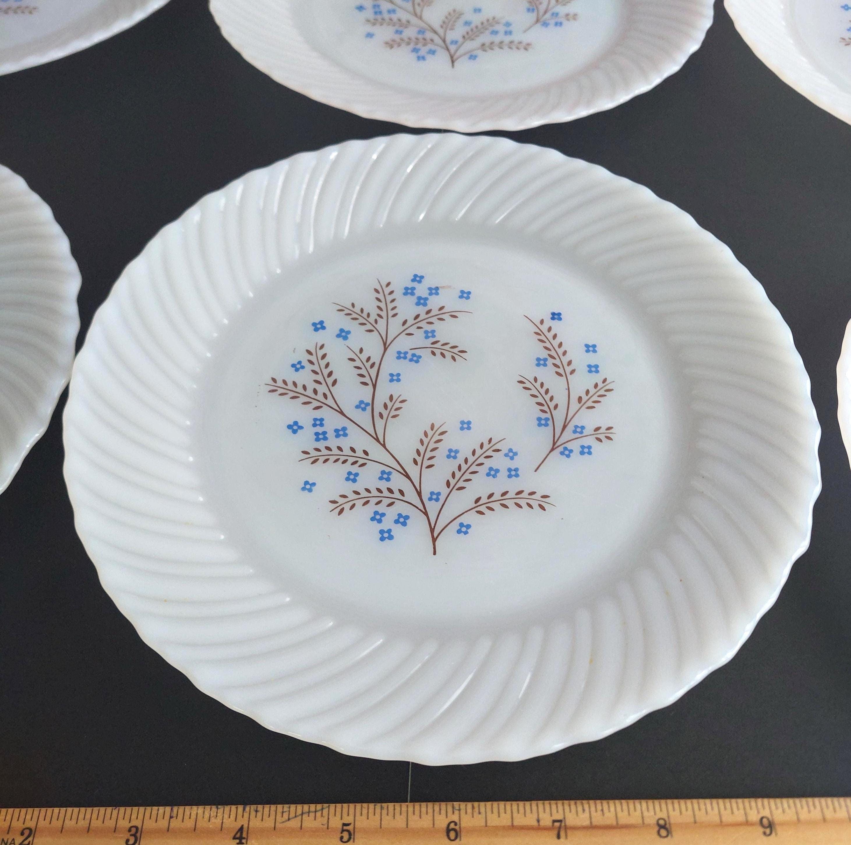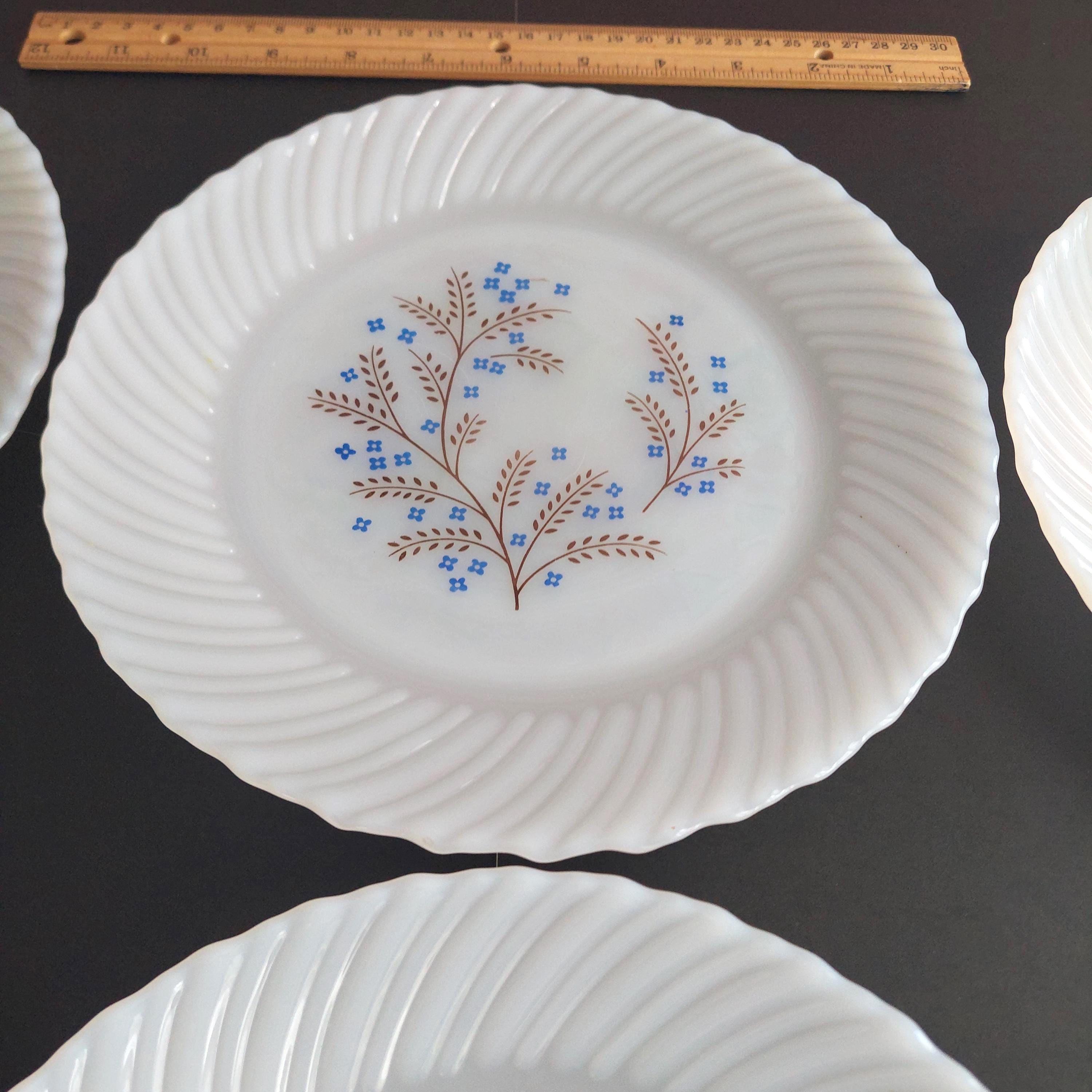 Perfect for vintage collectors, retro kitchen lovers, or anyone looking to add a touch of mid-century charm to their dining table. These 1960s Termocisa Mexico milk glass luncheon plates feature a crisp white base with a swirling rim and a delicate blue floral design, making them ideal for brunches, tea parties, or everyday meals.