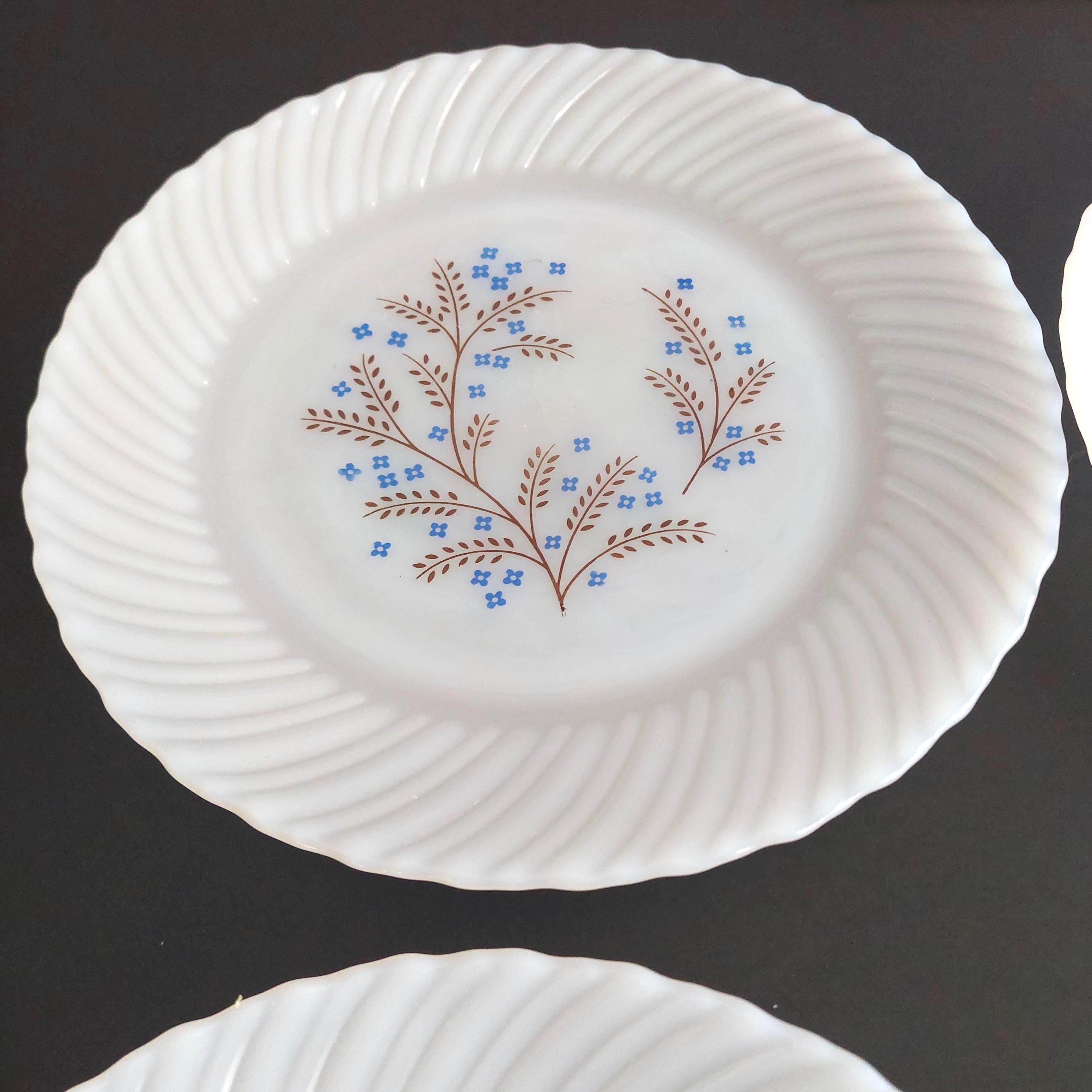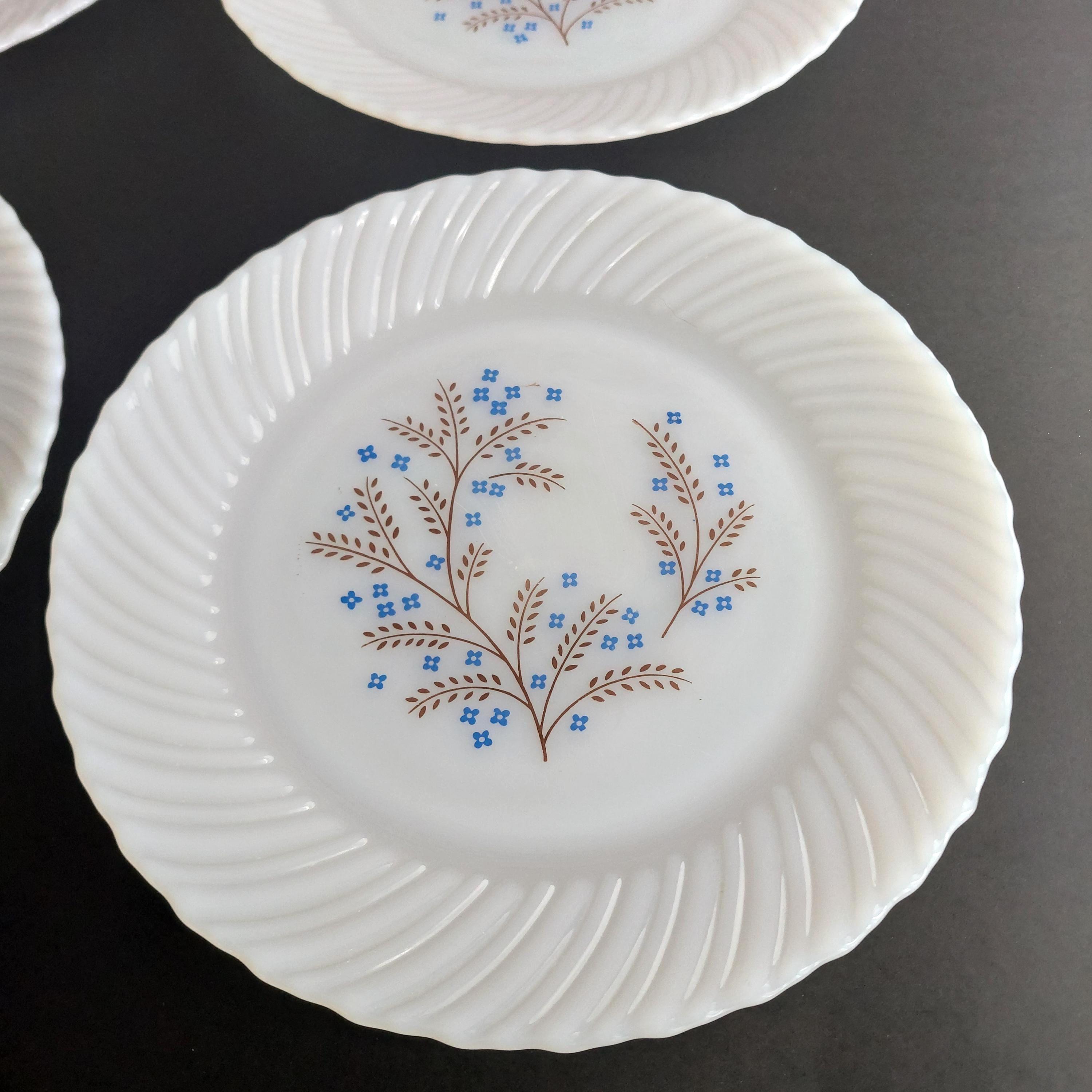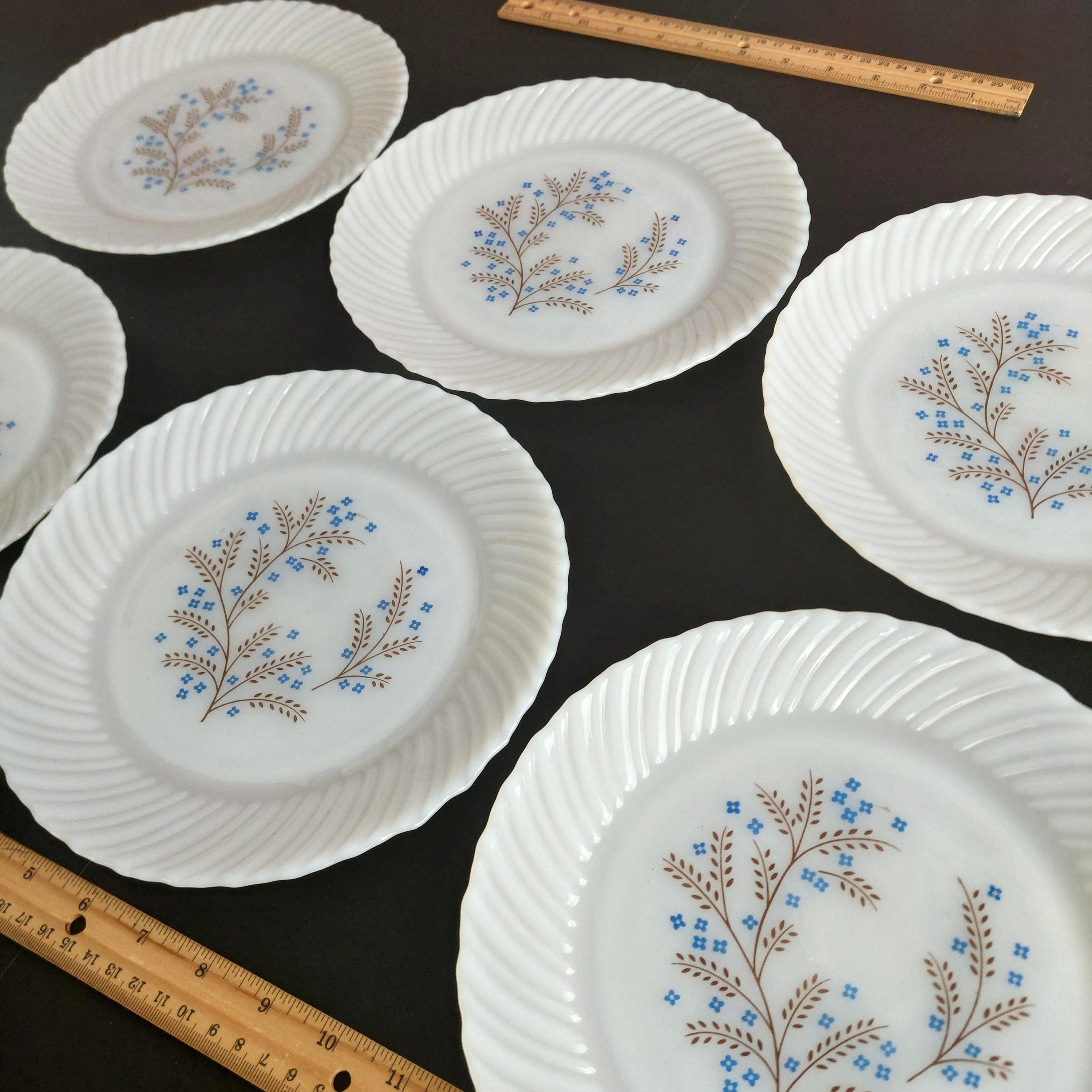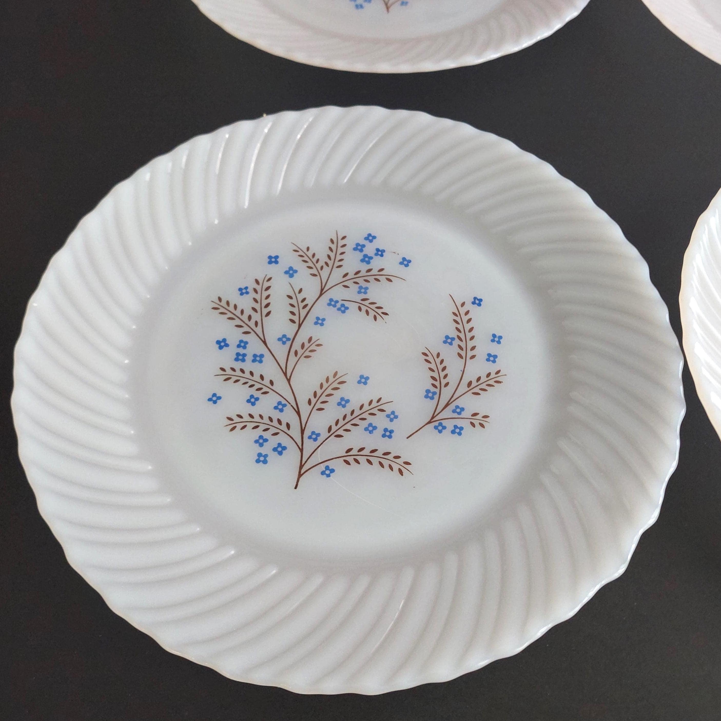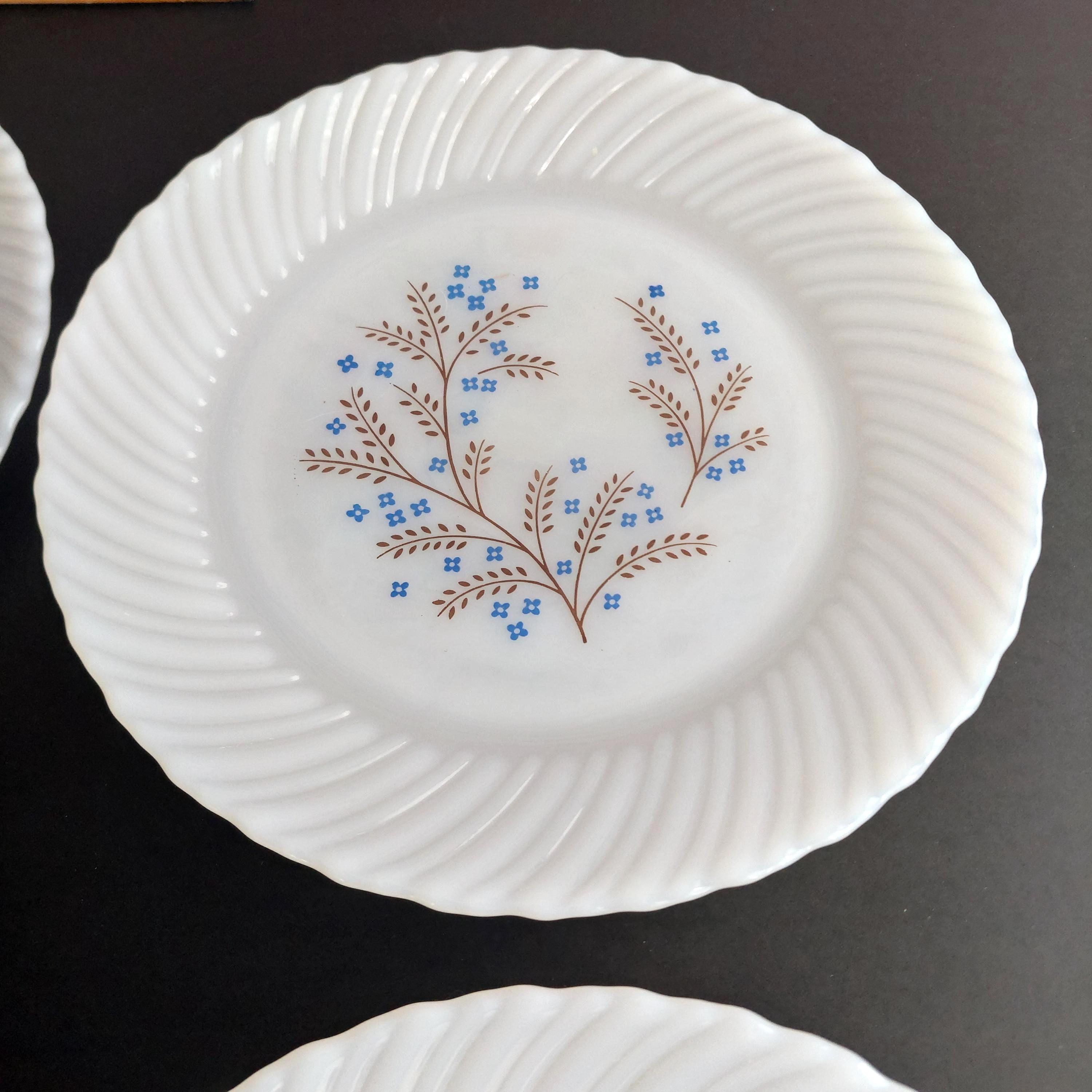 Perfect for vintage collectors, retro kitchen lovers, or anyone looking to add a touch of mid-century charm to their dining table. These 1960s Termocisa Mexico milk glass luncheon plates feature a crisp white base with a swirling rim and a delicate blue floral design, making them ideal for brunches, tea parties, or everyday meals.