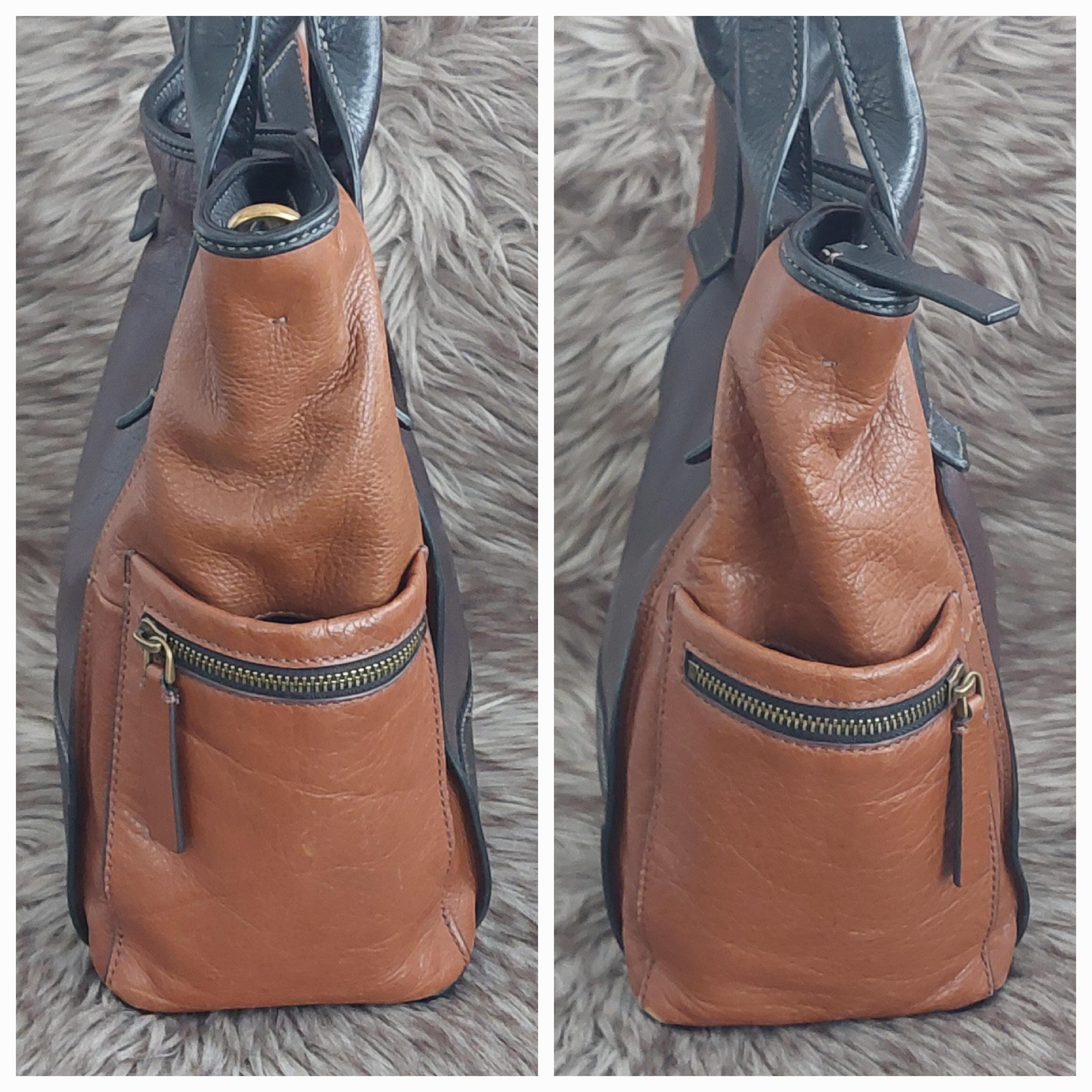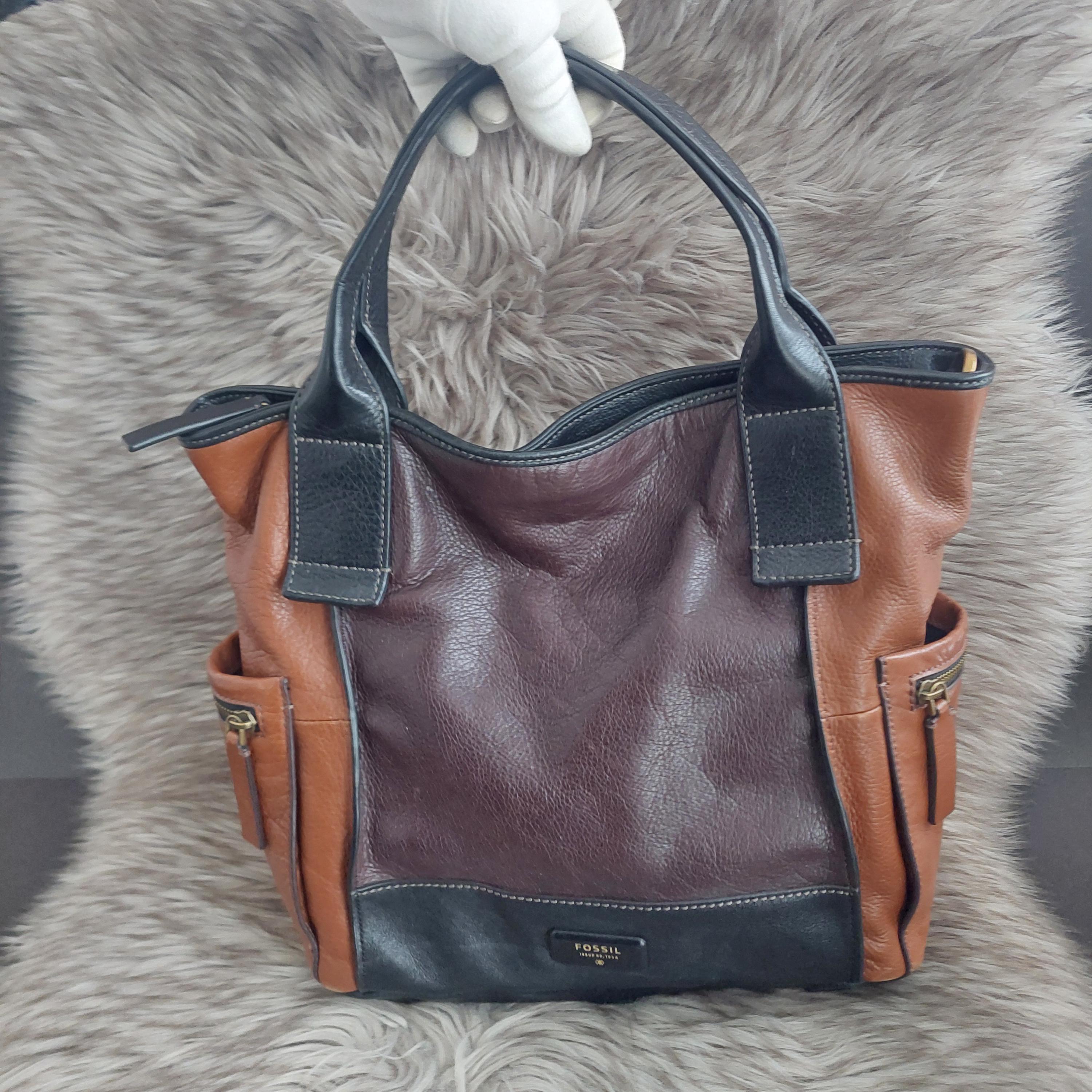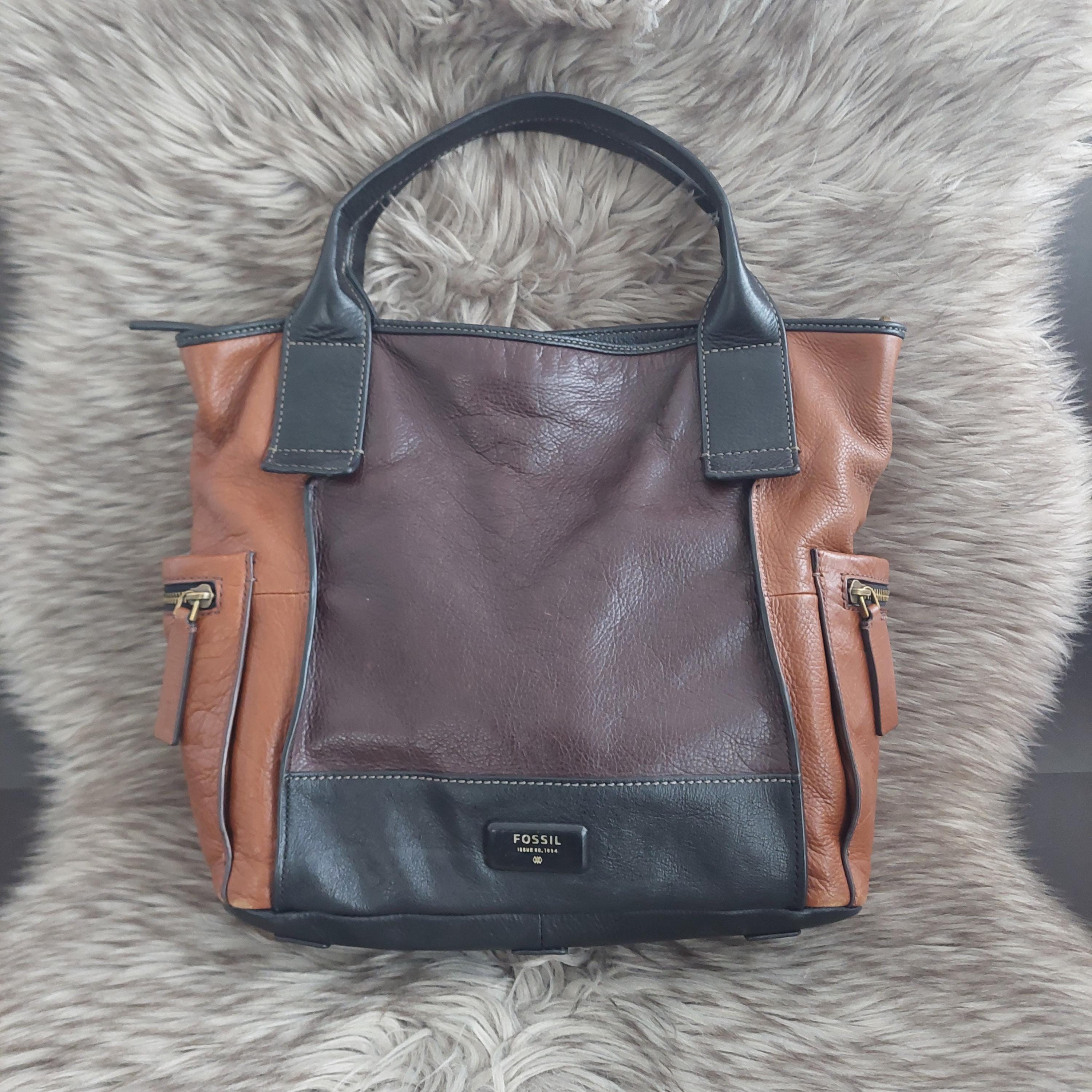 Vintage Fossil Emerson satchel. A versatile medium-sized handbag crafted from leather. Tricolor design features a combination of black and two shades of brown. Designed for practicality, it includes two exterior side slide pockets and two zippered pockets. Zippered top closure. Interior side wall zippered pocket and two slip pockets. Originally would have included a detachable shoulder strap.