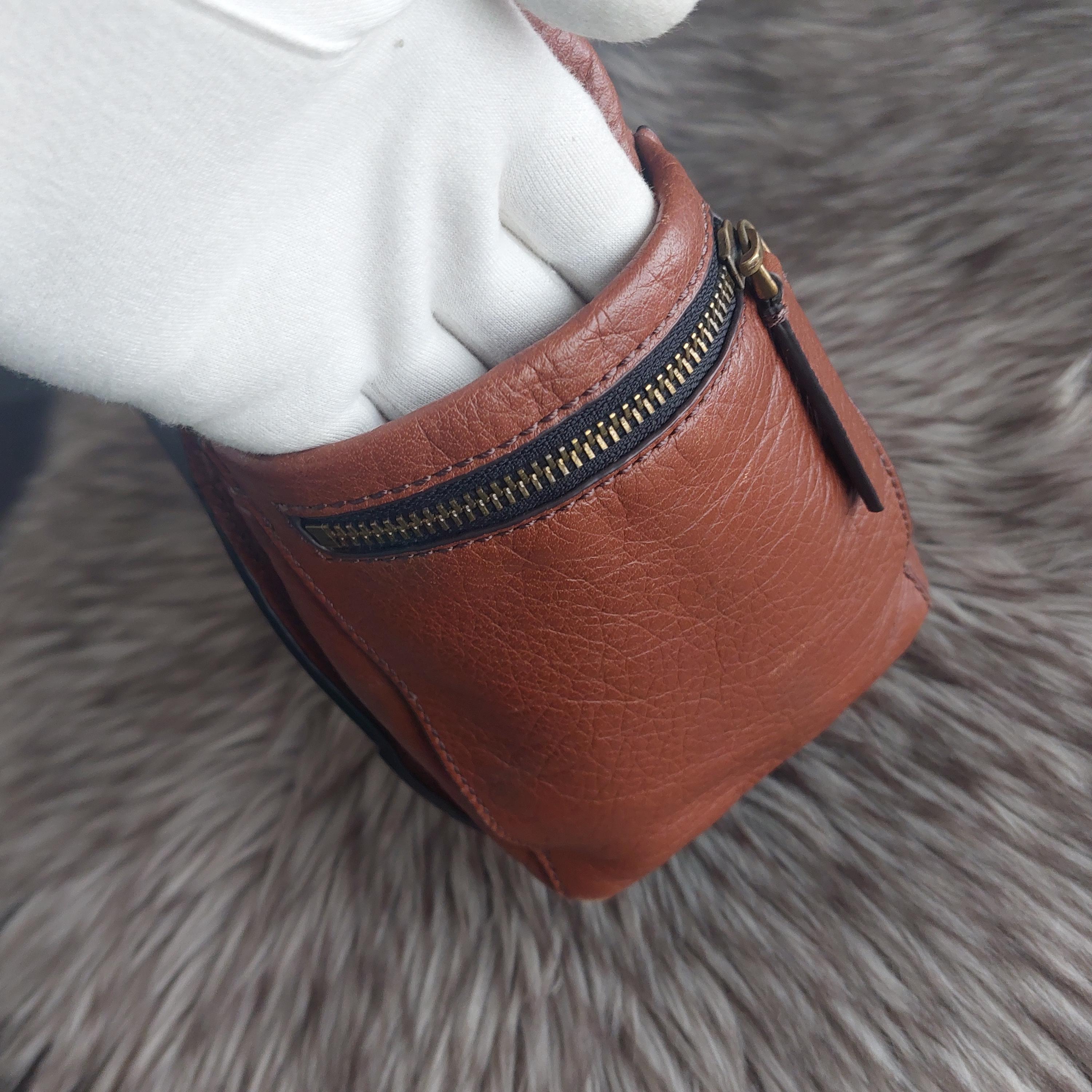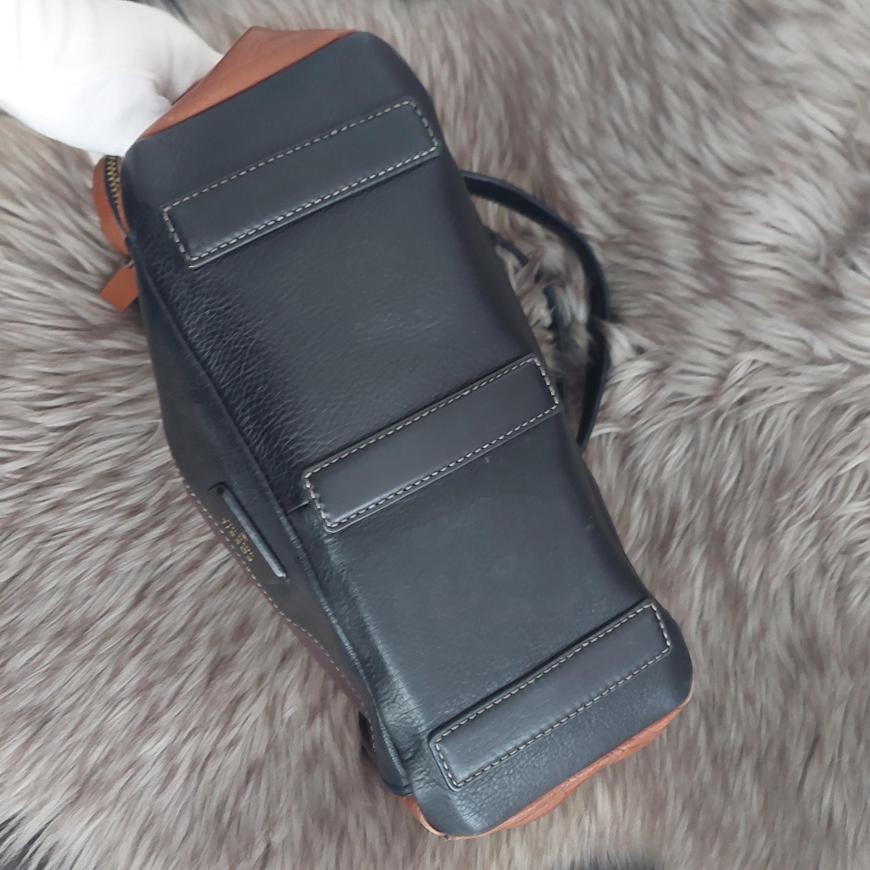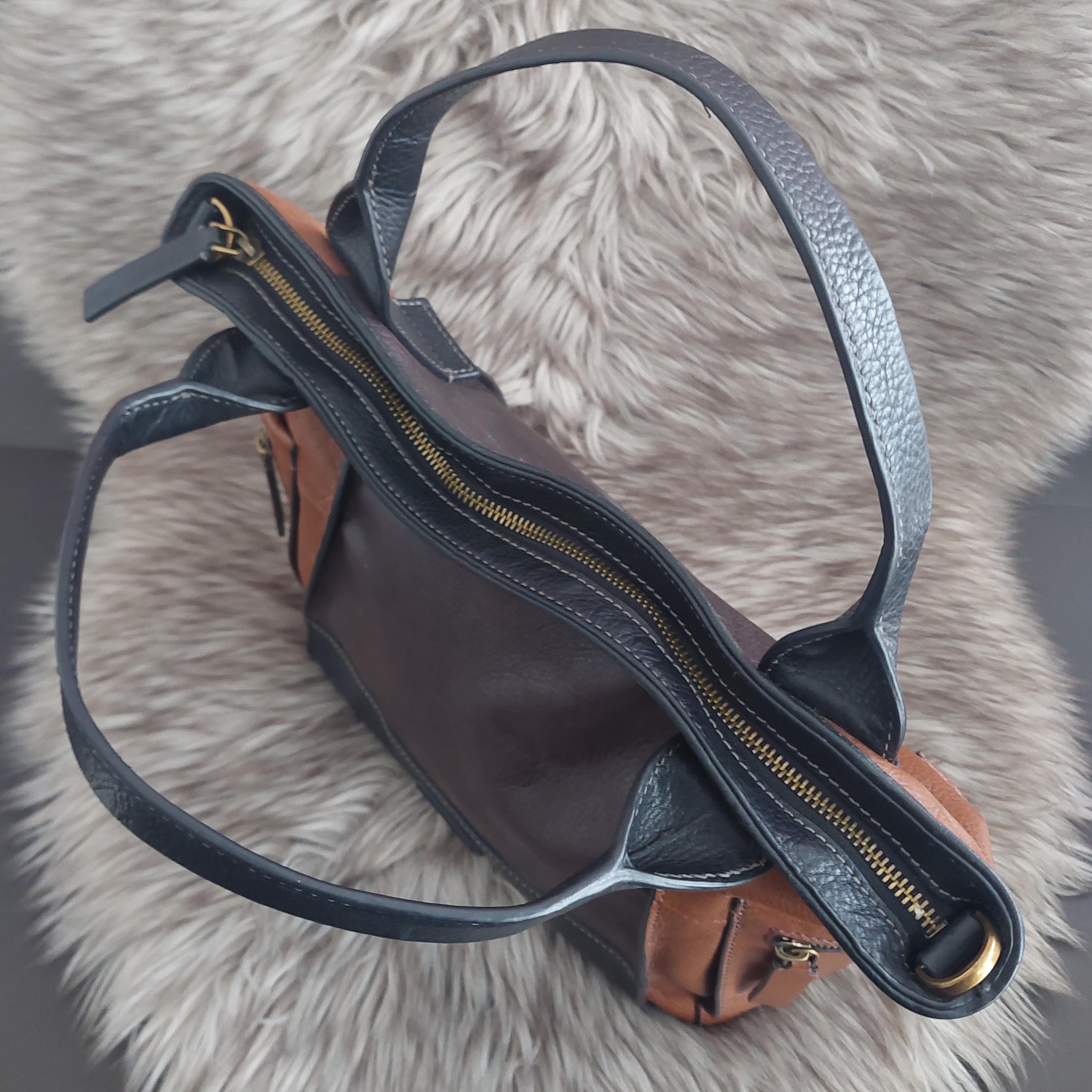 Vintage Fossil Emerson satchel. A versatile medium-sized handbag crafted from leather. Tricolor design features a combination of black and two shades of brown. Designed for practicality, it includes two exterior side slide pockets and two zippered pockets. Zippered top closure. Interior side wall zippered pocket and two slip pockets. Originally would have included a detachable shoulder strap.