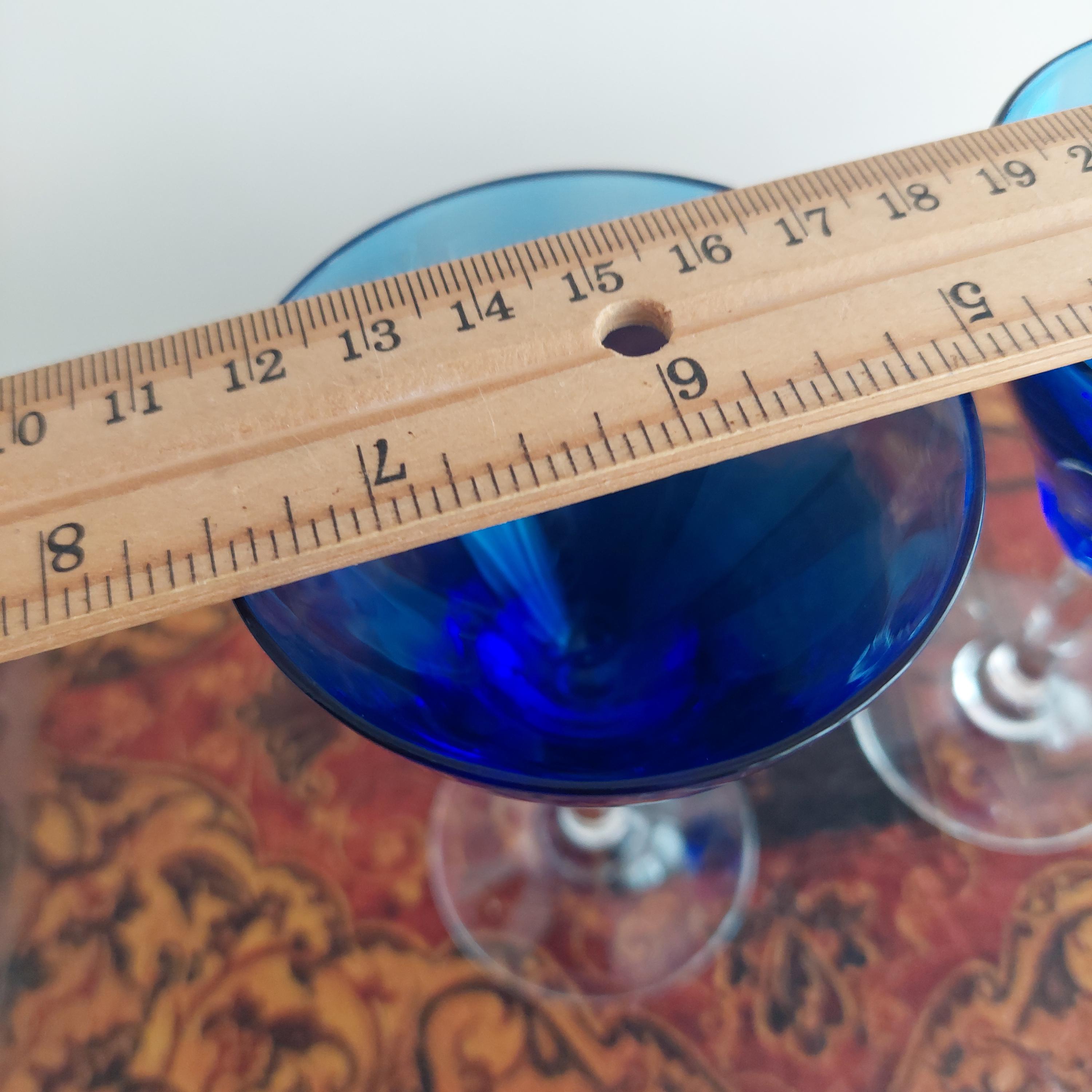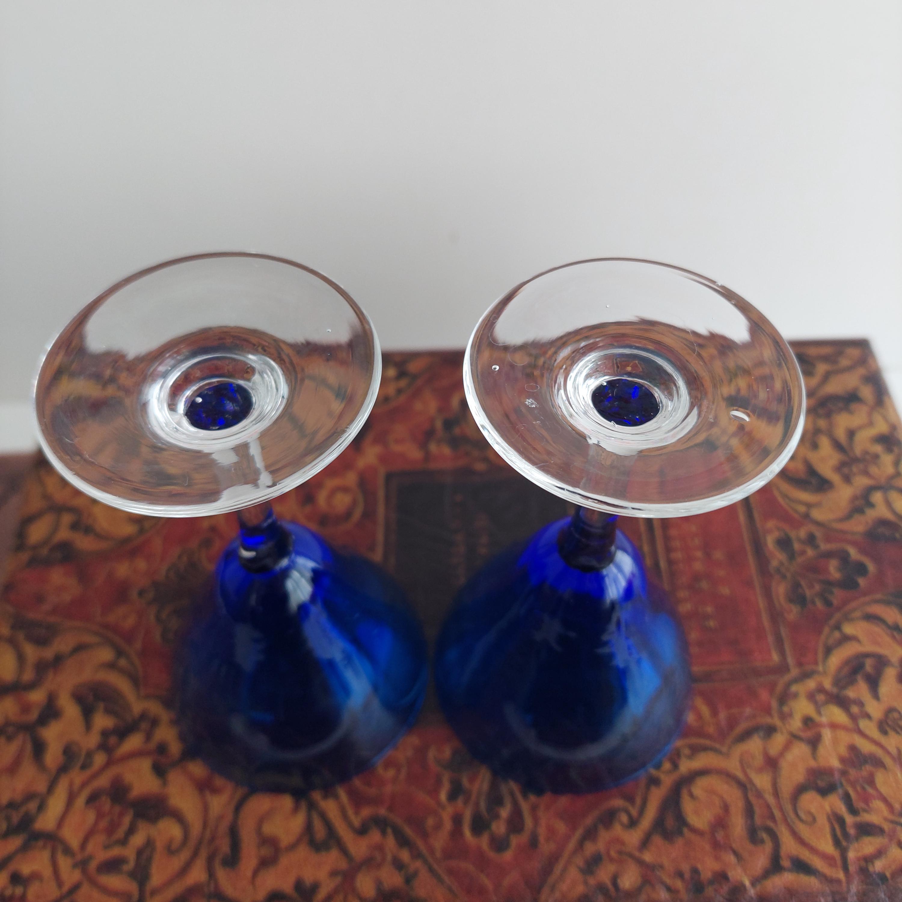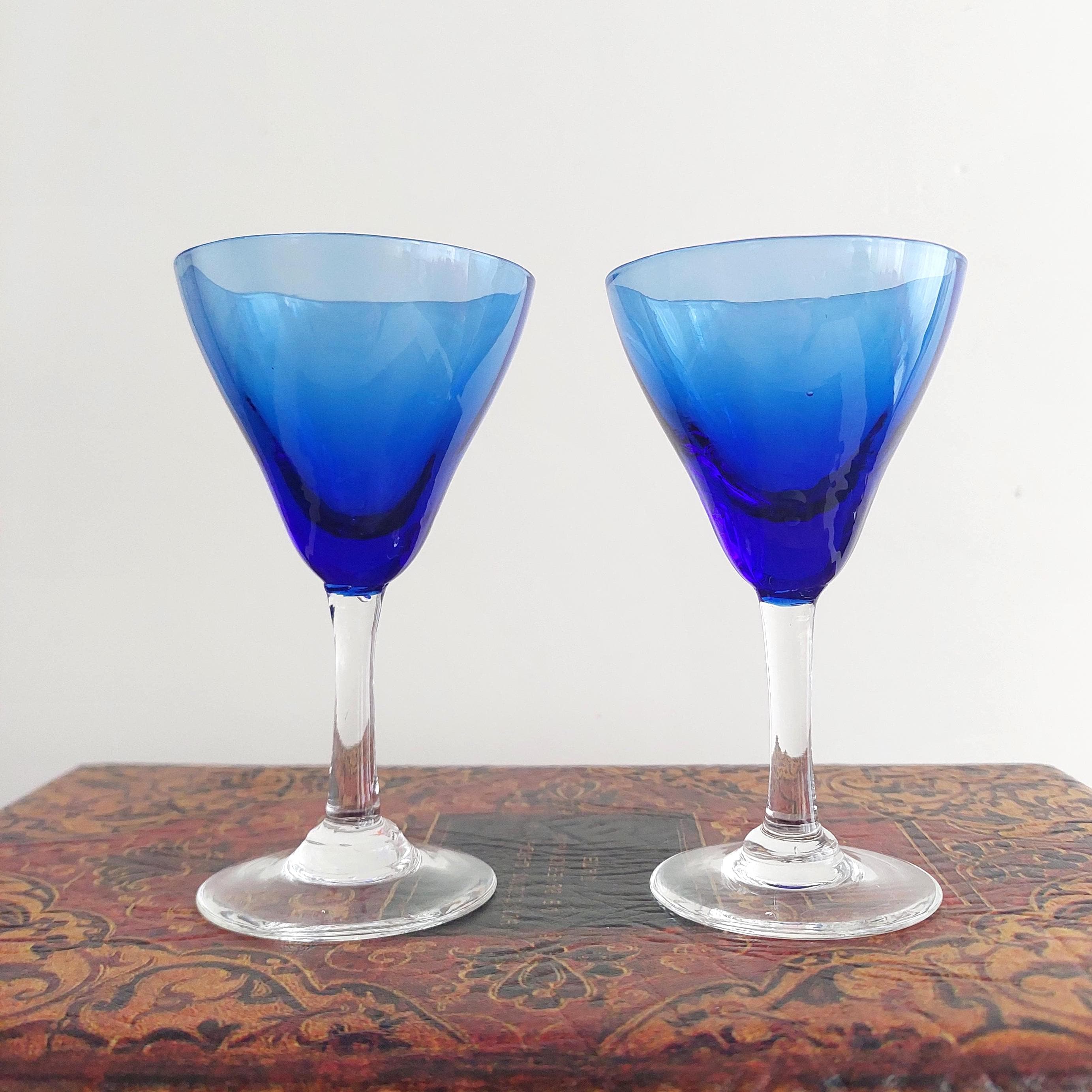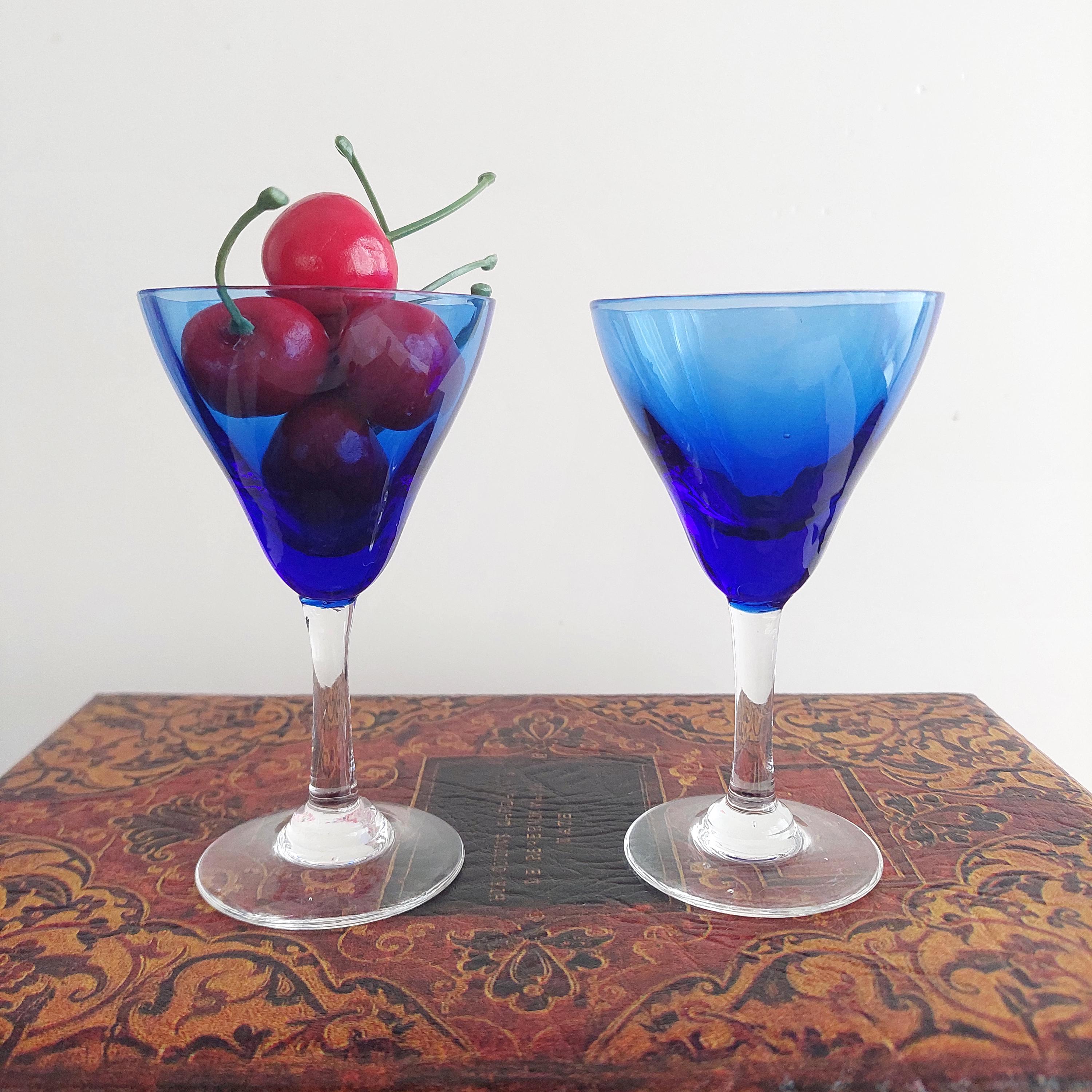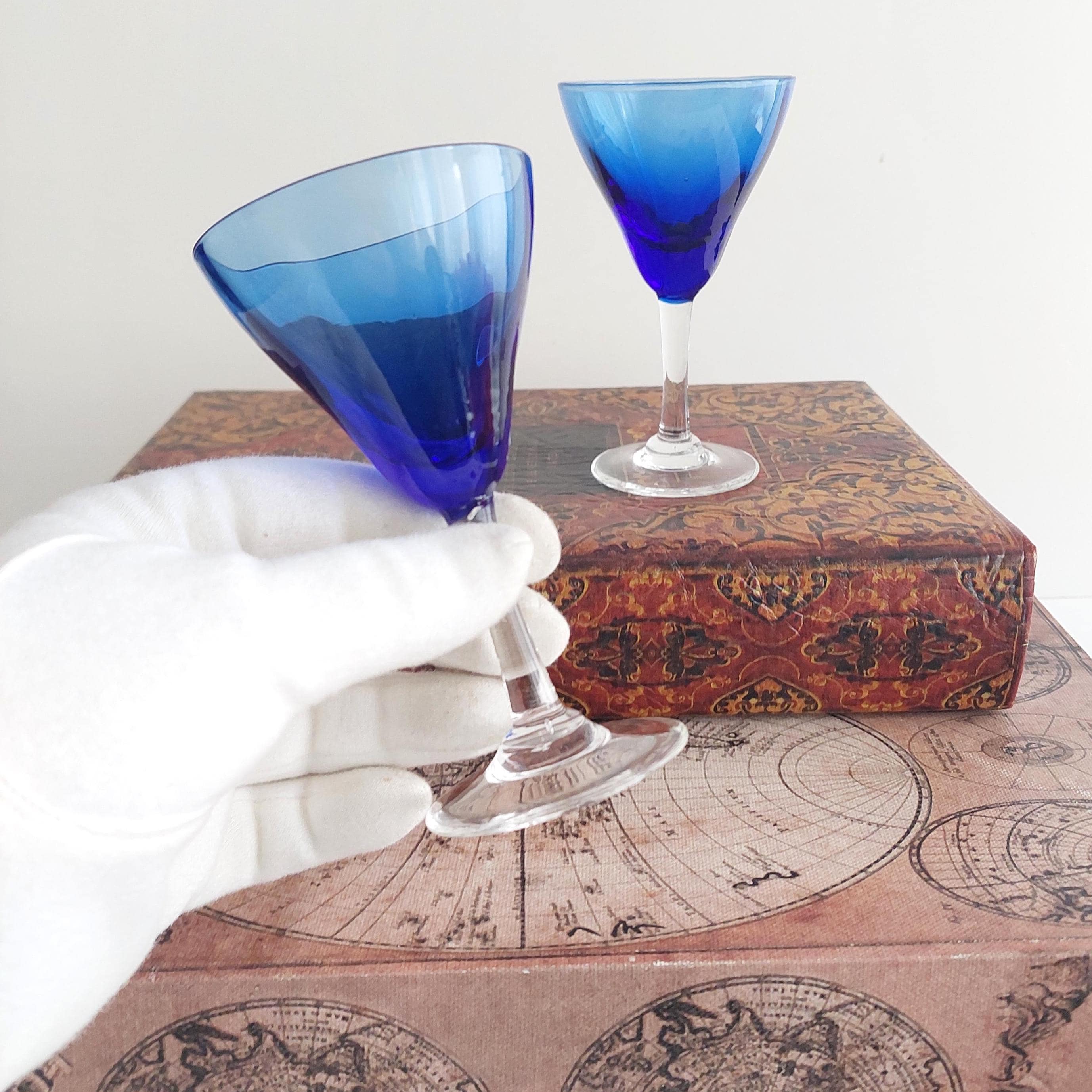 Vintage hand blown cordial glasses featuring blue optic bowl and clear stems.