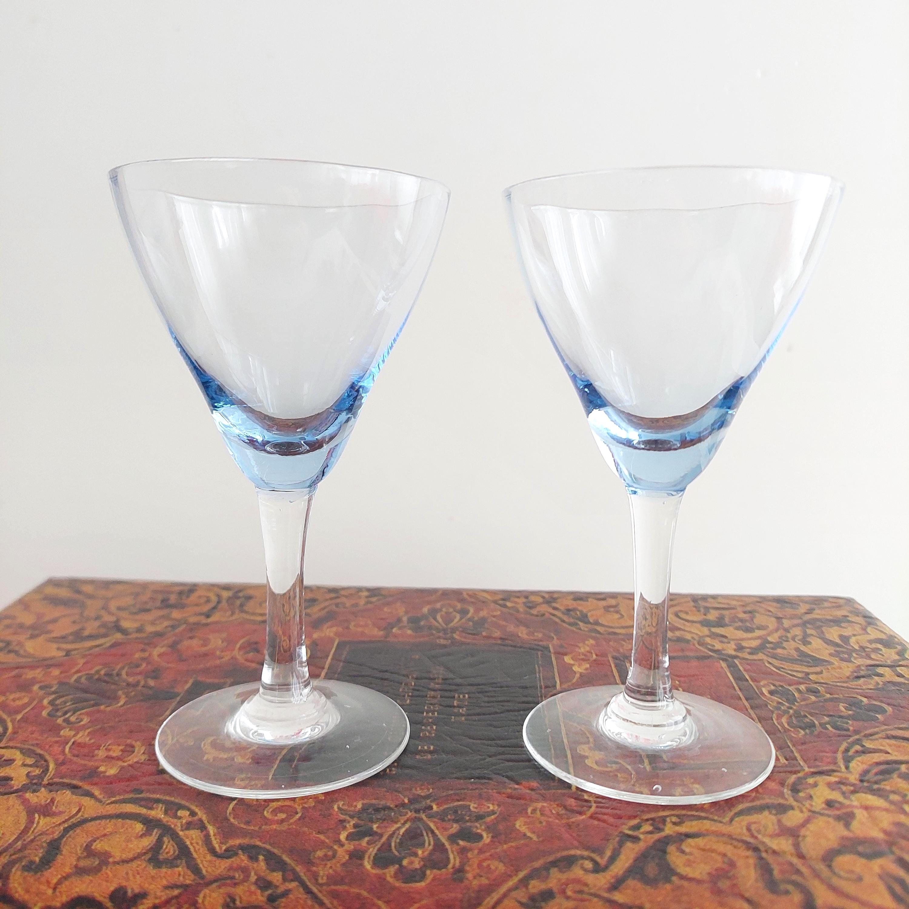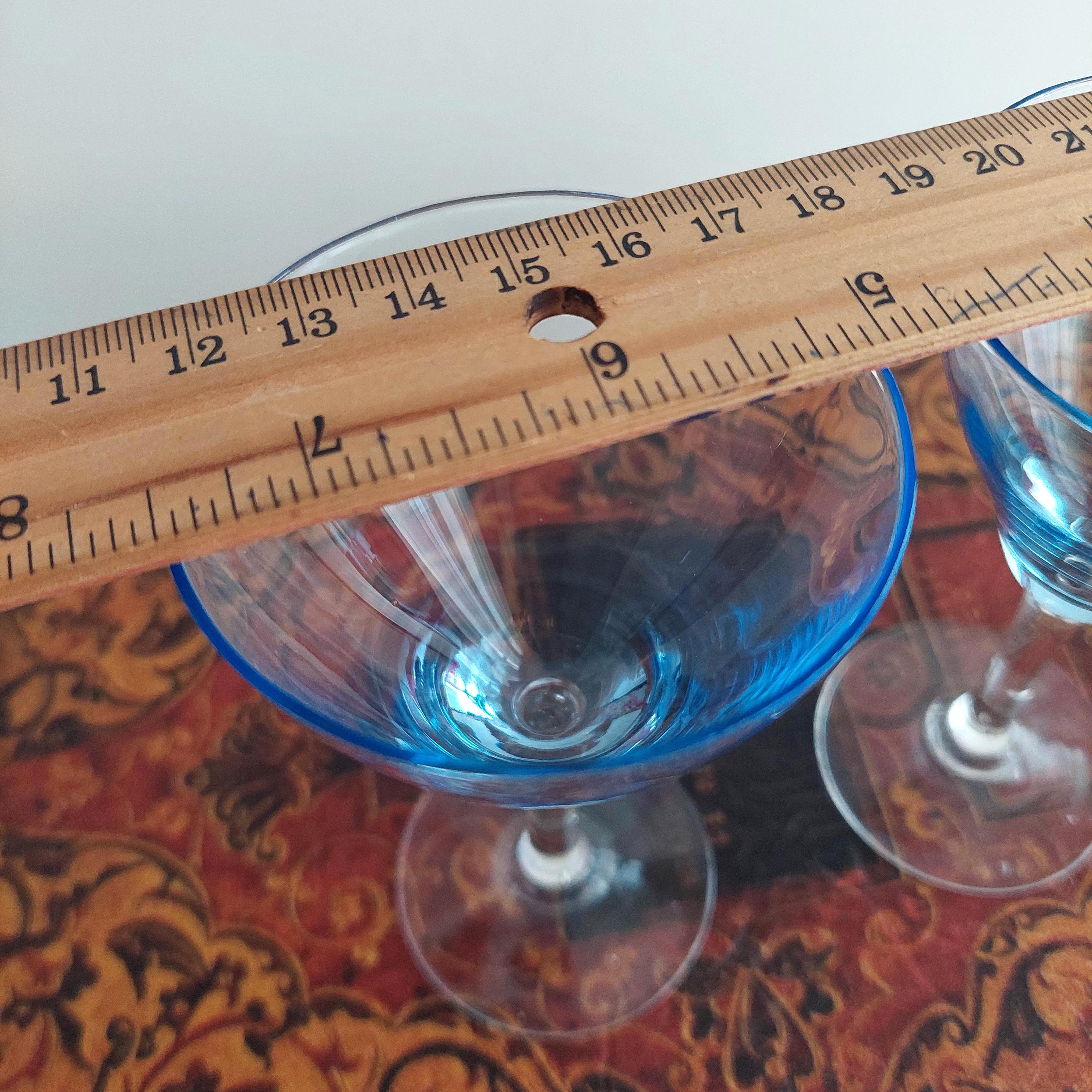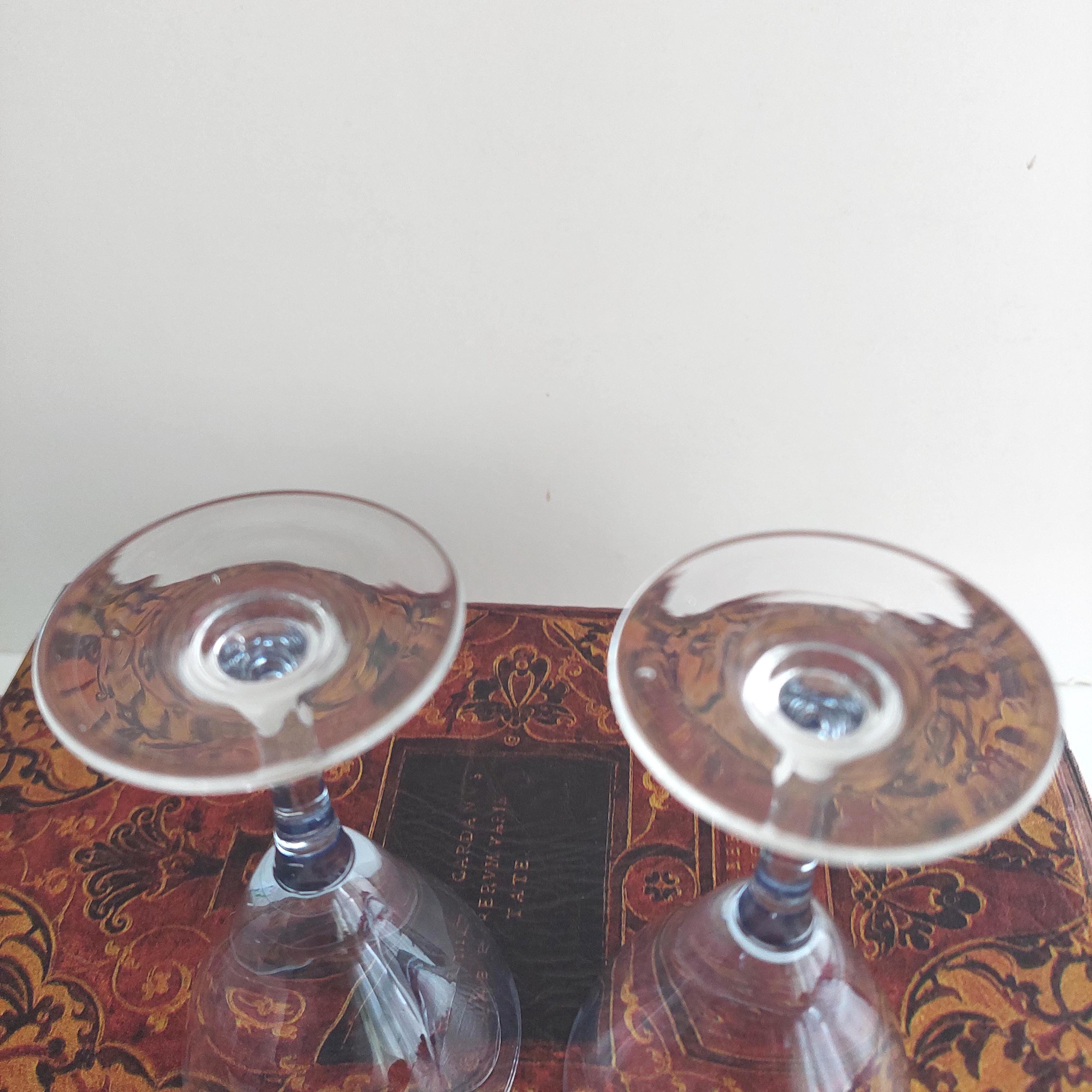Vintage hand blown cordial glasses featuring blue optic bowl and clear stems.