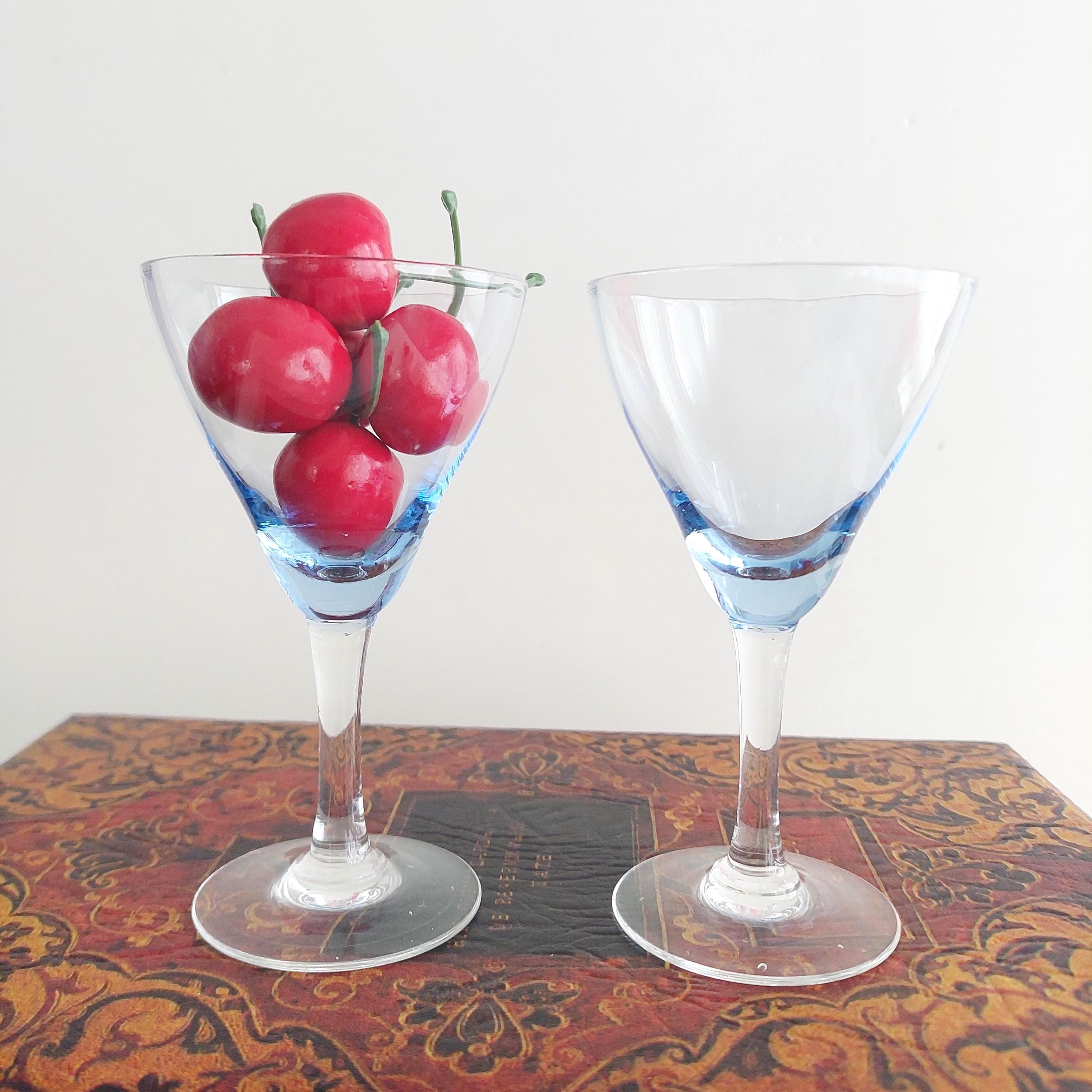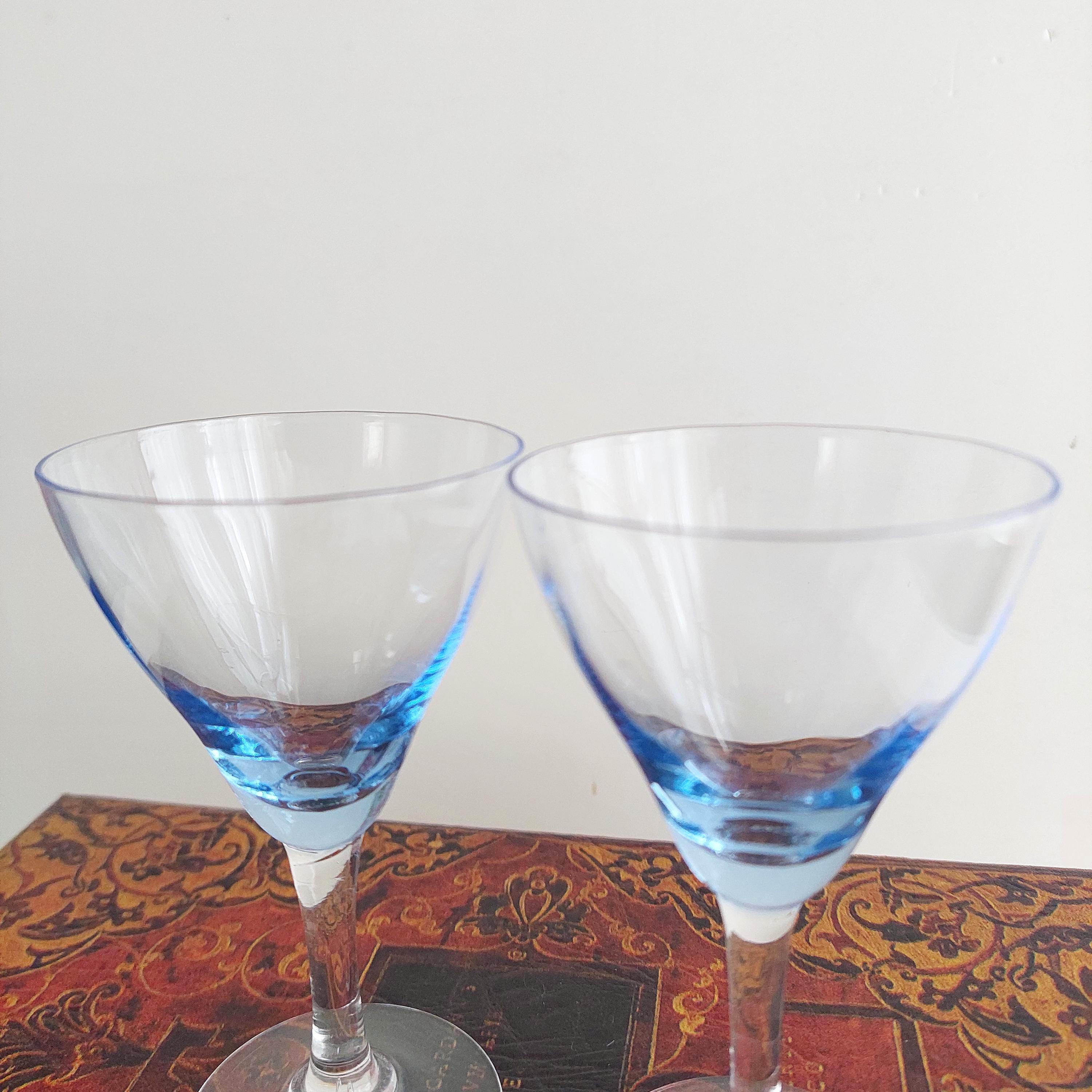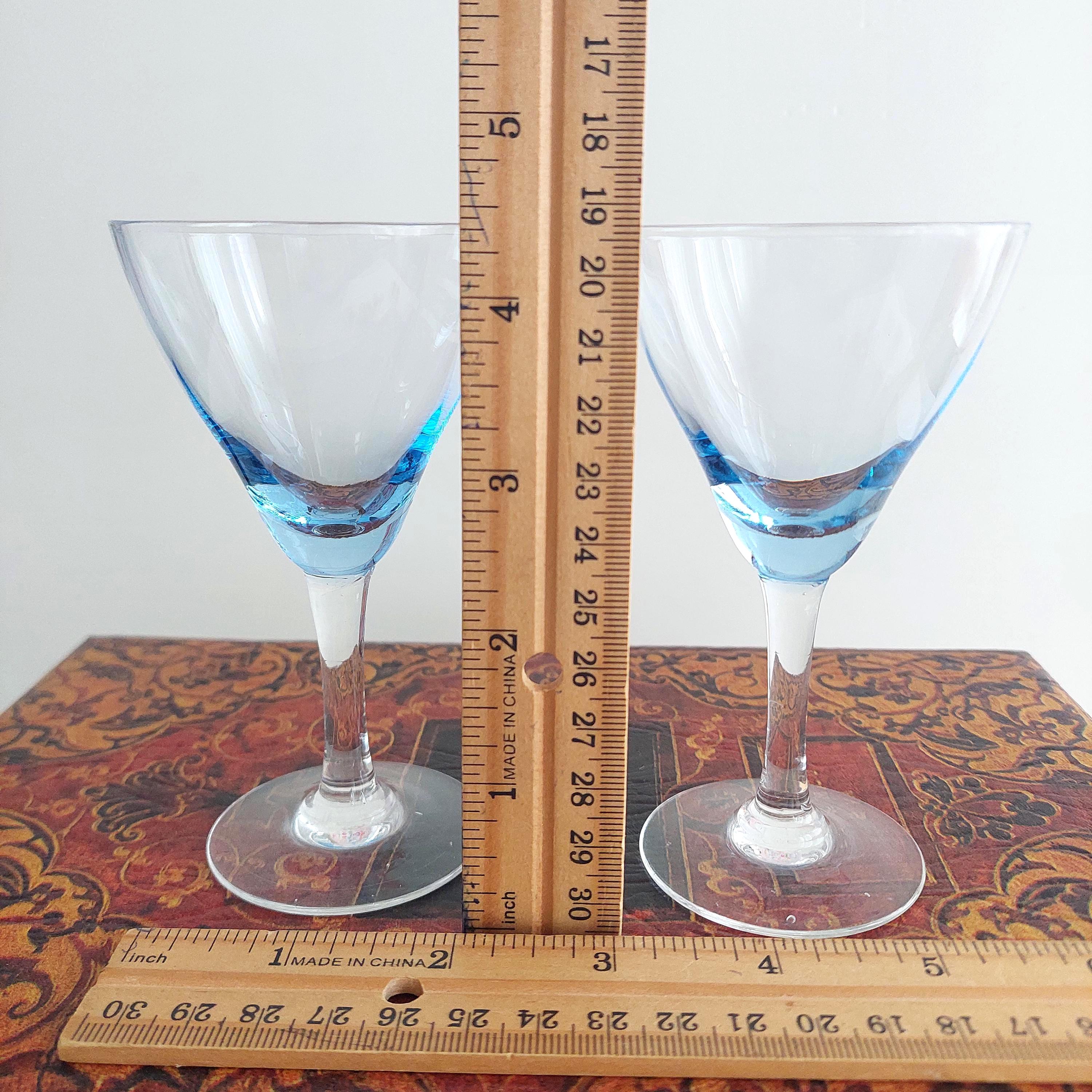 Vintage hand blown cordial glasses featuring blue optic bowl and clear stems.