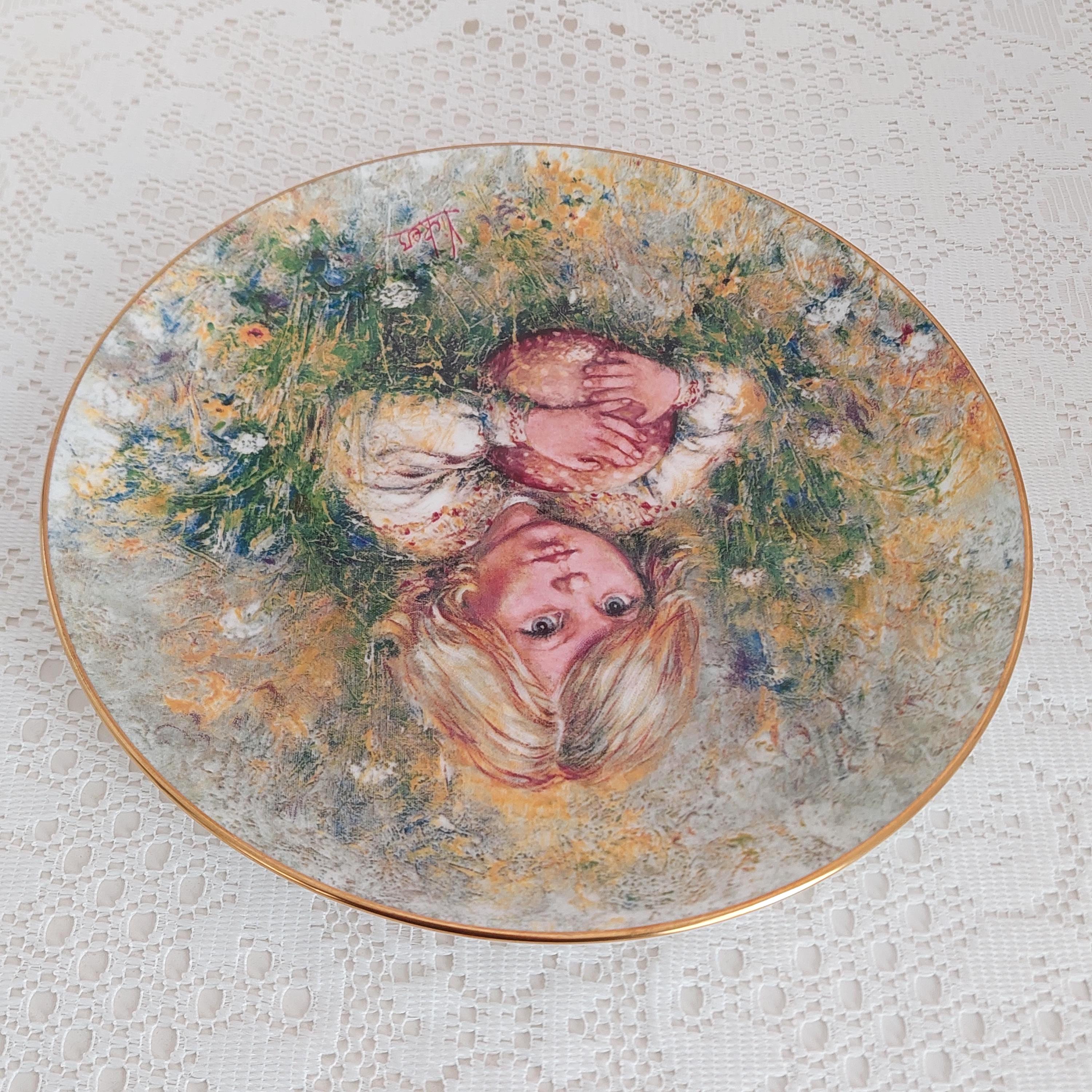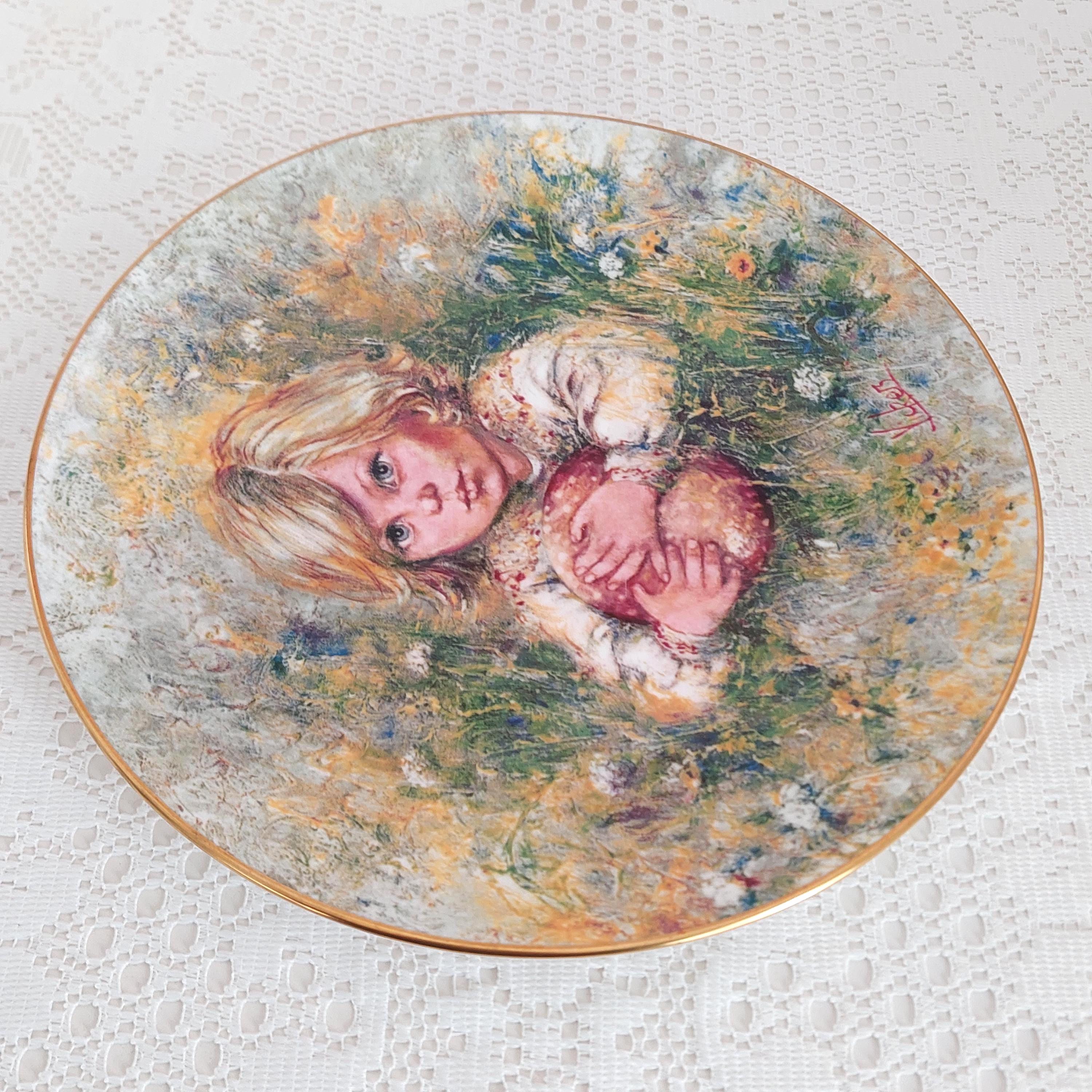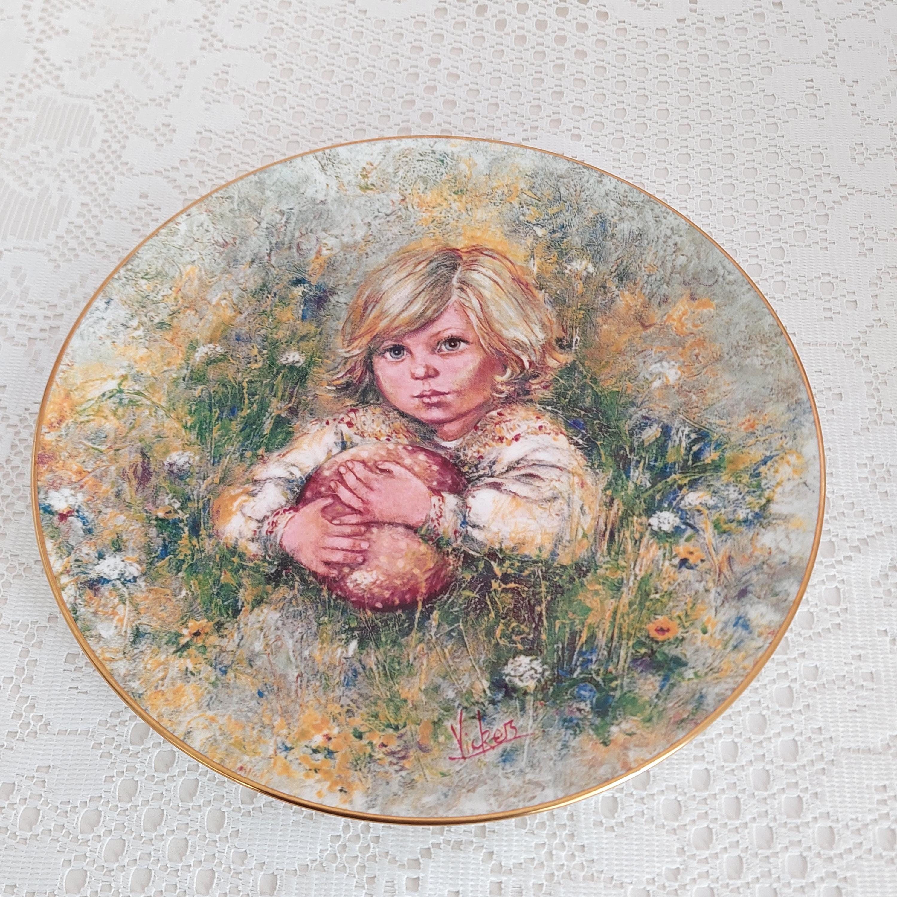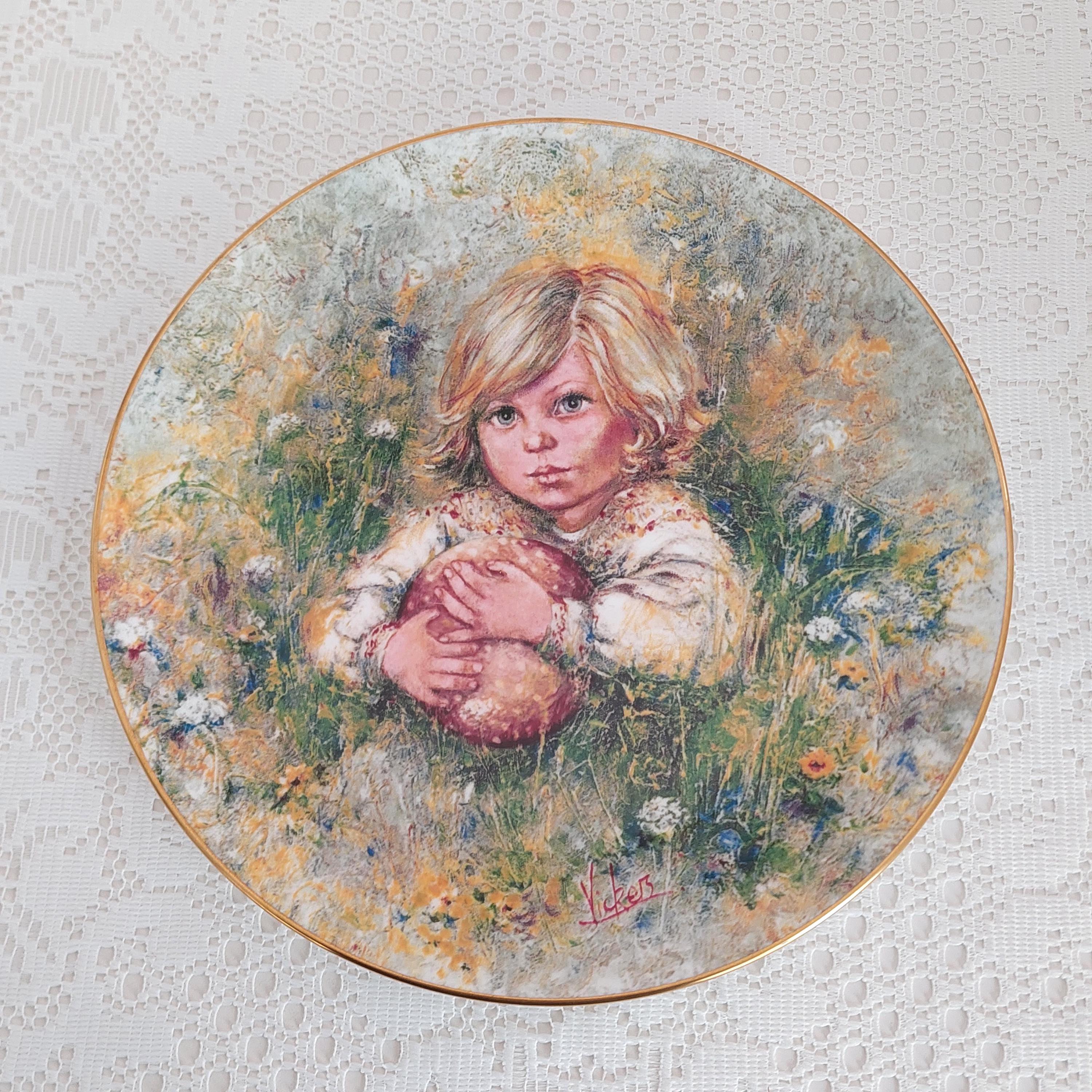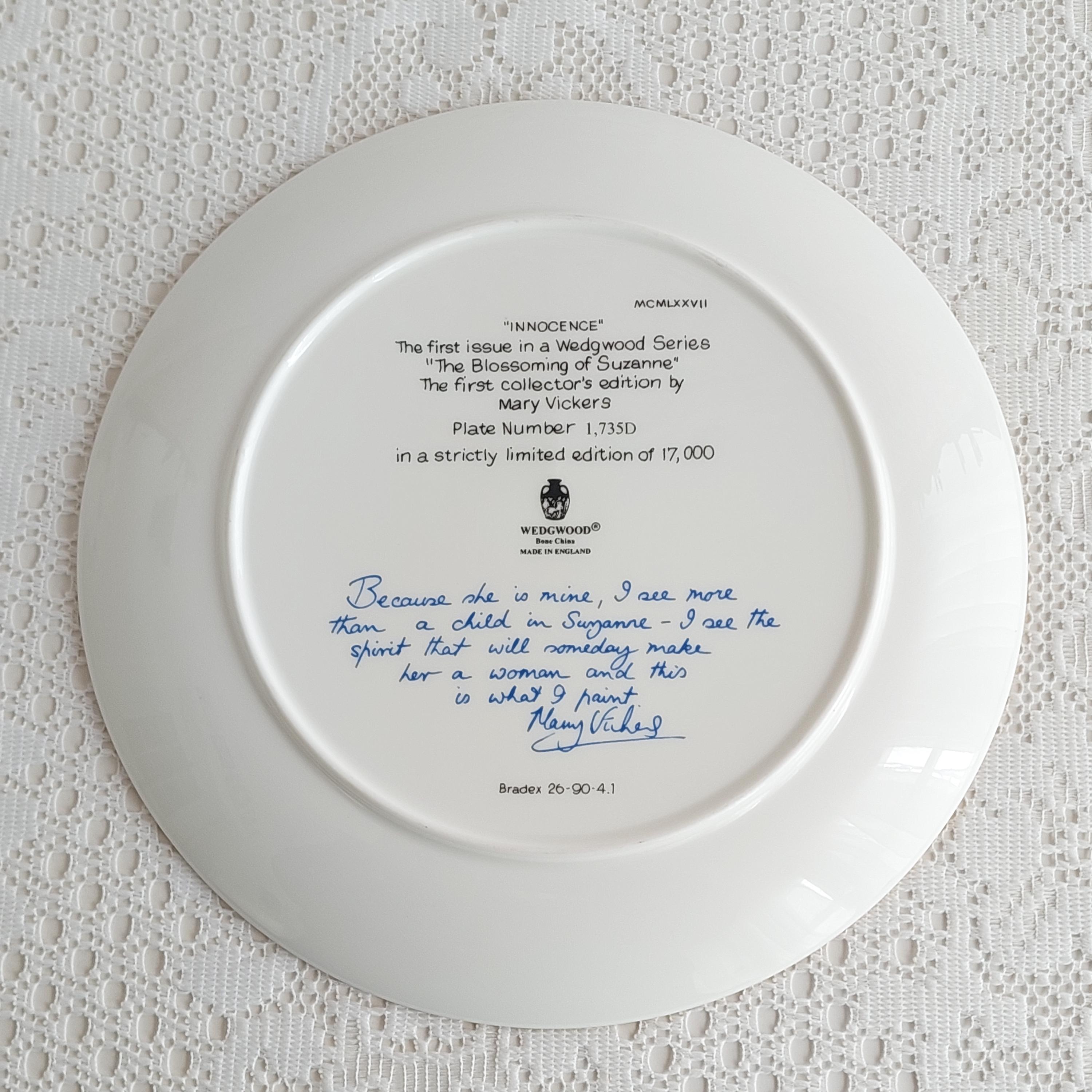 Backstamp: "Innocence - The First issue in a Wedgwood Series ' The Blossoming of Suzanne' The First collector's Edition by Mark Vickers - Plate Number 1.735D in a Strictly Limited Edition of 17,000 - Wedgwood Bone China England - Bradex 26-90-4.1"