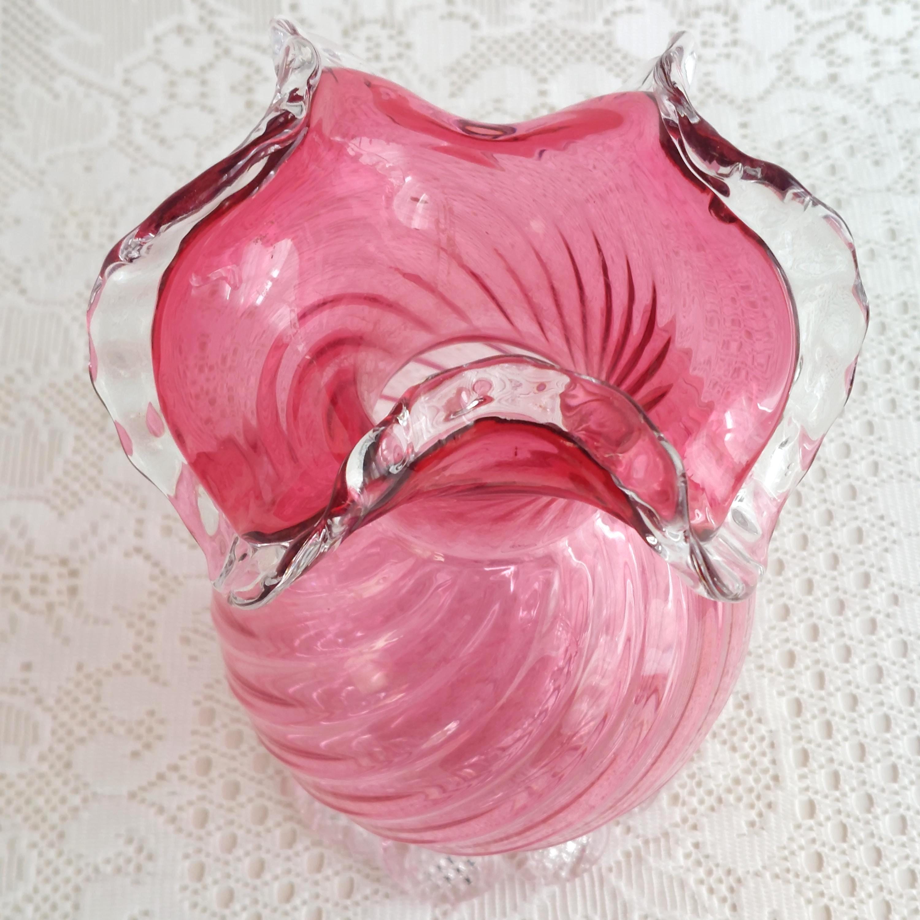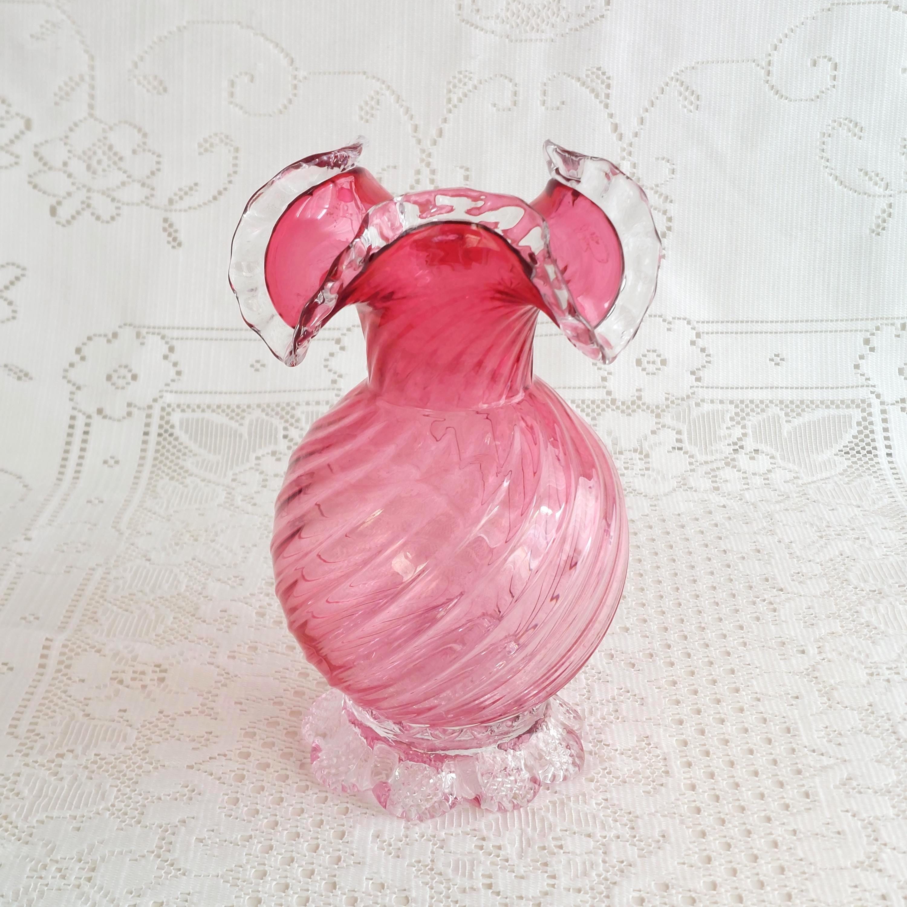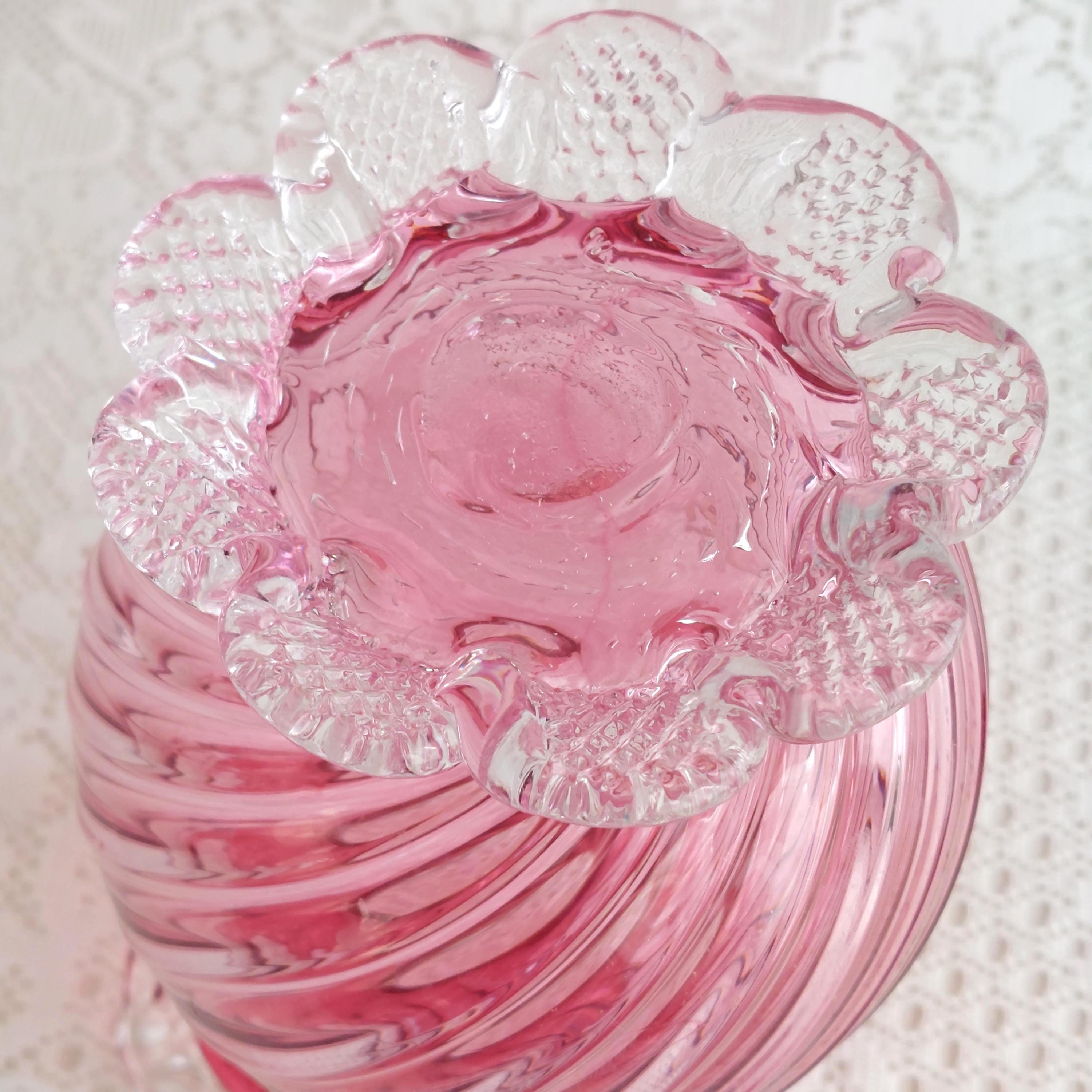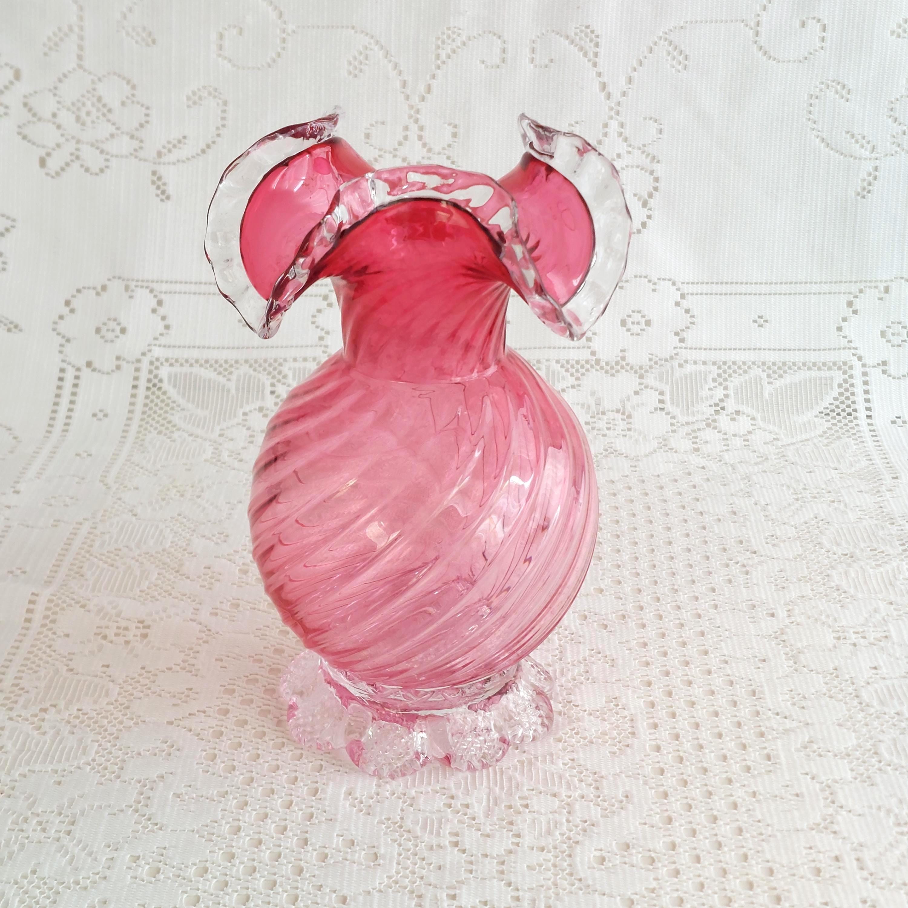 Vintage pink cranberry blown glass flower vase. Pink swirled glass with a clear pedestal base similar to flower petals. Clear ruffled / crimped rim.