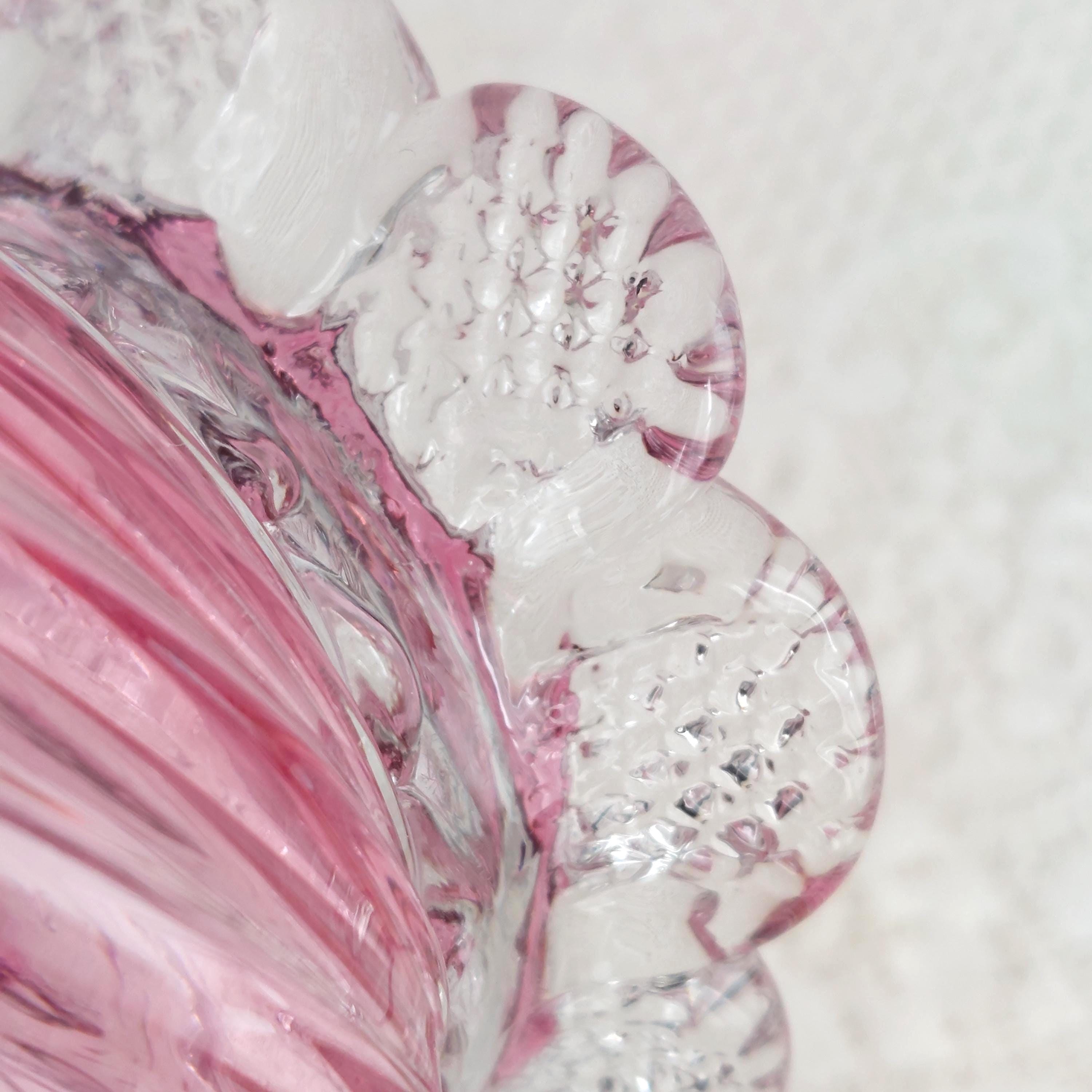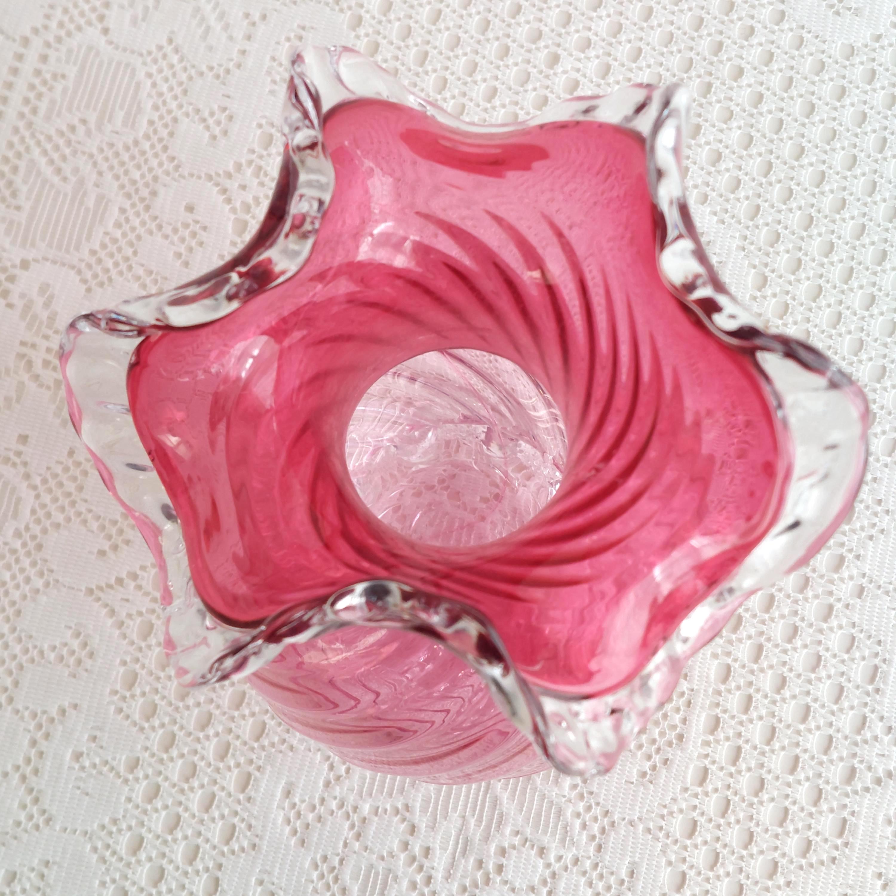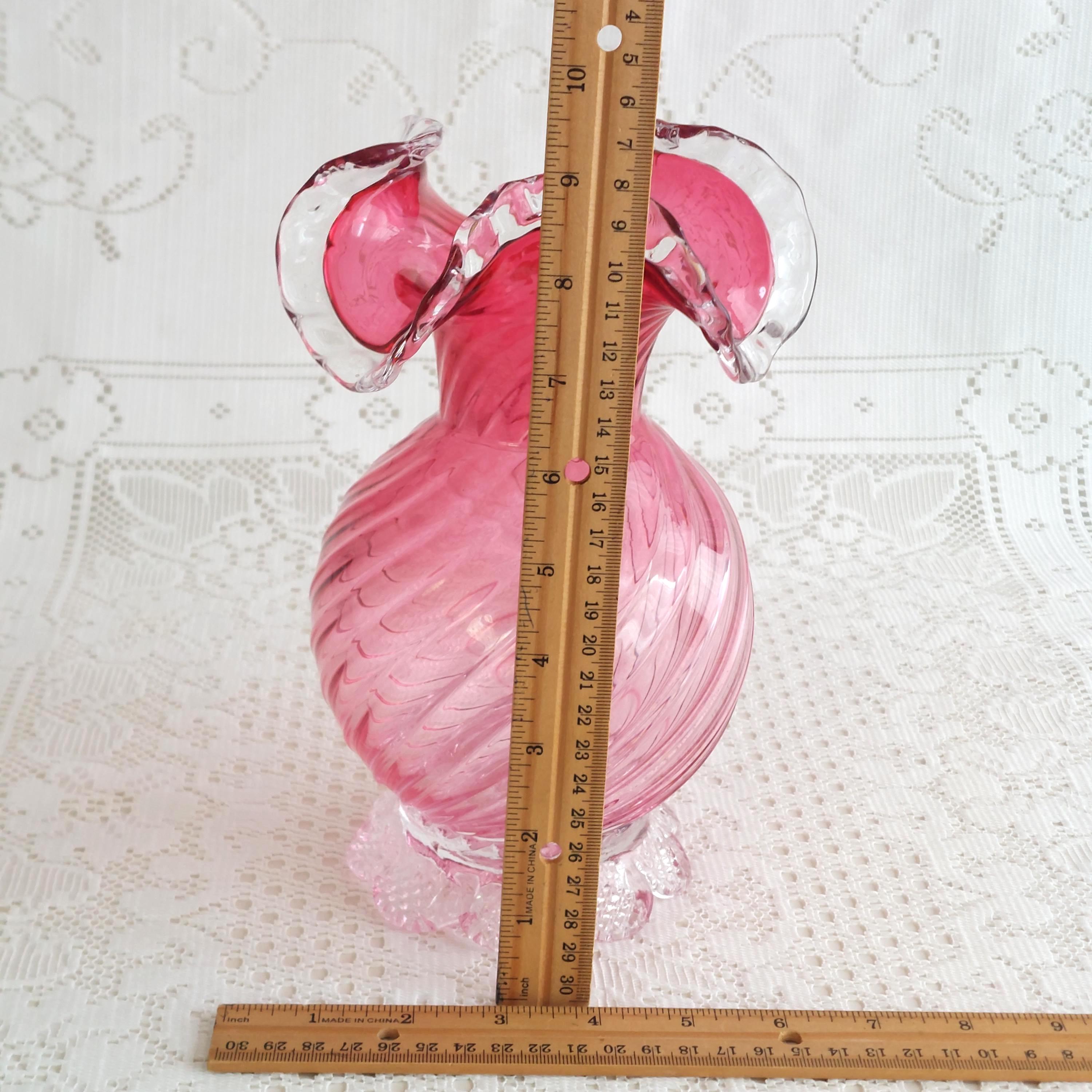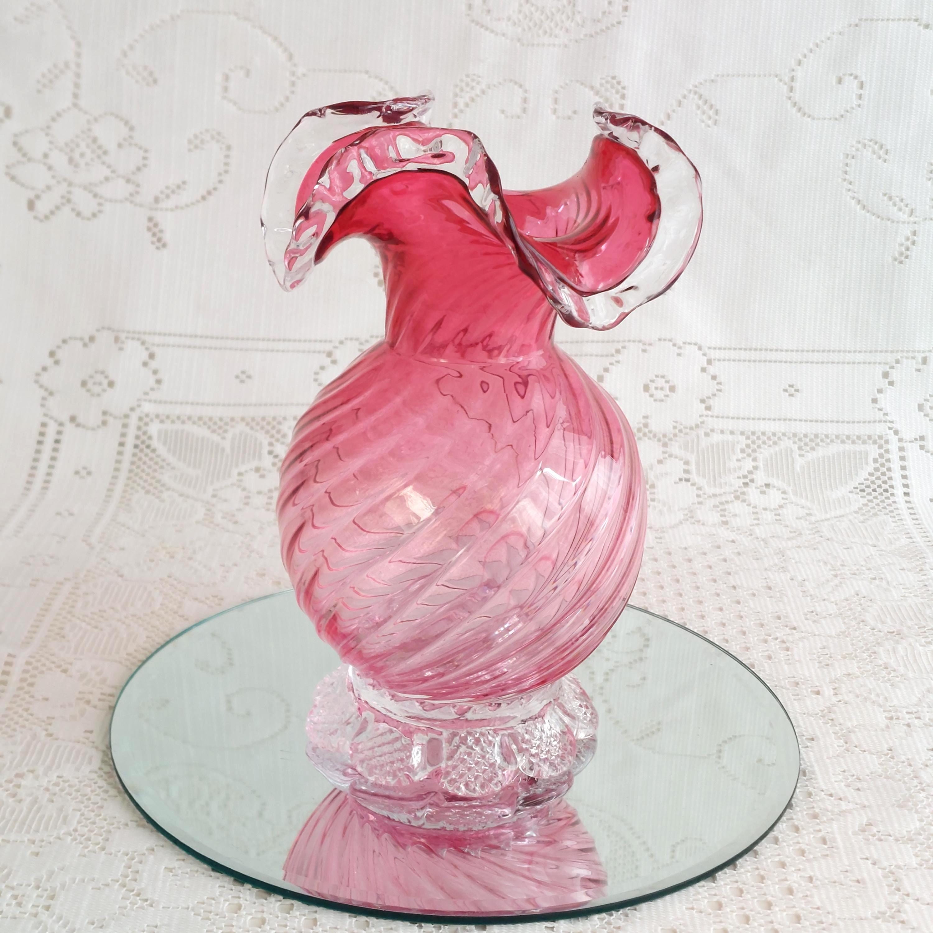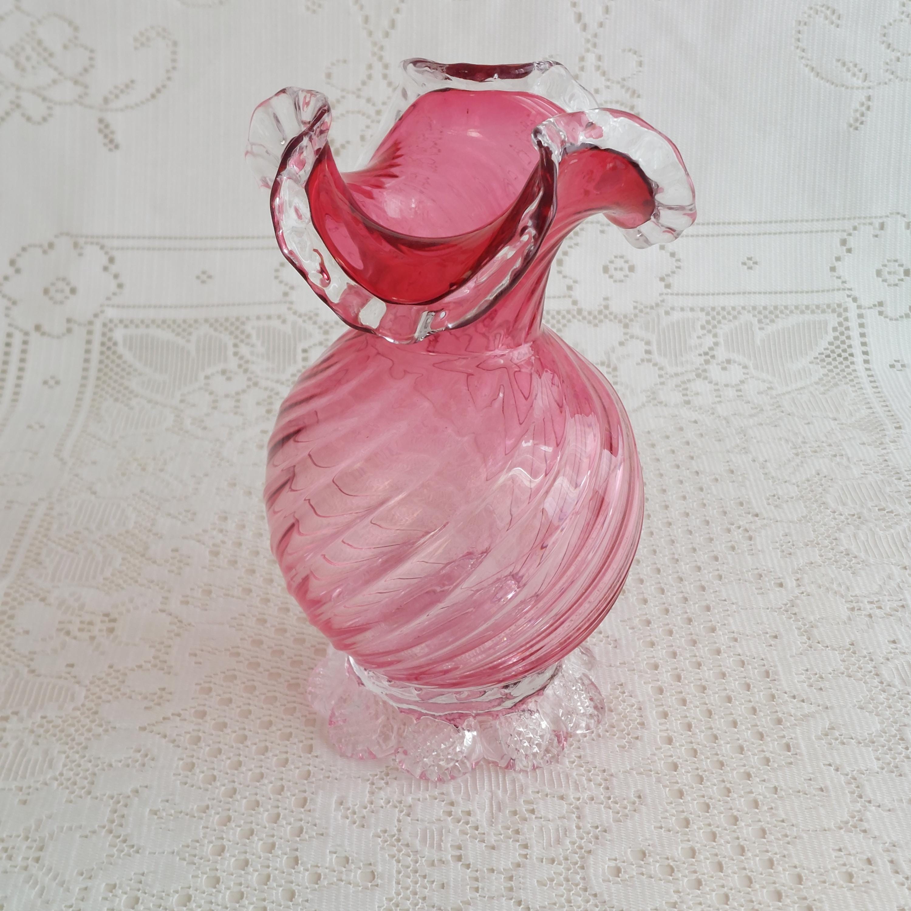Vintage pink cranberry blown glass flower vase. Pink swirled glass with a clear pedestal base similar to flower petals. Clear ruffled / crimped rim.