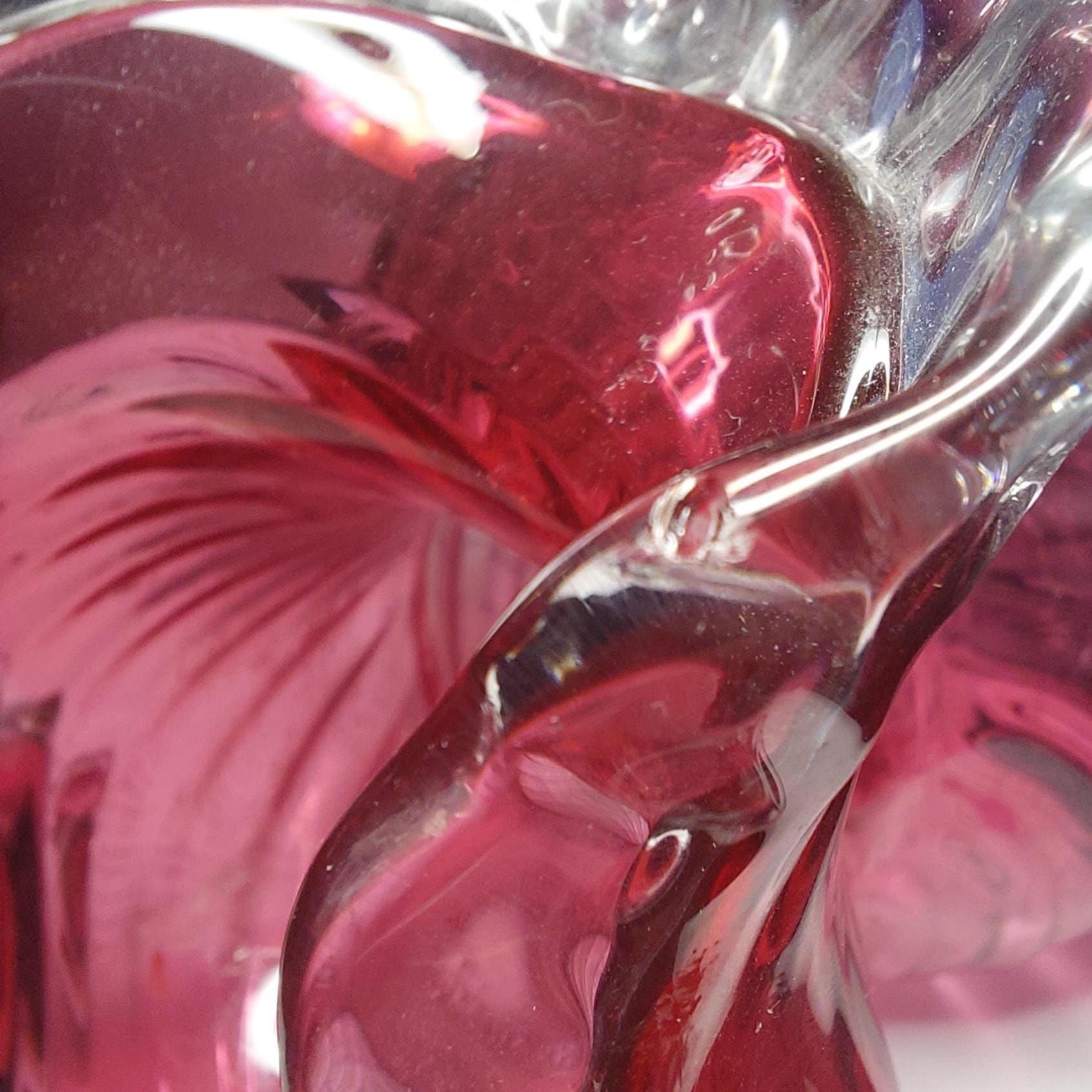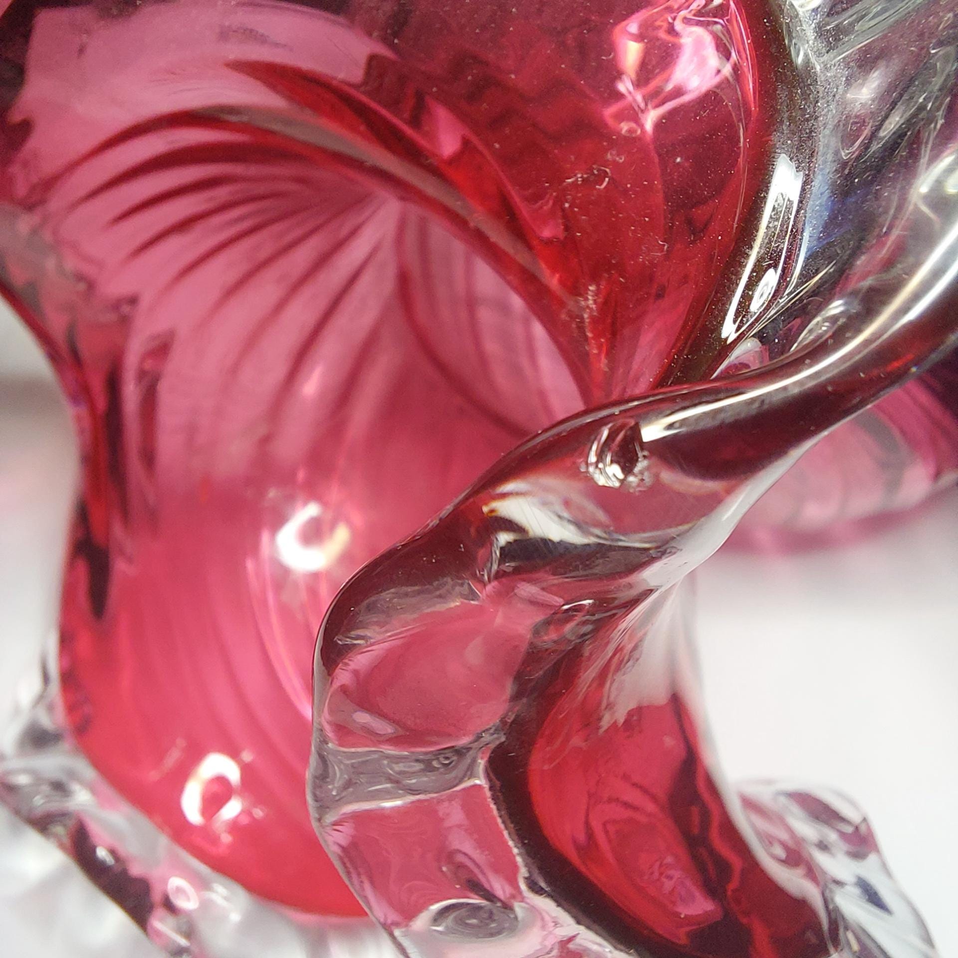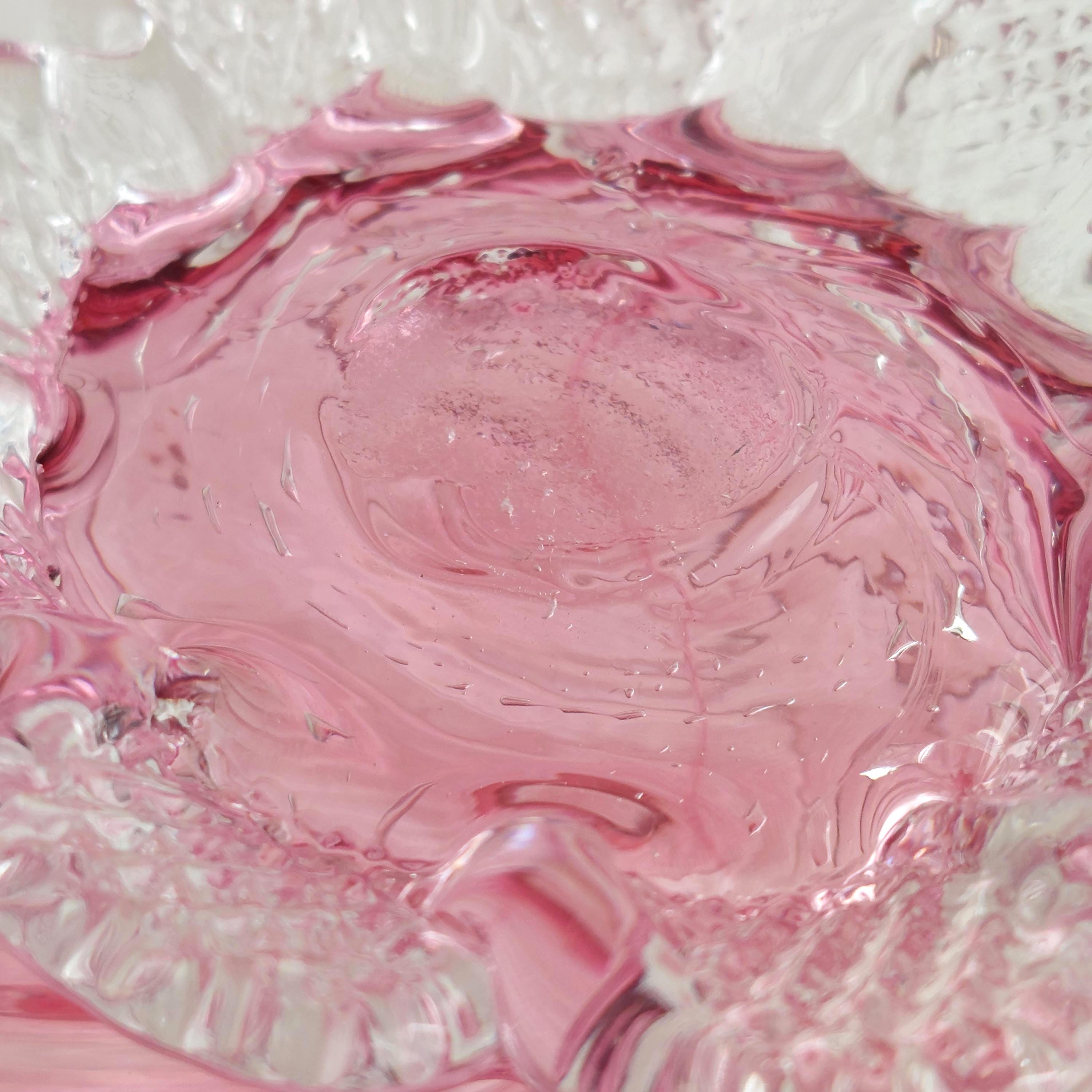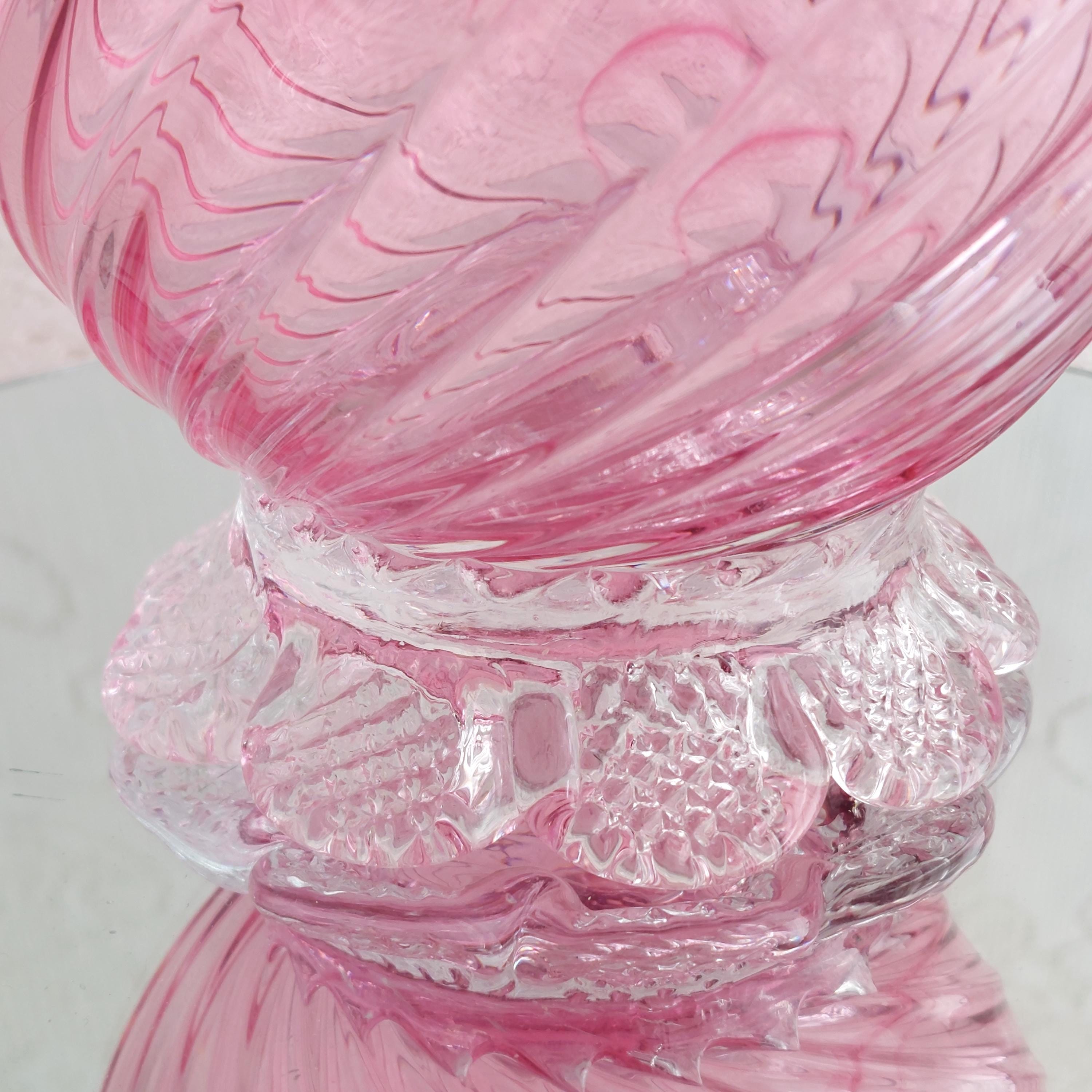 Vintage pink cranberry blown glass flower vase. Pink swirled glass with a clear pedestal base similar to flower petals. Clear ruffled / crimped rim.