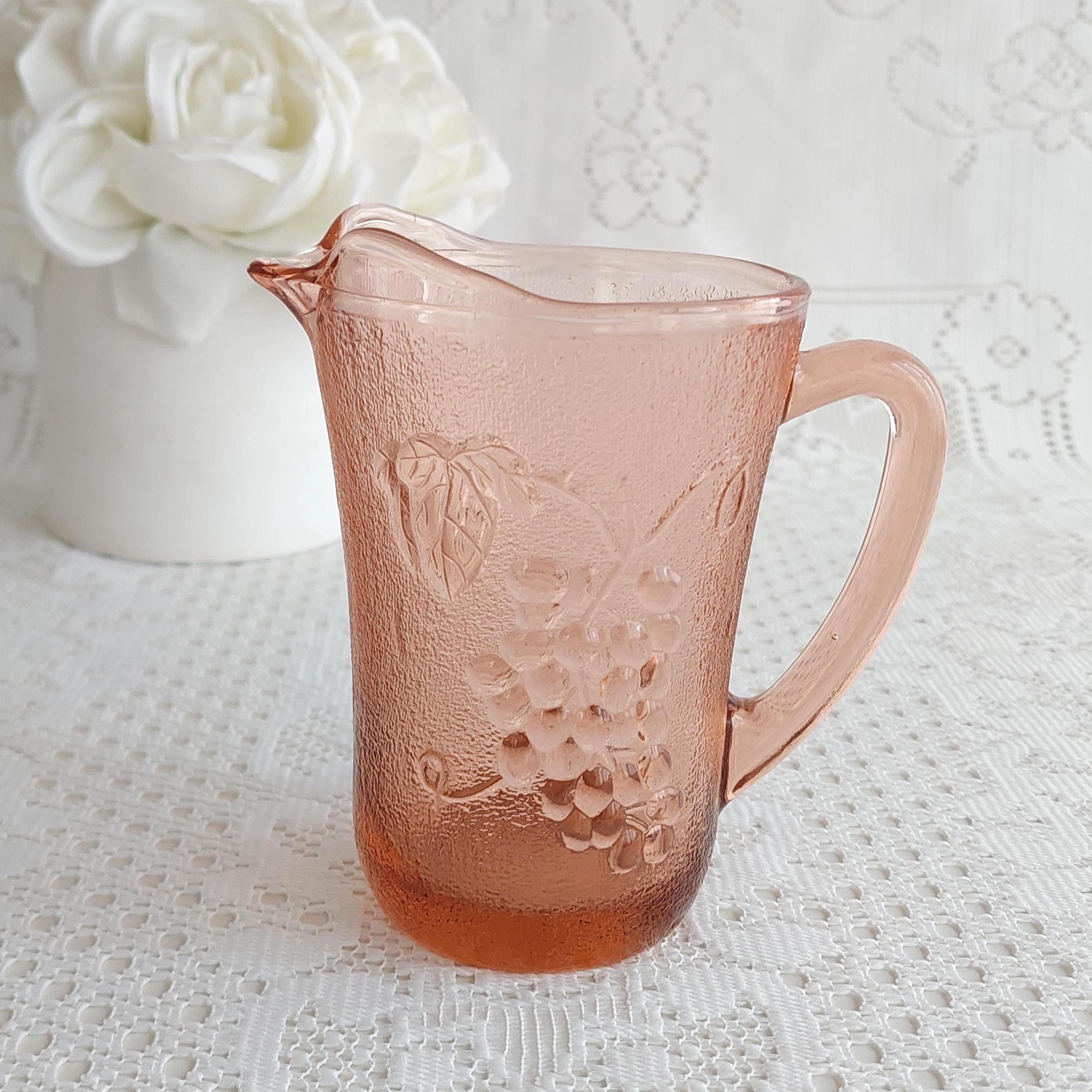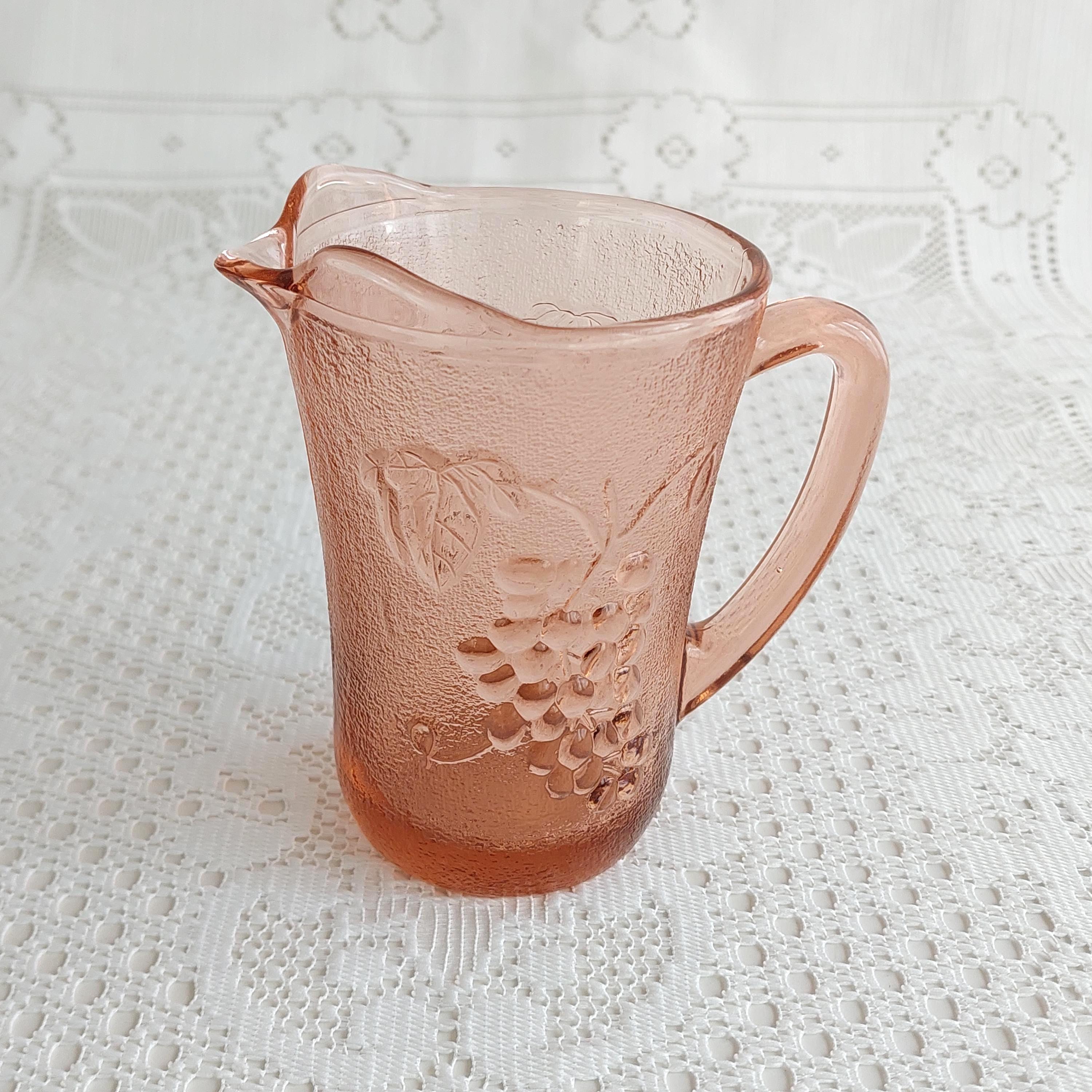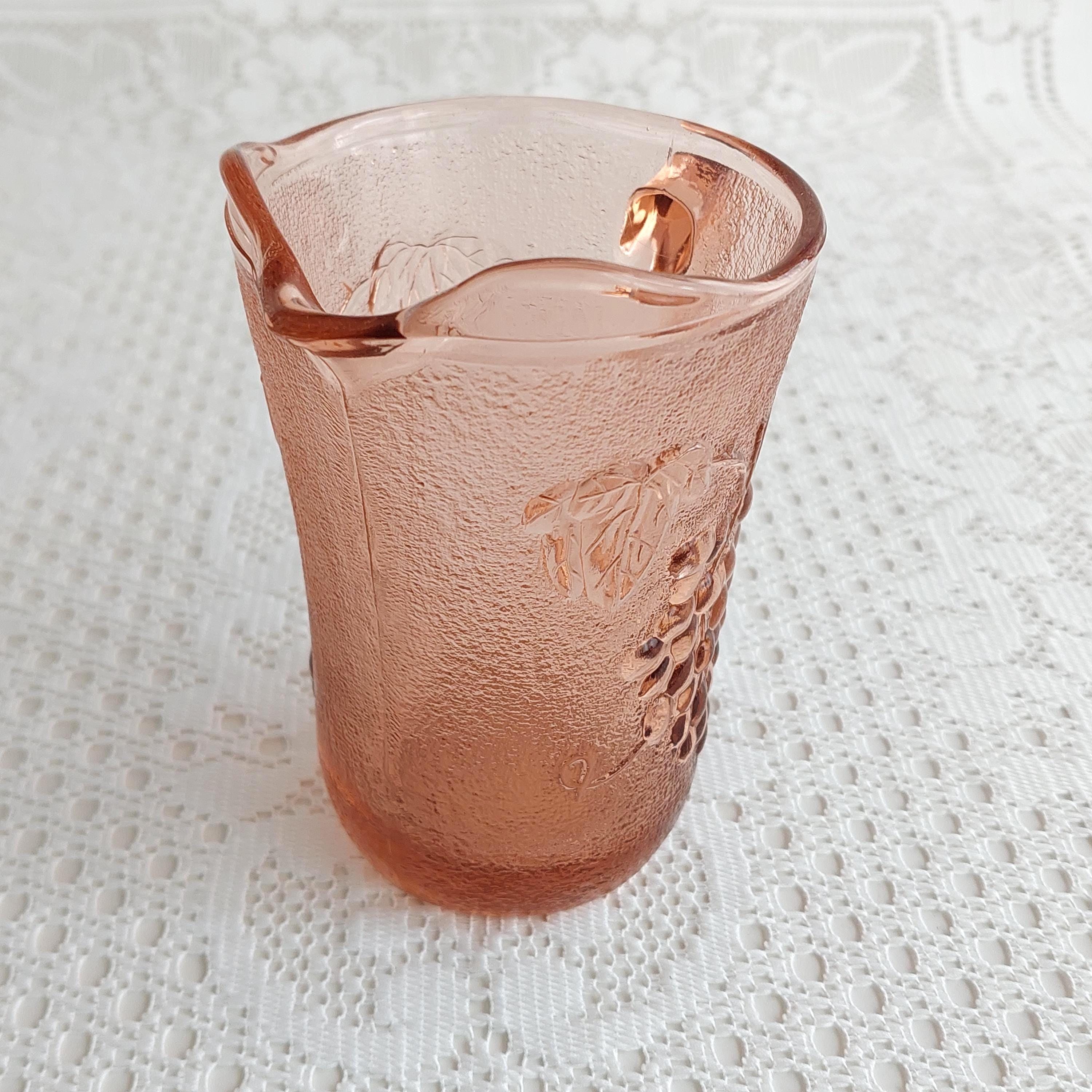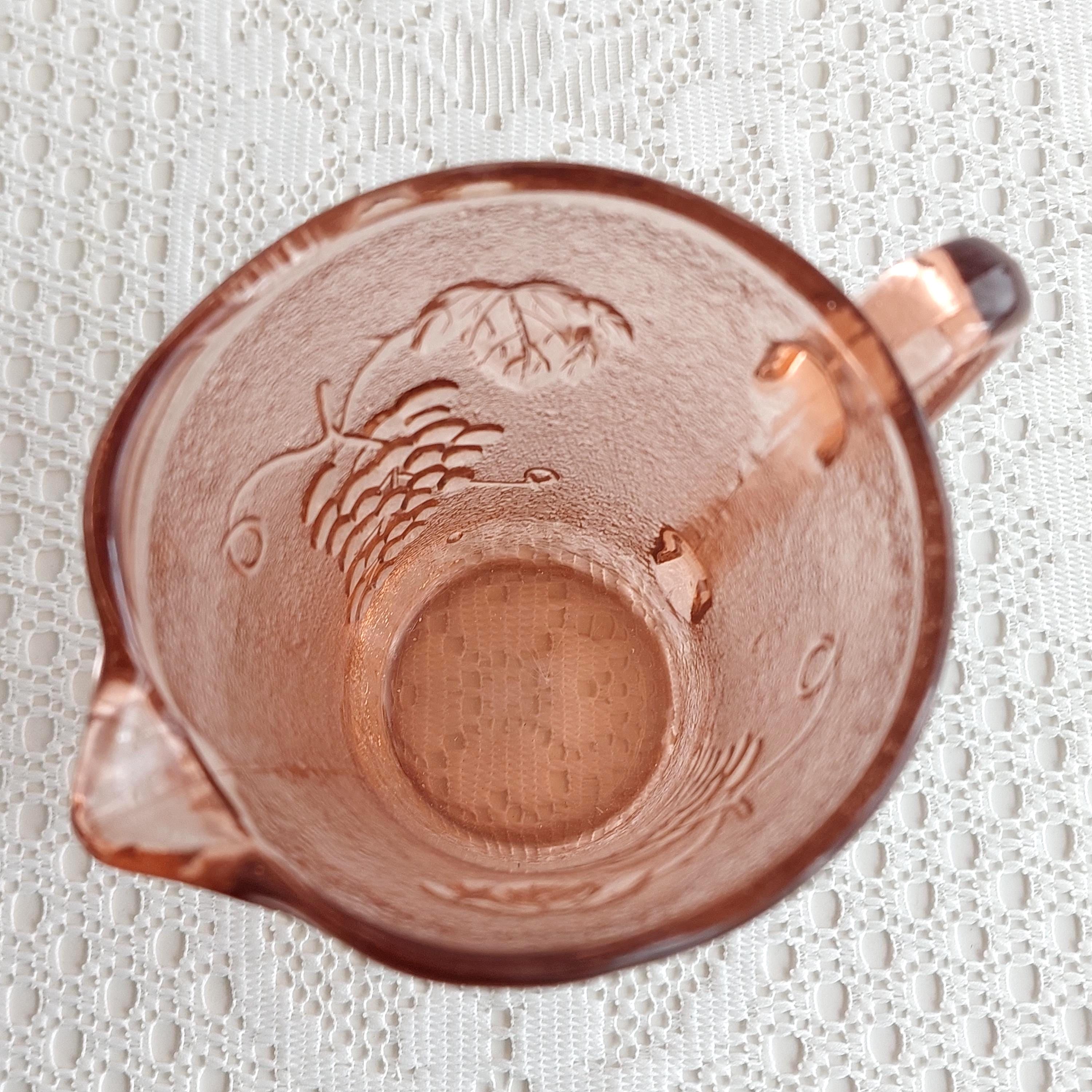 Vintage KIG Indonesia pink glass creamer or small milk jug. It features an embossed grapevine and fruit pattern on a textured or pebbled glass.