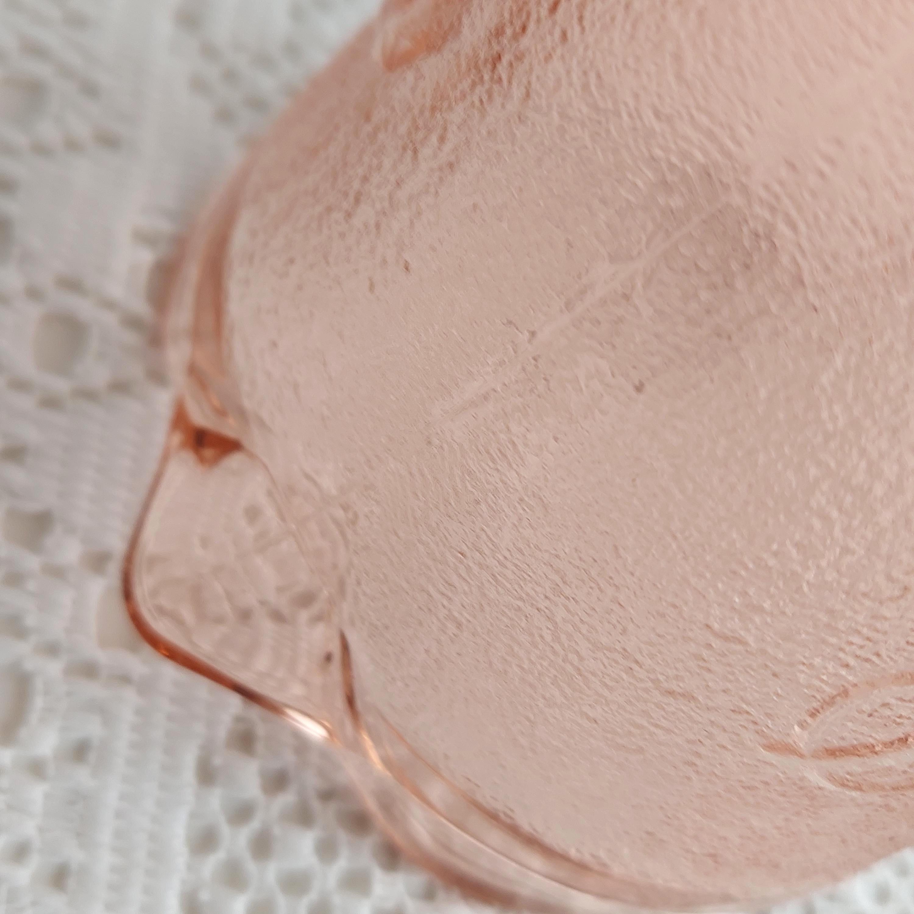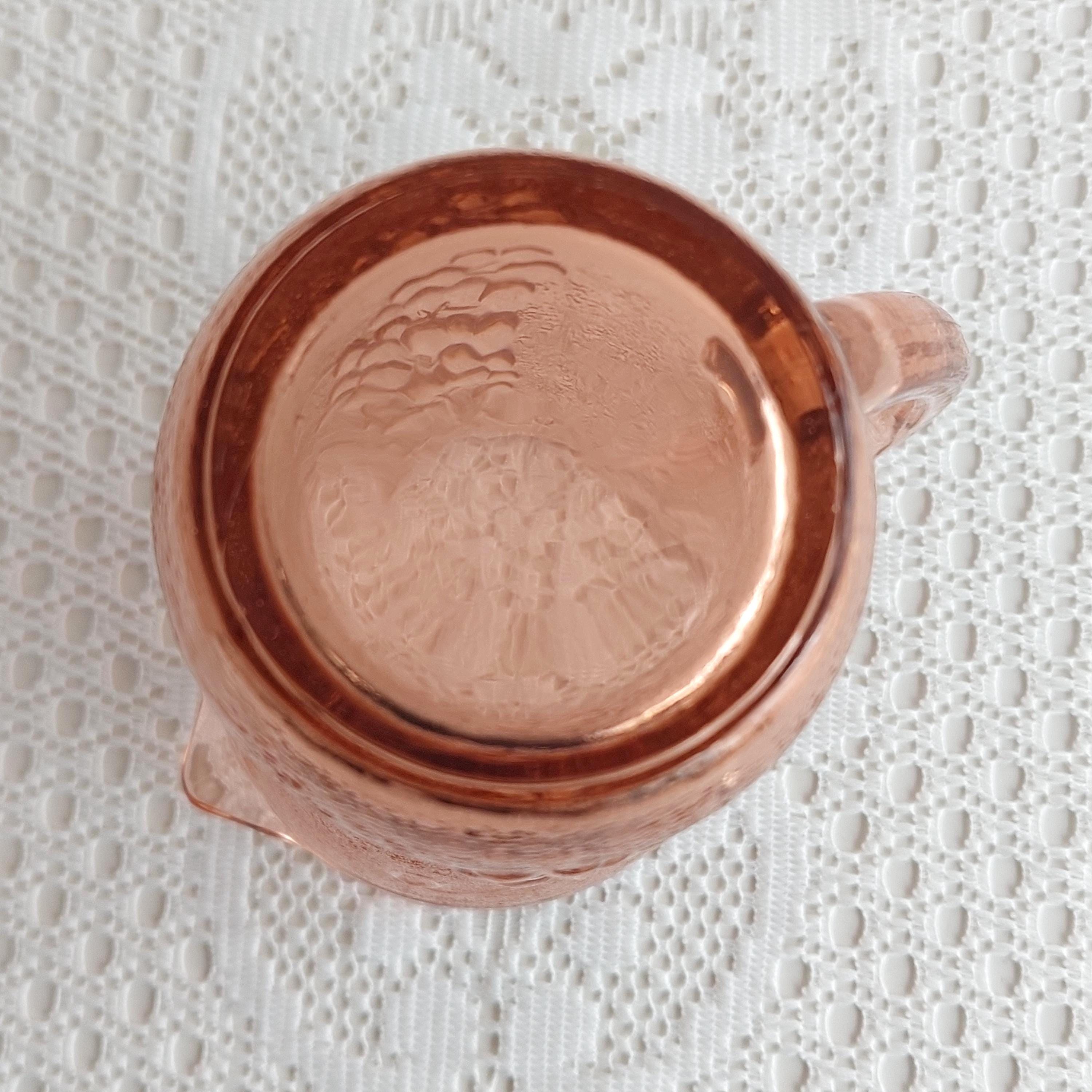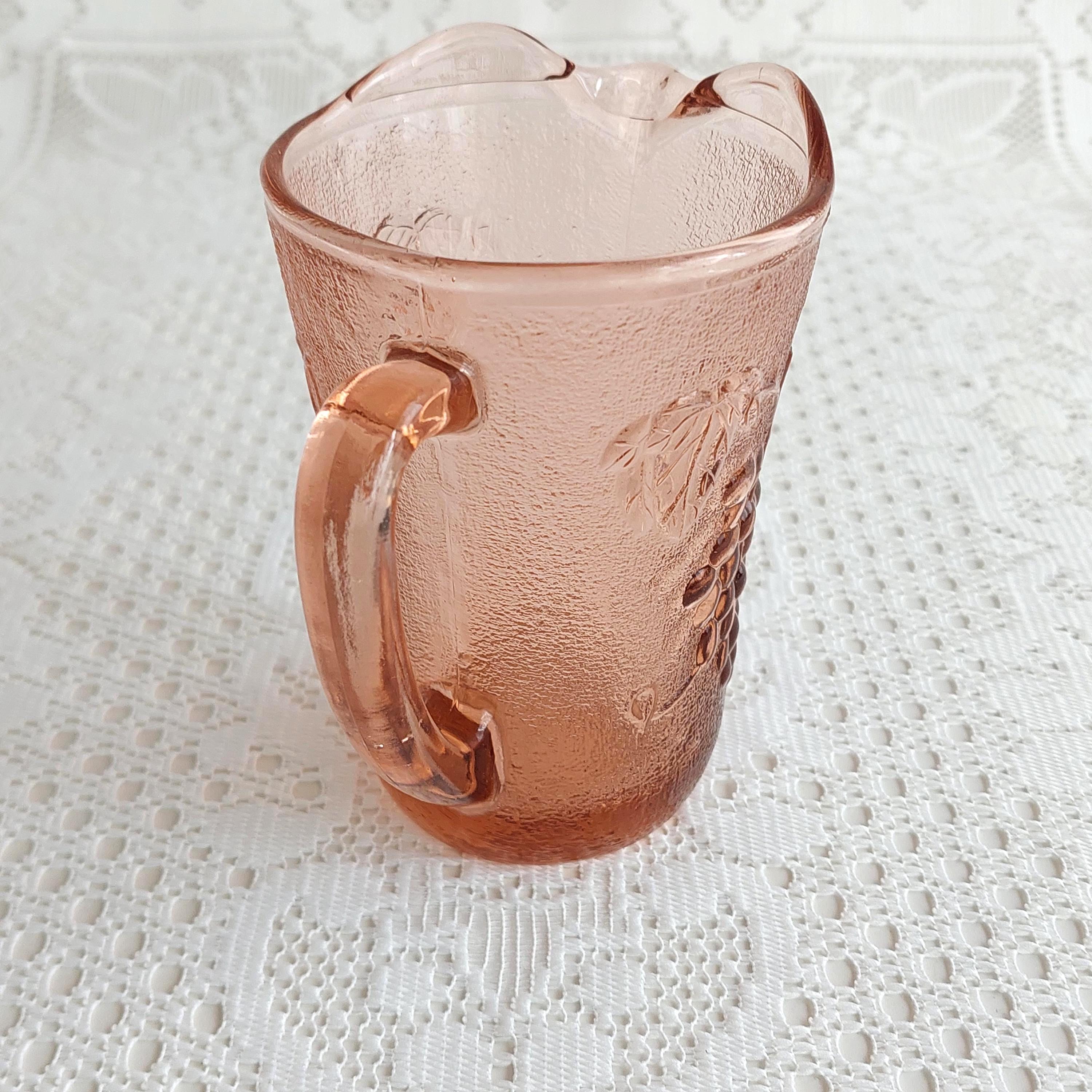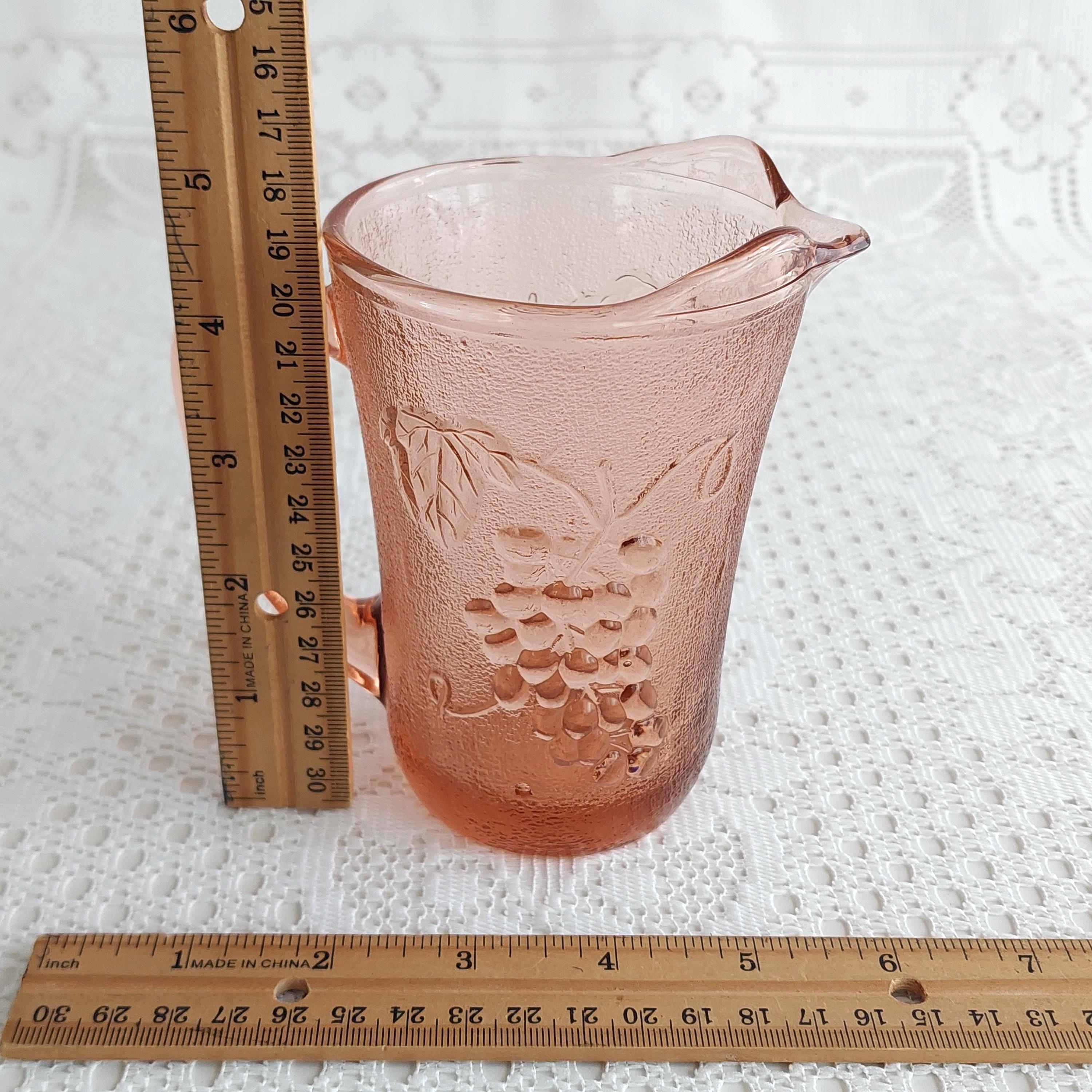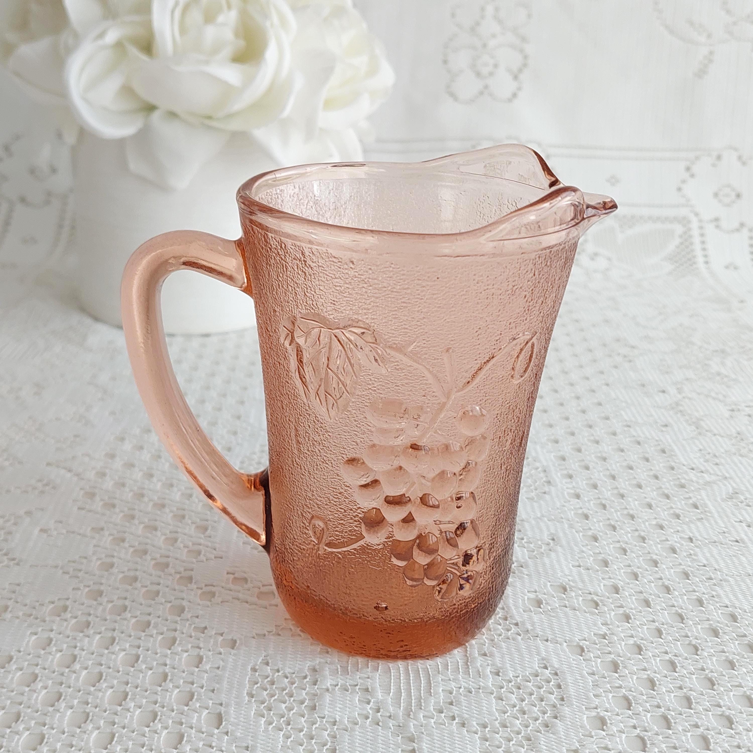 Vintage KIG Indonesia pink glass creamer or small milk jug. It features an embossed grapevine and fruit pattern on a textured or pebbled glass.
