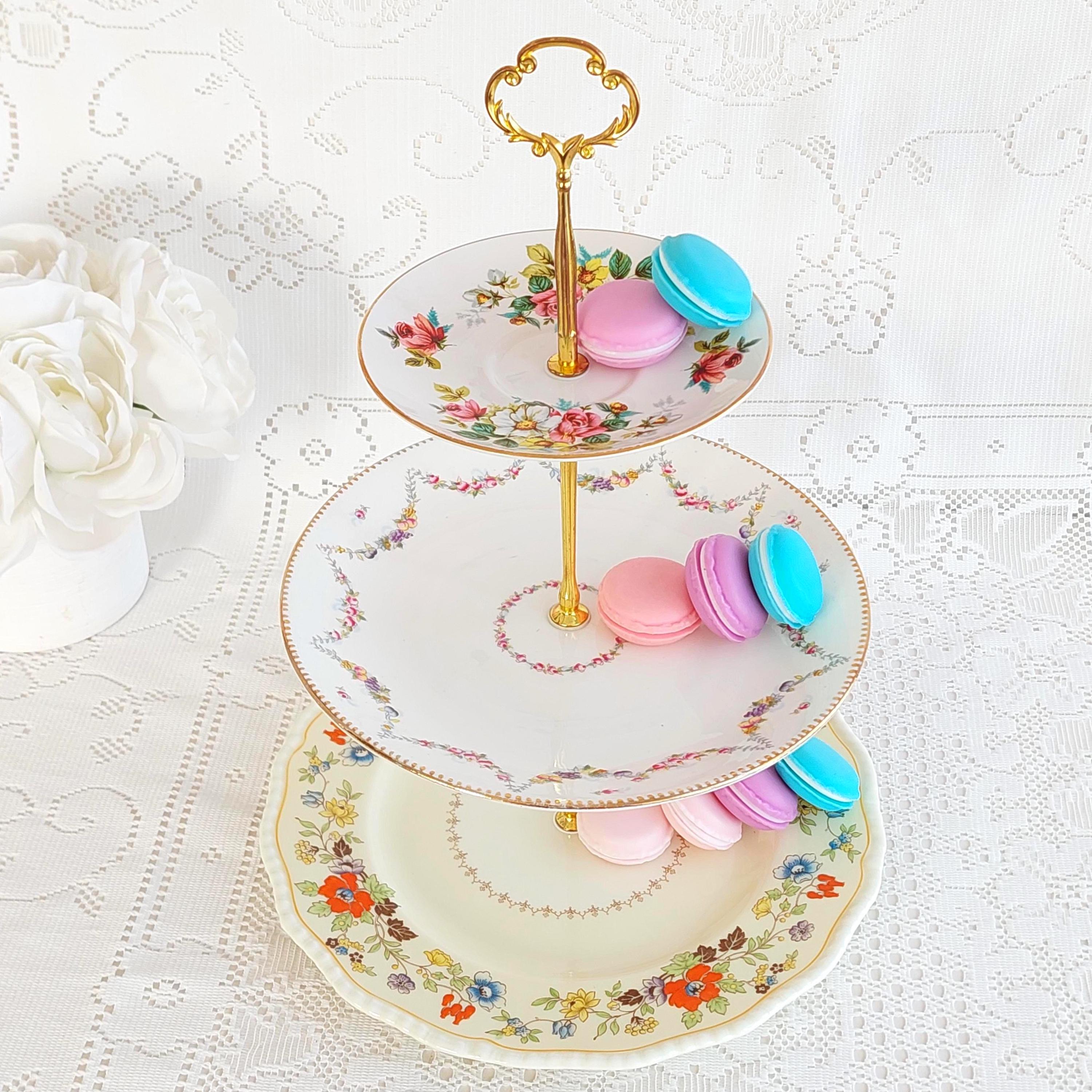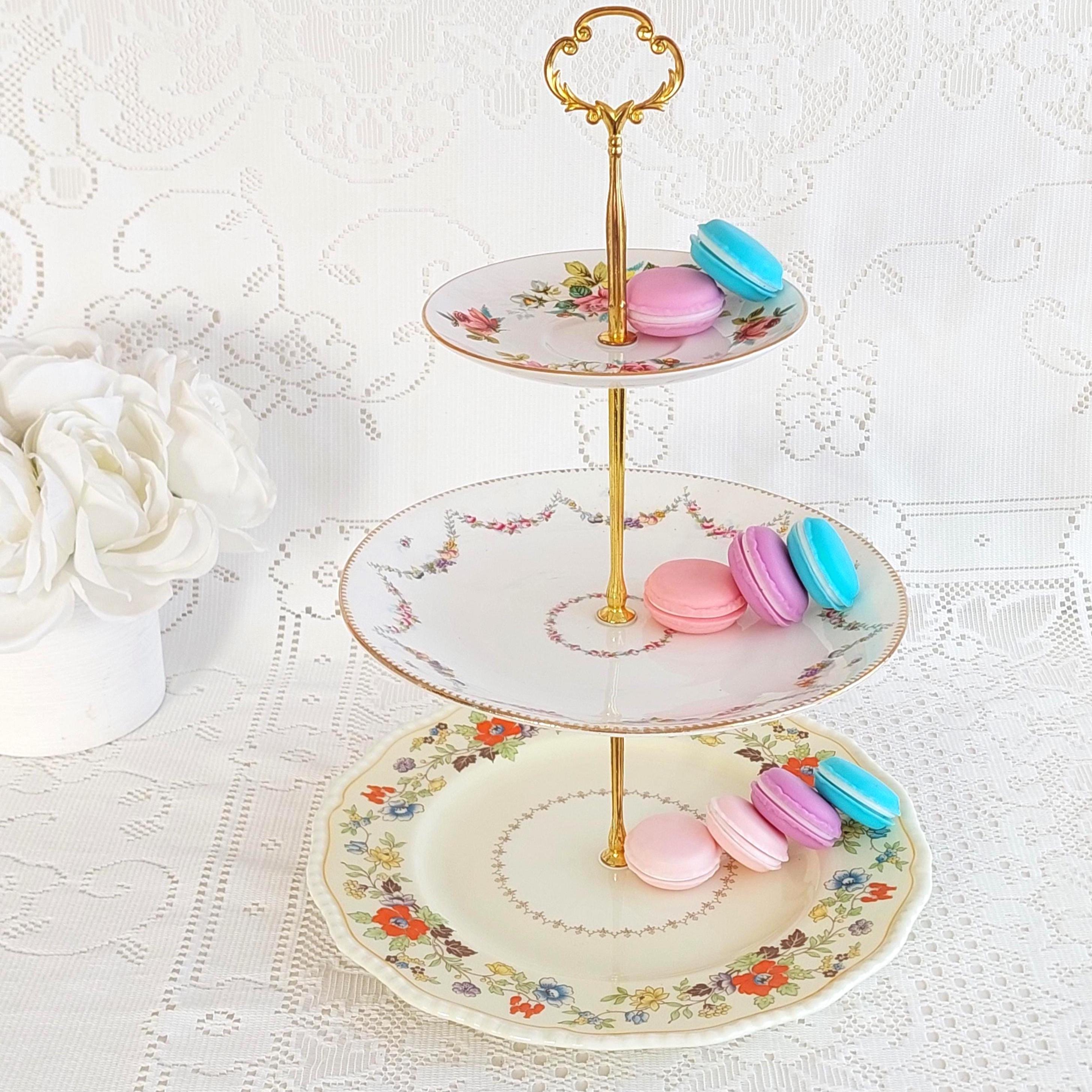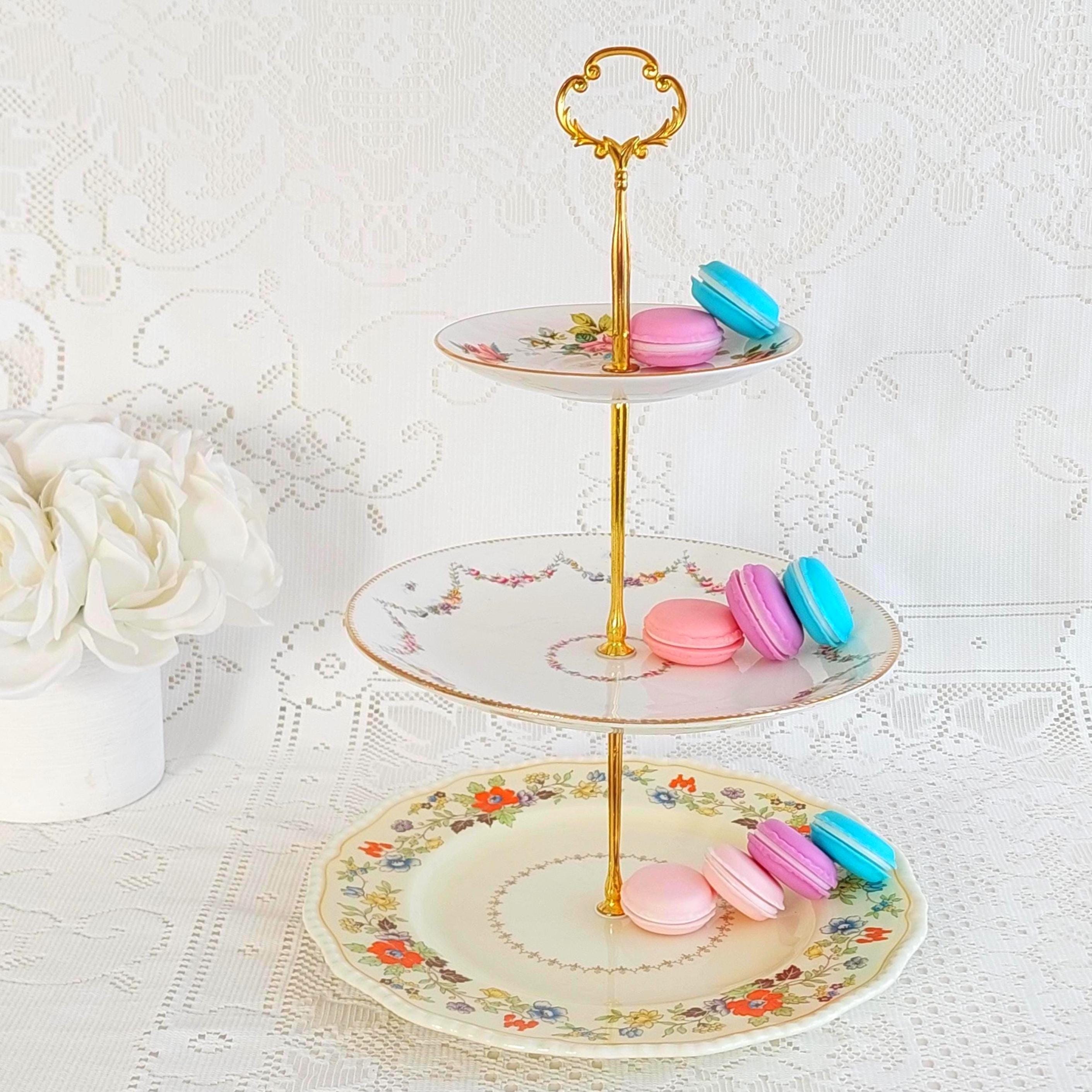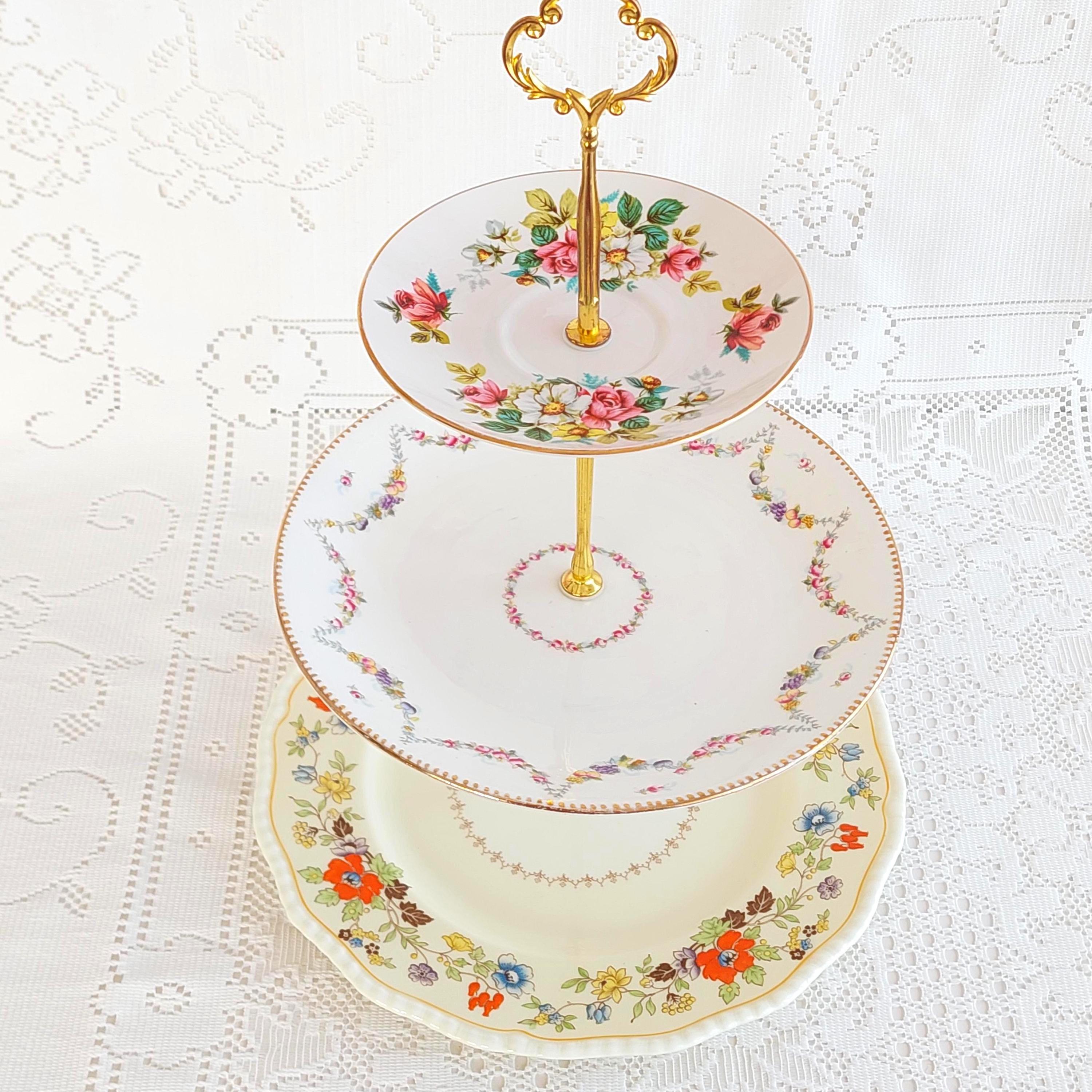 Each stand features genuine bone china plates made in England by renowned brands—Royal Grafton saucer (5.75" top), Antique (9" middle), and Royal Doulton (10.25" bottom)—selected for their charm and history. Sturdy new hardware in your choice of black, white, silver, or gold tone makes this serving piece both functional and customizable to your style.