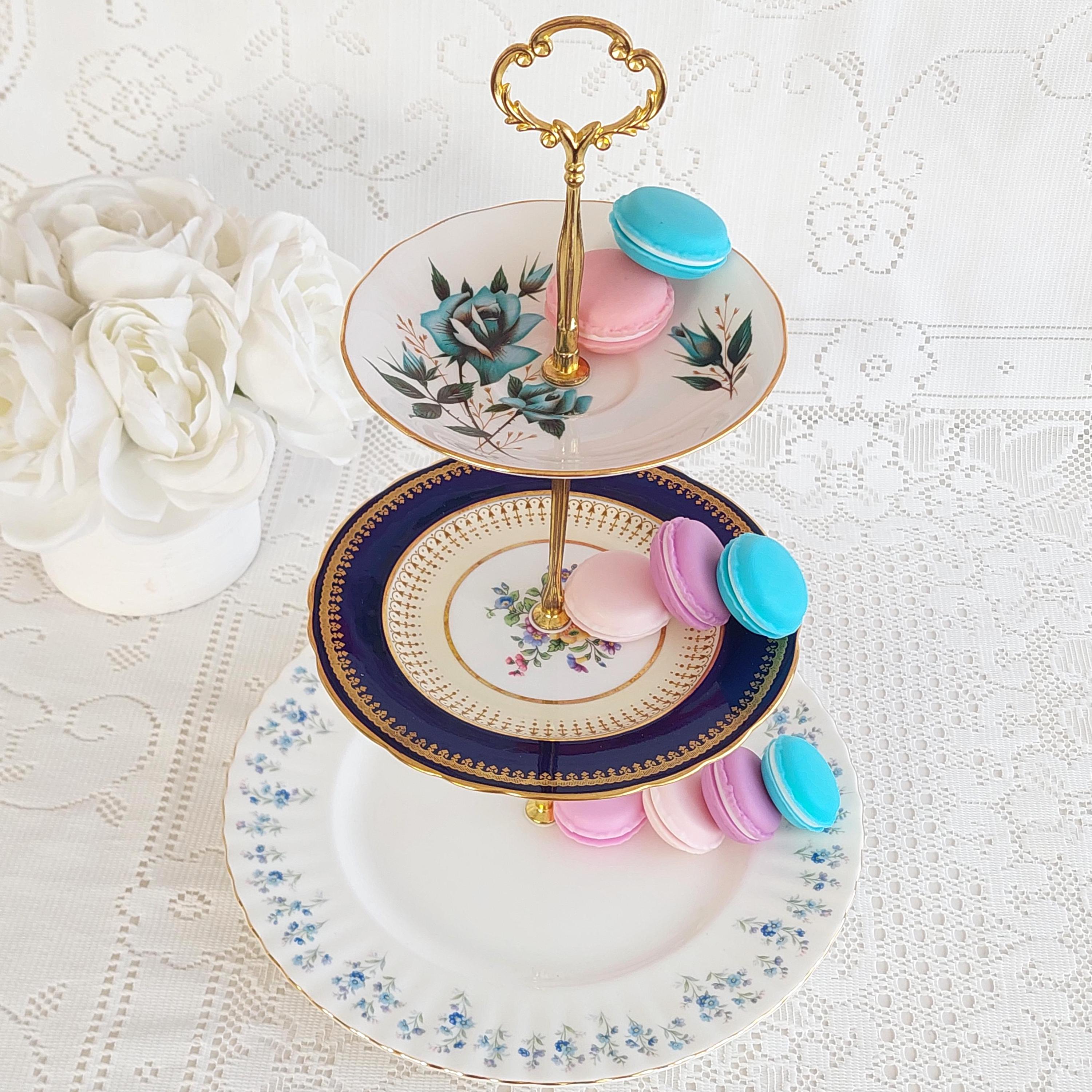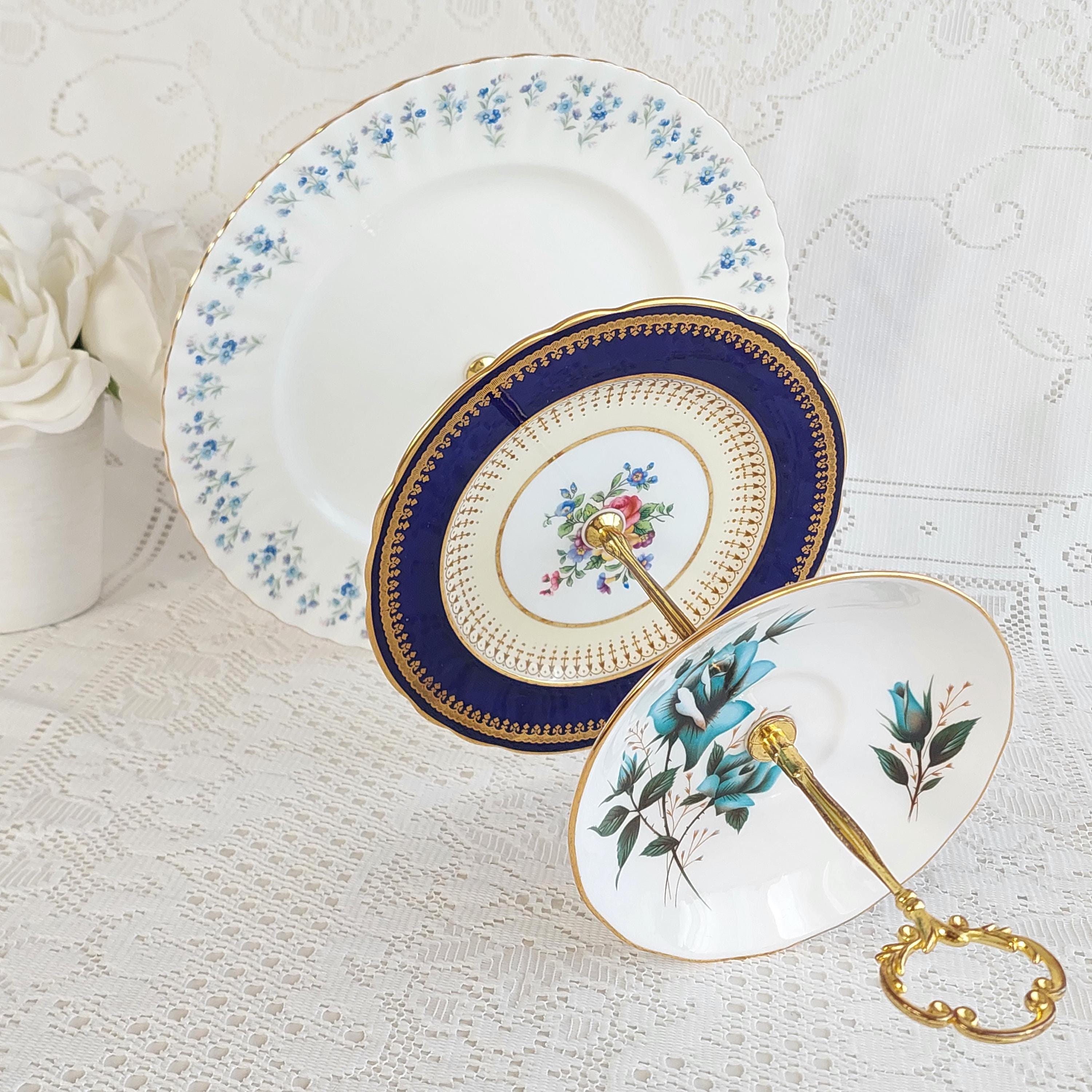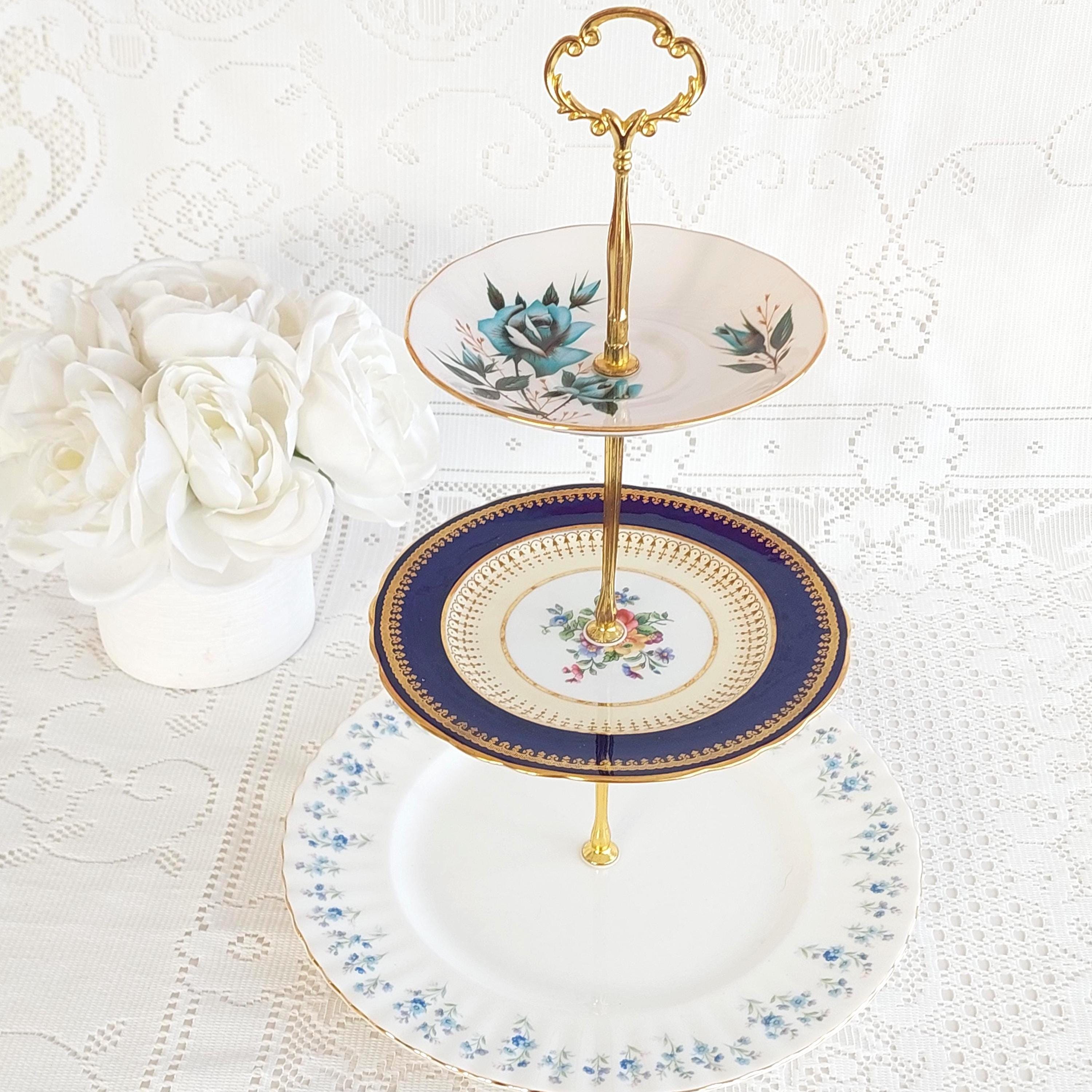 Each stand features genuine bone china plates made in England by renowned brands—Royal Vale saucer (5.5" top), Aynsley (7" middle), and Royal Albert (10.25" bottom)—selected for their charm and history. Sturdy new hardware in your choice of black, white, silver, or gold tone makes this serving piece both functional and customizable to your style.