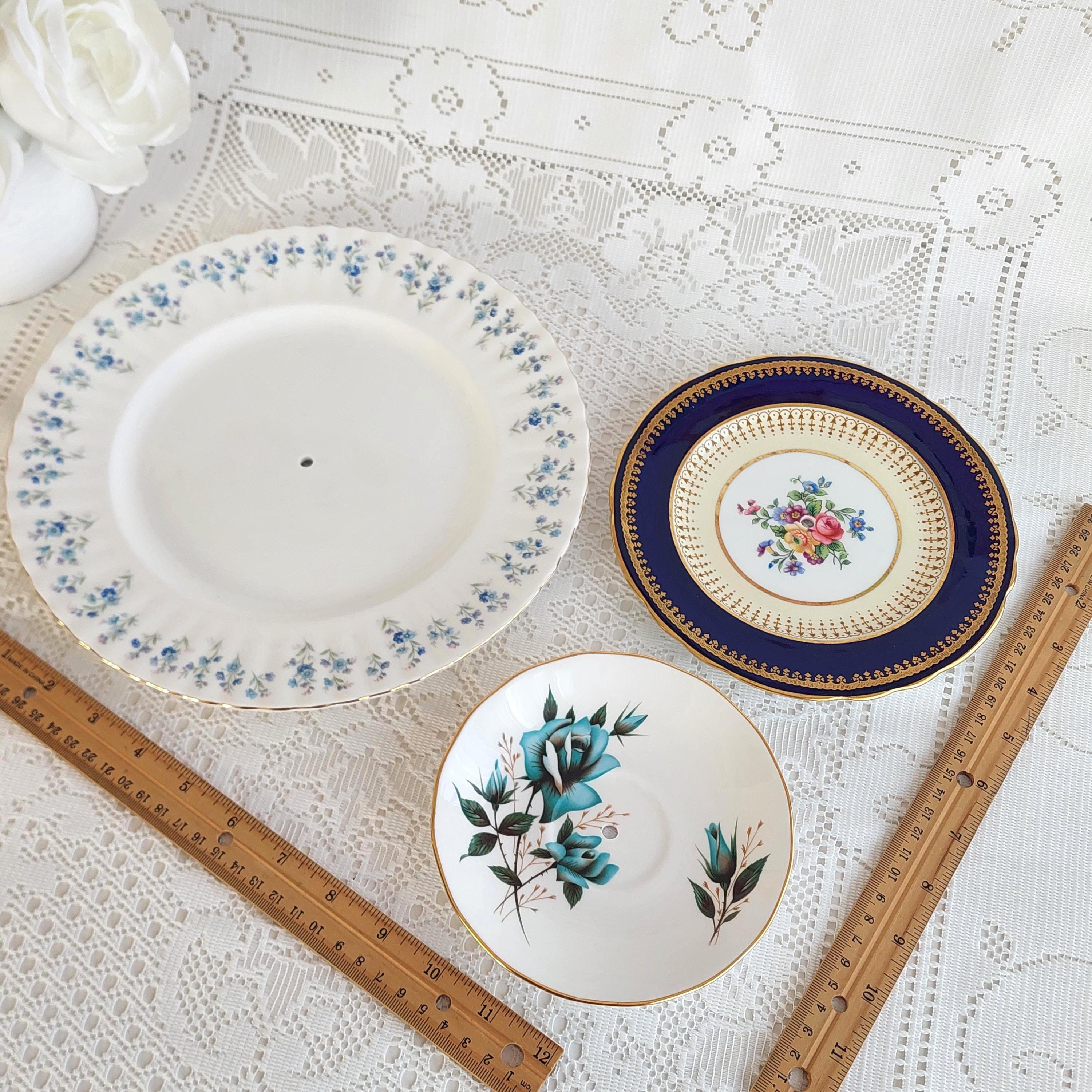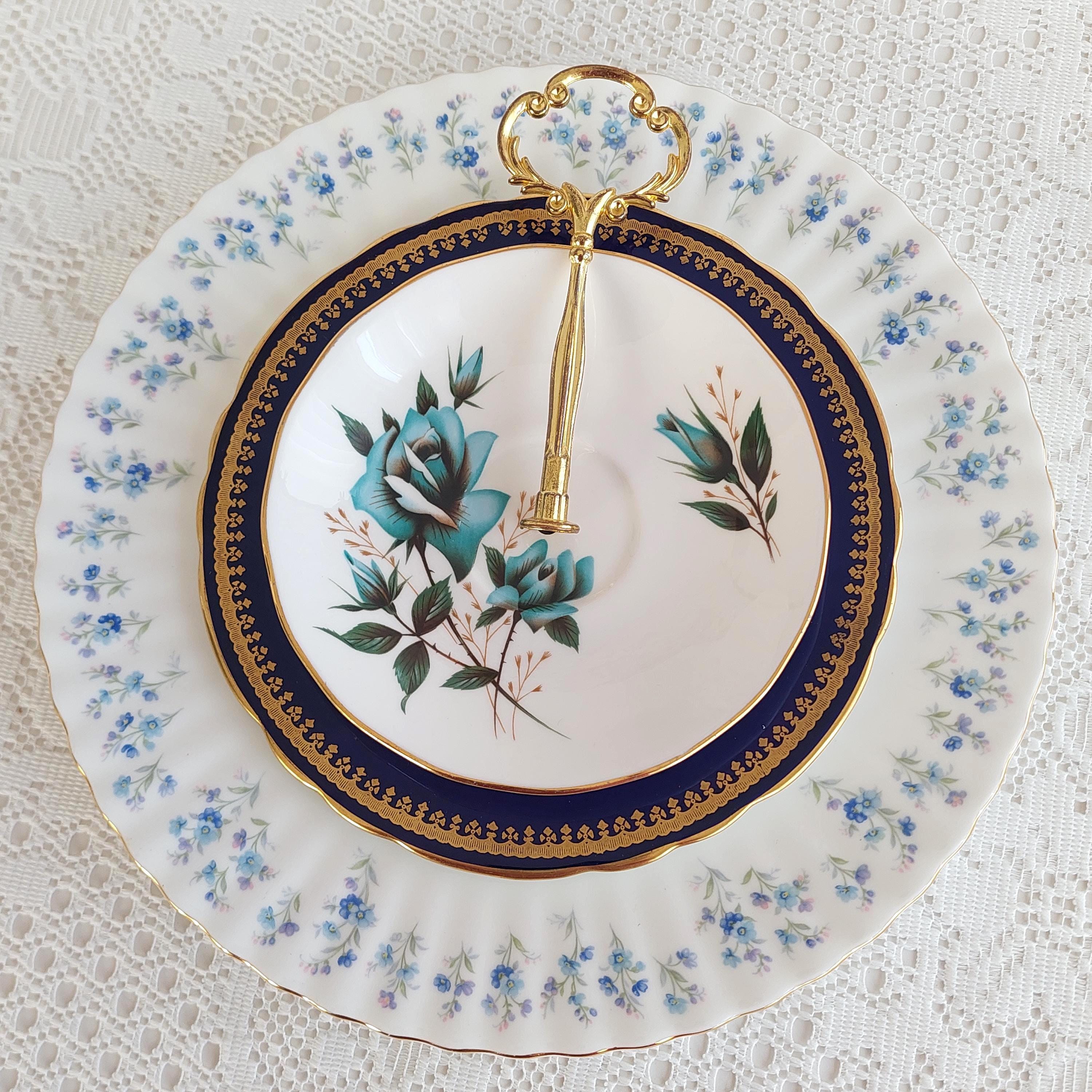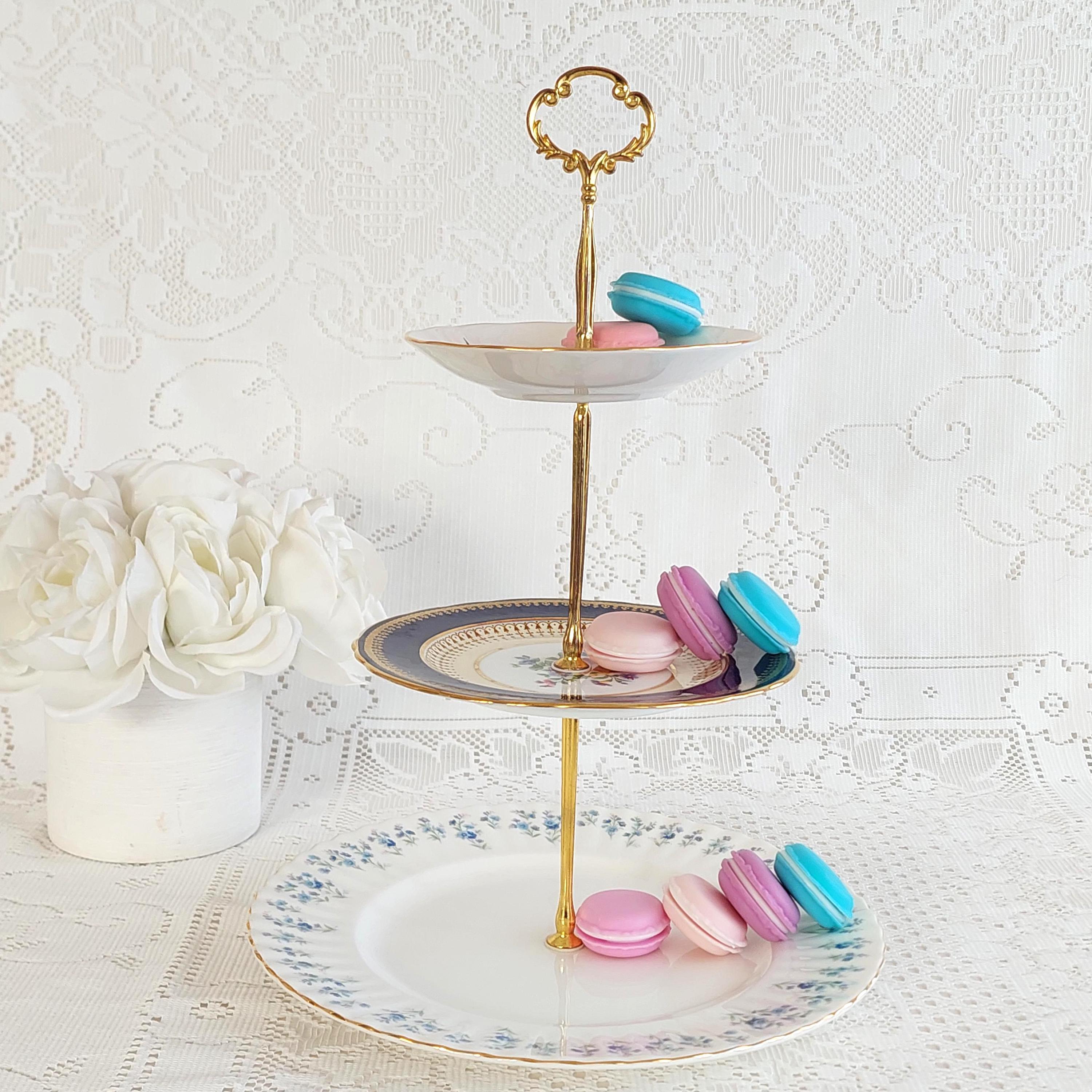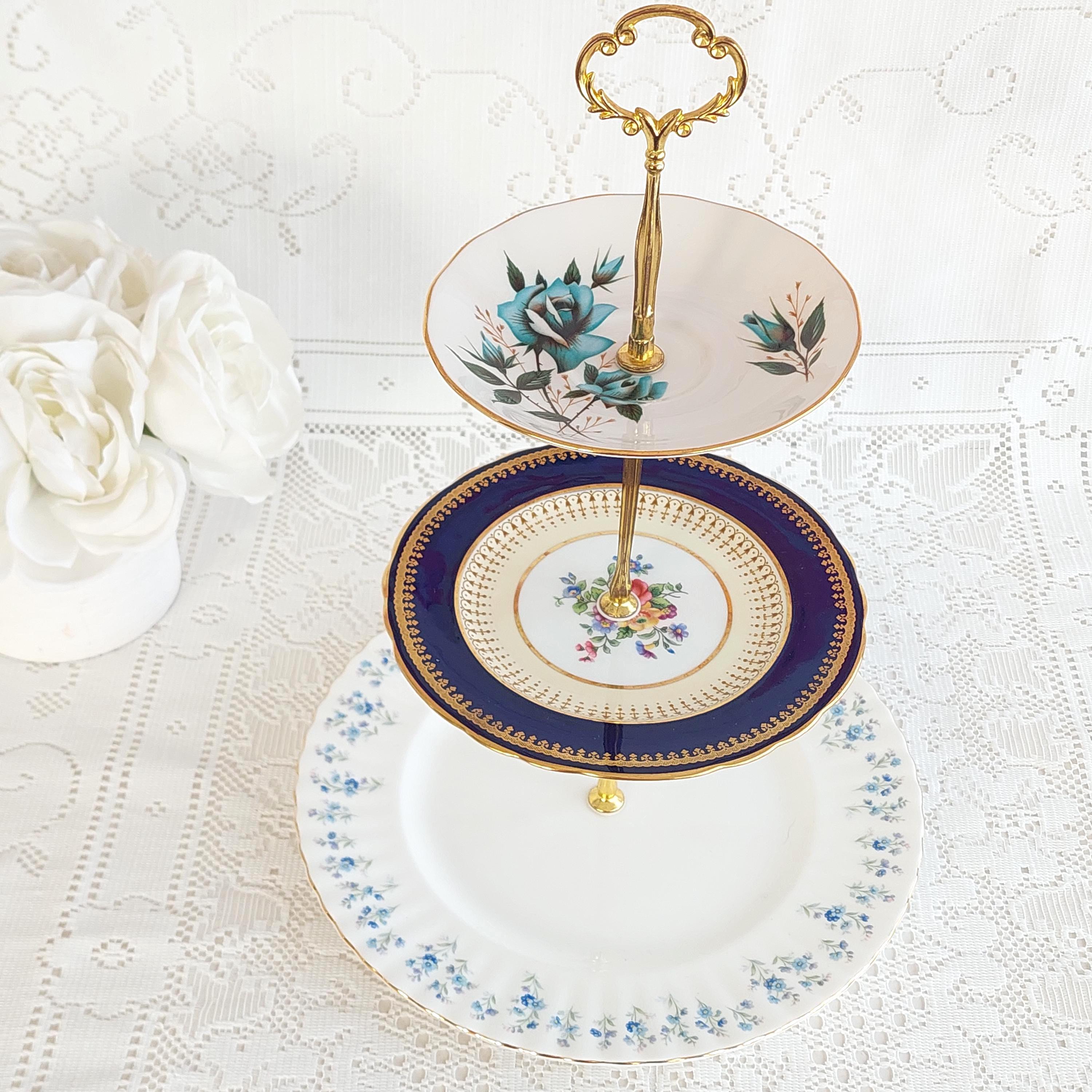 Each stand features genuine bone china plates made in England by renowned brands—Royal Vale saucer (5.5" top), Aynsley (7" middle), and Royal Albert (10.25" bottom)—selected for their charm and history. Sturdy new hardware in your choice of black, white, silver, or gold tone makes this serving piece both functional and customizable to your style.