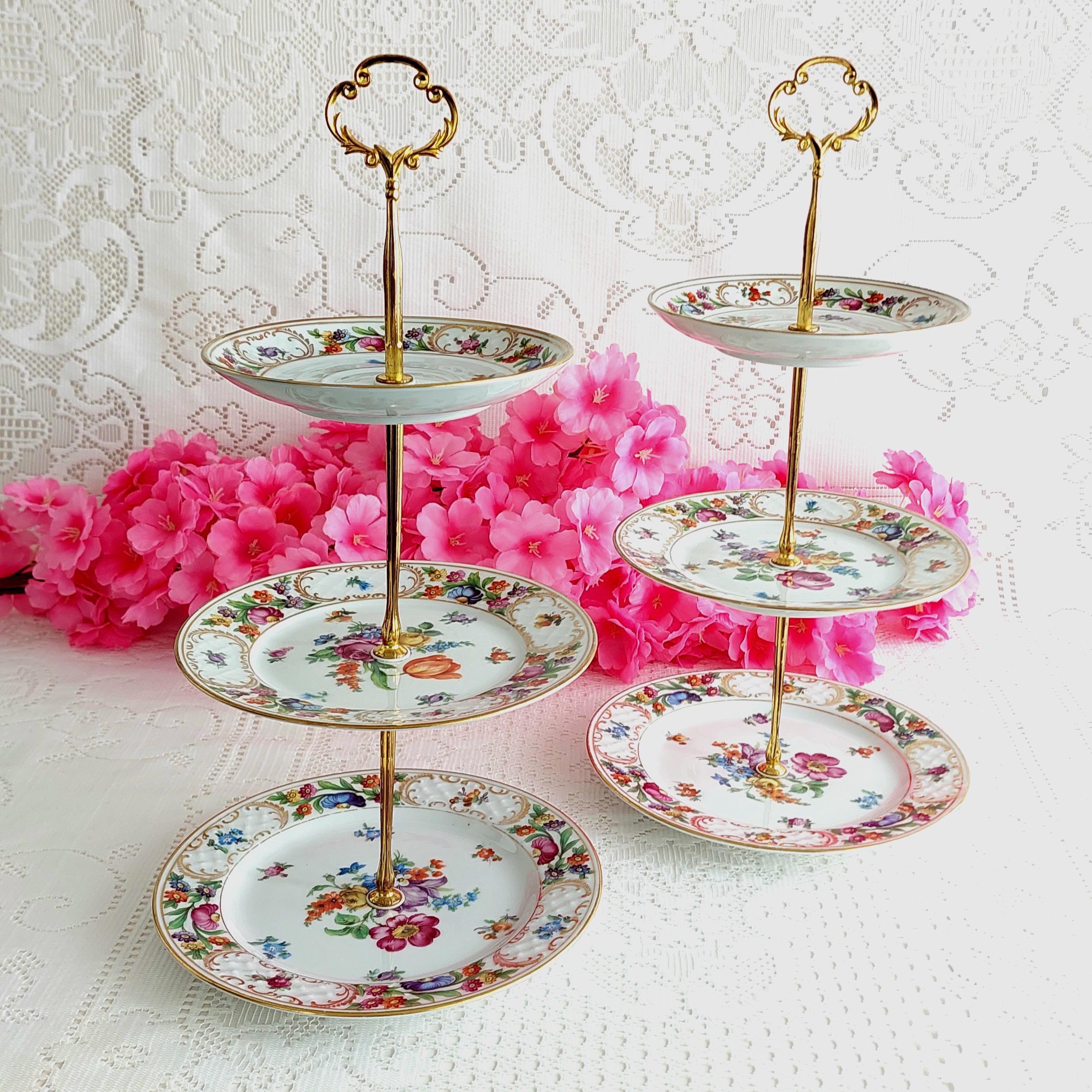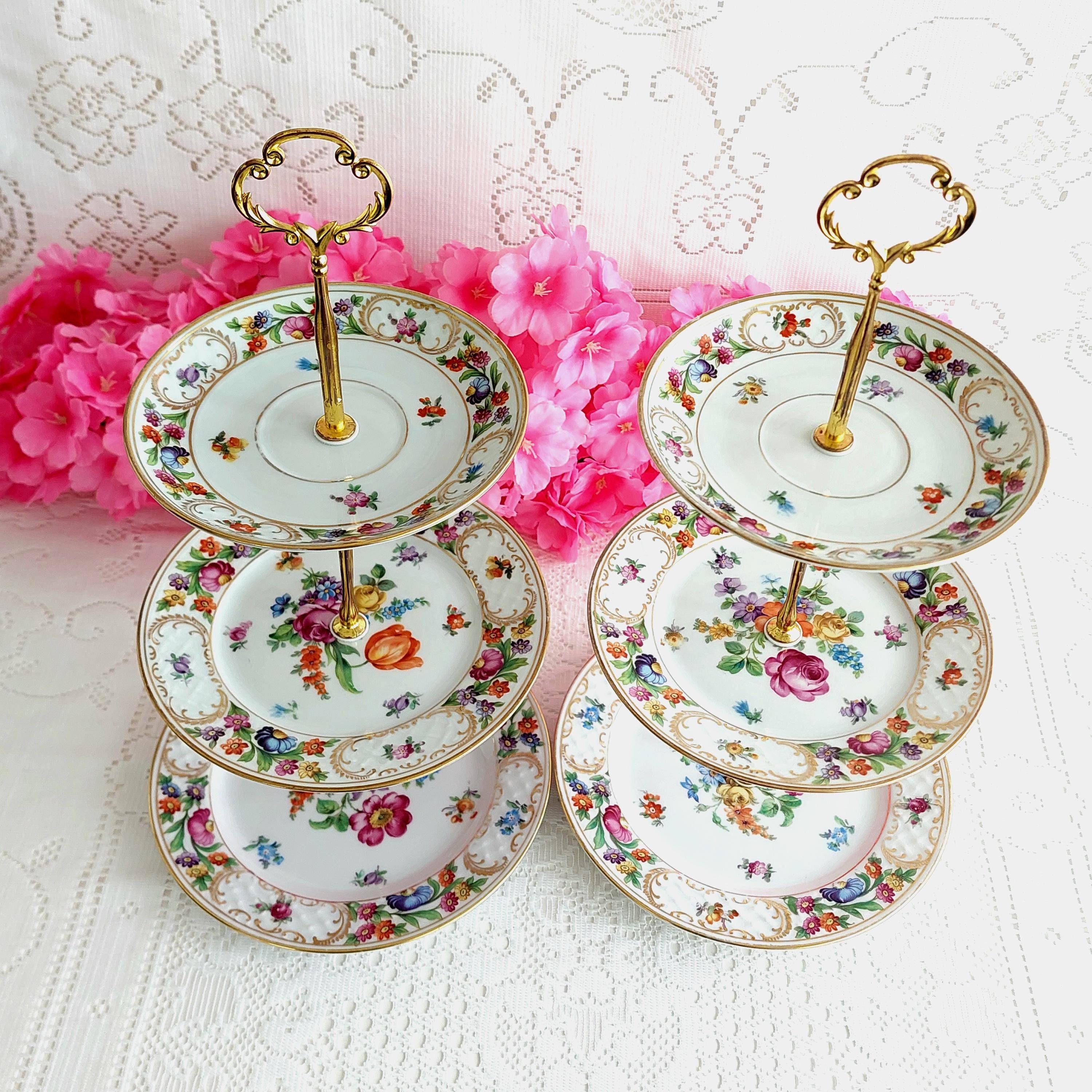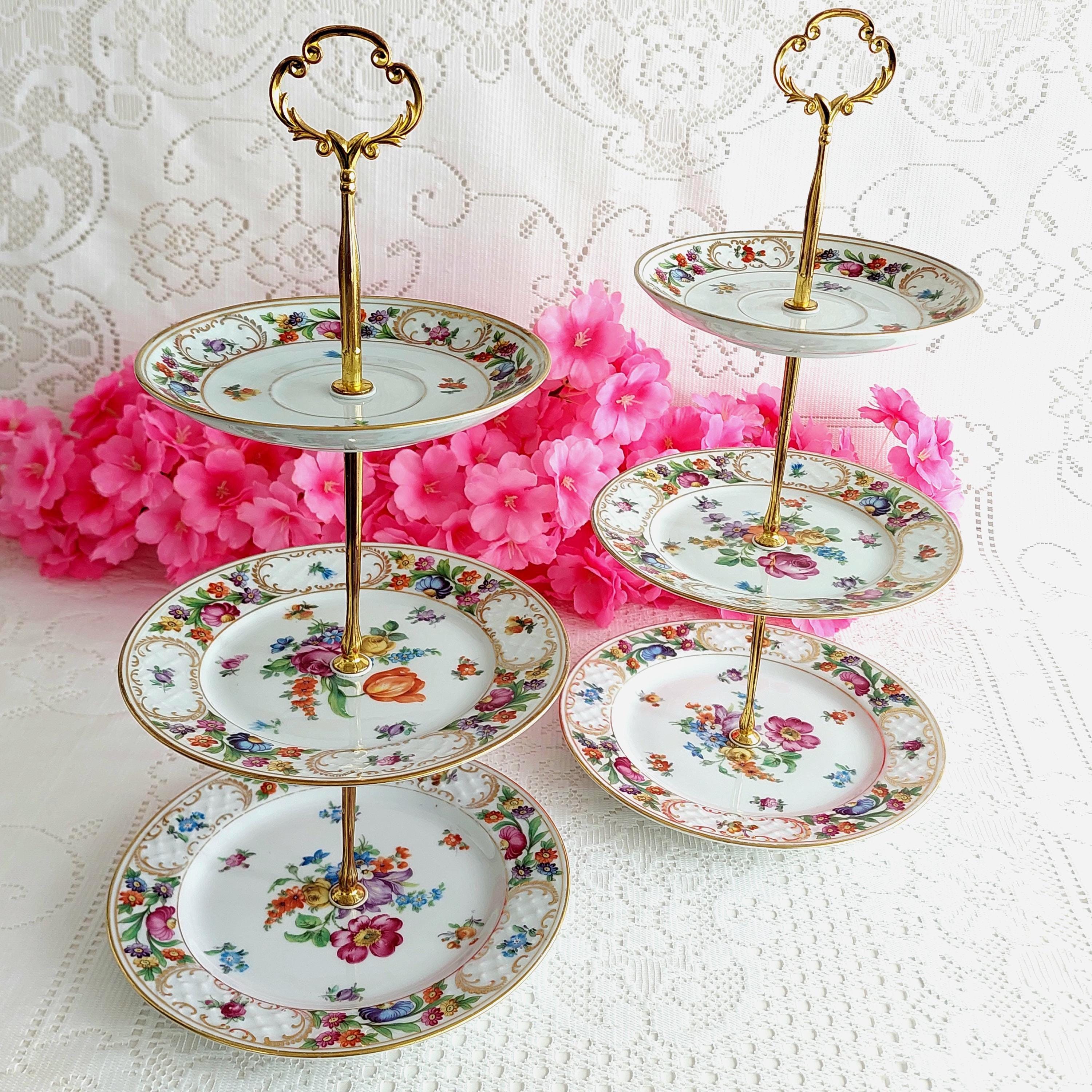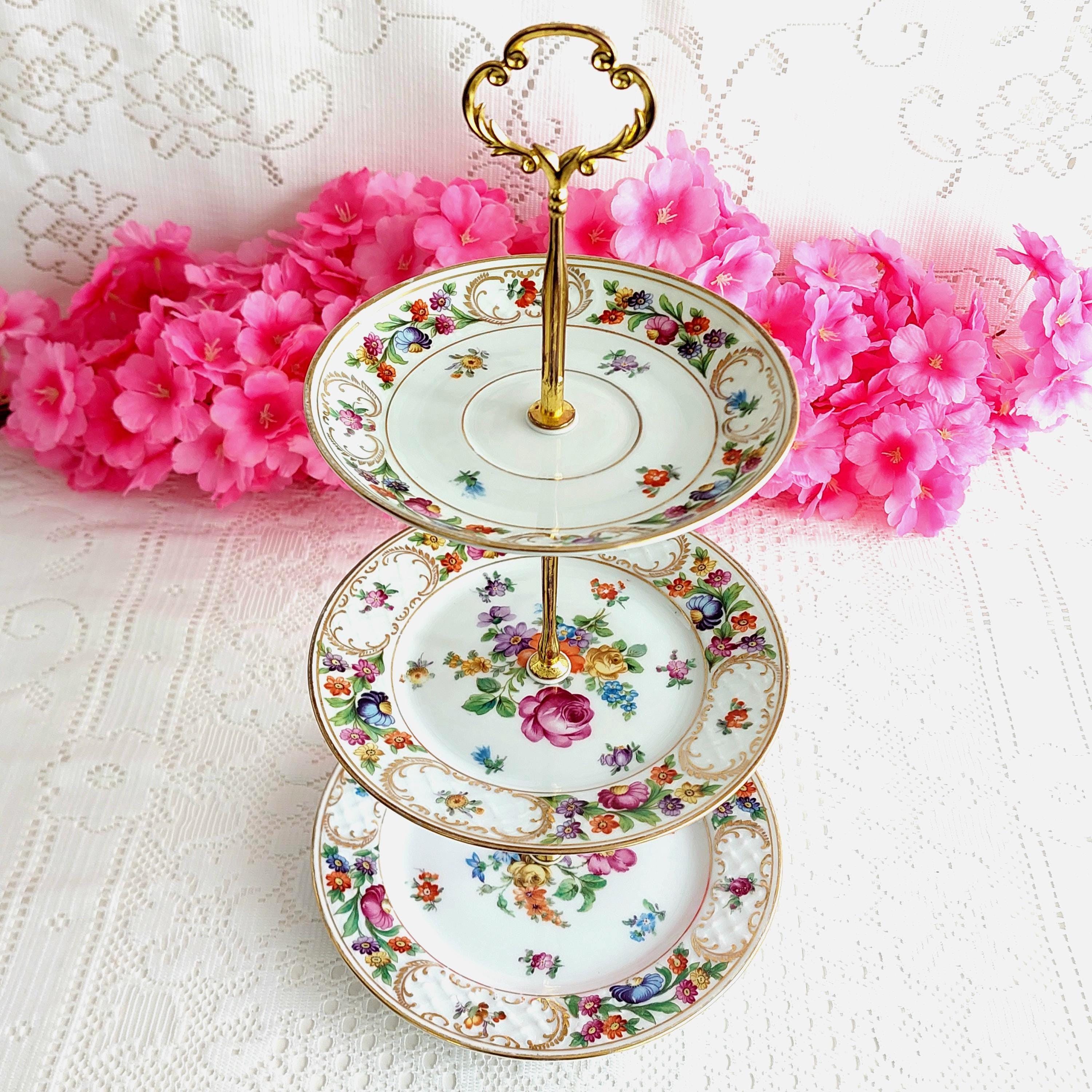 Perfect for special occasions and elegant gatherings, this small three-tier cake stand is handmade using mismatched vintage Schumann Bavaria Dresden plates. It’s ideal for weddings, tea parties, baby showers, or as a unique jewelry display. If you’re searching for a housewarming, wedding, birthday, or Christmas gift that truly stands out, this tiered stand makes a memorable centerpiece.