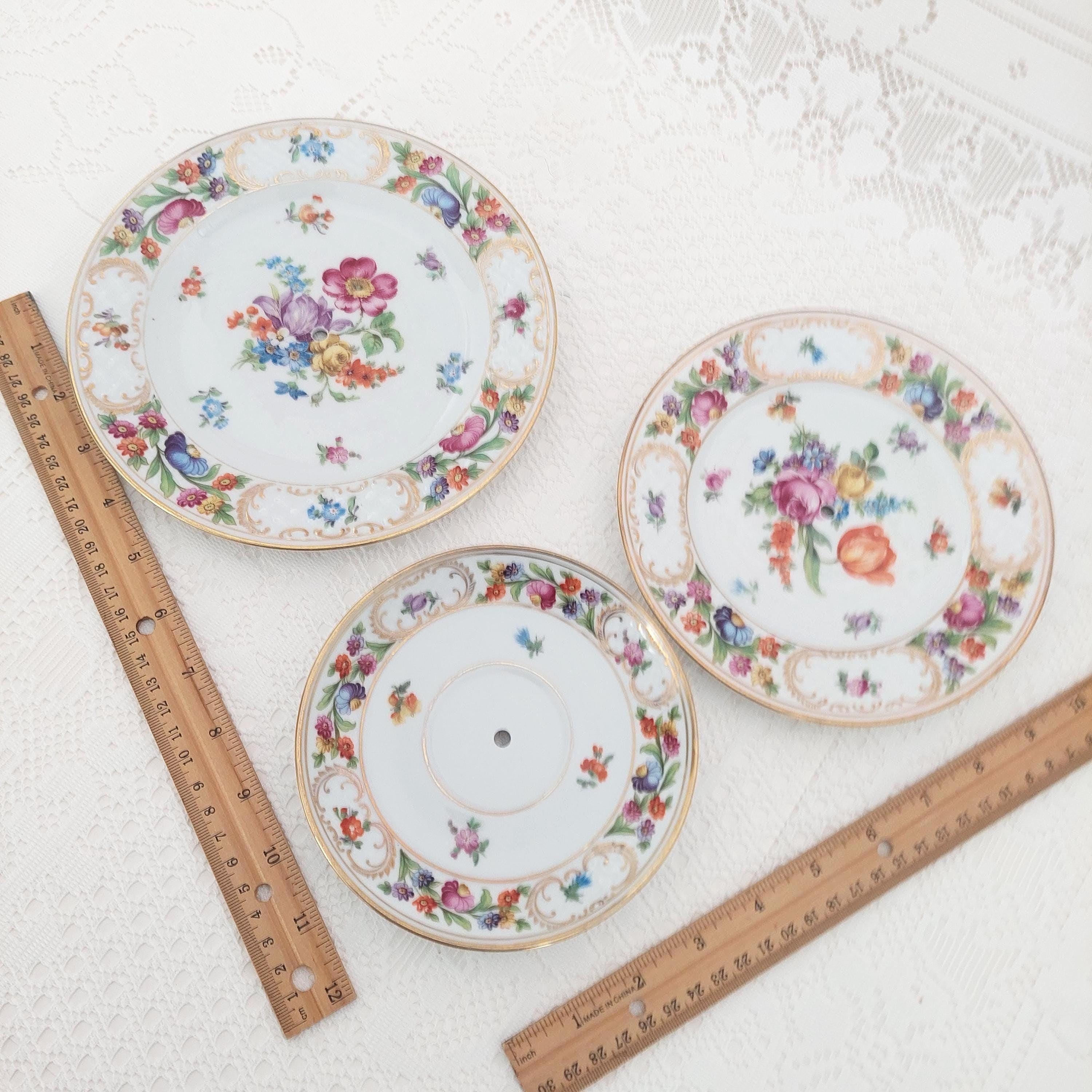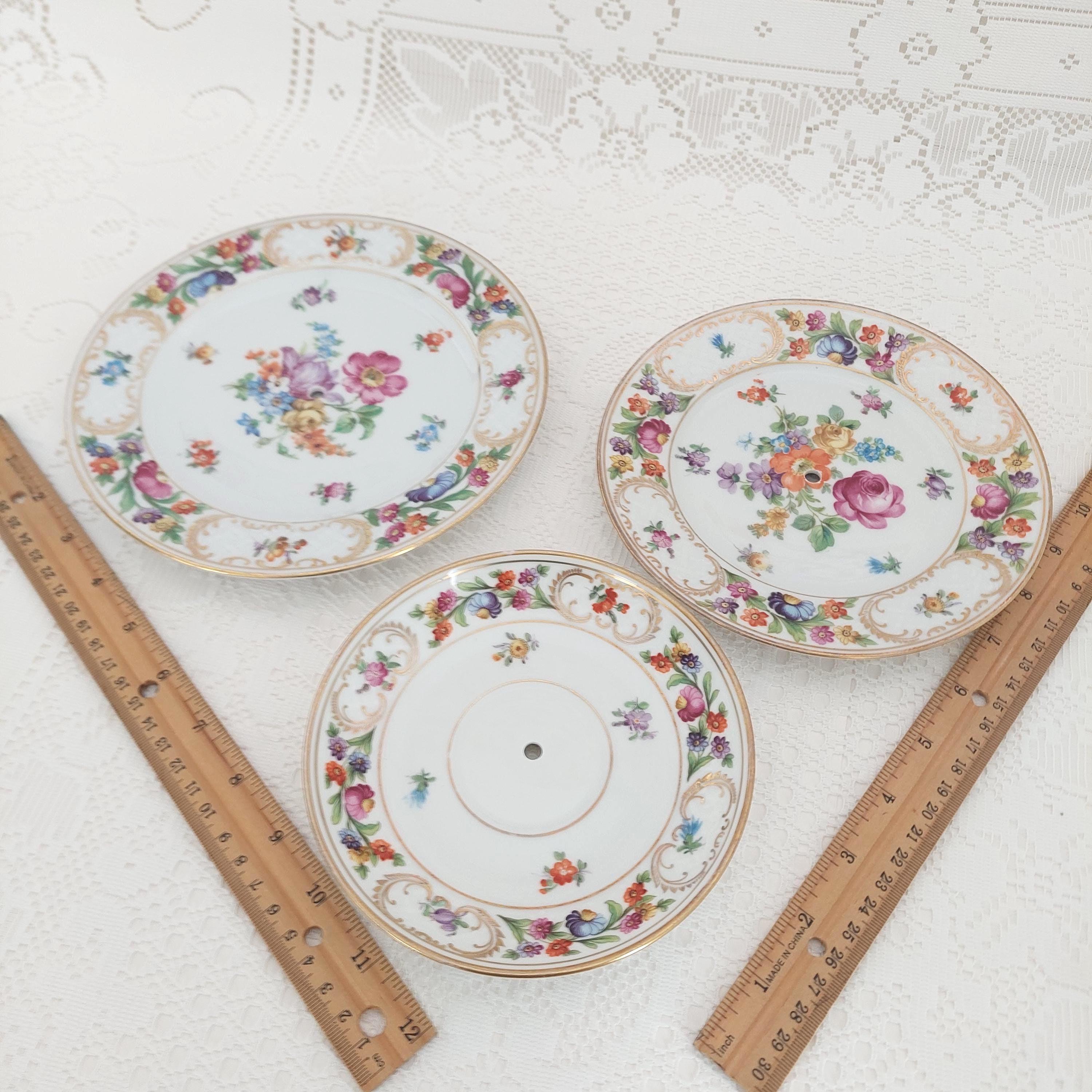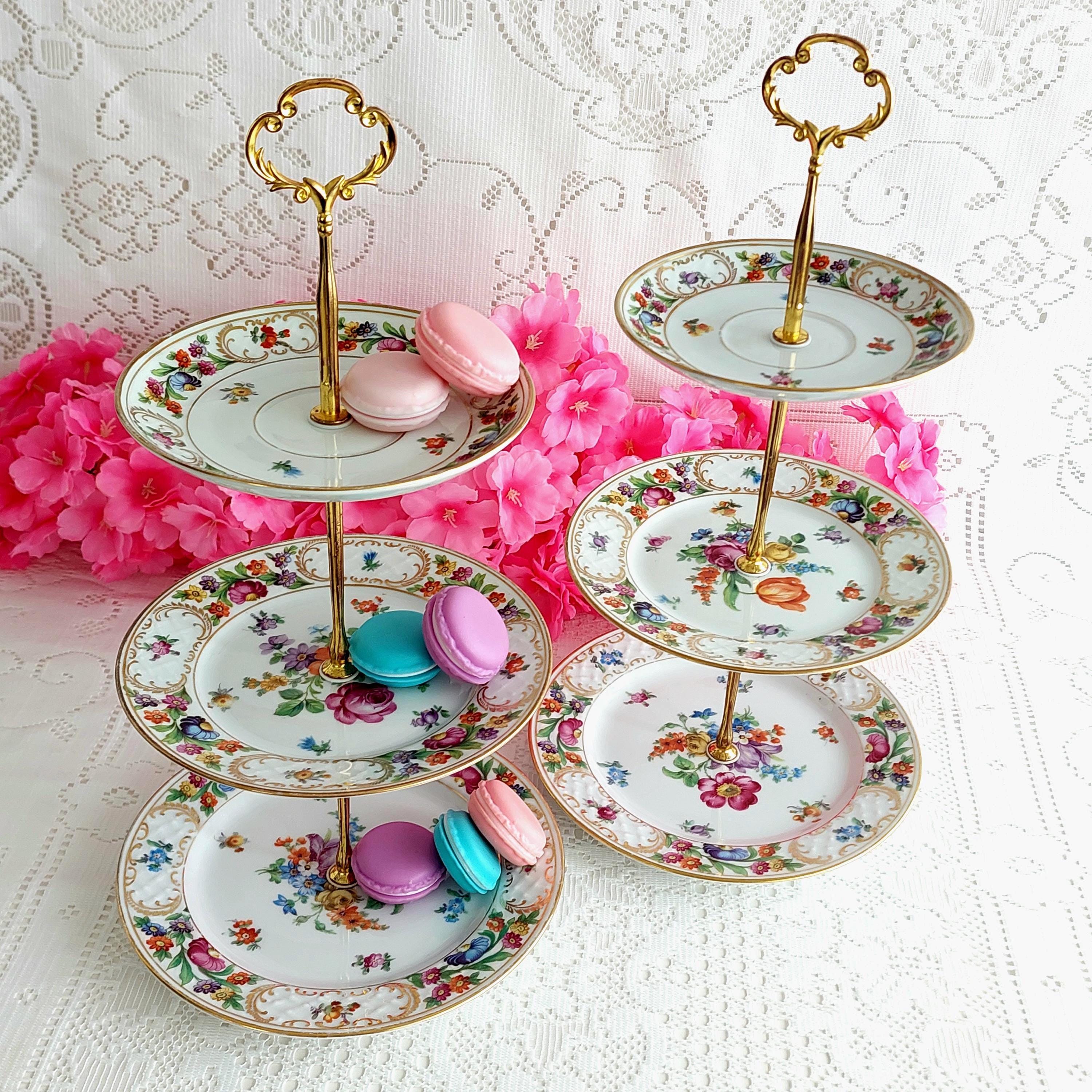 Each stand features genuine porcelain plates made in Germany by renowned Schumann—saucer (5.75" top), side plate (6.75" middle), and salad plate (7.75" bottom)—selected for their charm and history. Sturdy new hardware in your choice of black, white, silver, or gold tone makes this serving piece both functional and customizable to your style.