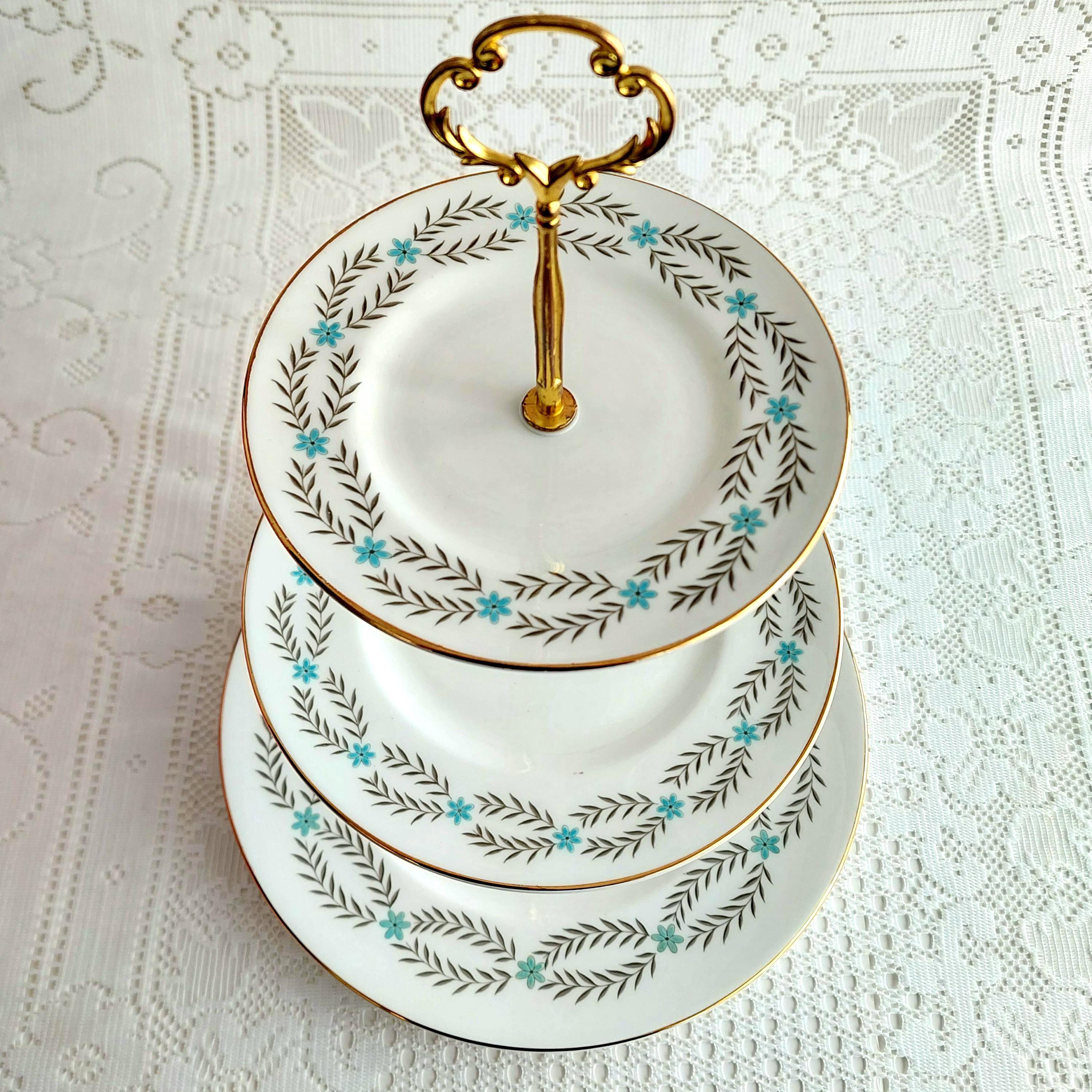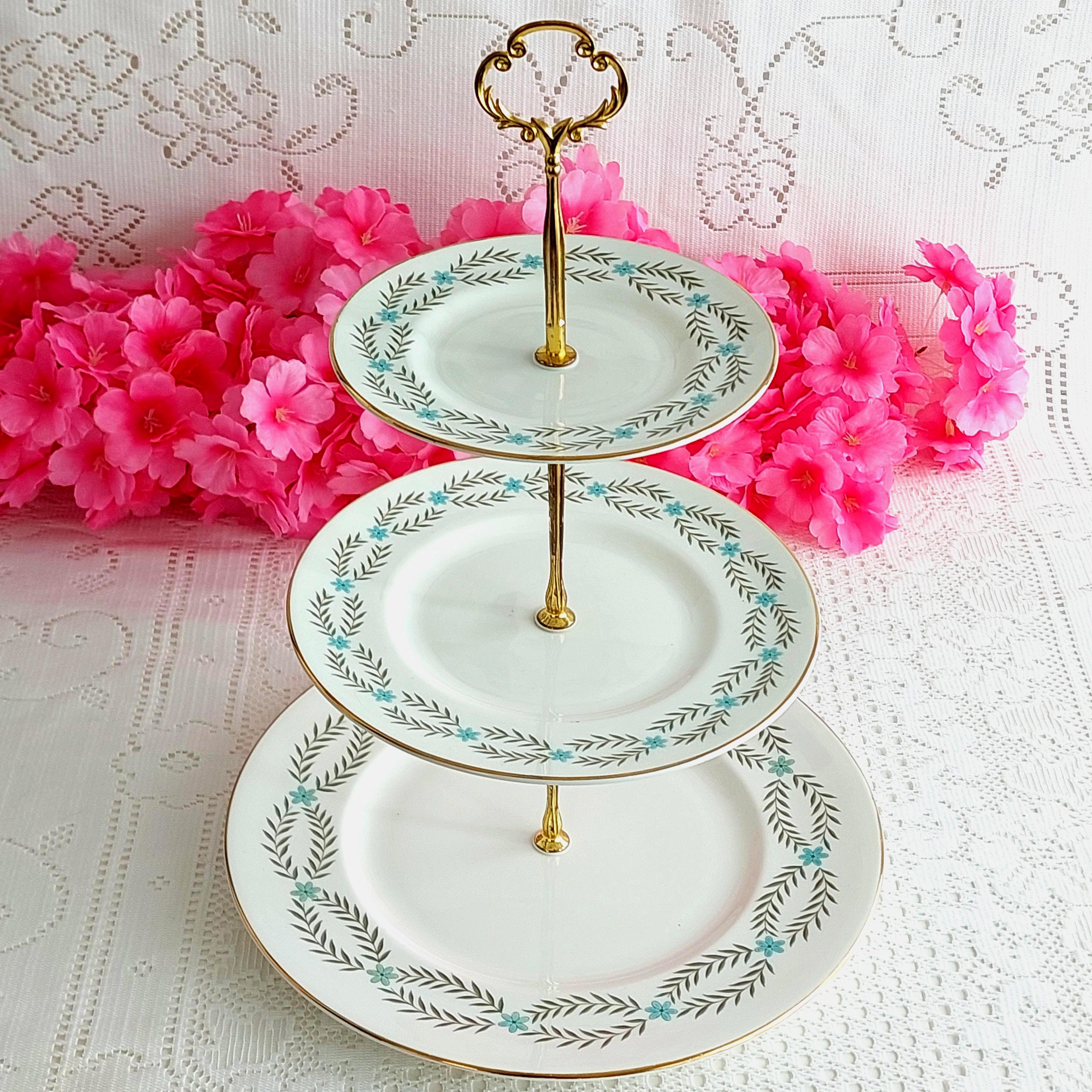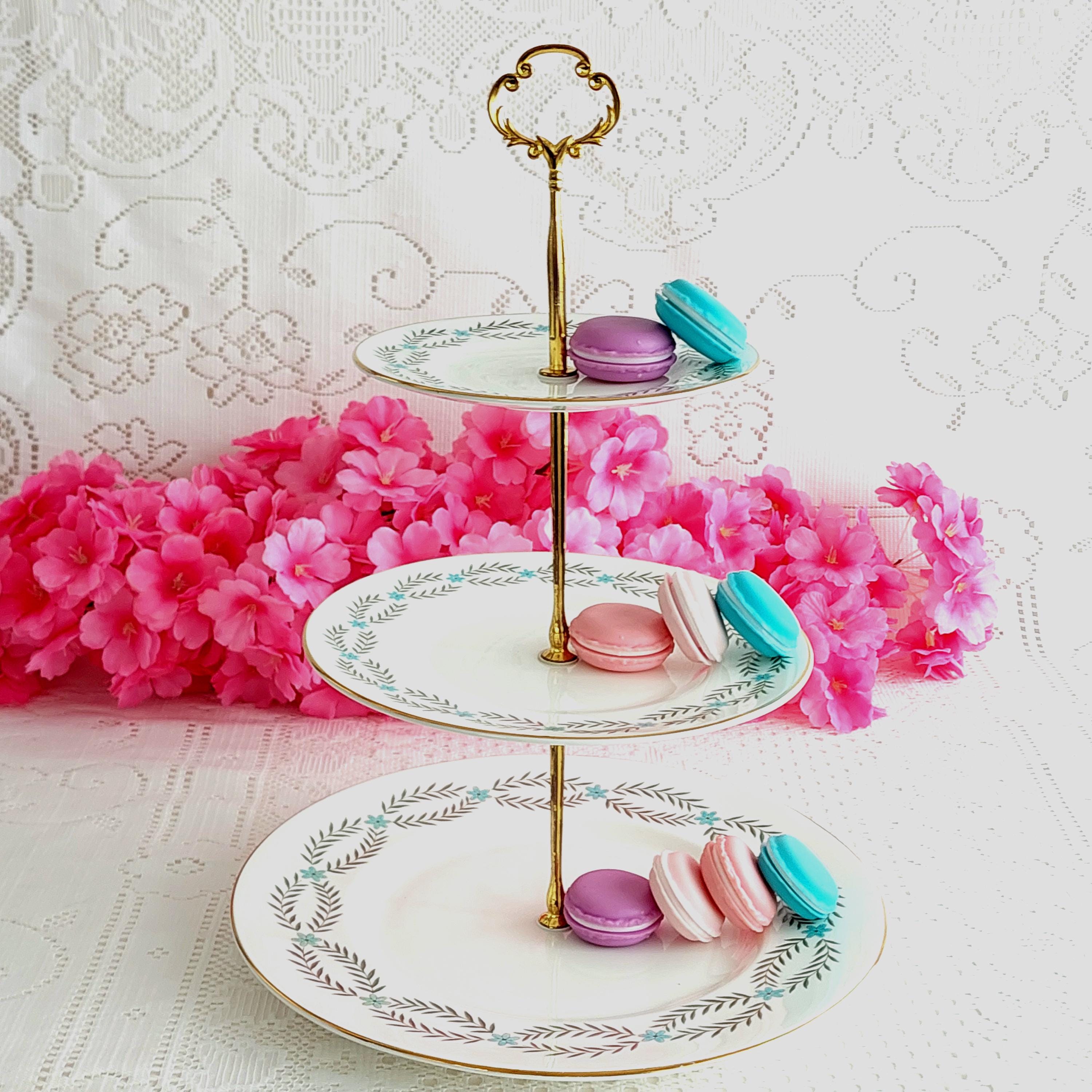 Each stand features genuine bone china plates made in England stacked as 6.25" top, 8" middle, and 10.5" bottom—selected for their charm and history. Sturdy new hardware in your choice of black, white, silver, or gold tone makes this serving piece both functional and customizable to your style.