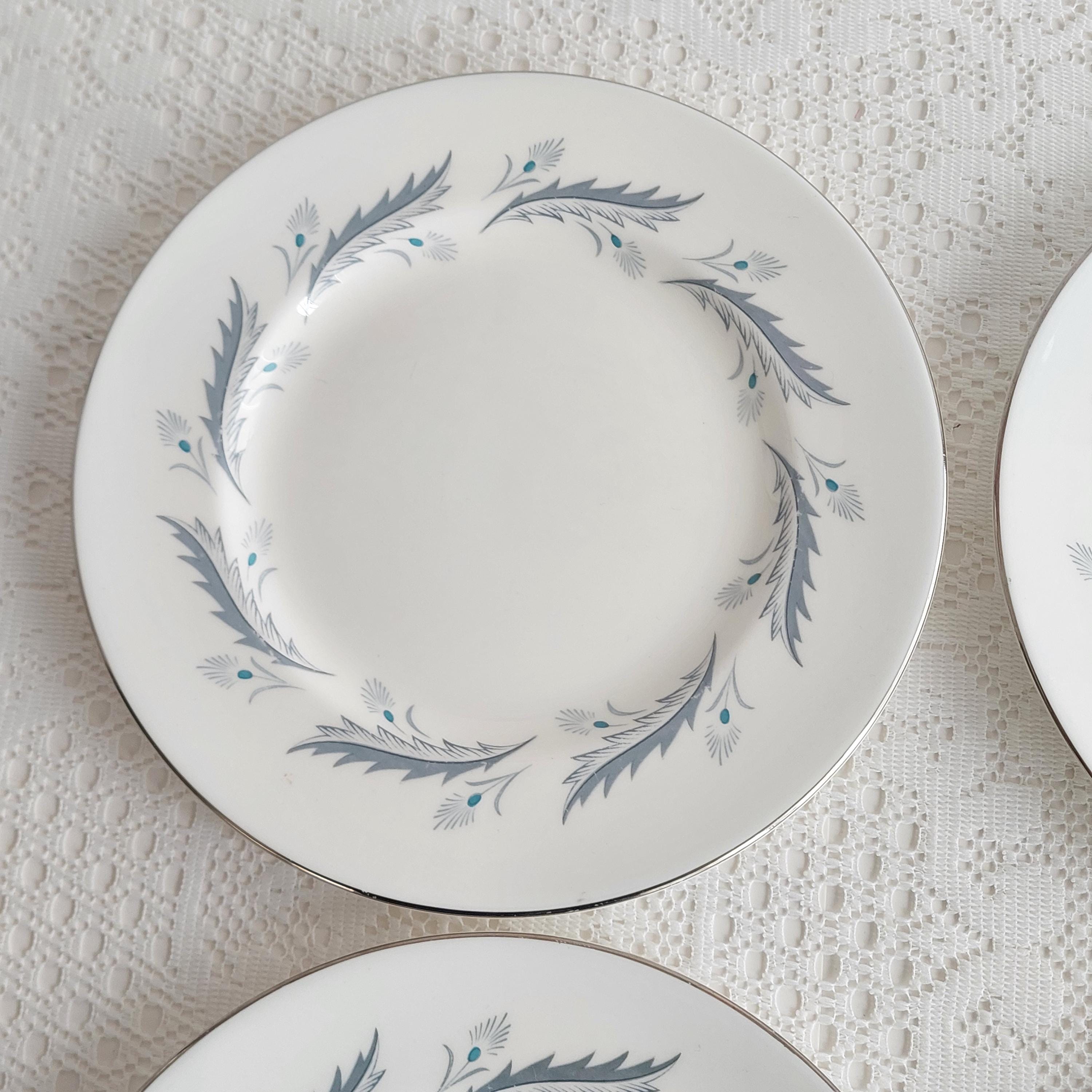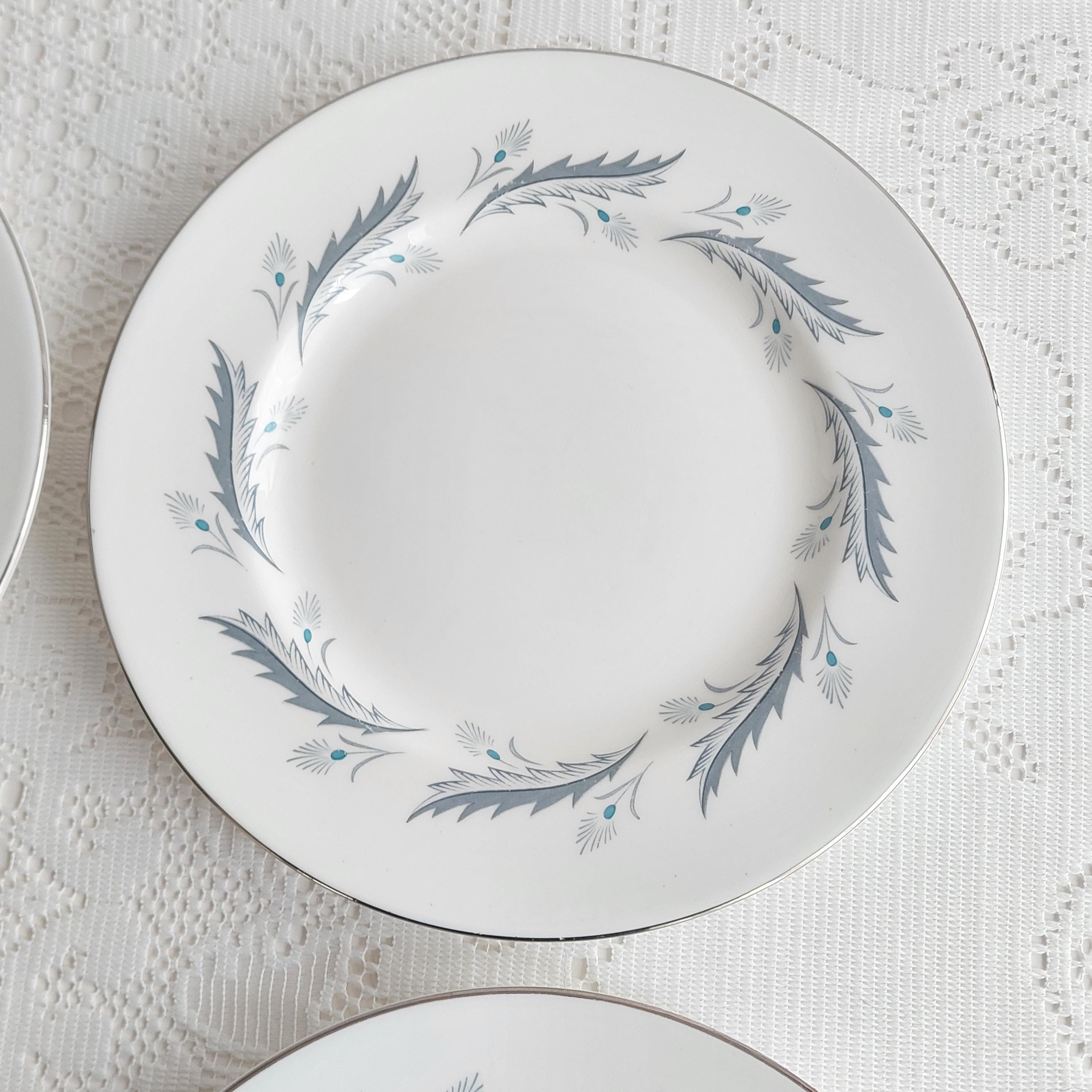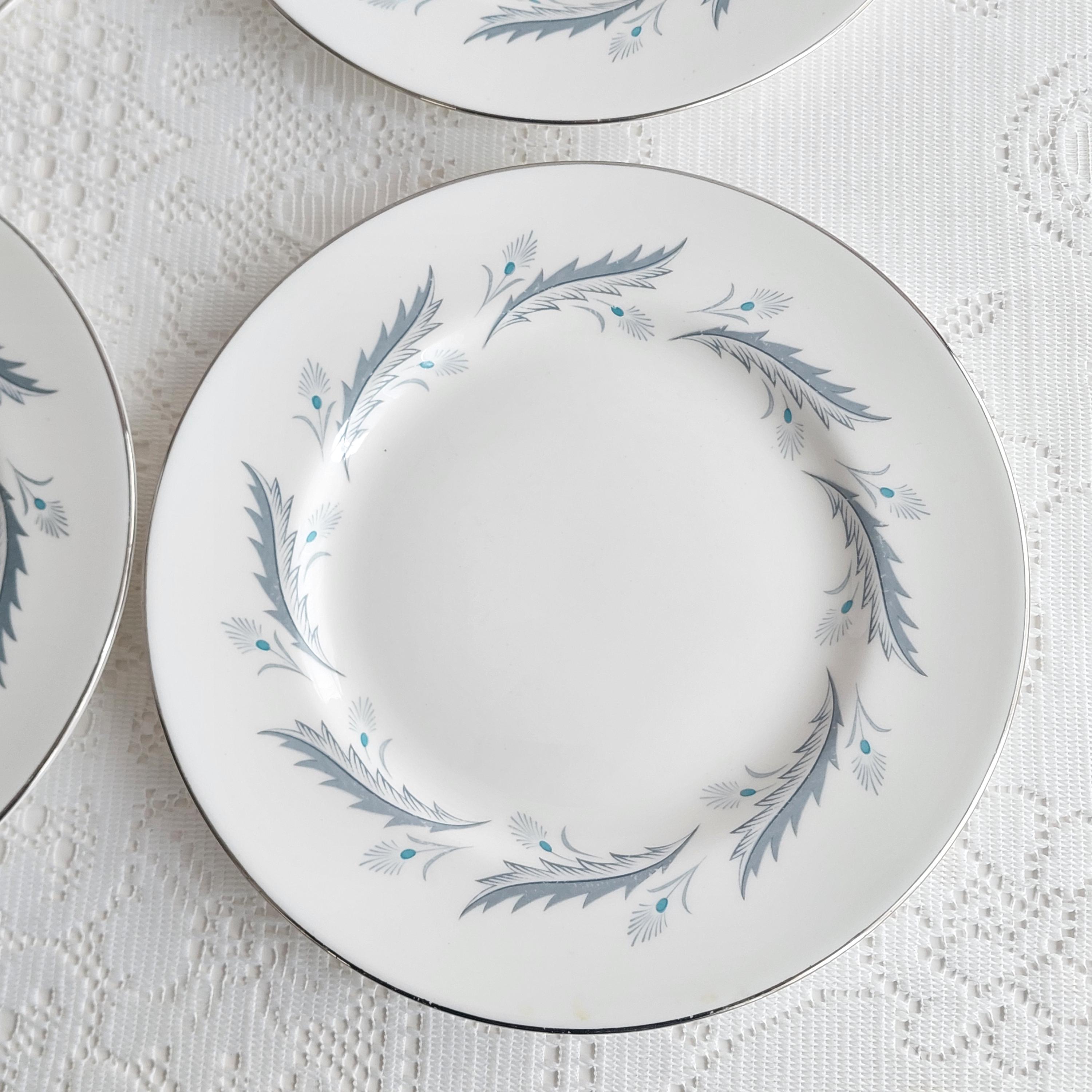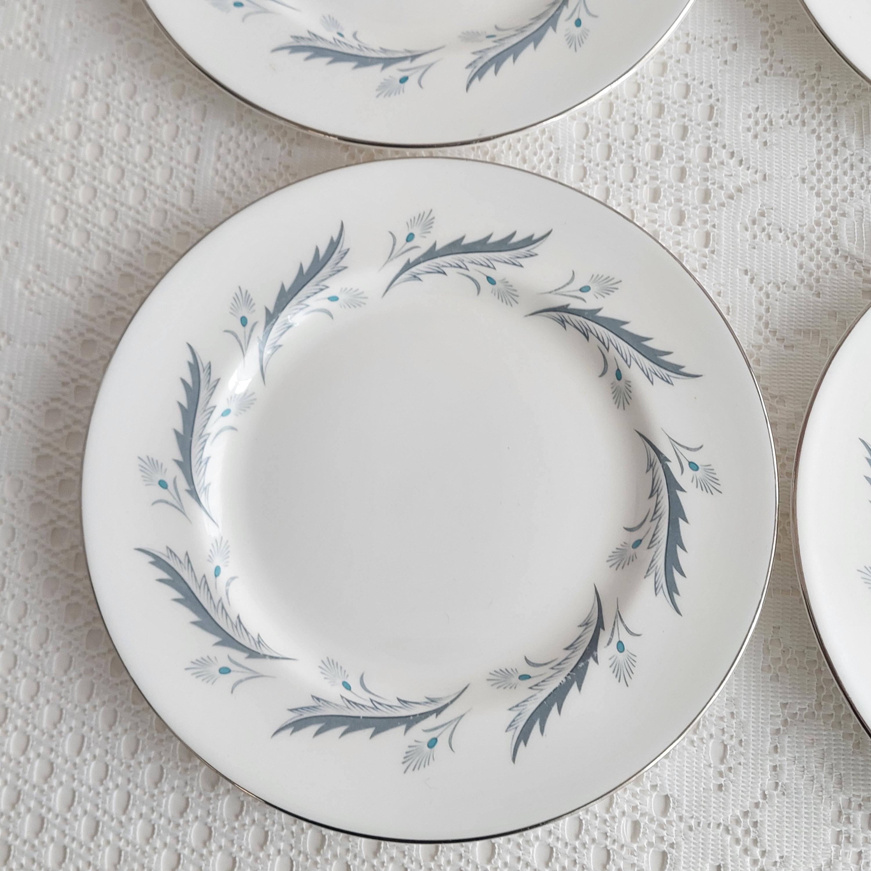 Vintage Paragon Bridal Leaf salad plates featuring a slate blue feather-like ring on crisp white English bone china. Silver / platinum edge. Royal Warrant. Made in England, circa 1960s