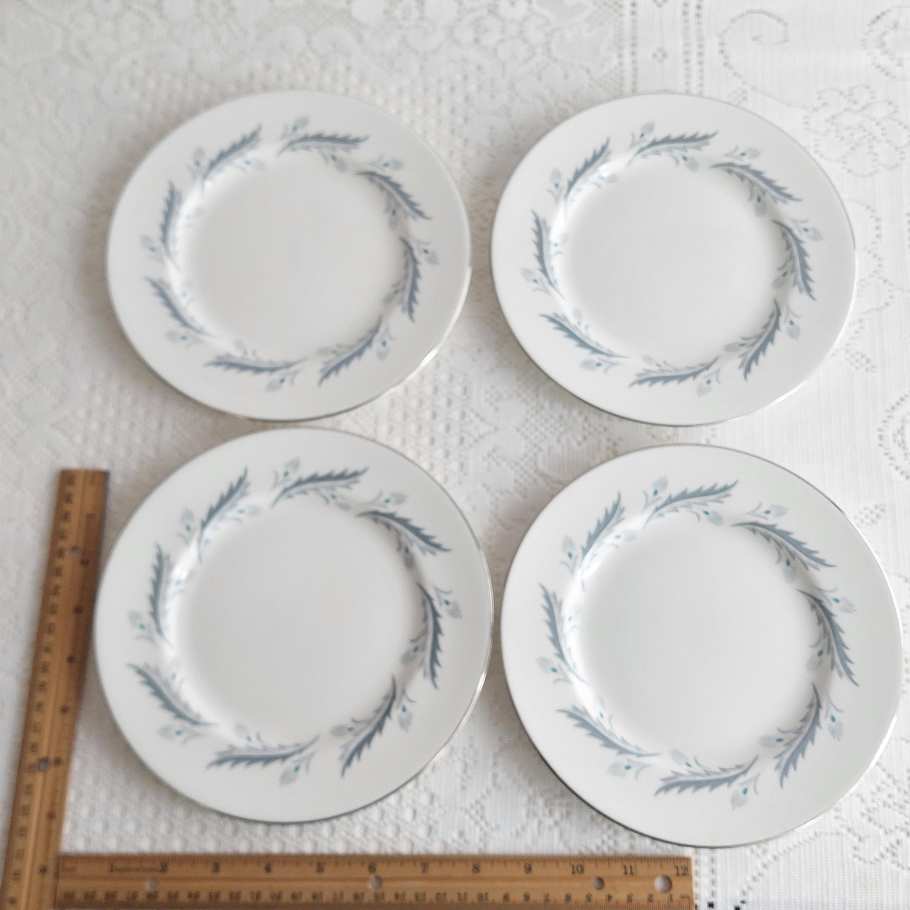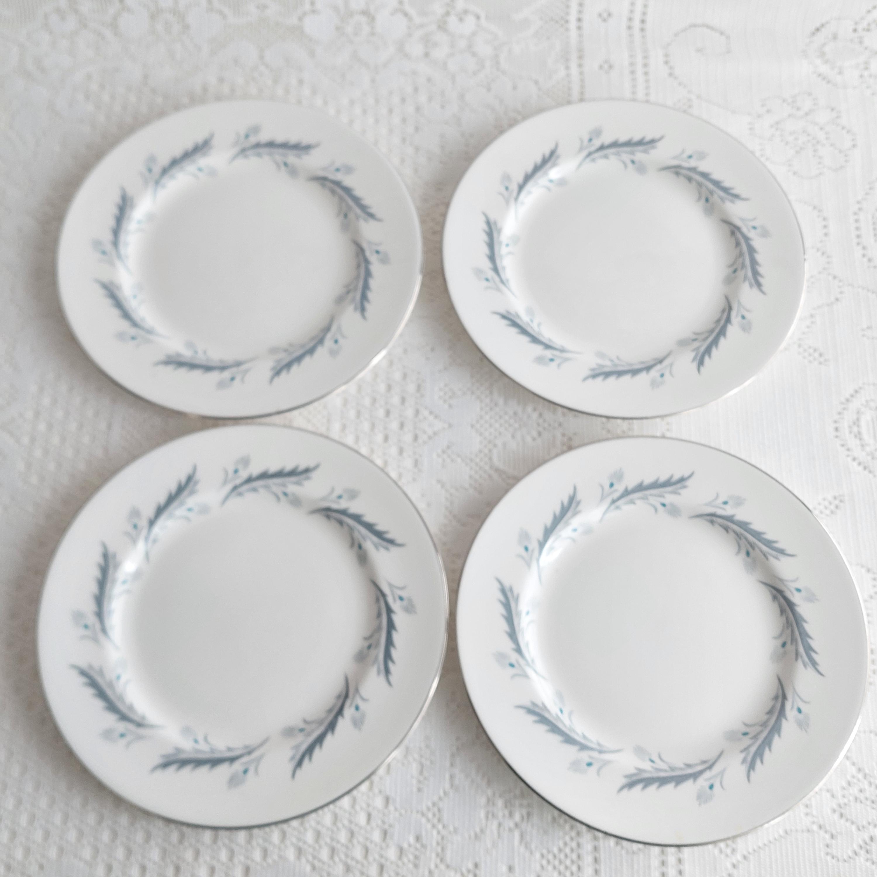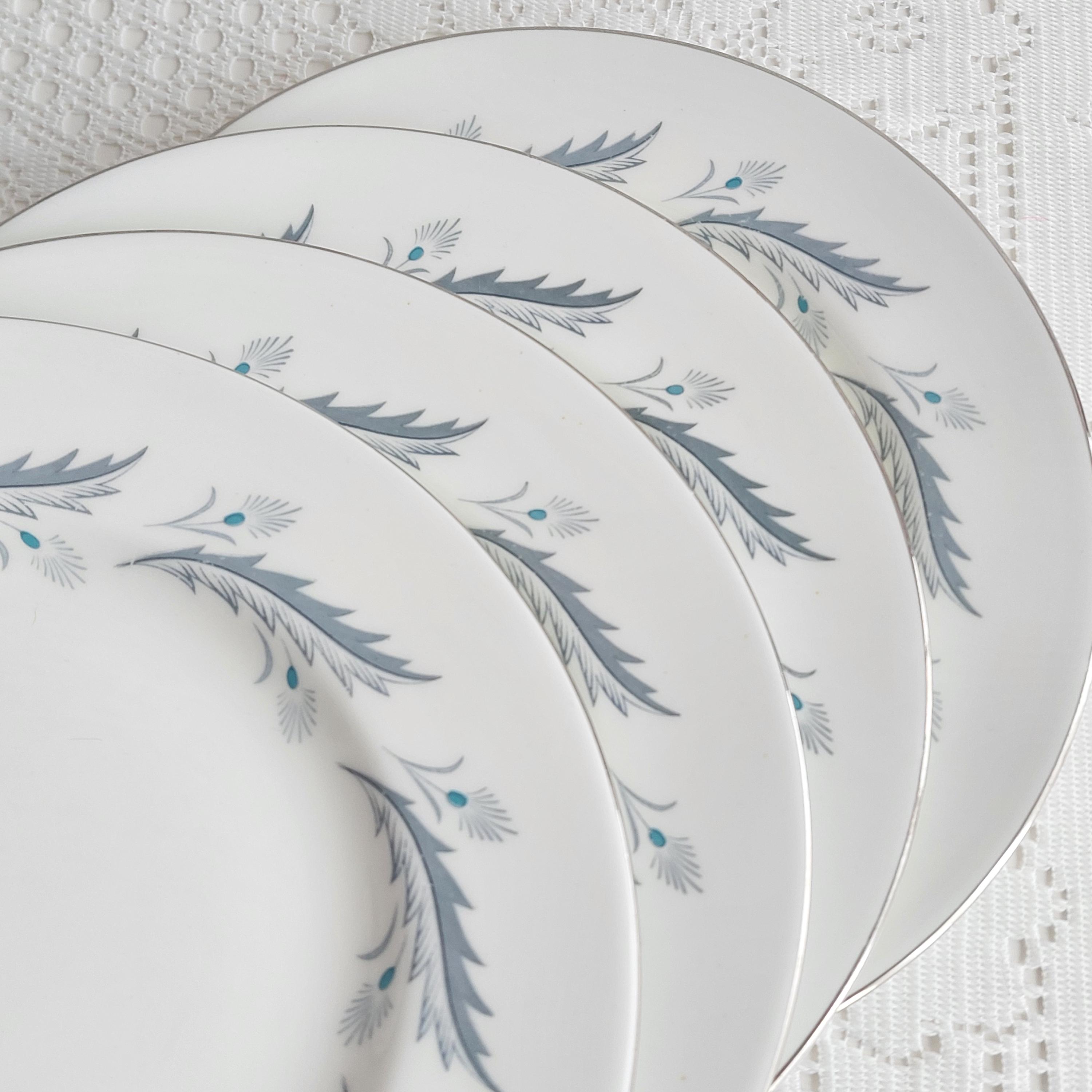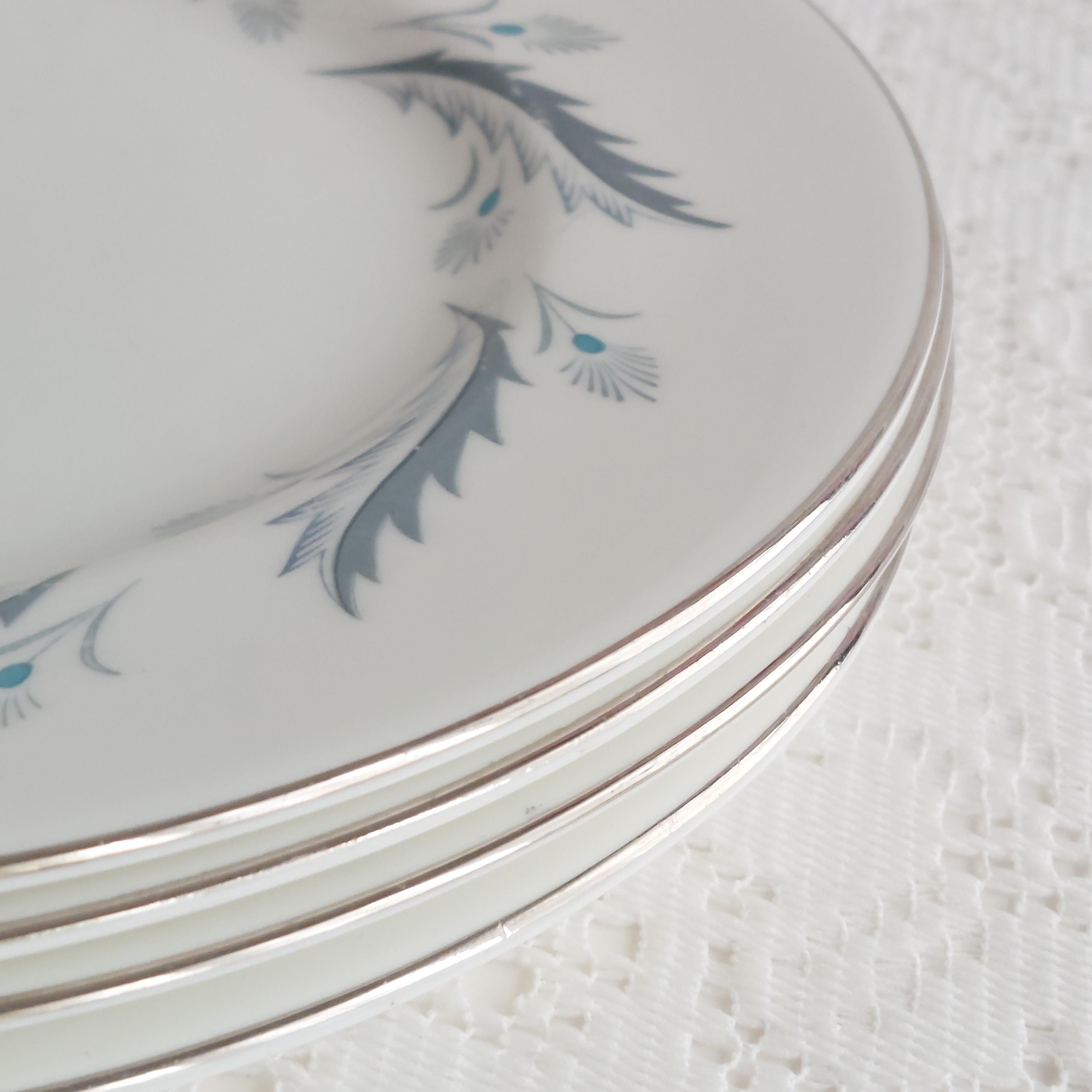 Vintage Paragon Bridal Leaf salad plates featuring a slate blue feather-like ring on crisp white English bone china. Silver / platinum edge. Royal Warrant. Made in England, circa 1960s