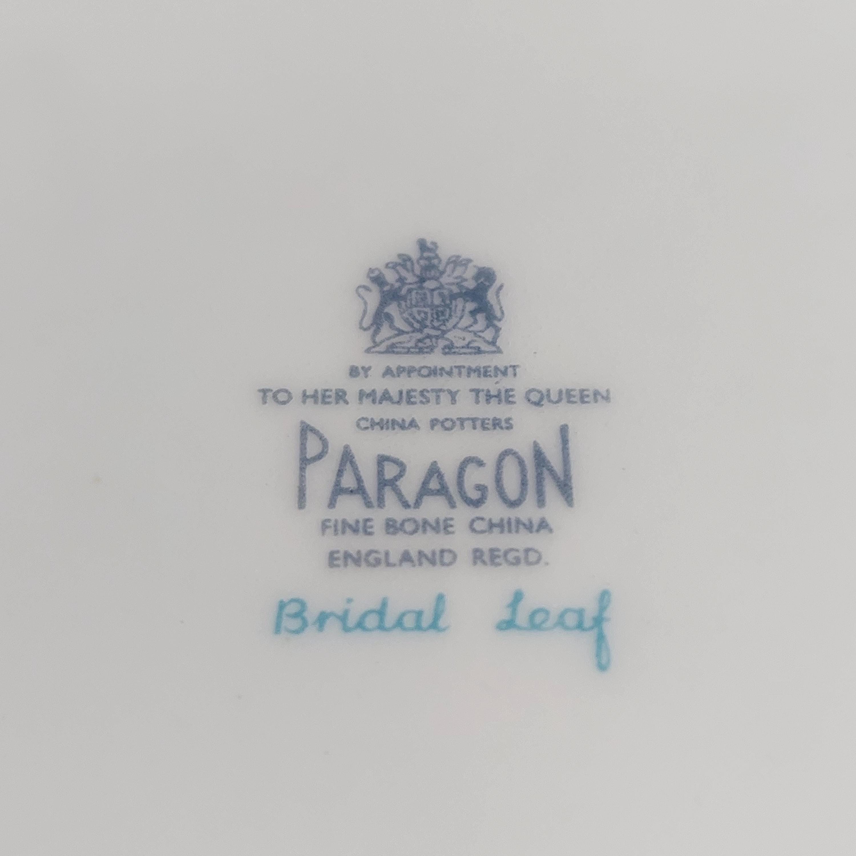 Backstamp: "By Appointment To Her Majesty The Queen China Potters - Paragon - Fine Bone China England Regd - Bridal Leaf"