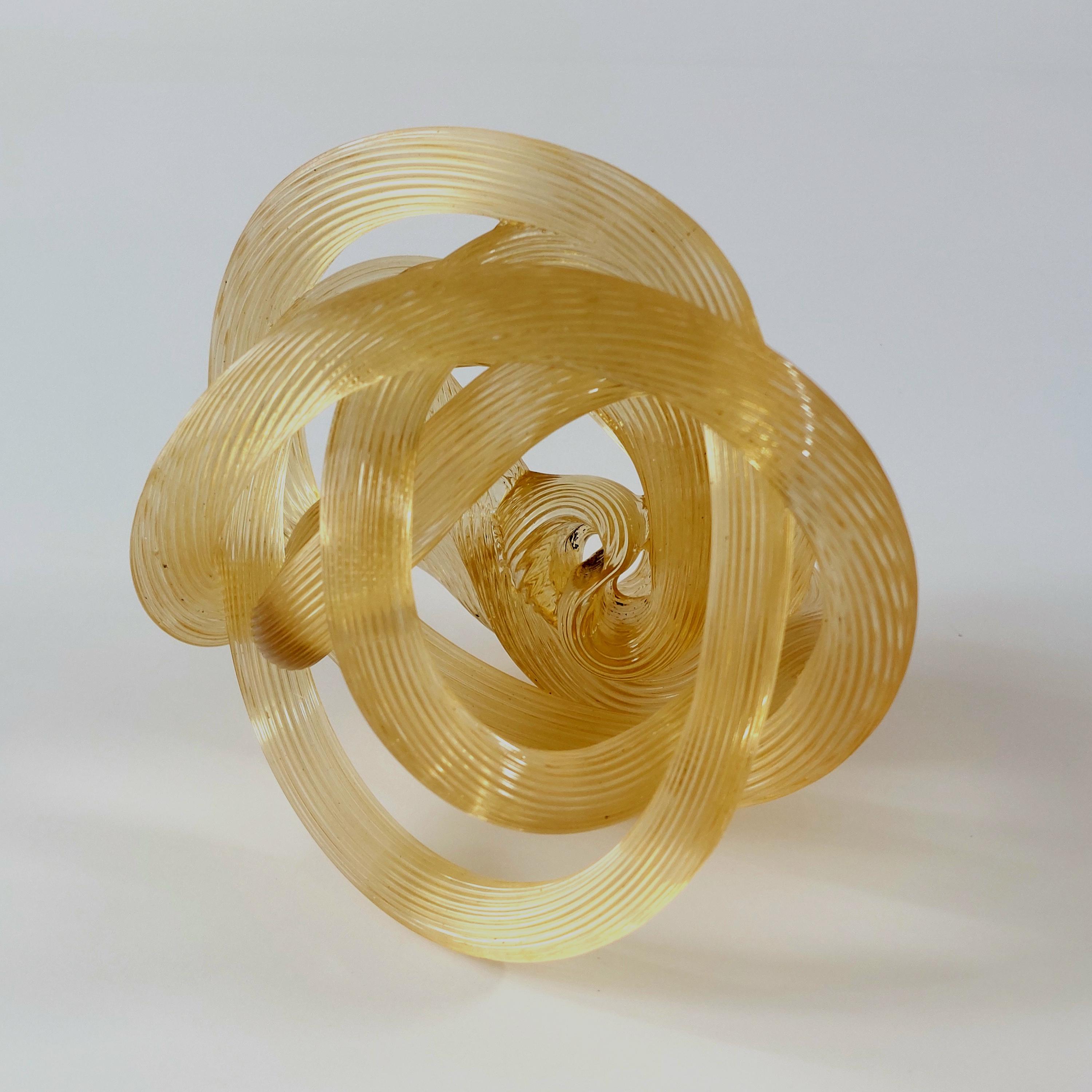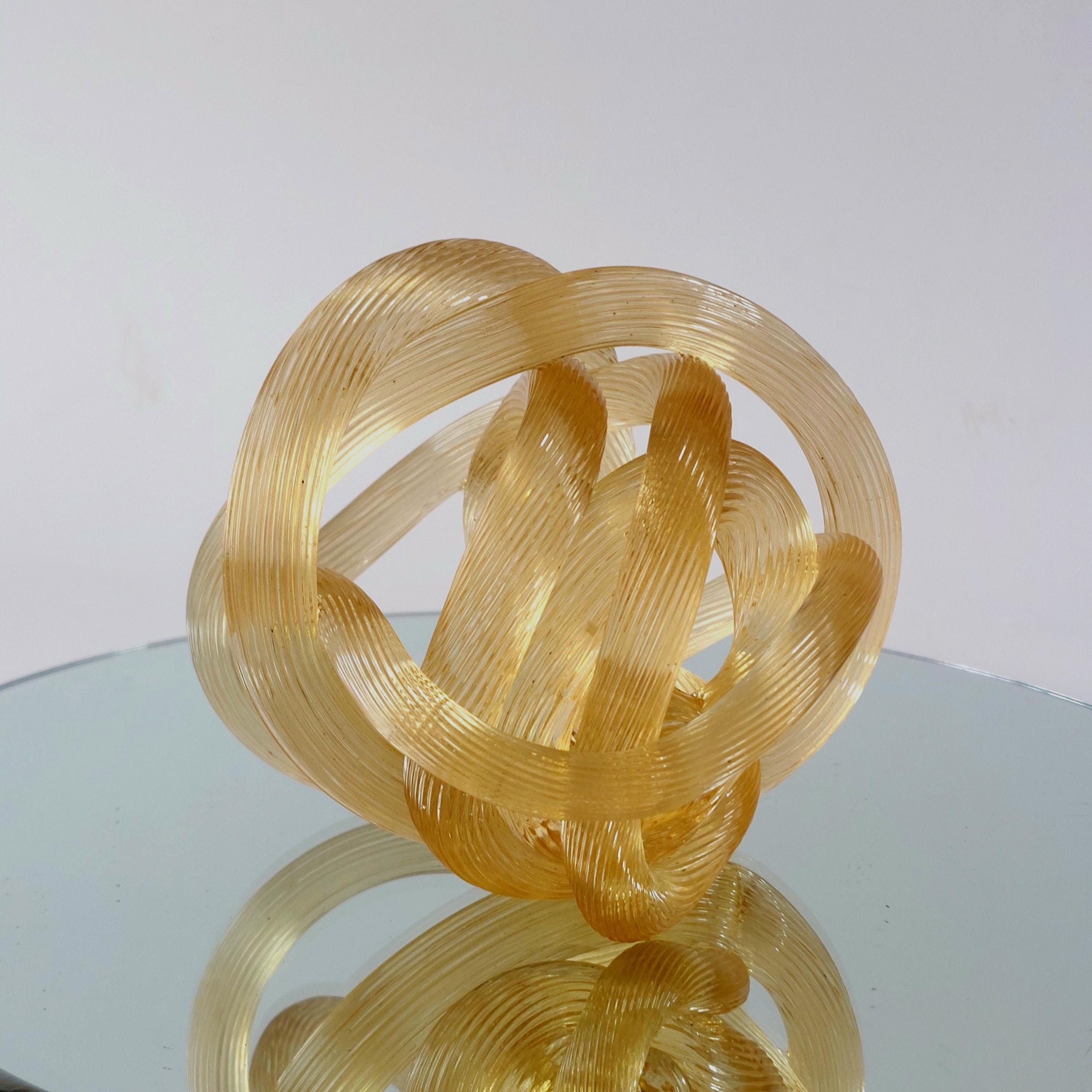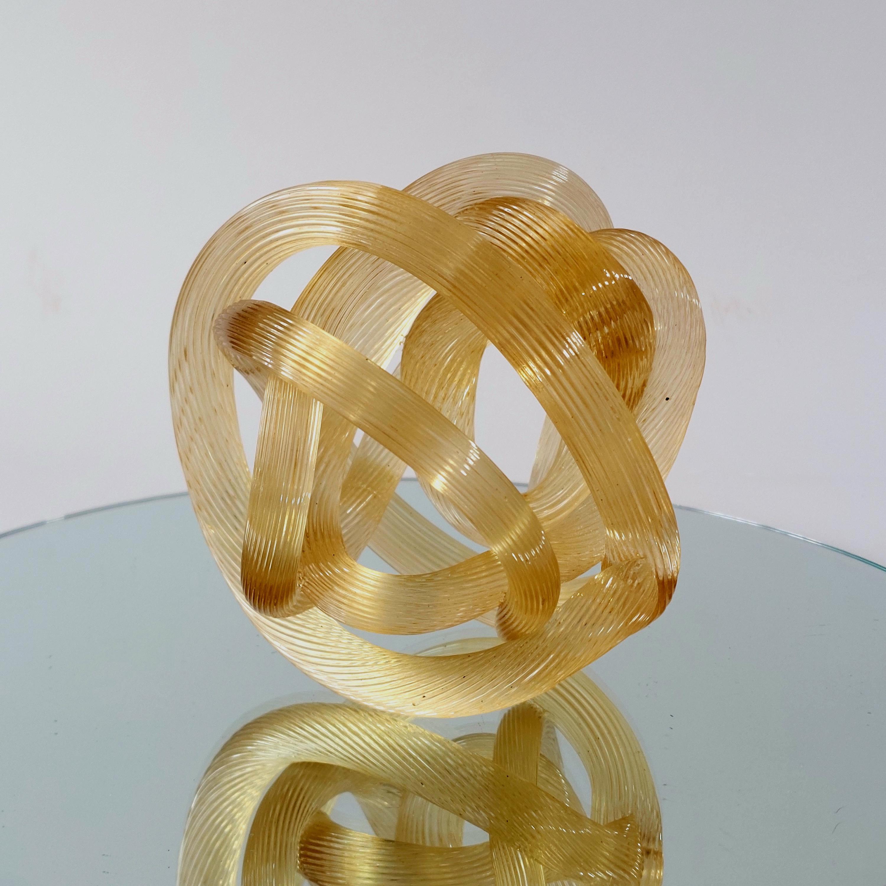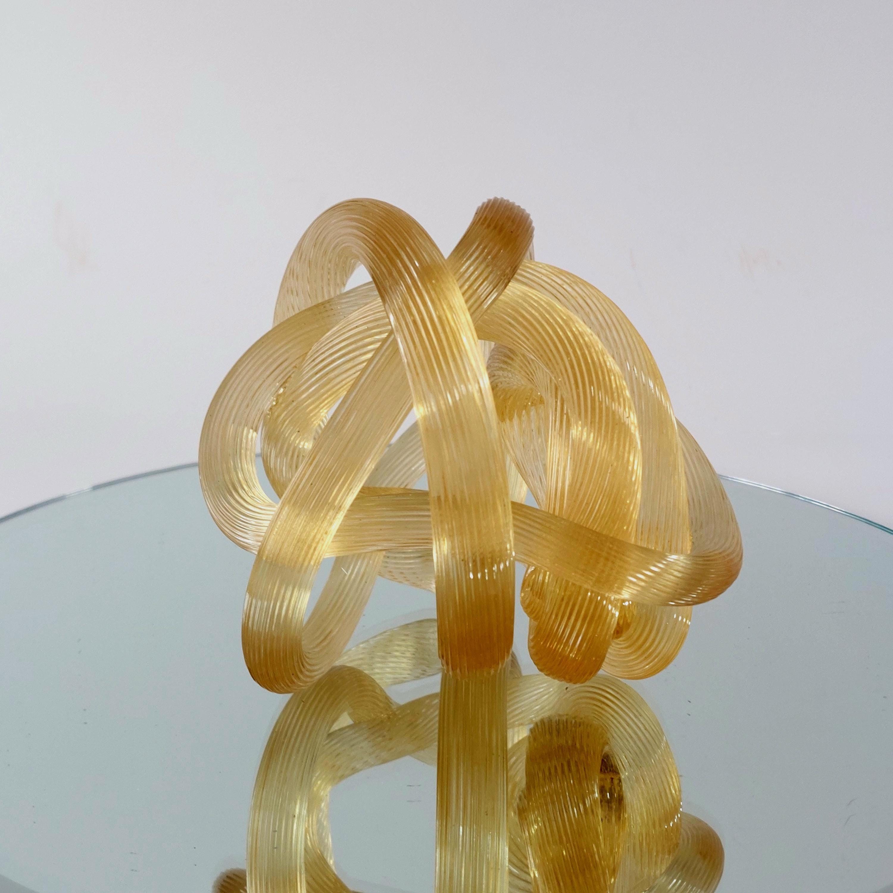 Bring a touch of Italian-inspired elegance to your home with this stunning hand-blown amber glass know sclupture. Designed in the iconic Murano tradition, this piece features a series of intricate, hand=wrought 'ribbed' glass ropes meticulously twisted into a never-ending infinity knot.