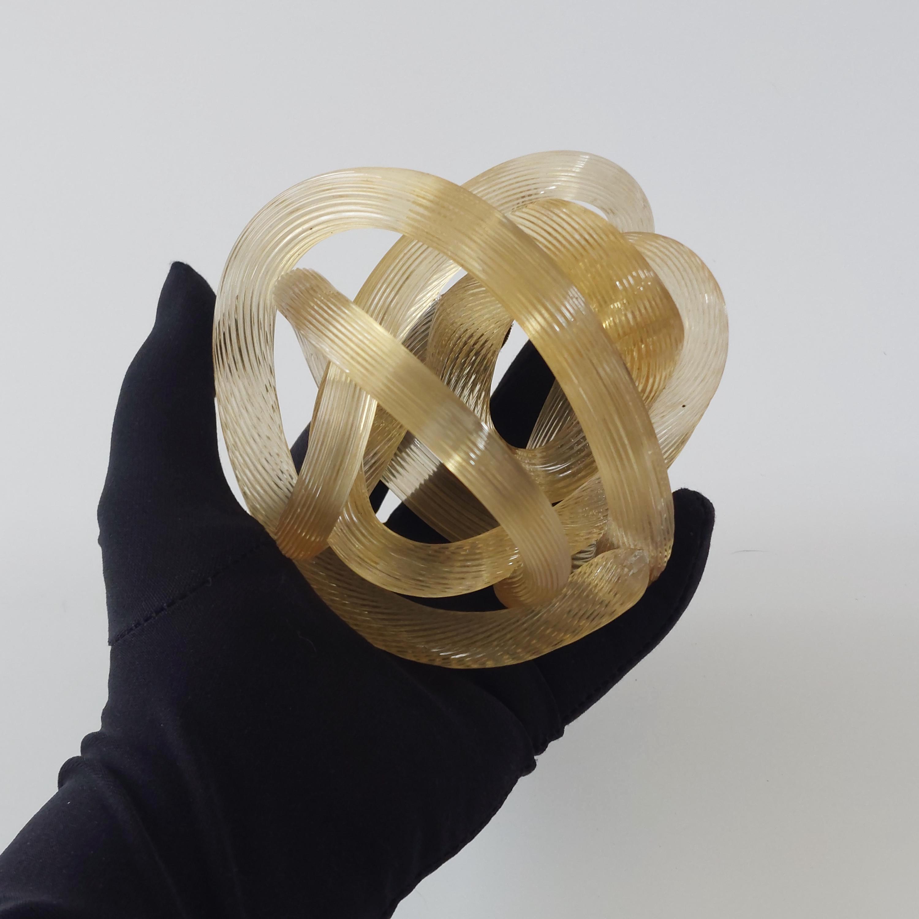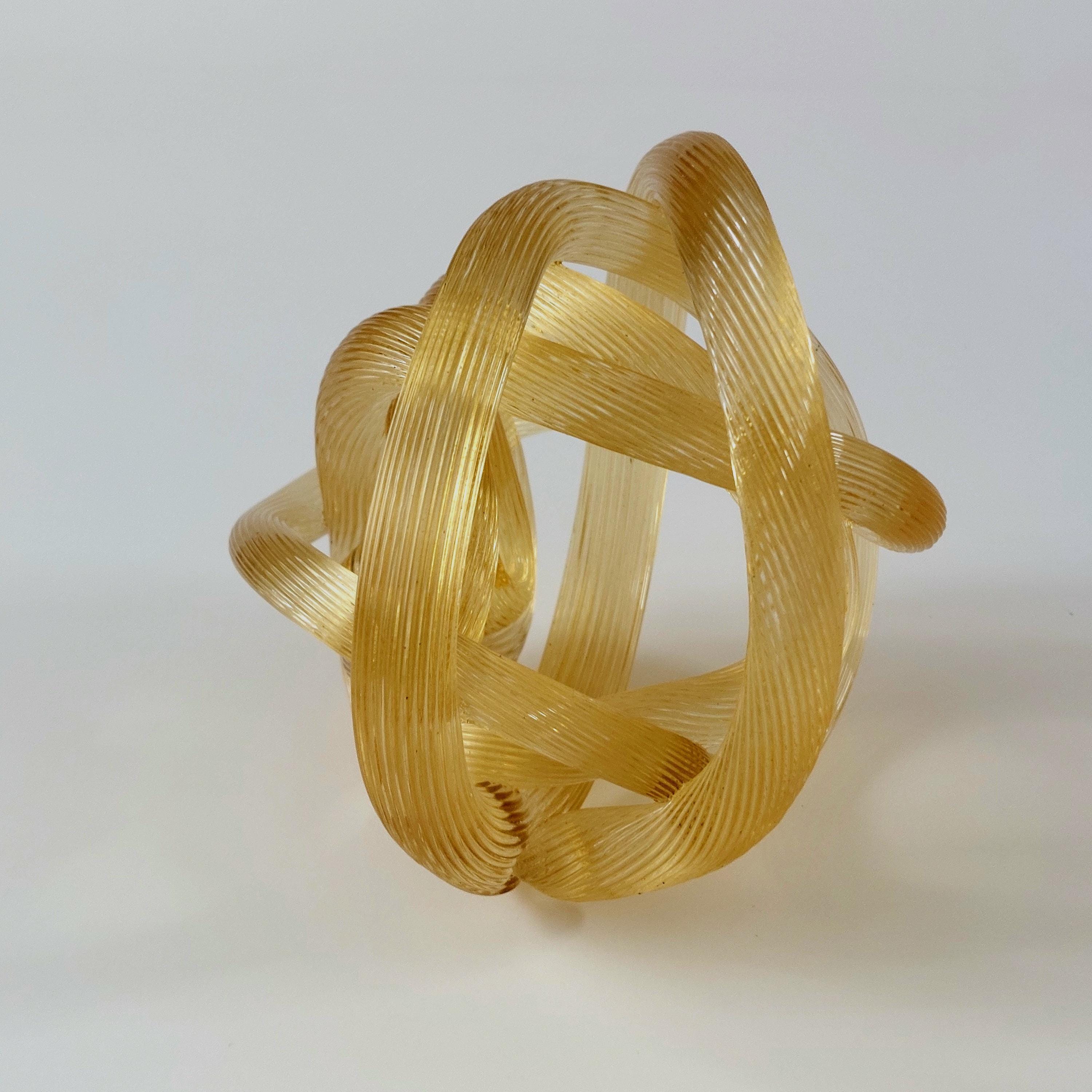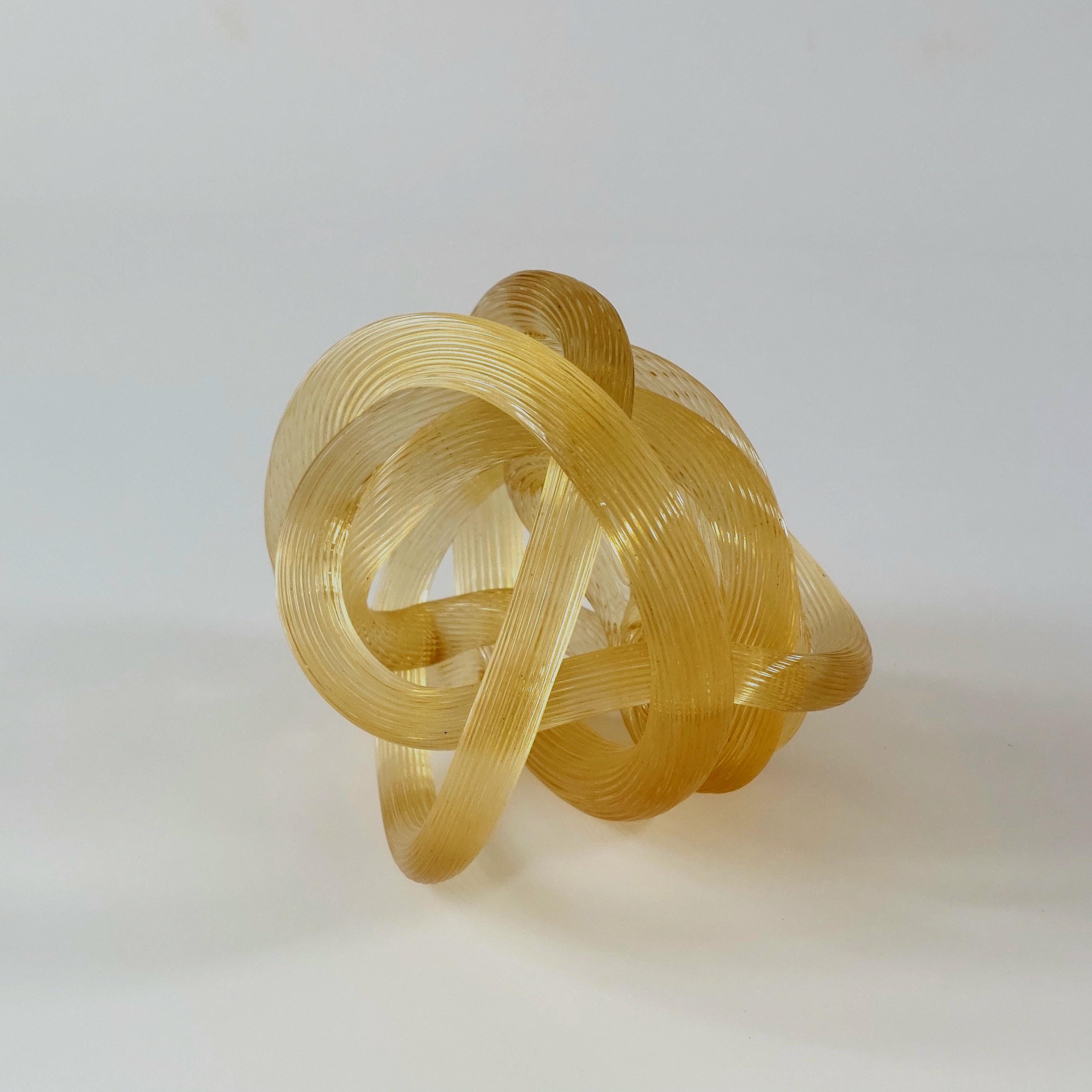 Bring a touch of Italian-inspired elegance to your home with this stunning hand-blown amber glass know sclupture. Designed in the iconic Murano tradition, this piece features a series of intricate, hand=wrought 'ribbed' glass ropes meticulously twisted into a never-ending infinity knot.