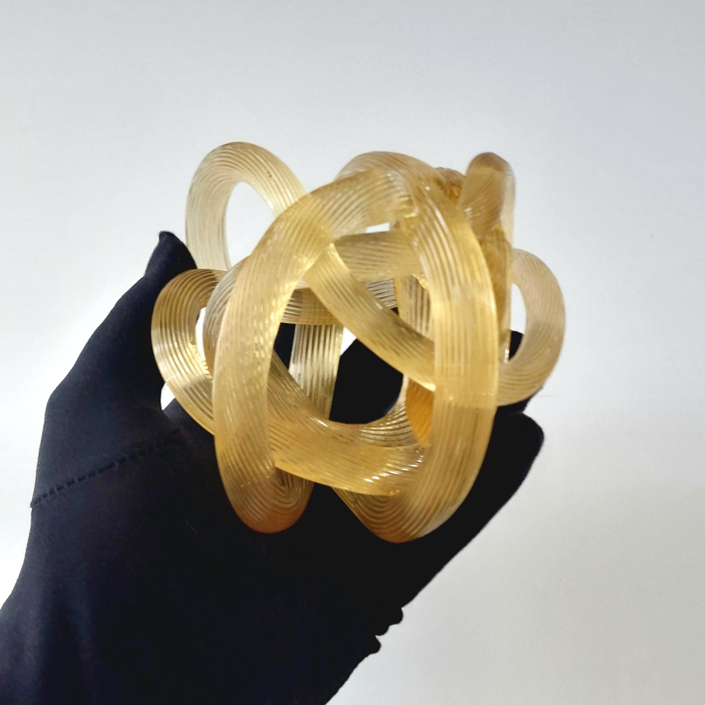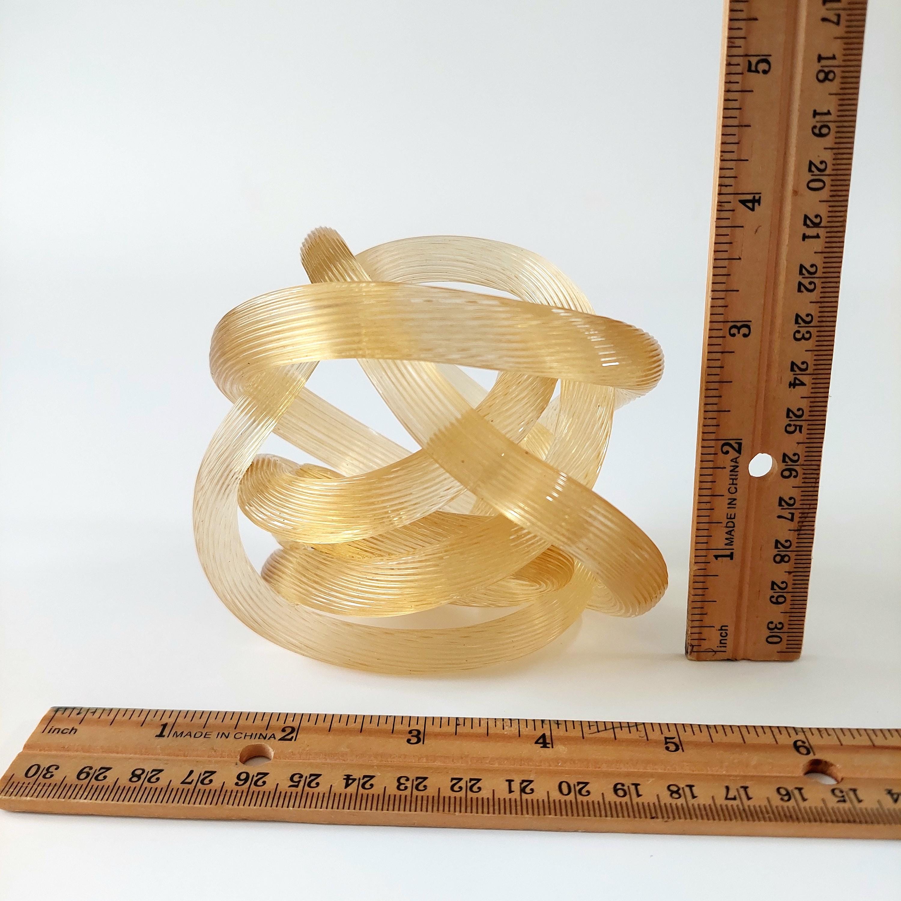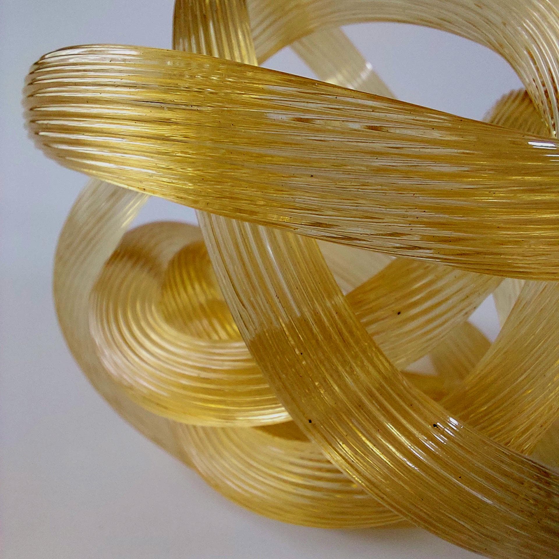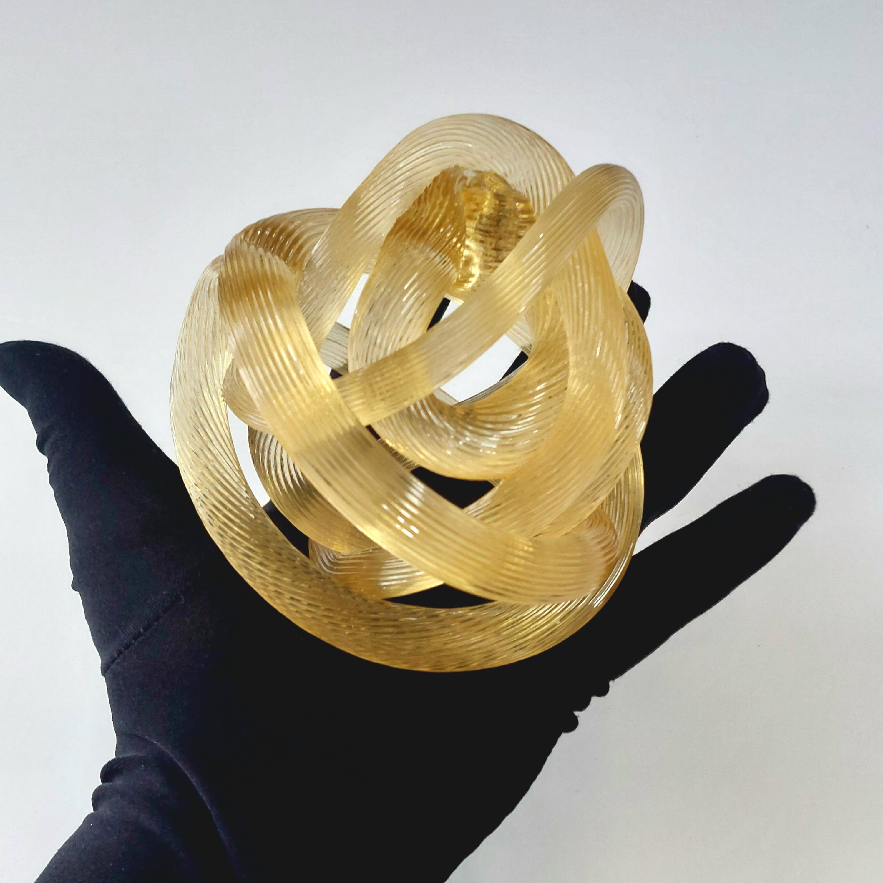 Bring a touch of Italian-inspired elegance to your home with this stunning hand-blown amber glass know sclupture. Designed in the iconic Murano tradition, this piece features a series of intricate, hand=wrought 'ribbed' glass ropes meticulously twisted into a never-ending infinity knot.