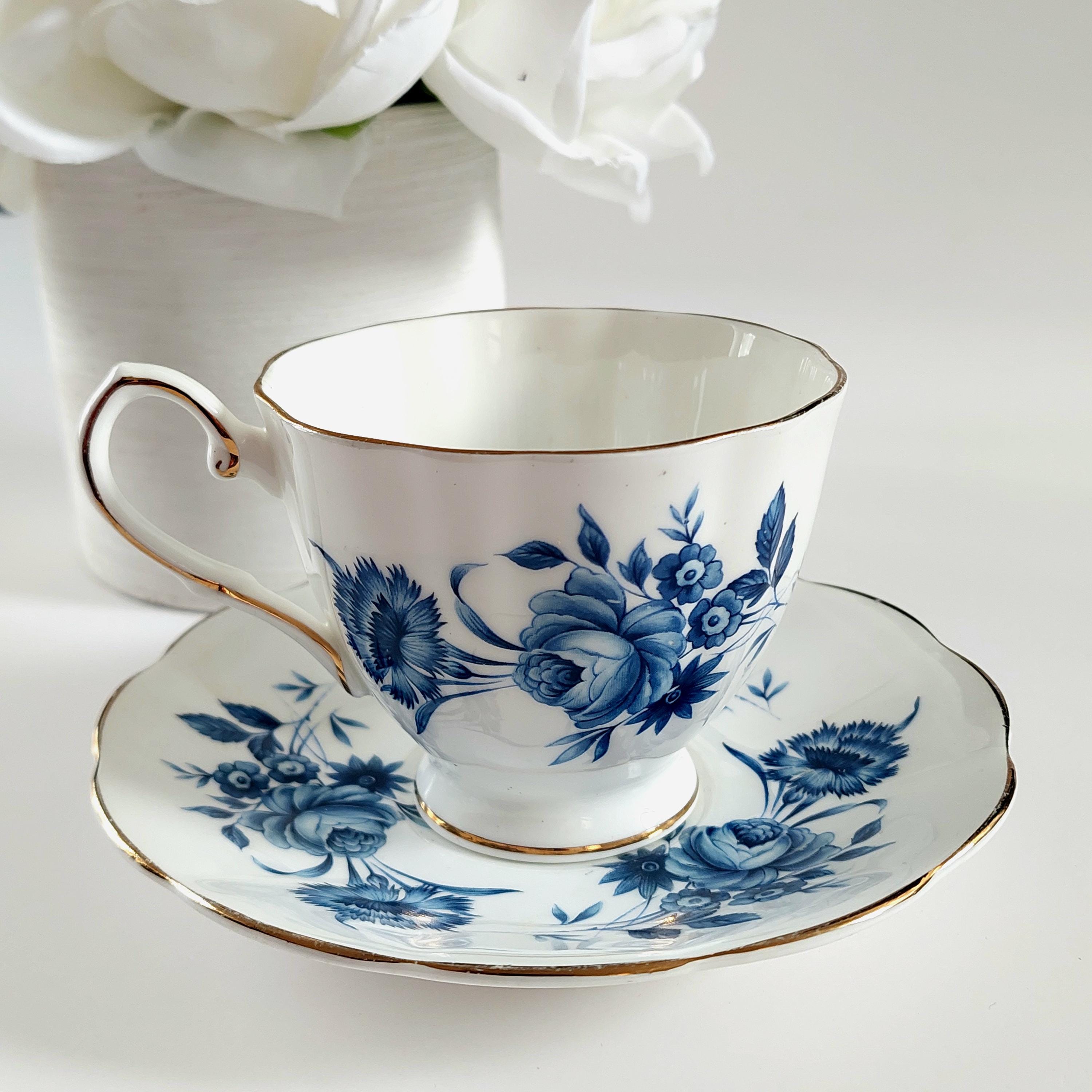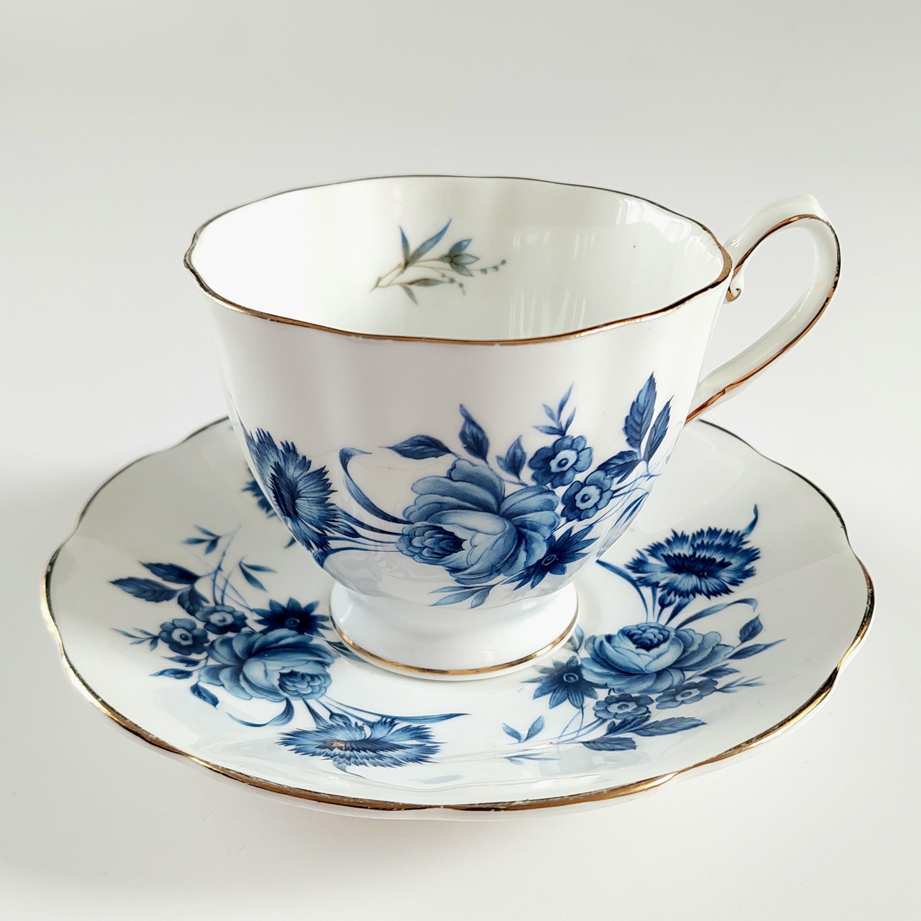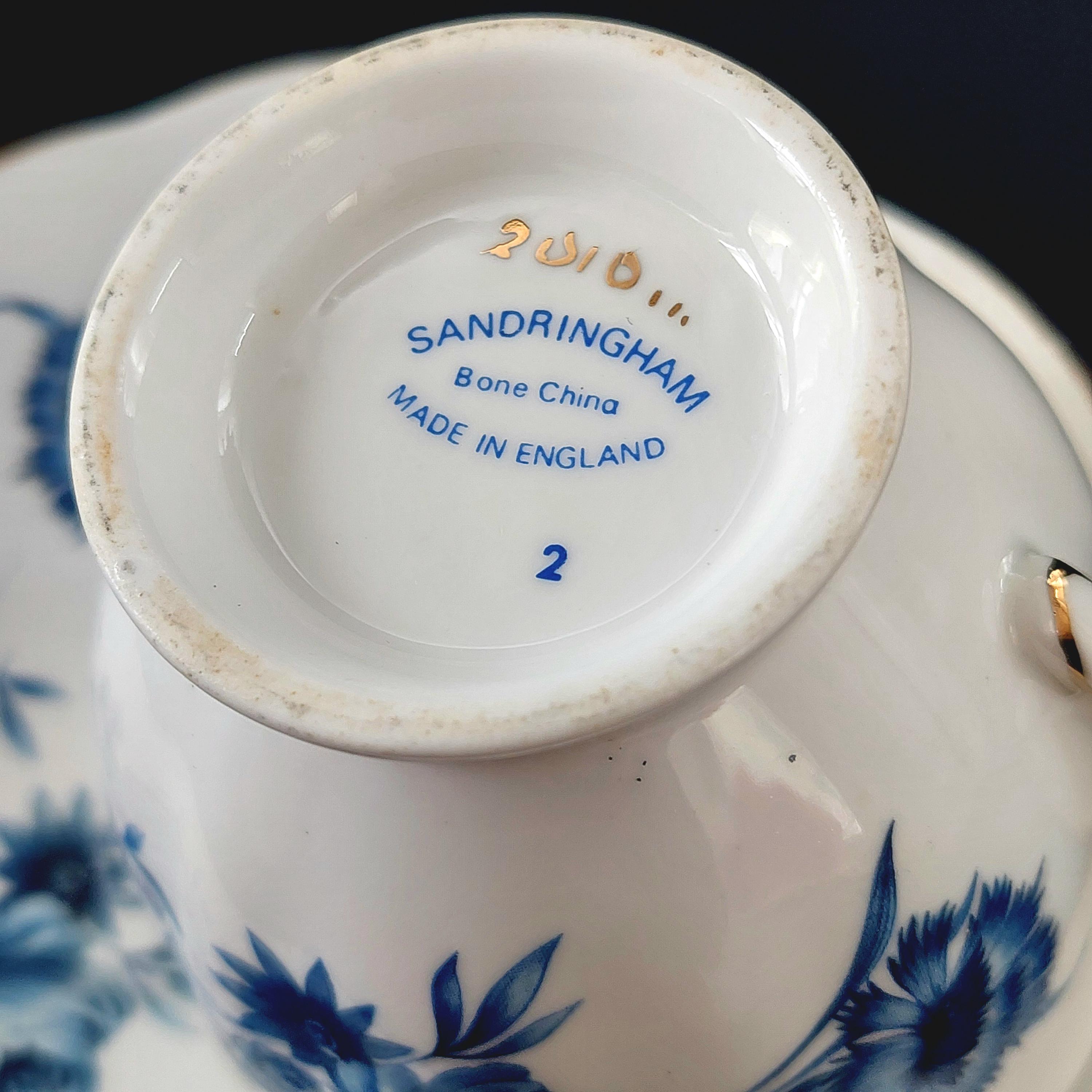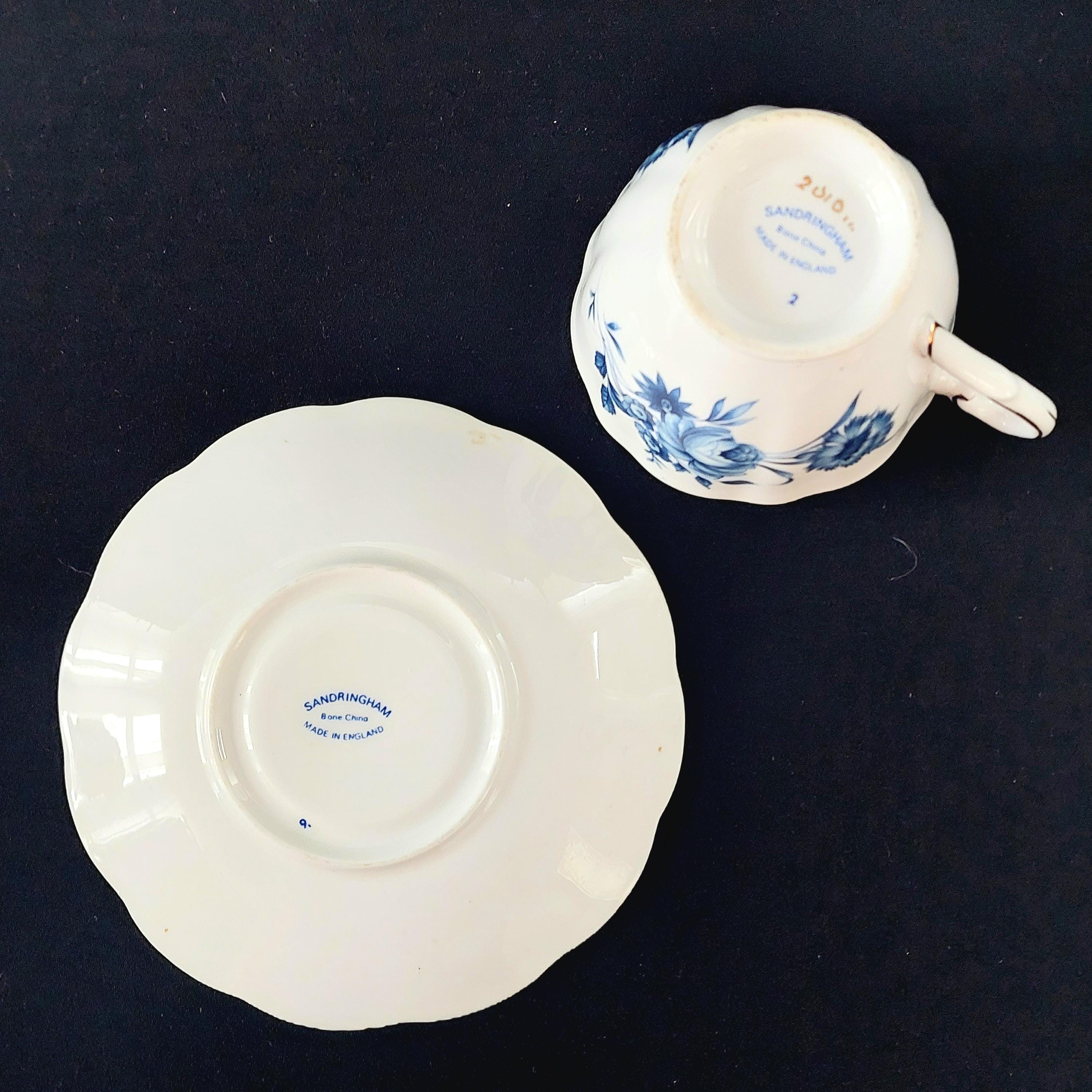 This vintage Sandringham tea cup and saucer set features a classic blue rose pattern on fine English bone china. Made in England in the 1960s, it showcases a delicate scalloped edge and hand-painted gold trim. The set is in excellent condition with no chips or cracks and only light wear to the gold. Perfect for collectors or those seeking authentic vintage English bone china with timeless charm.