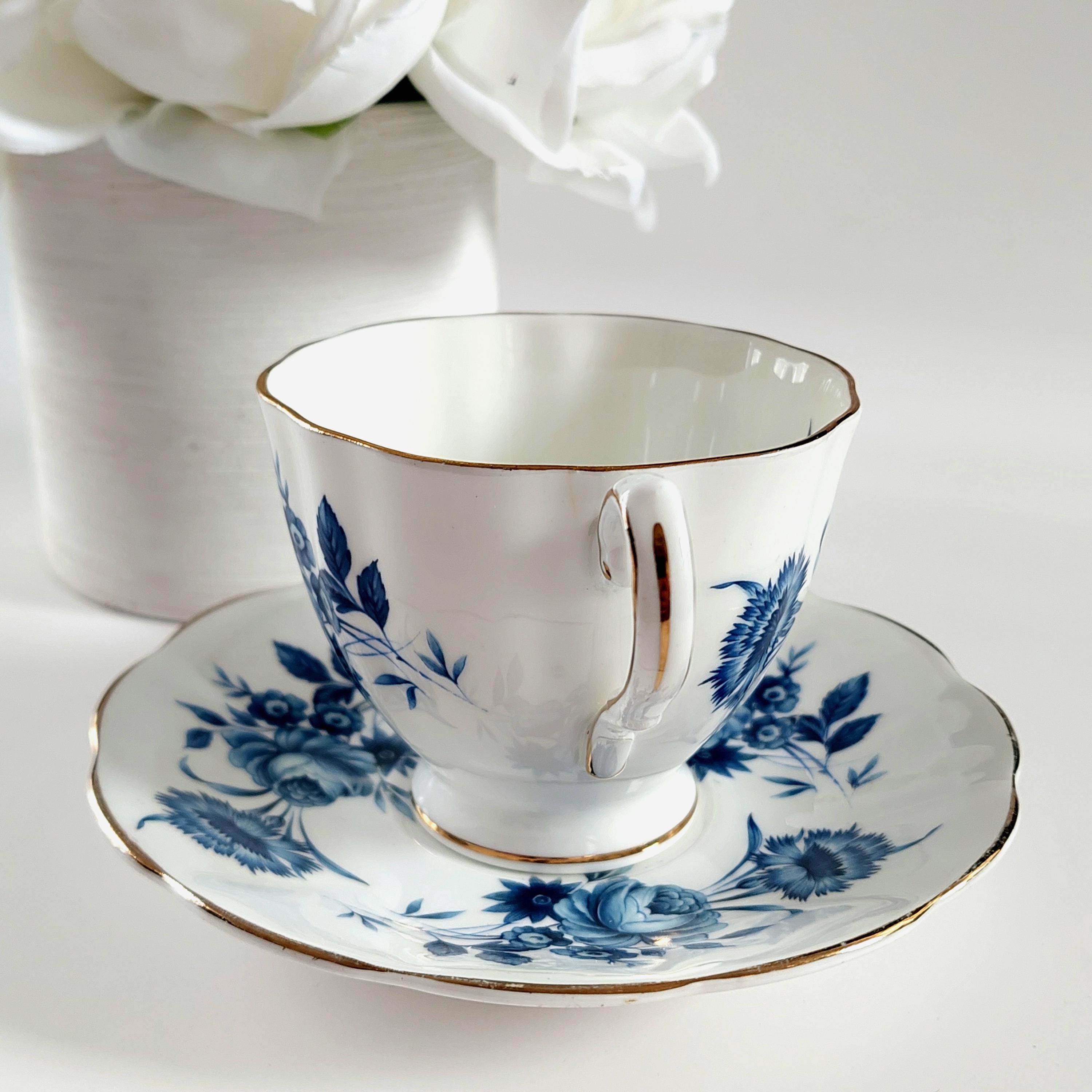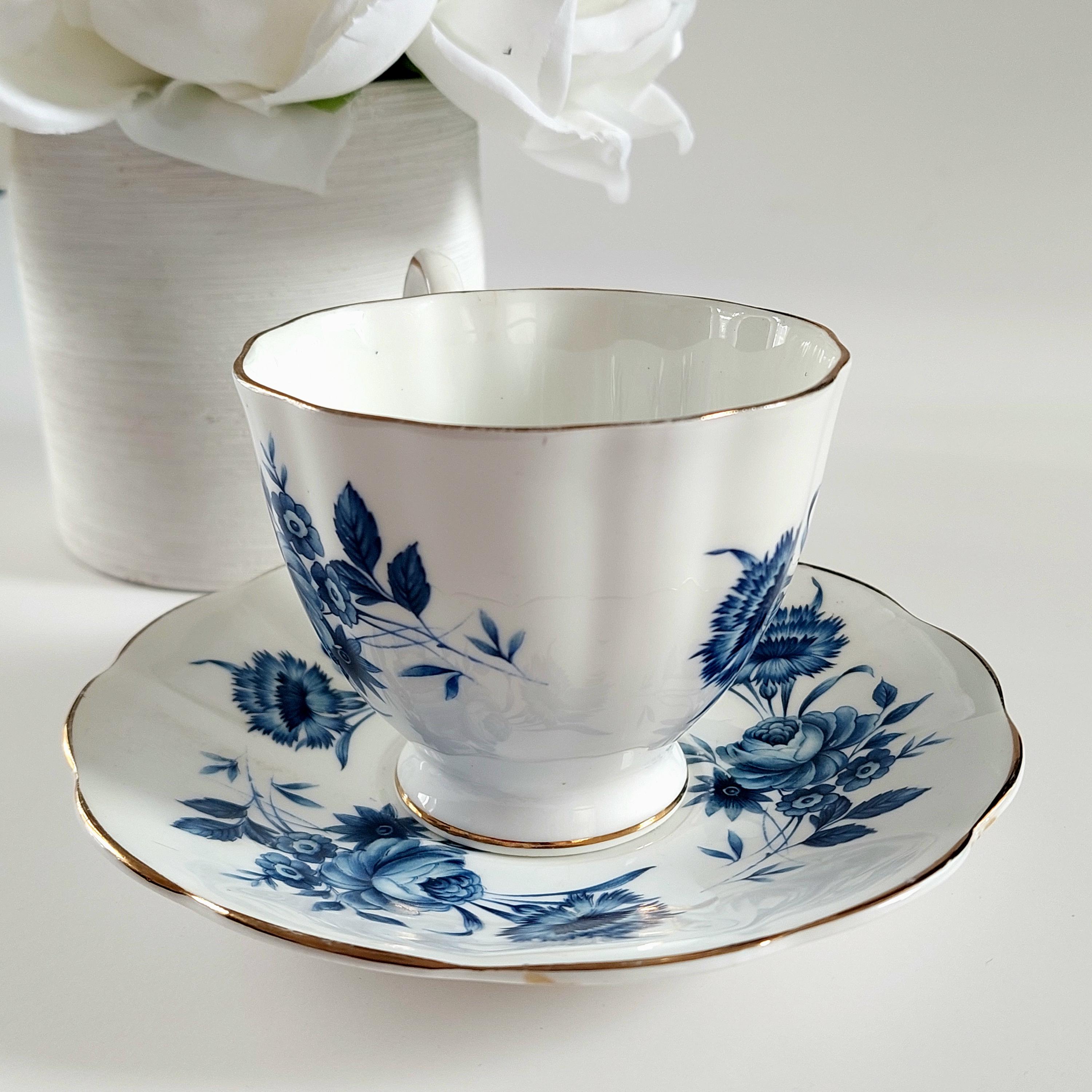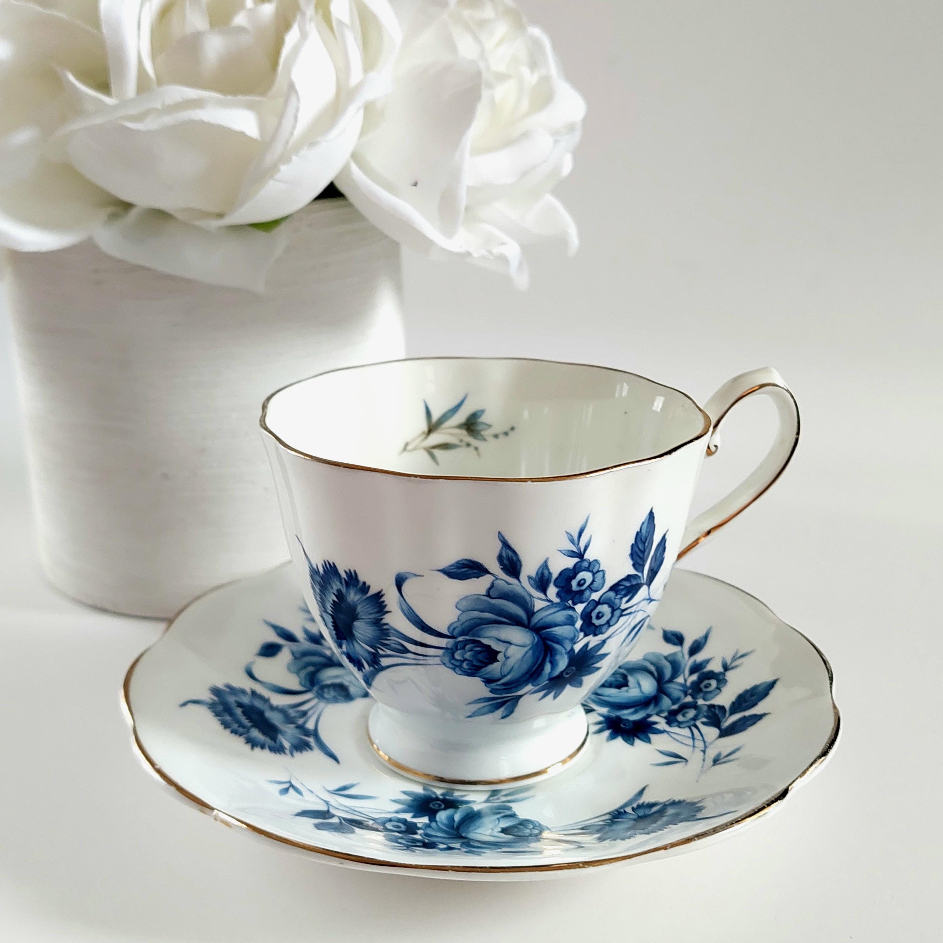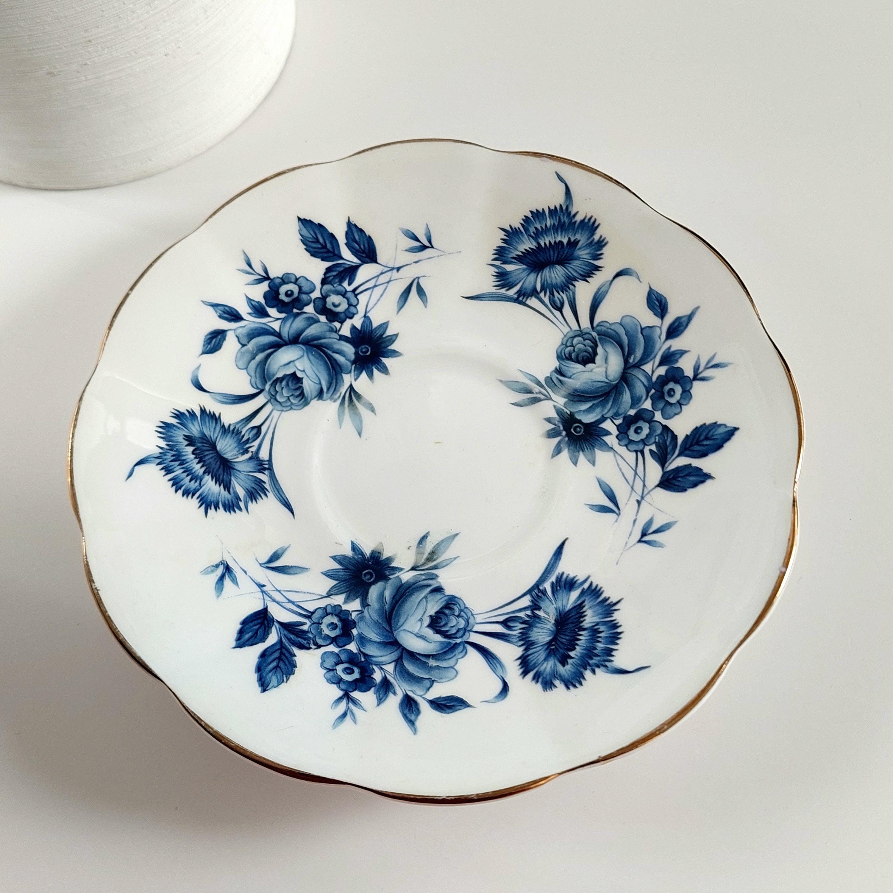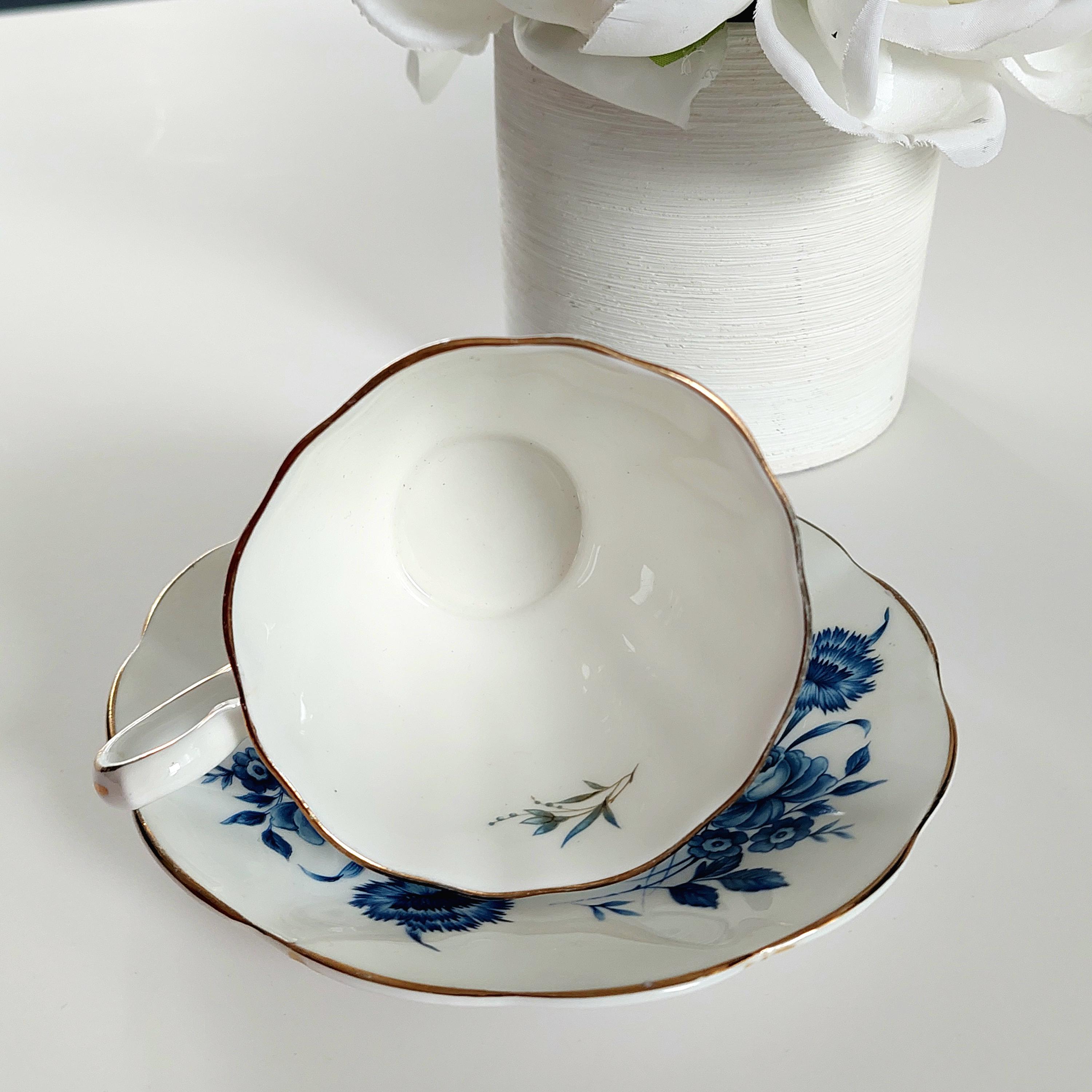 This vintage Sandringham tea cup and saucer set features a classic blue rose pattern on fine English bone china. Made in England in the 1960s, it showcases a delicate scalloped edge and hand-painted gold trim. The set is in excellent condition with no chips or cracks and only light wear to the gold. Perfect for collectors or those seeking authentic vintage English bone china with timeless charm.