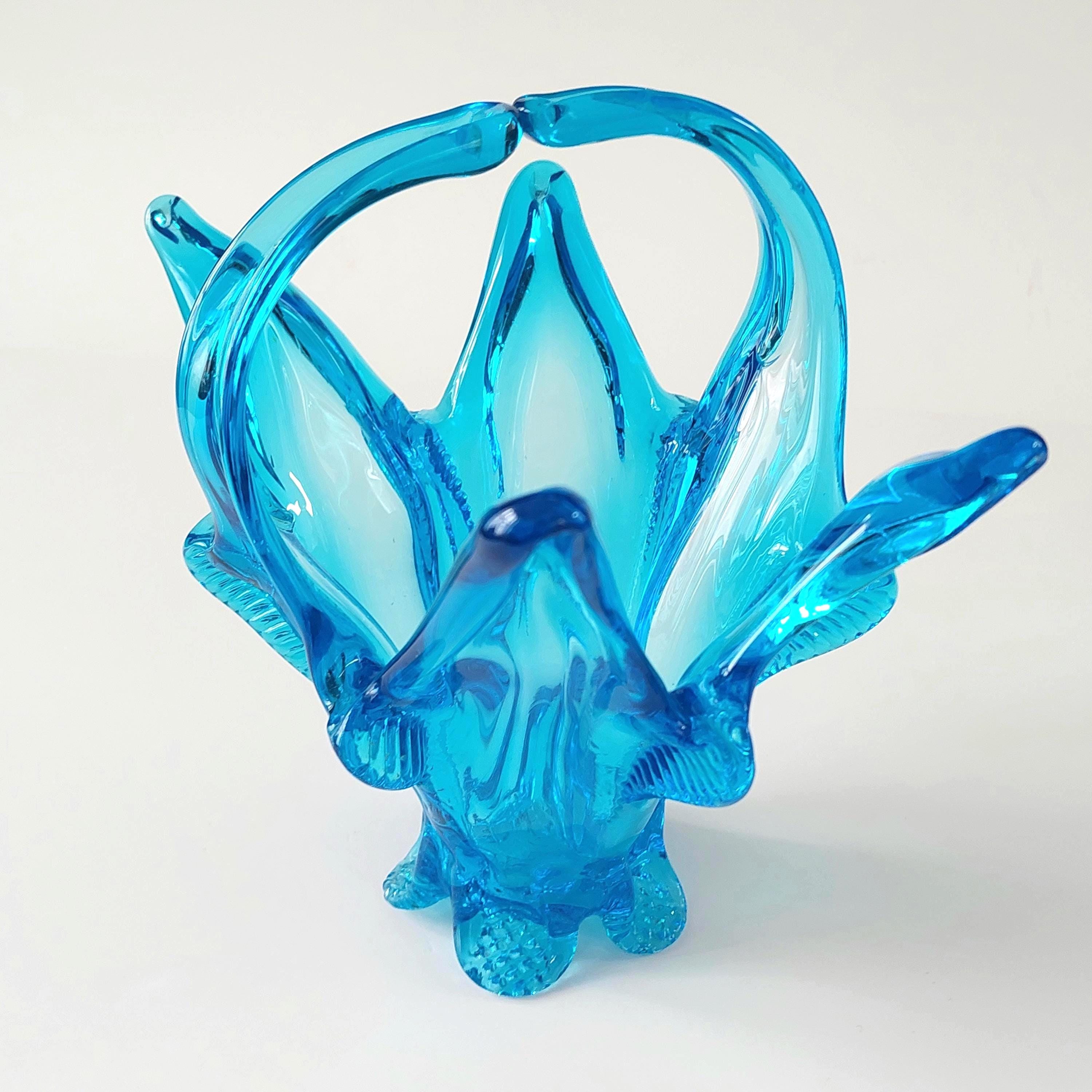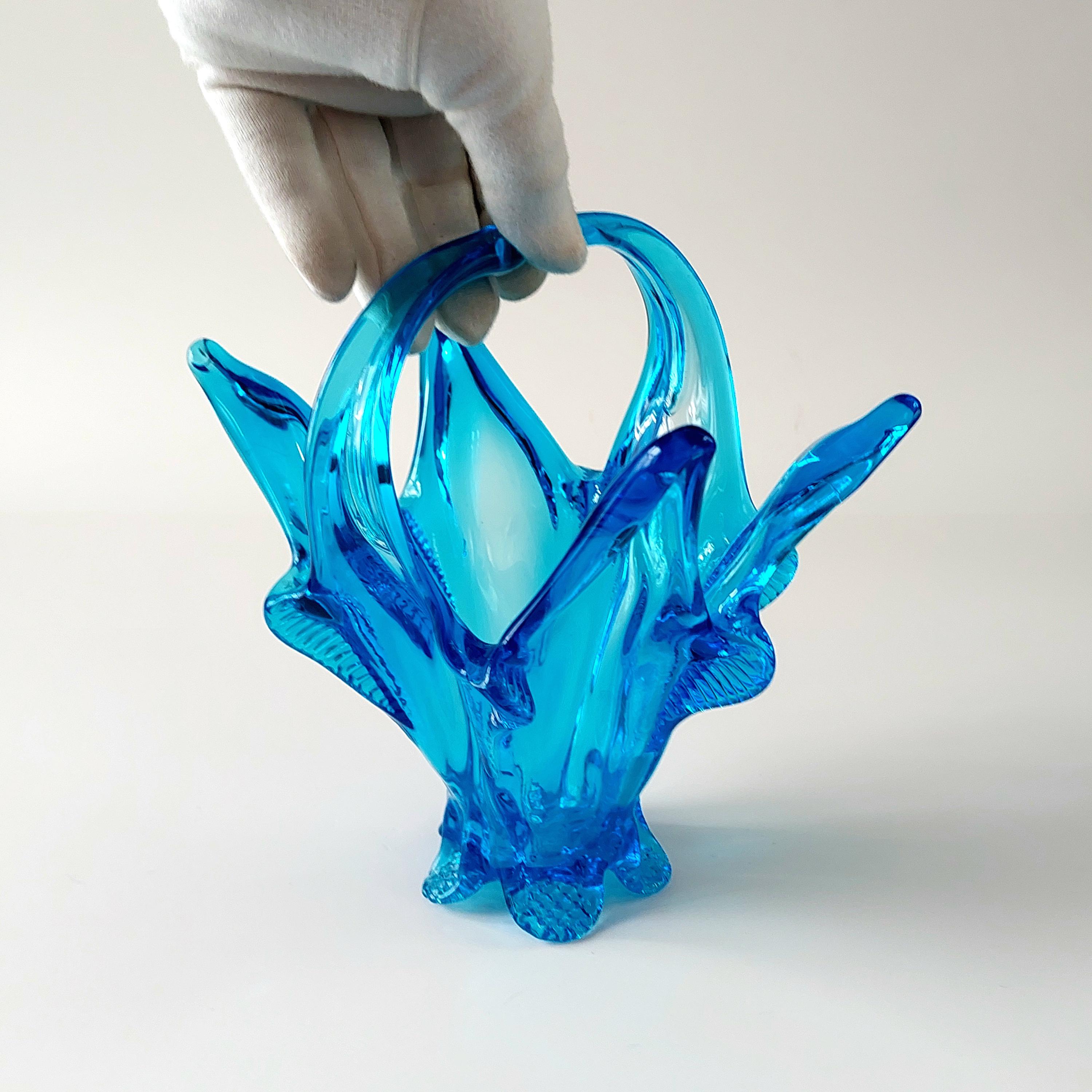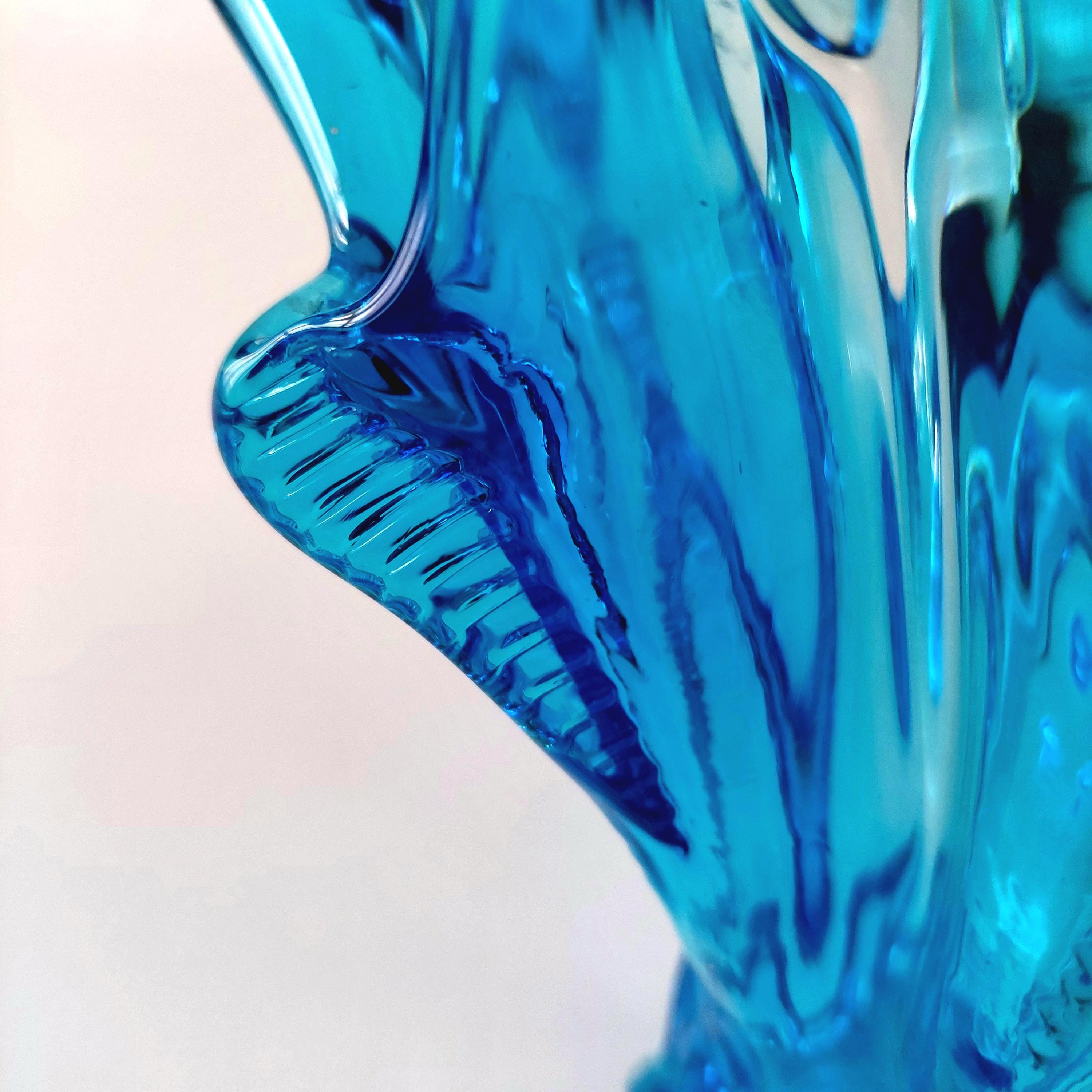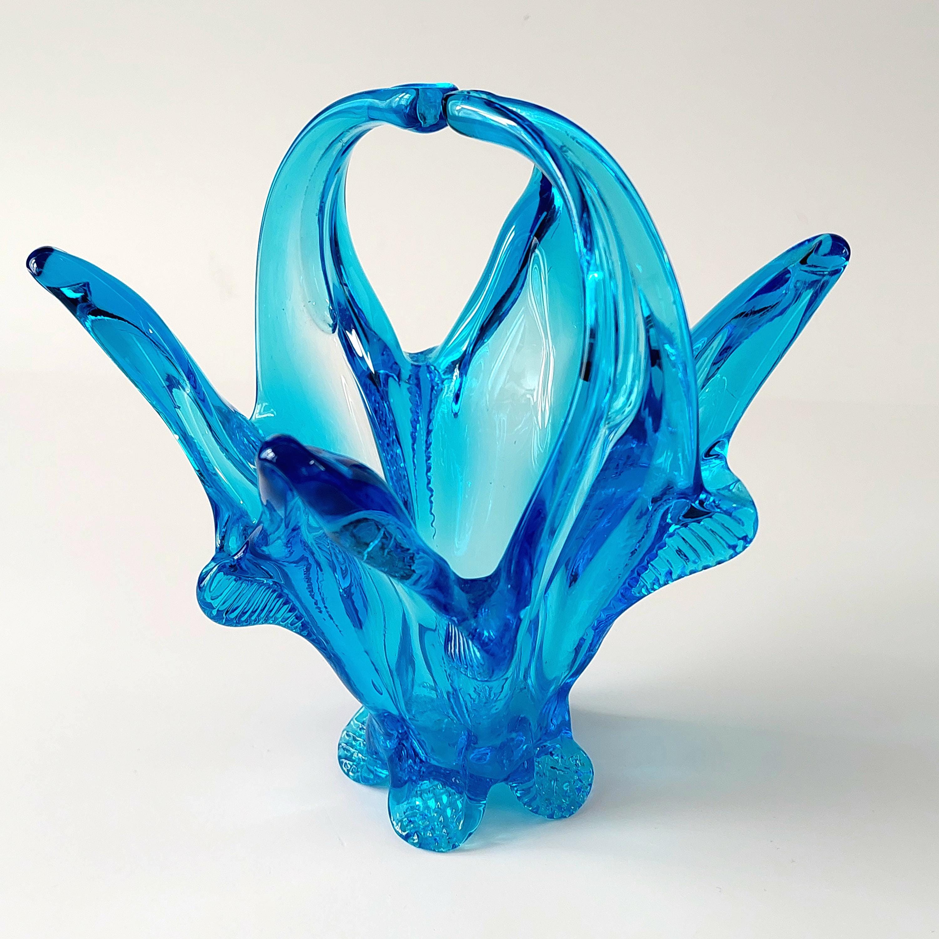 Vintage Chalet Glass Company Canada light blue freeform collectible — a true MCM hand blown art glass piece. Elegant pedestal base with distinctive split handle and sculptural form. This is a collectible art object prized by vintage glass enthusiasts for its maker provenance and mid-century modern design.