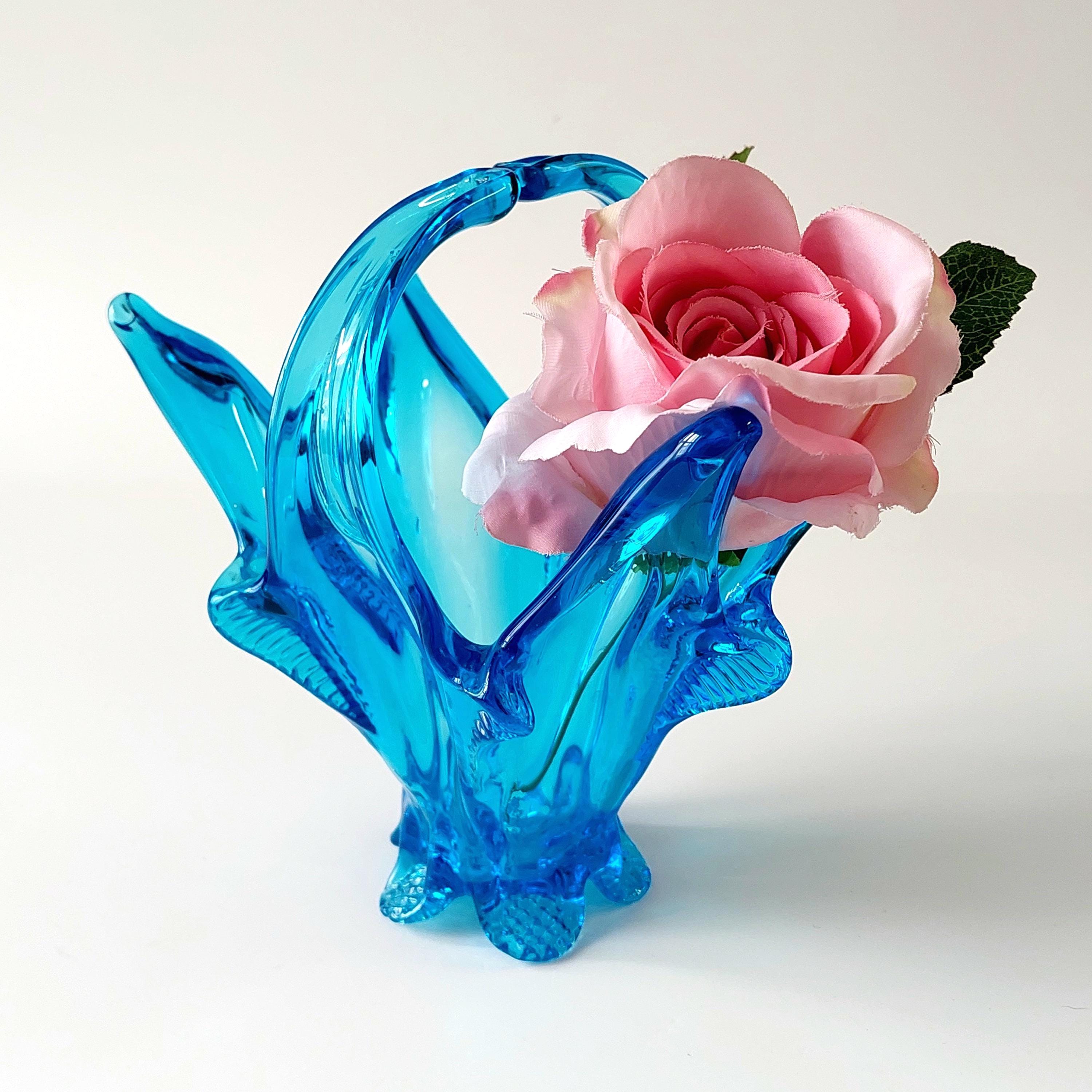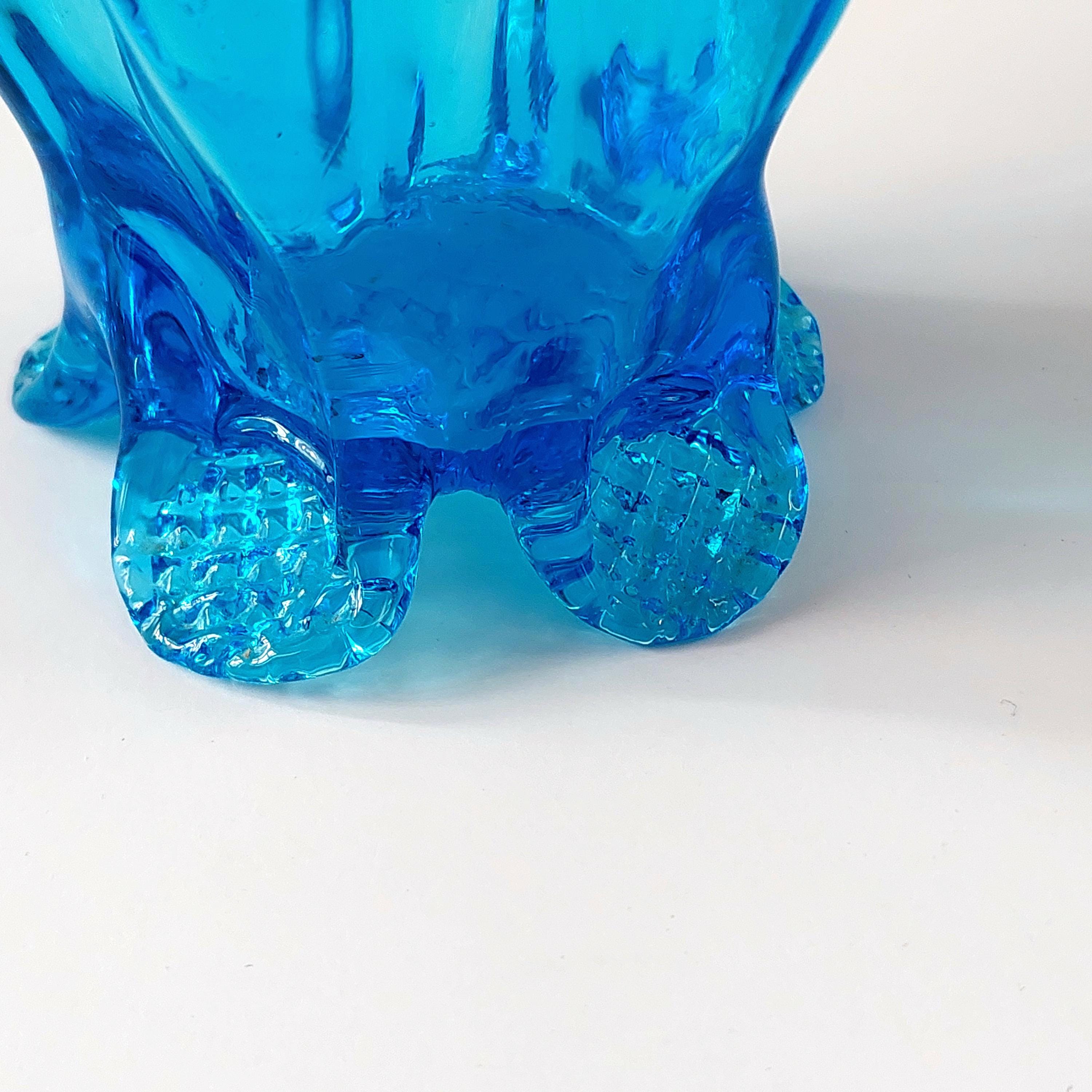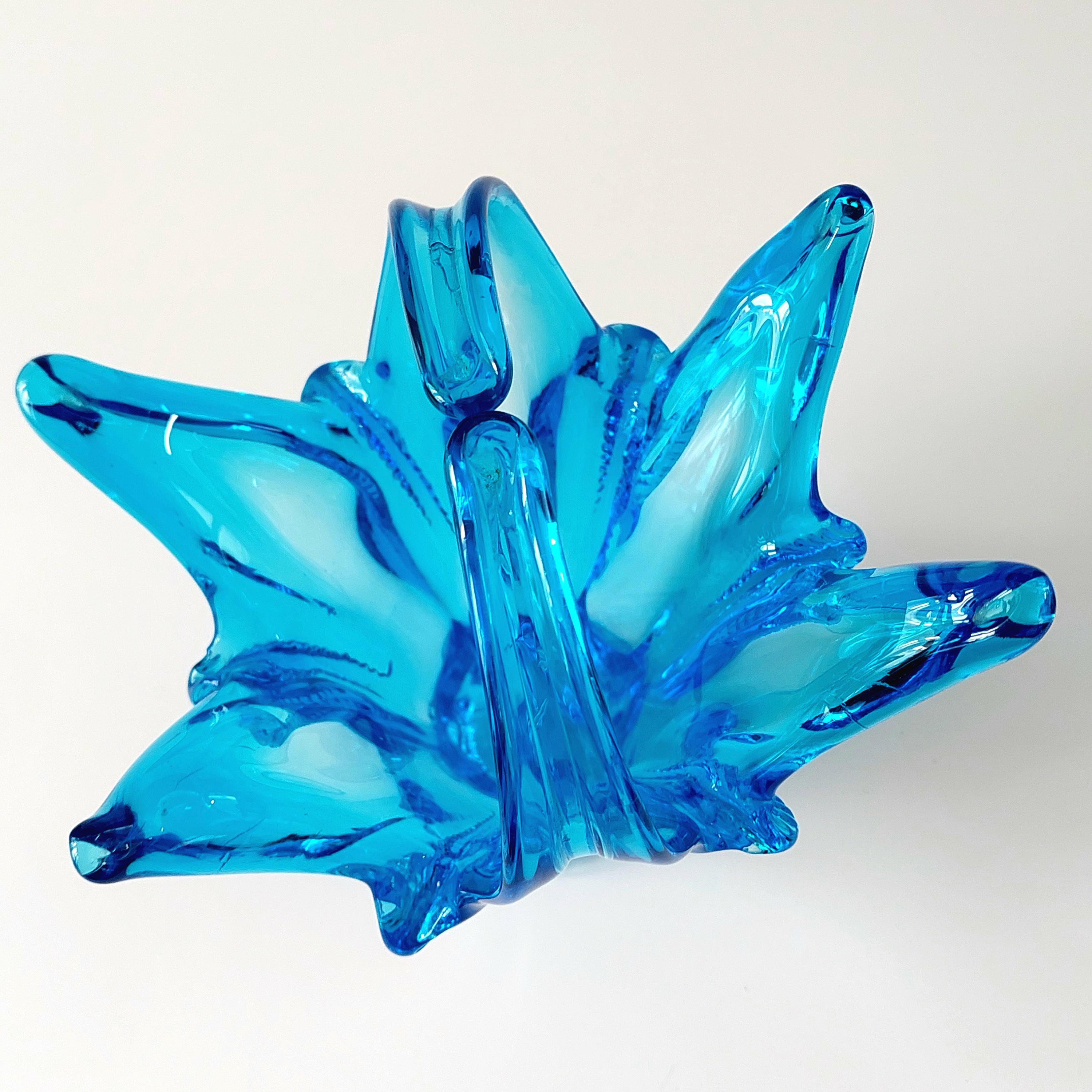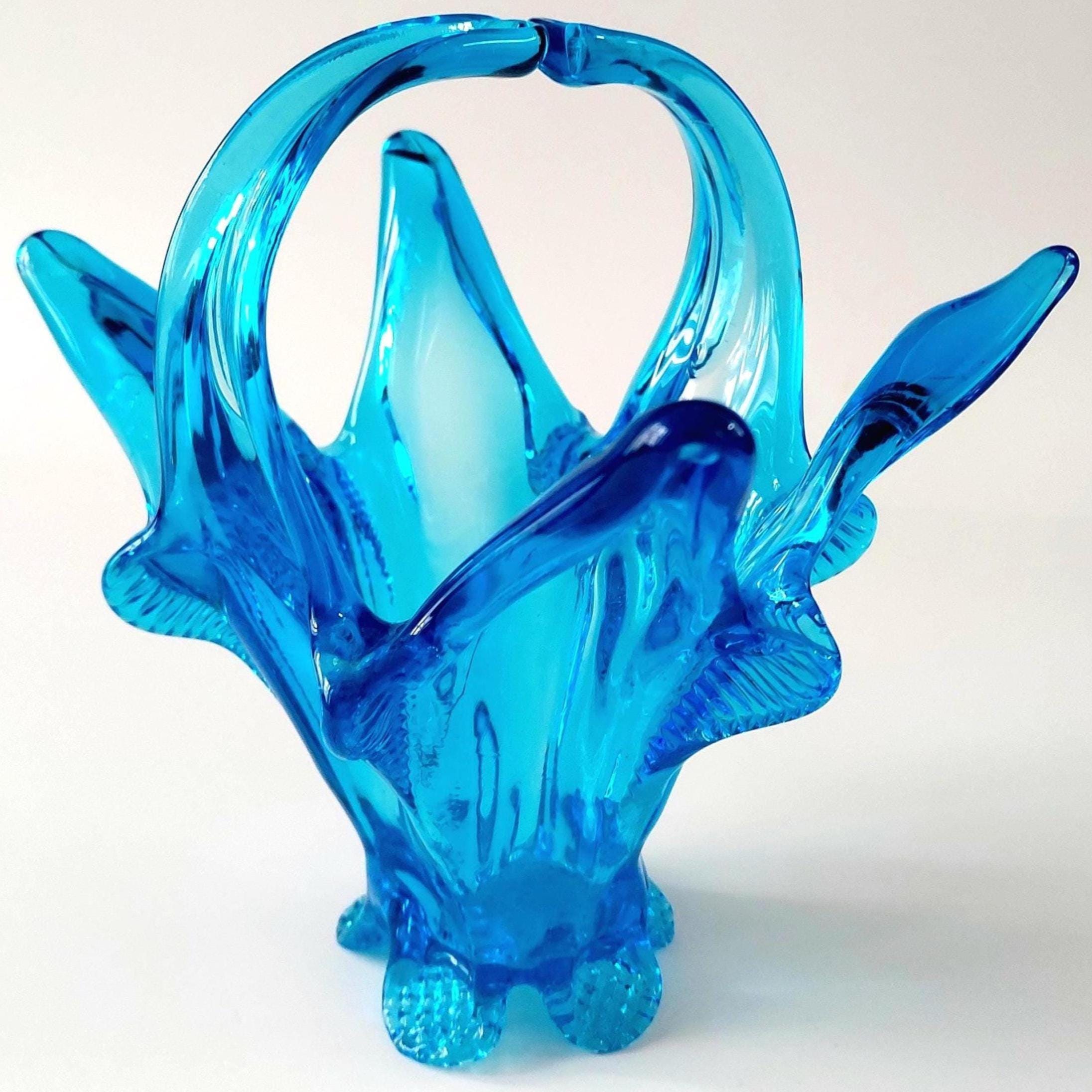 Vintage Chalet Glass Company Canada light blue freeform collectible — a true MCM hand blown art glass piece. Elegant pedestal base with distinctive split handle and sculptural form. This is a collectible art object prized by vintage glass enthusiasts for its maker provenance and mid-century modern design.
