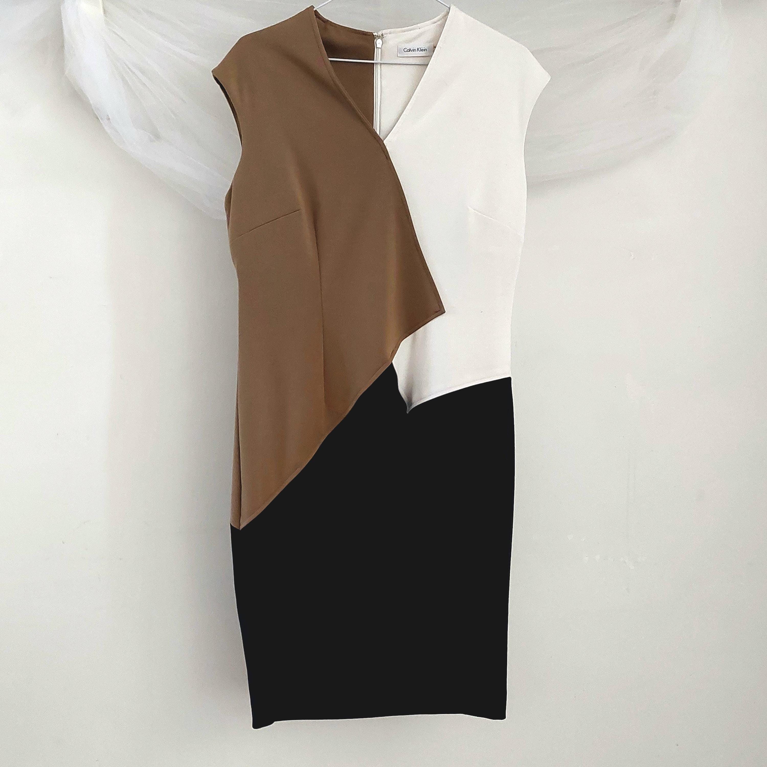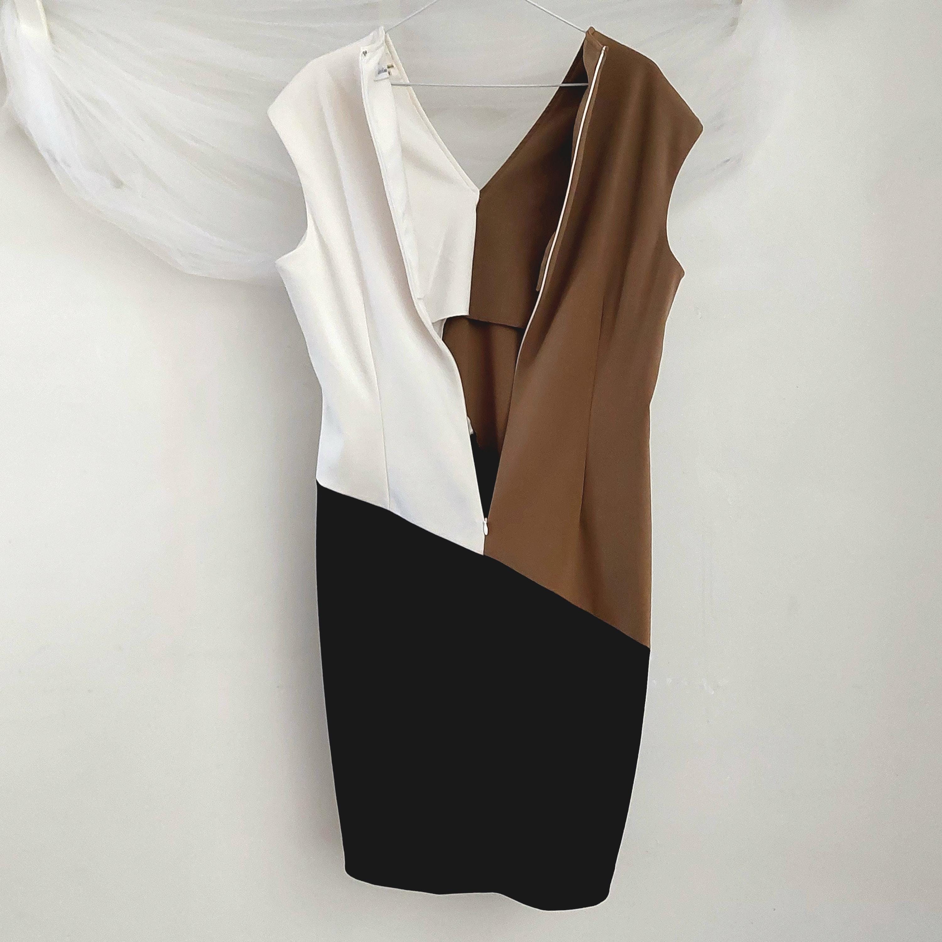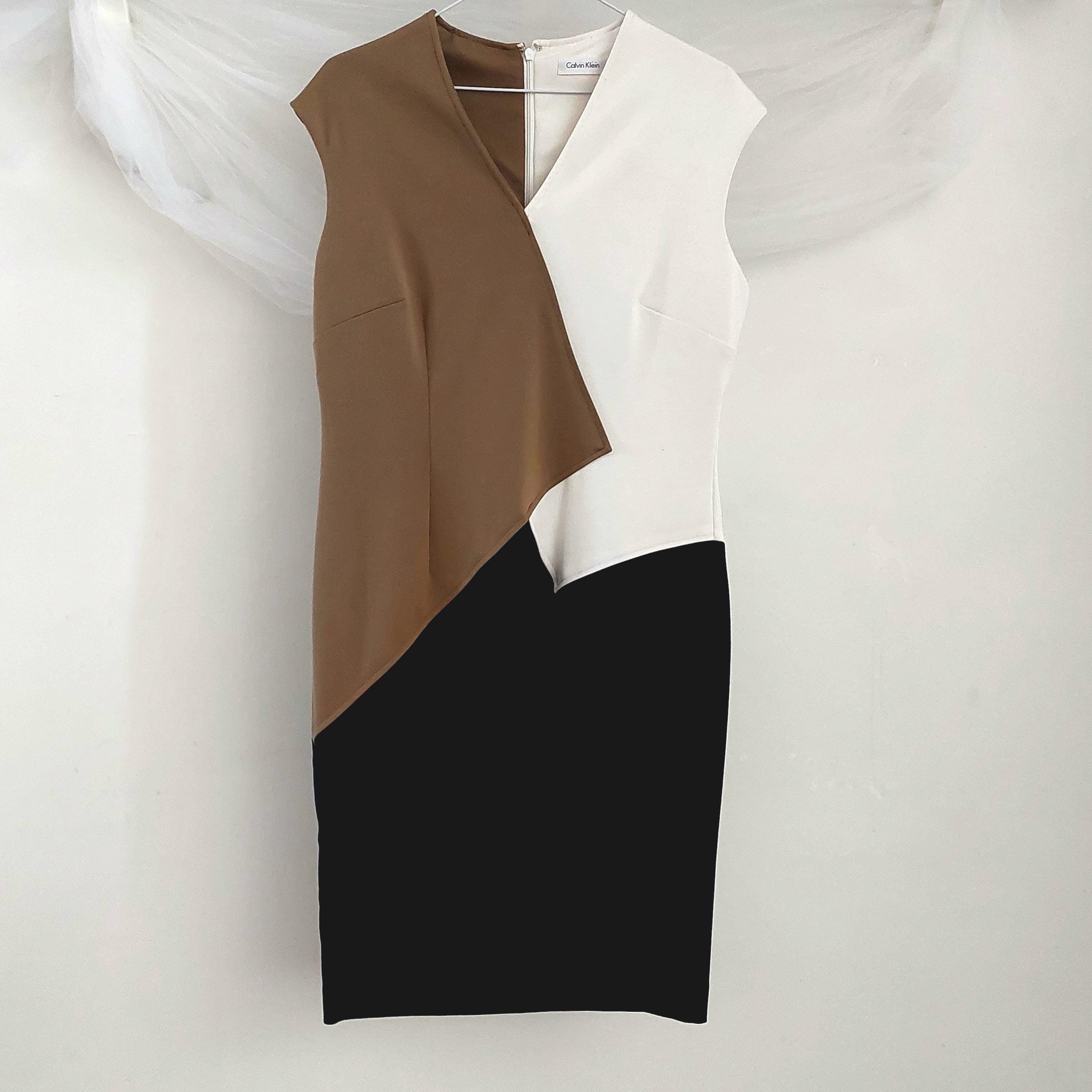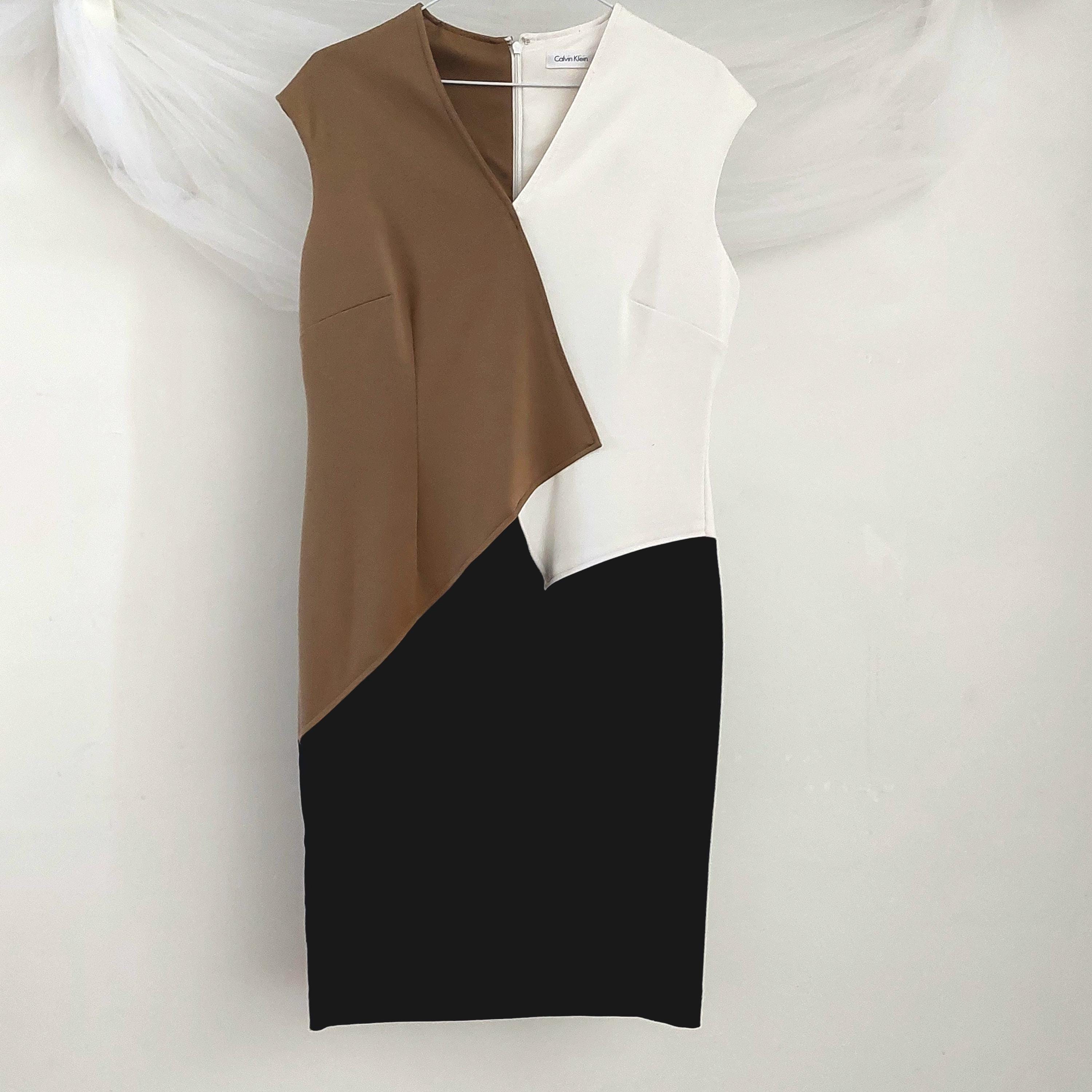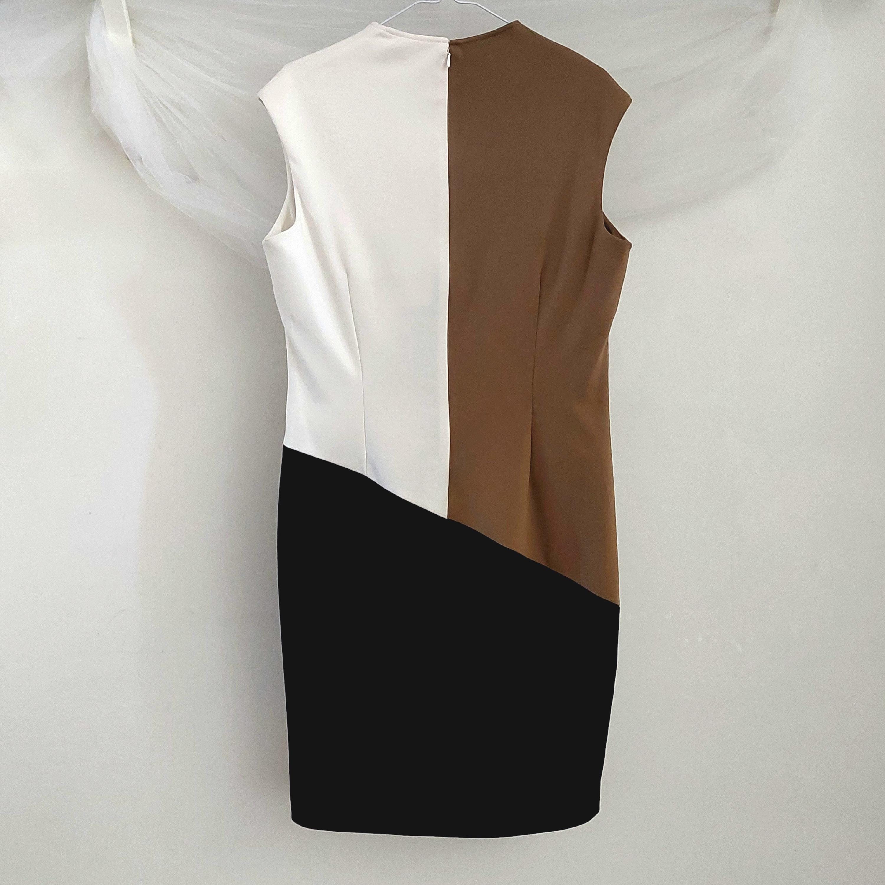 Vintage Calvin Klein color-block sheath or fitted career dress with v-neckline, featuring a distinctive tan (latte/caramel), white (cream/chalk) and black panelled design.