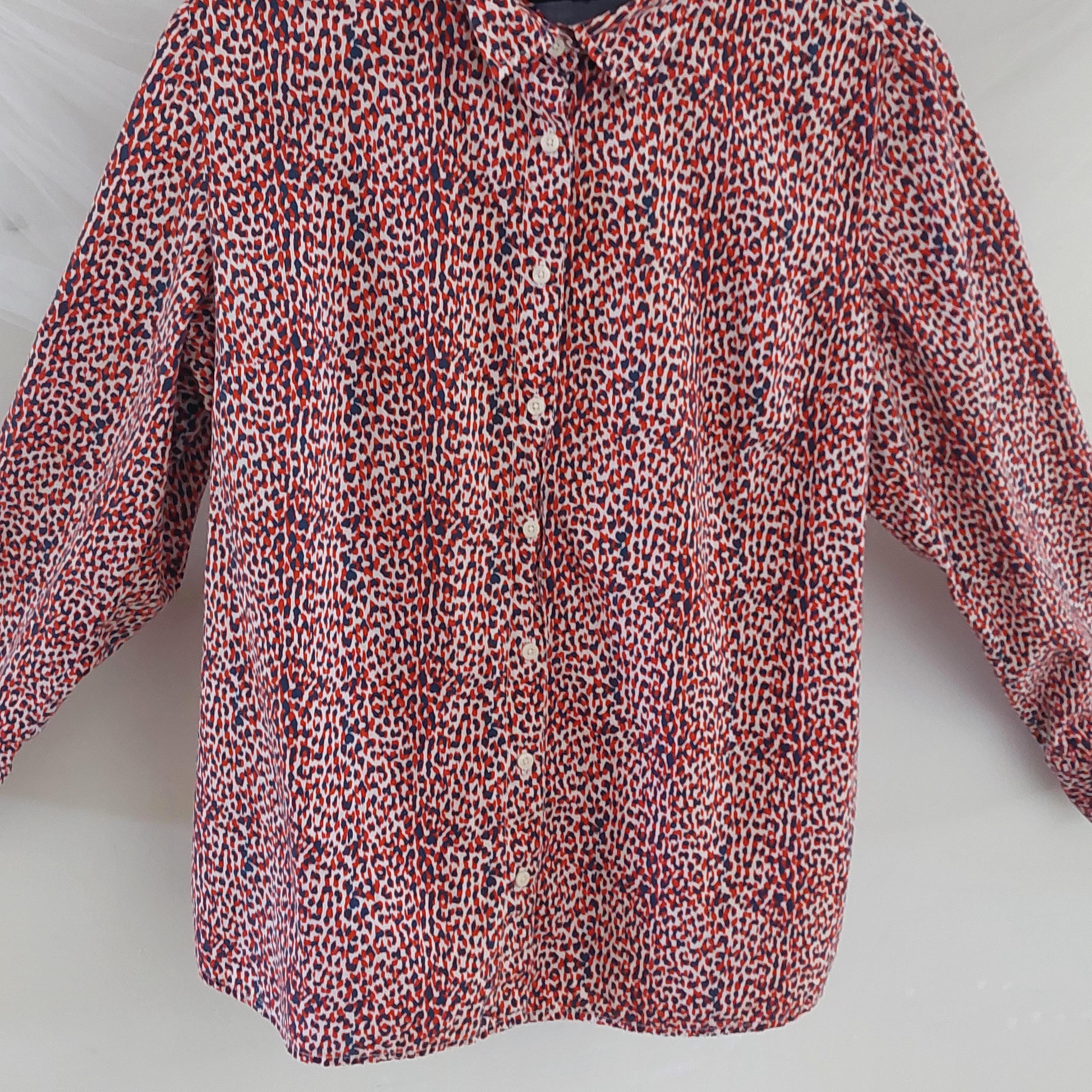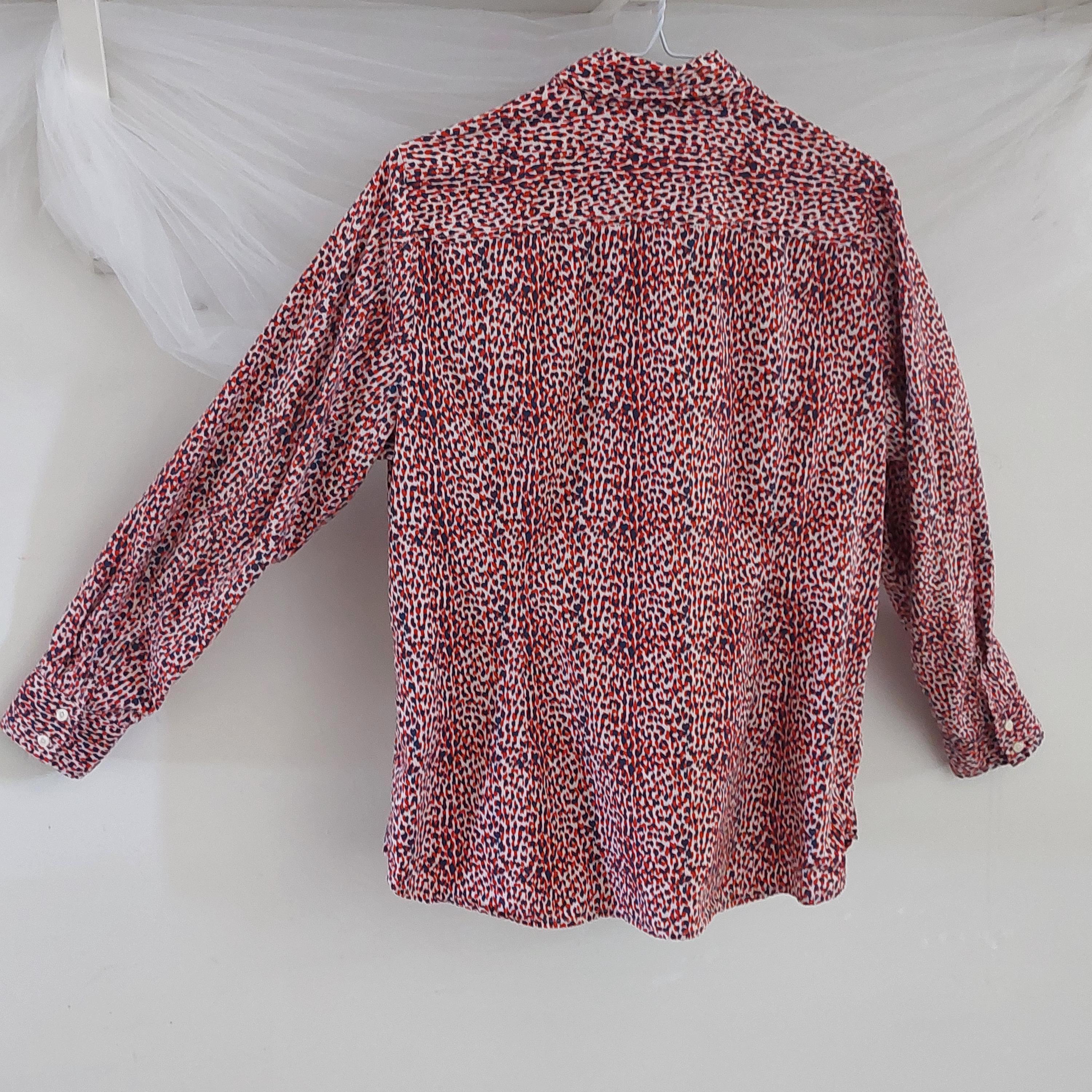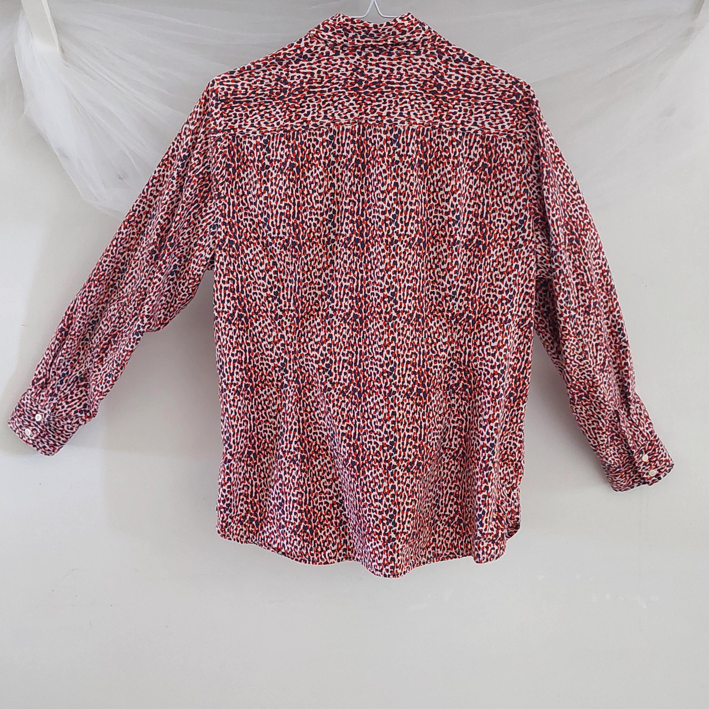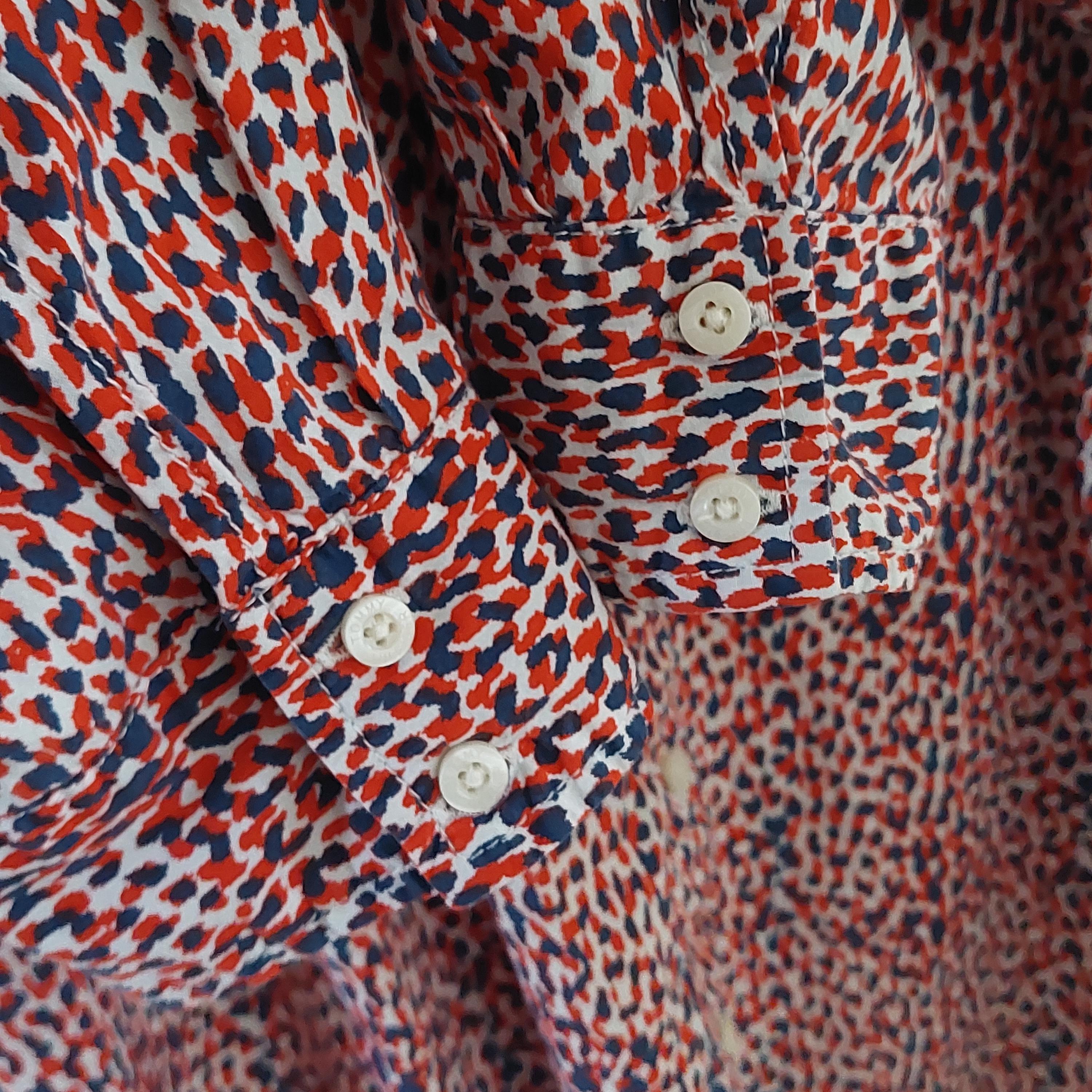 Featuring a vibrant red and blue micro pattern that resembles a stylized animal or abstract floral print.