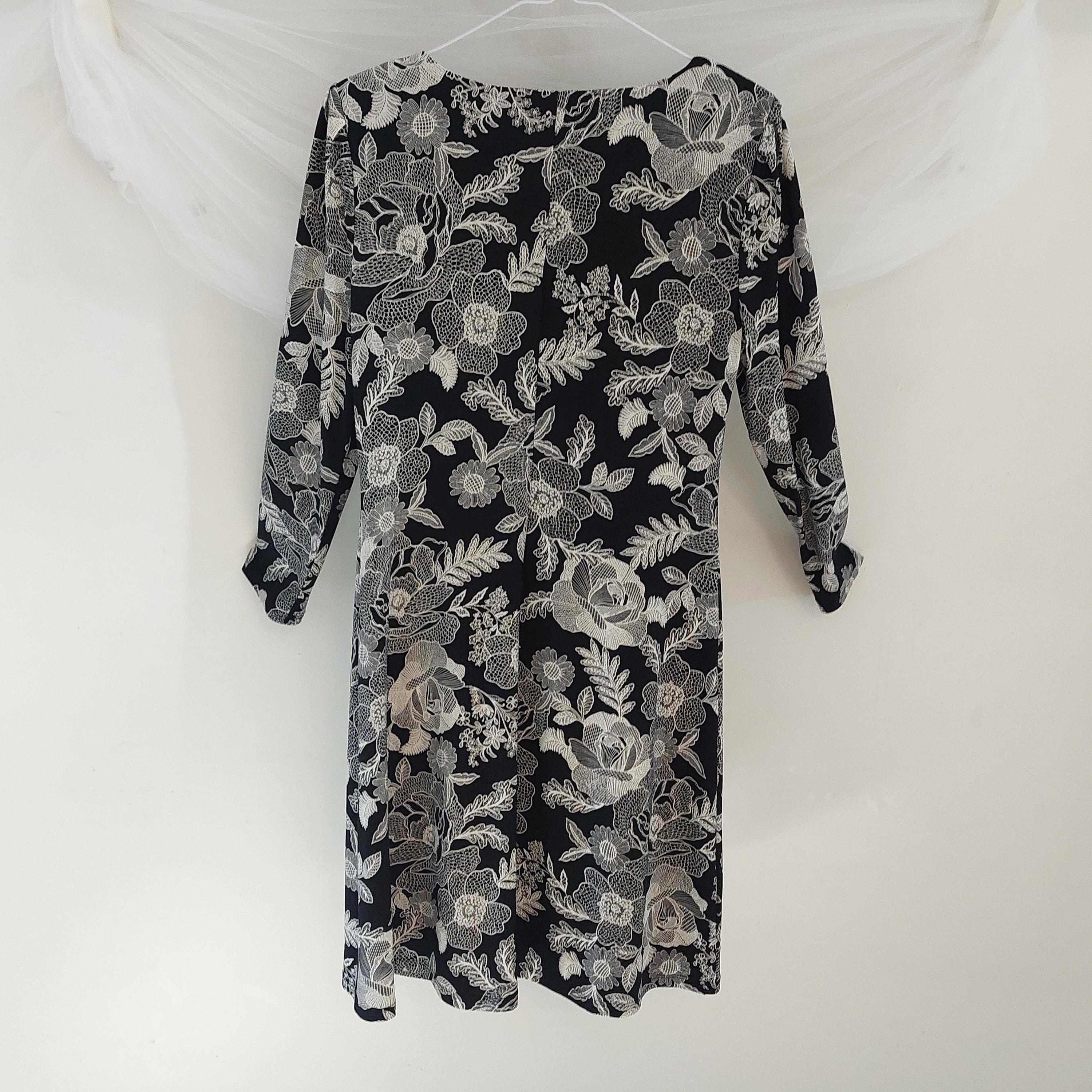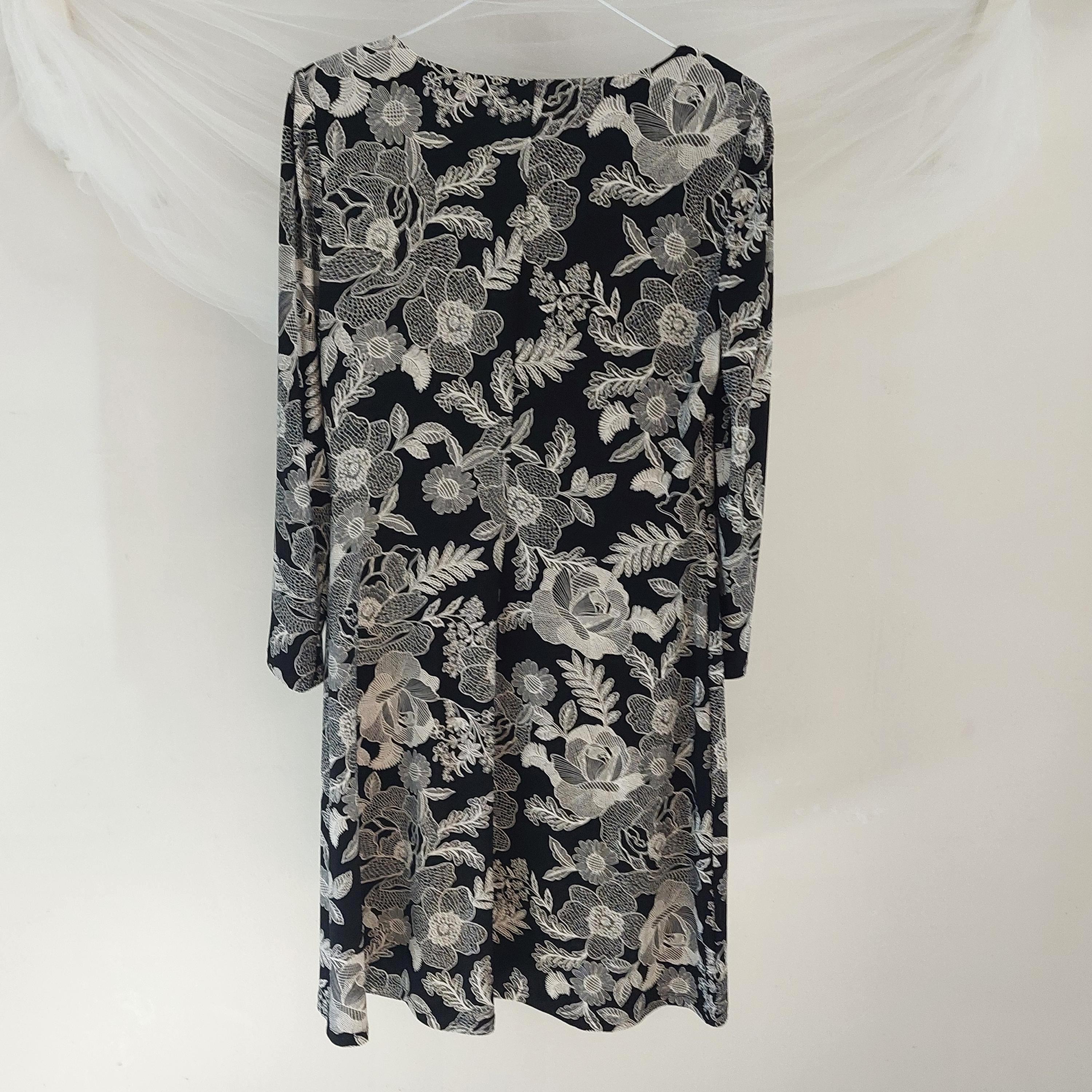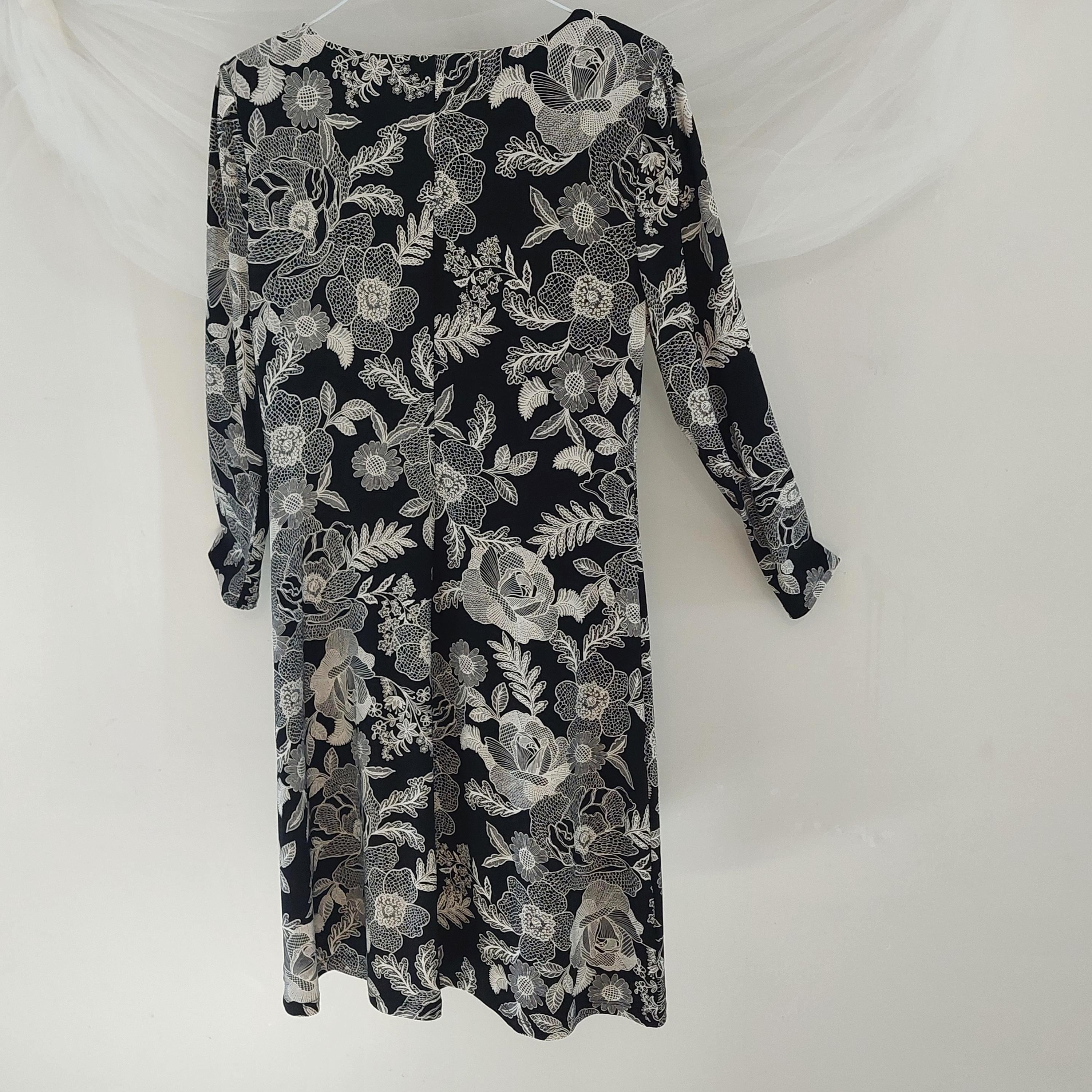 Tommy Hilfiger floral print black & cream A-line dress. This dress features a botanical, floral print with a round neckline and long sleeves.