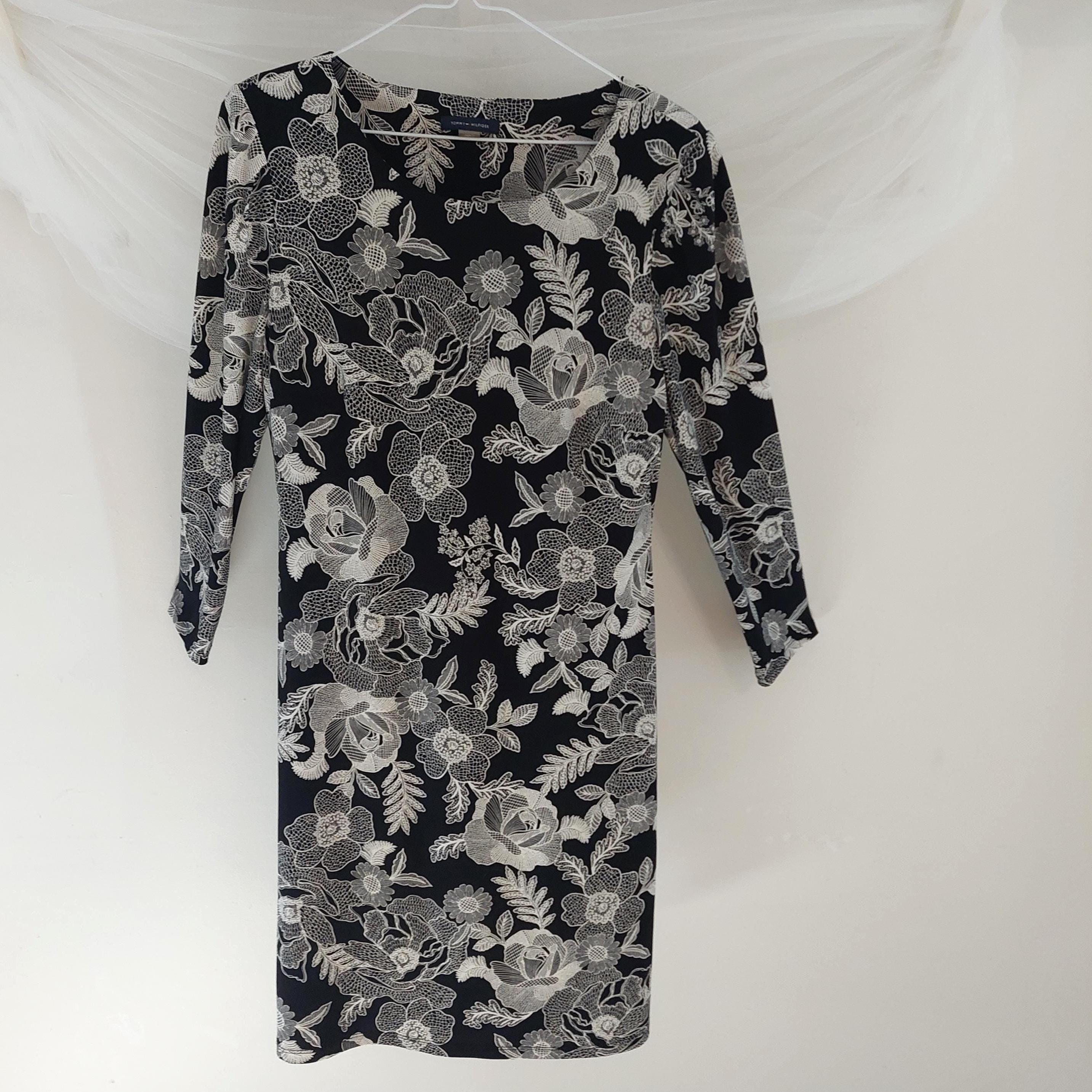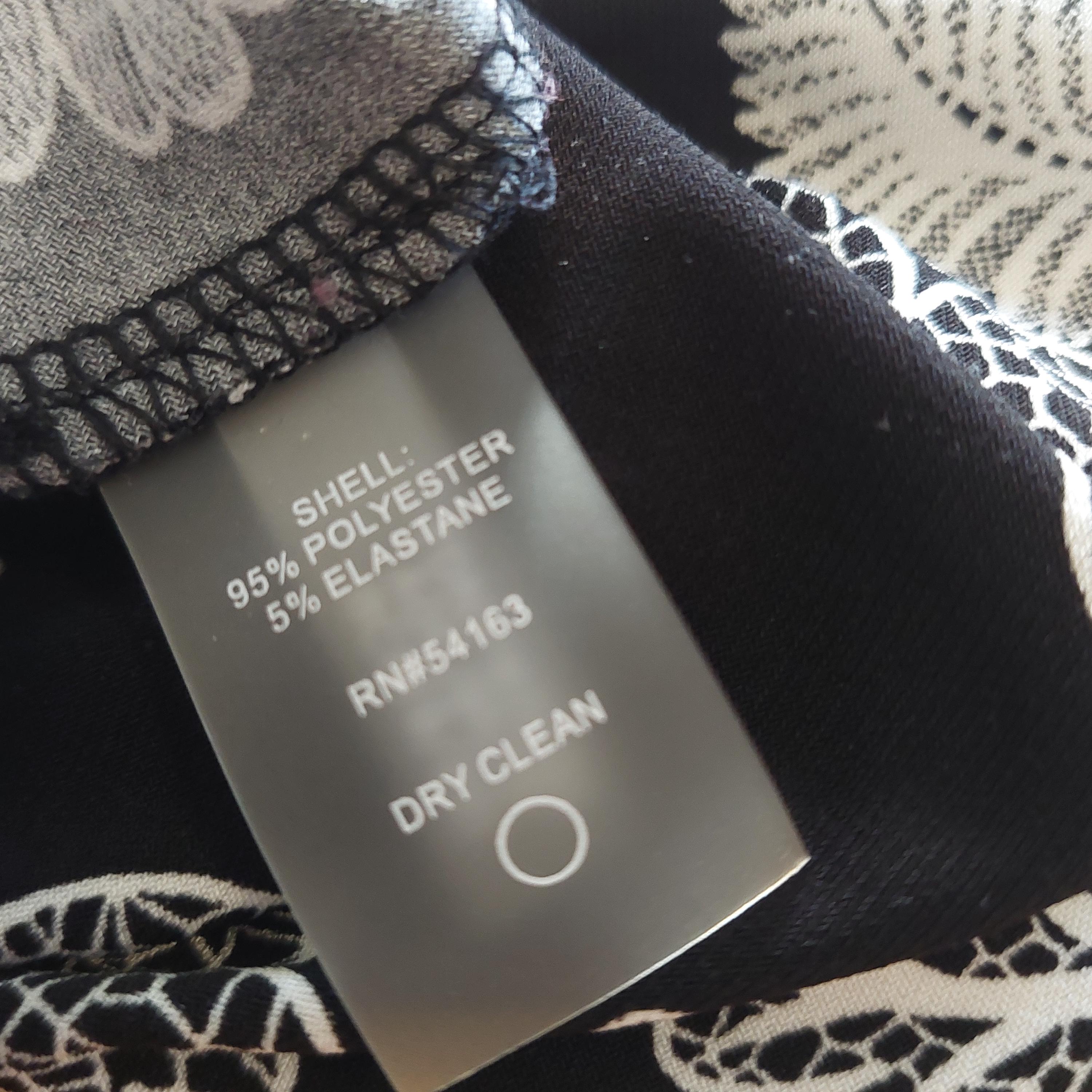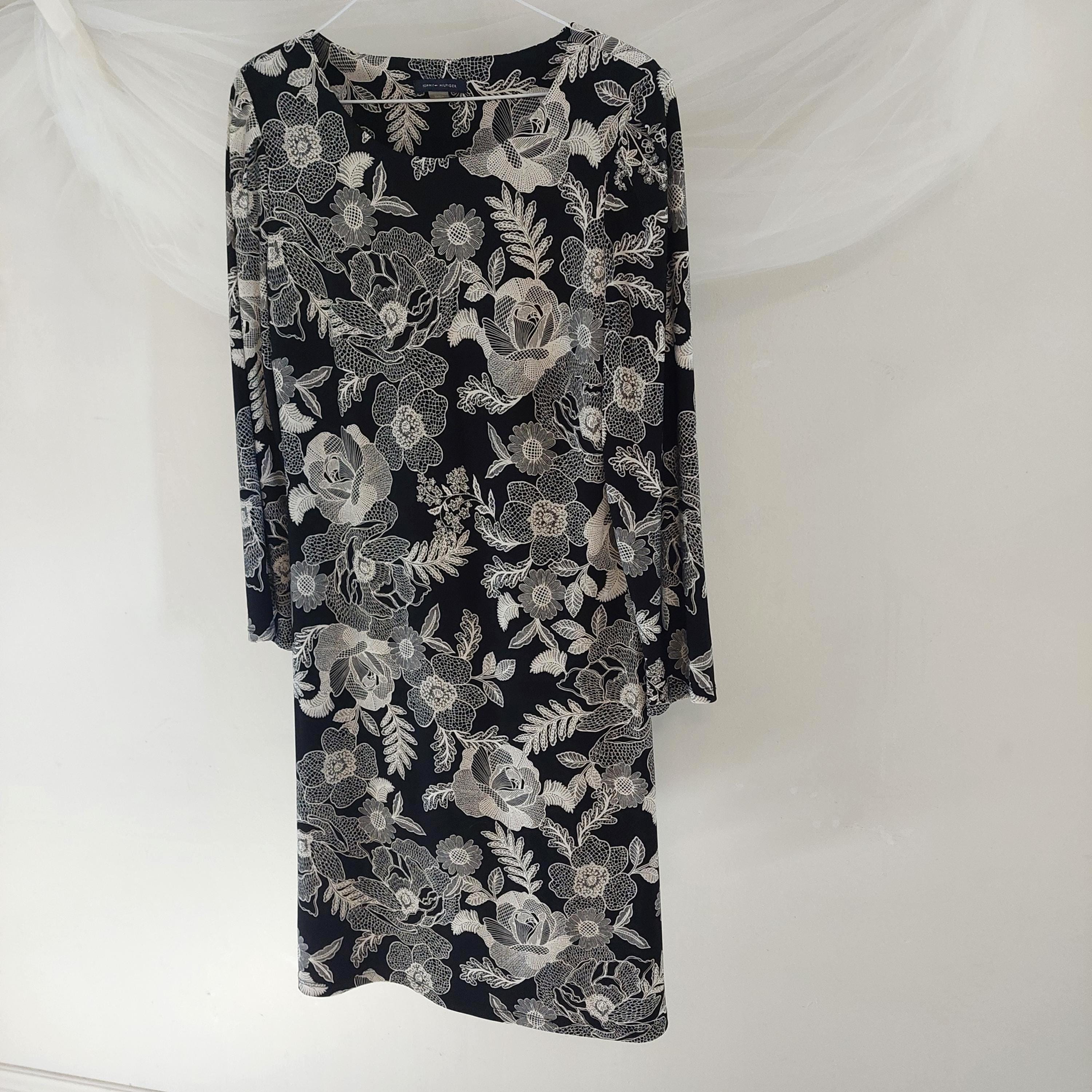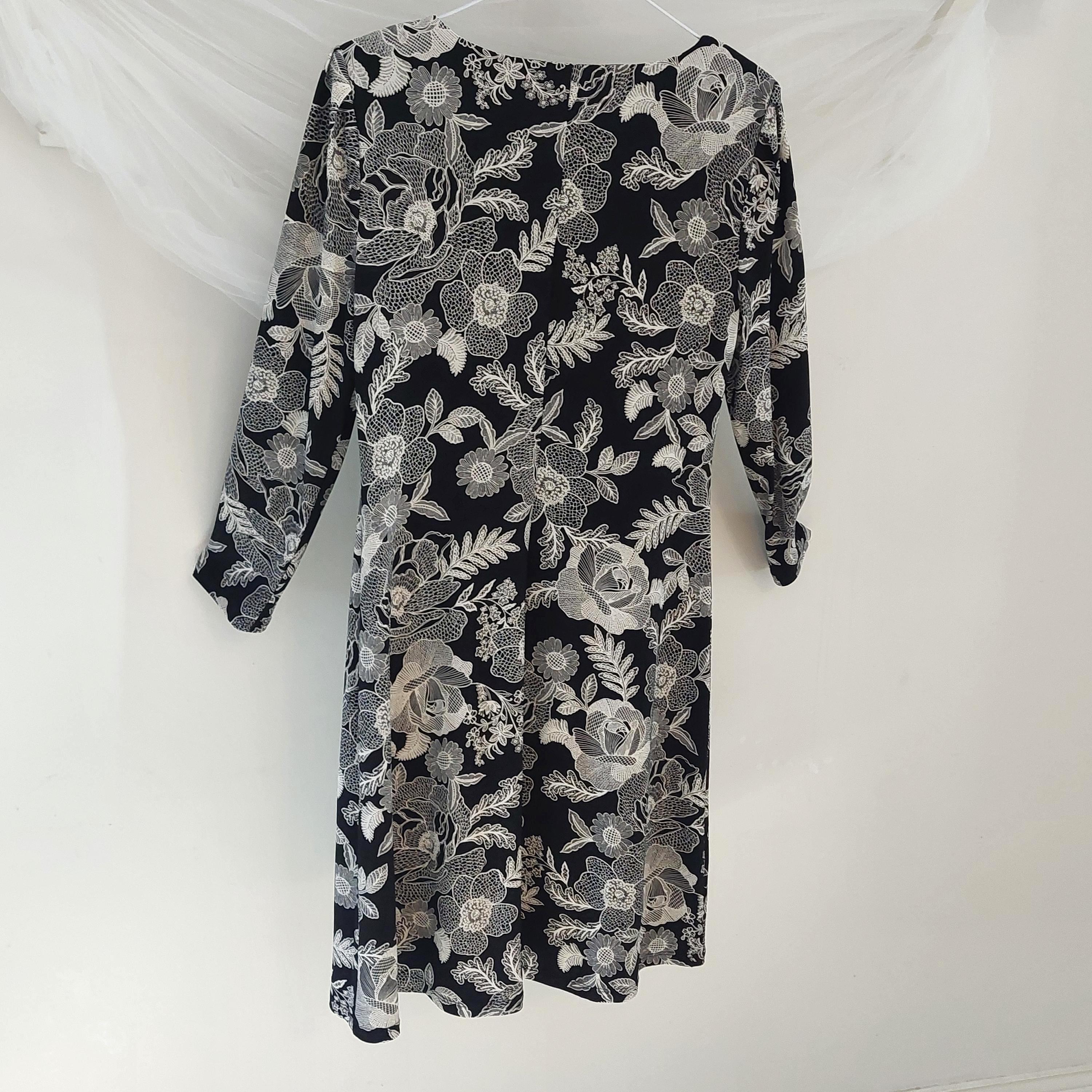 Tommy Hilfiger floral print black & cream A-line dress. This dress features a botanical, floral print with a round neckline and long sleeves.