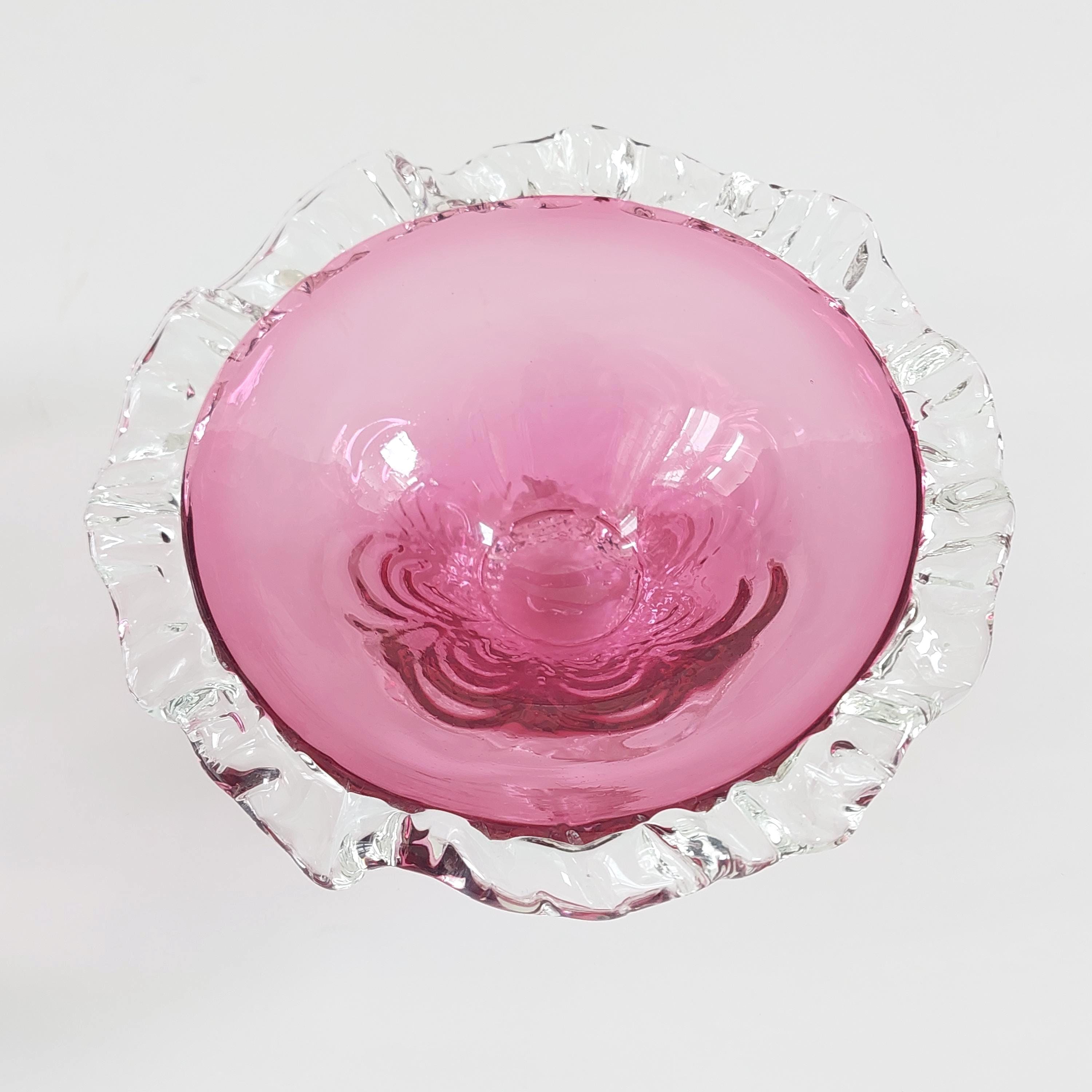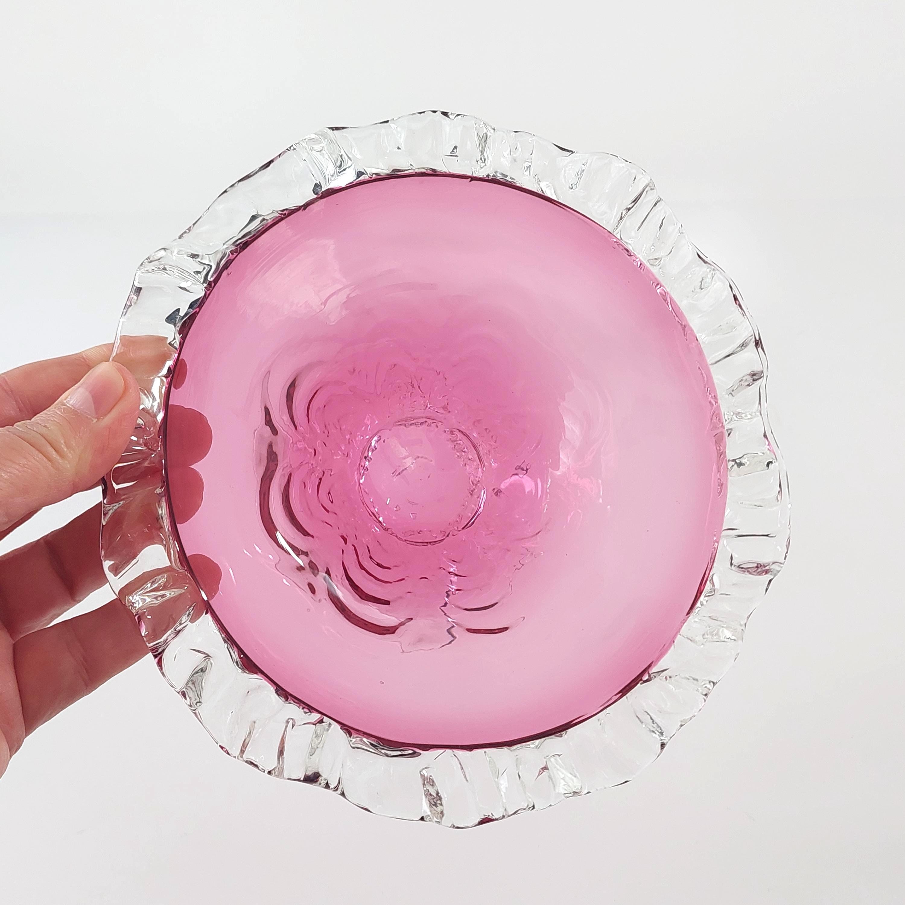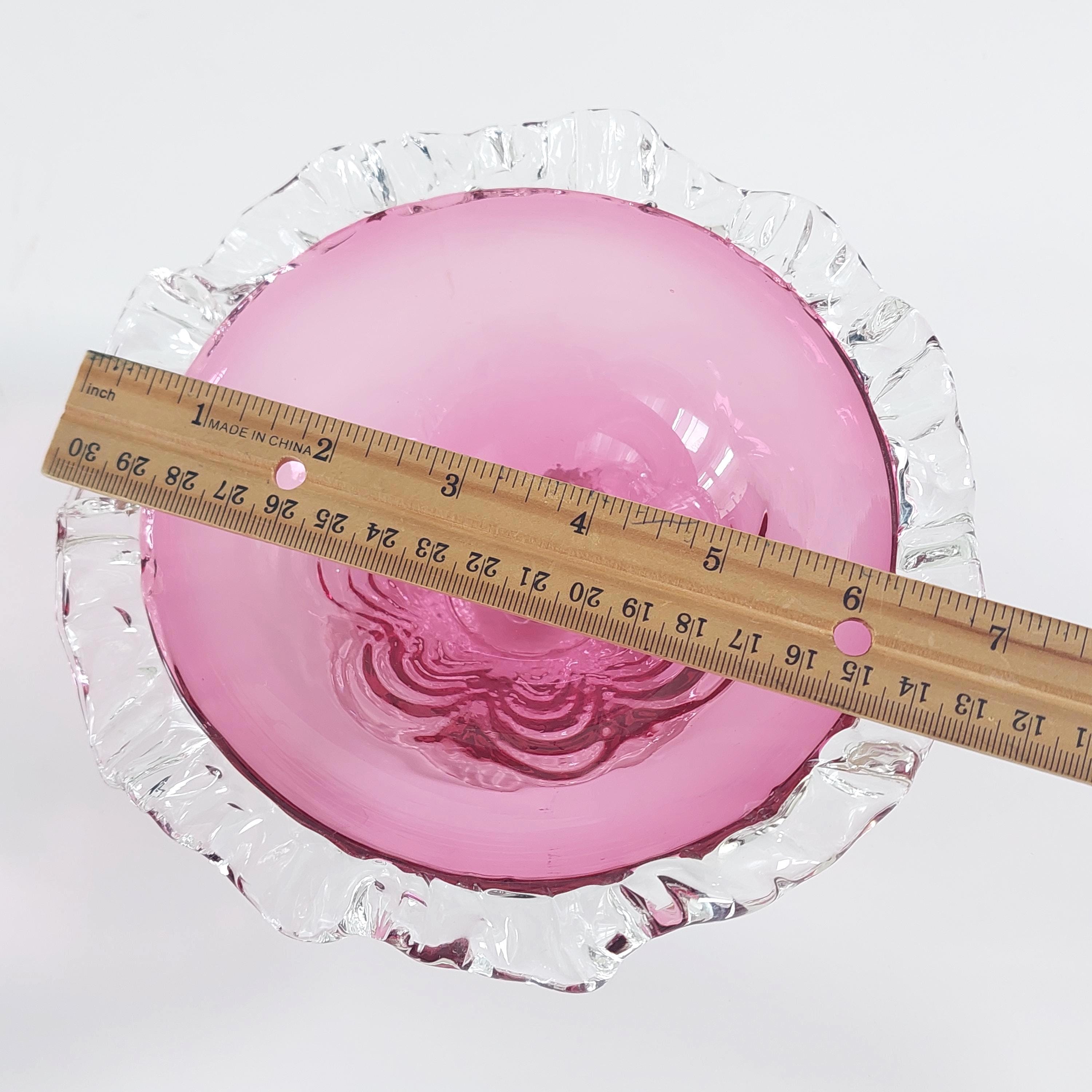 Vintage pink cranberry blown glass candy bowl. Pink swirled glass with a clear pedestal base similar to flower petals. Clear ruffled / crimped rim.