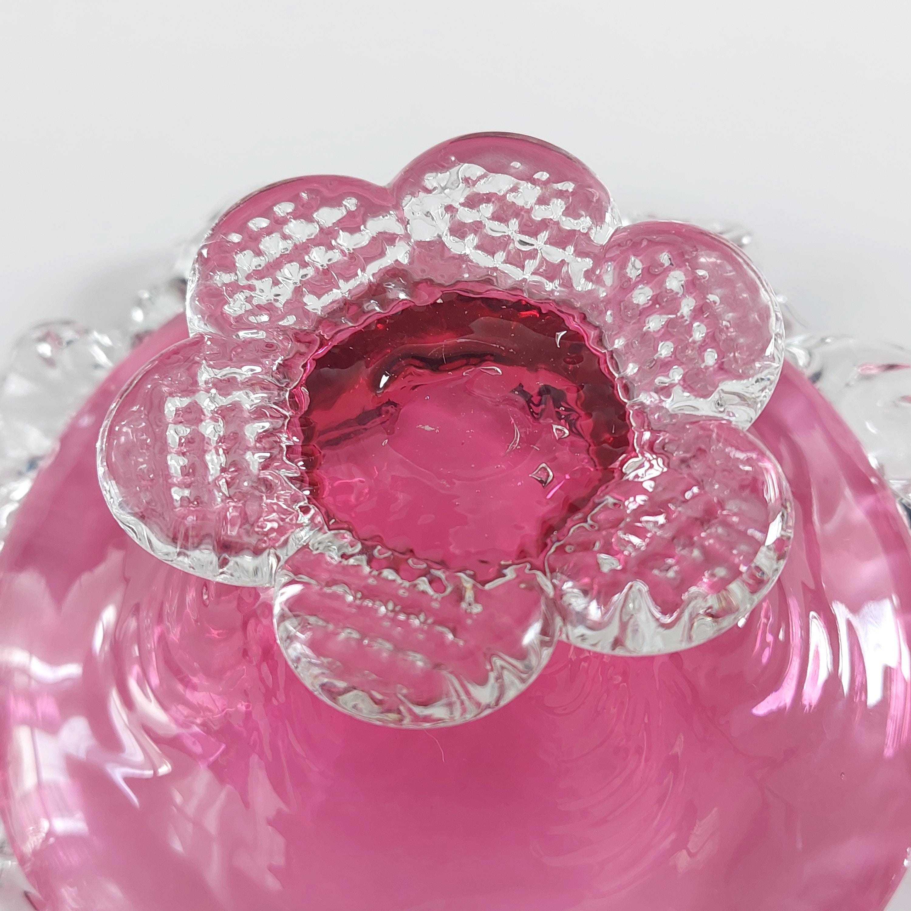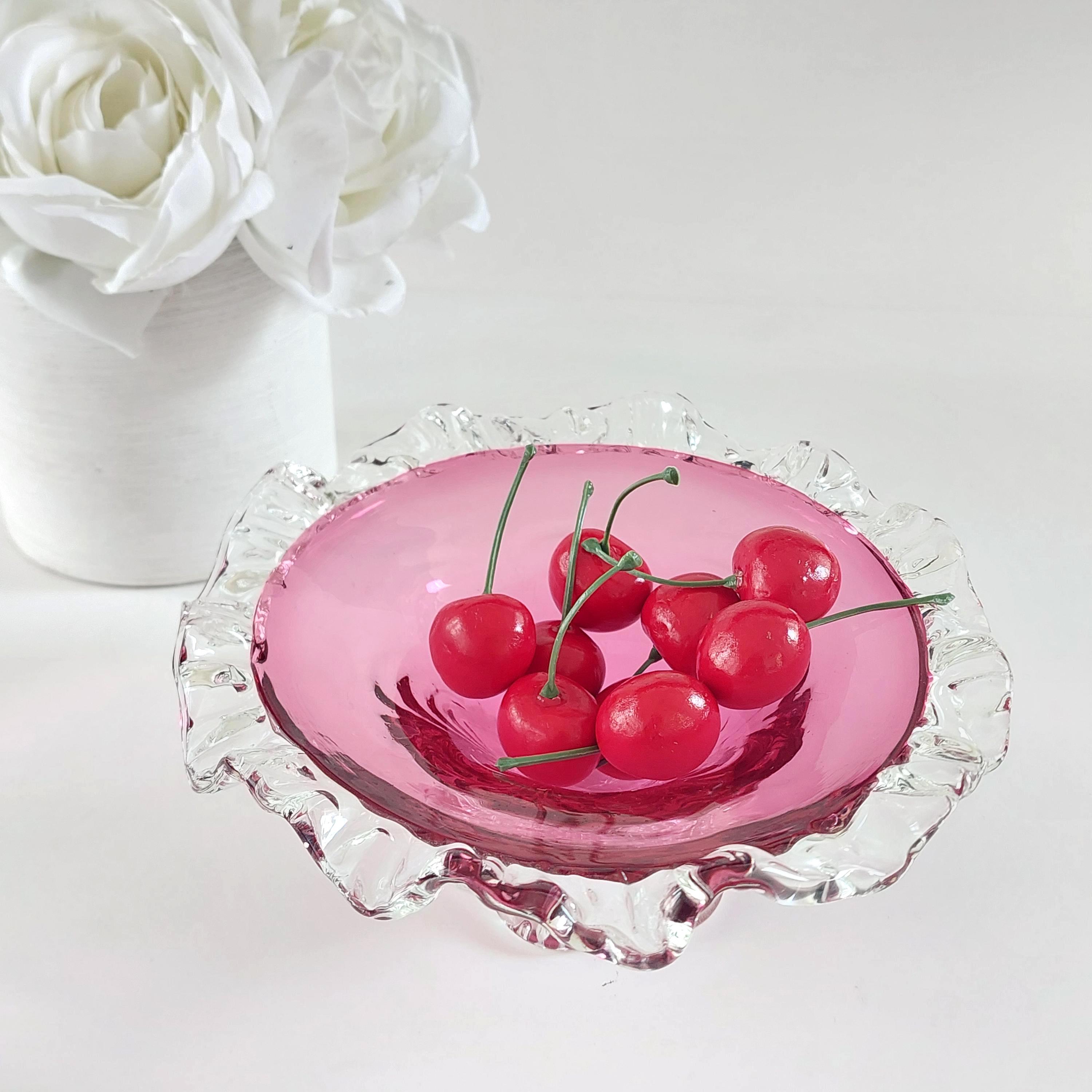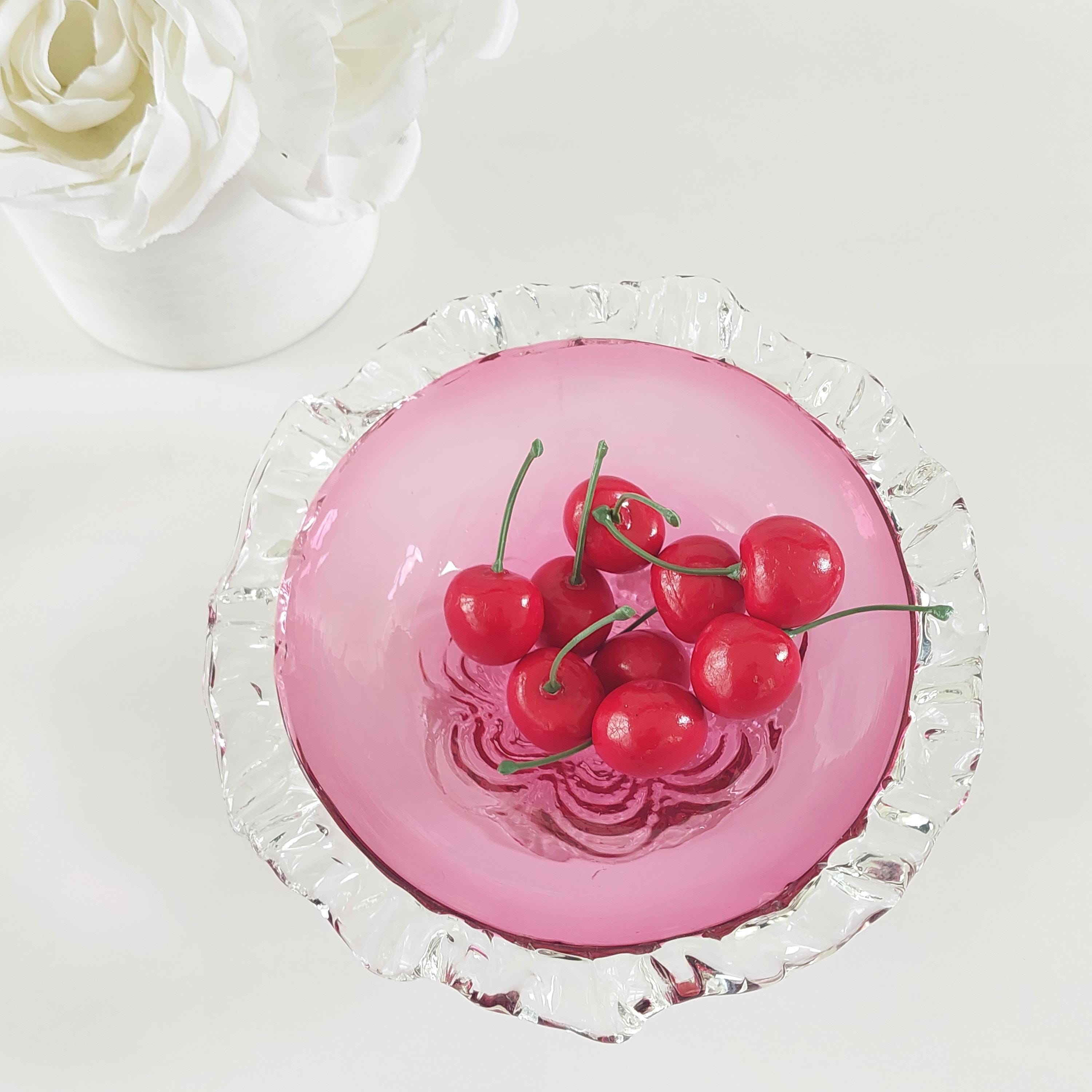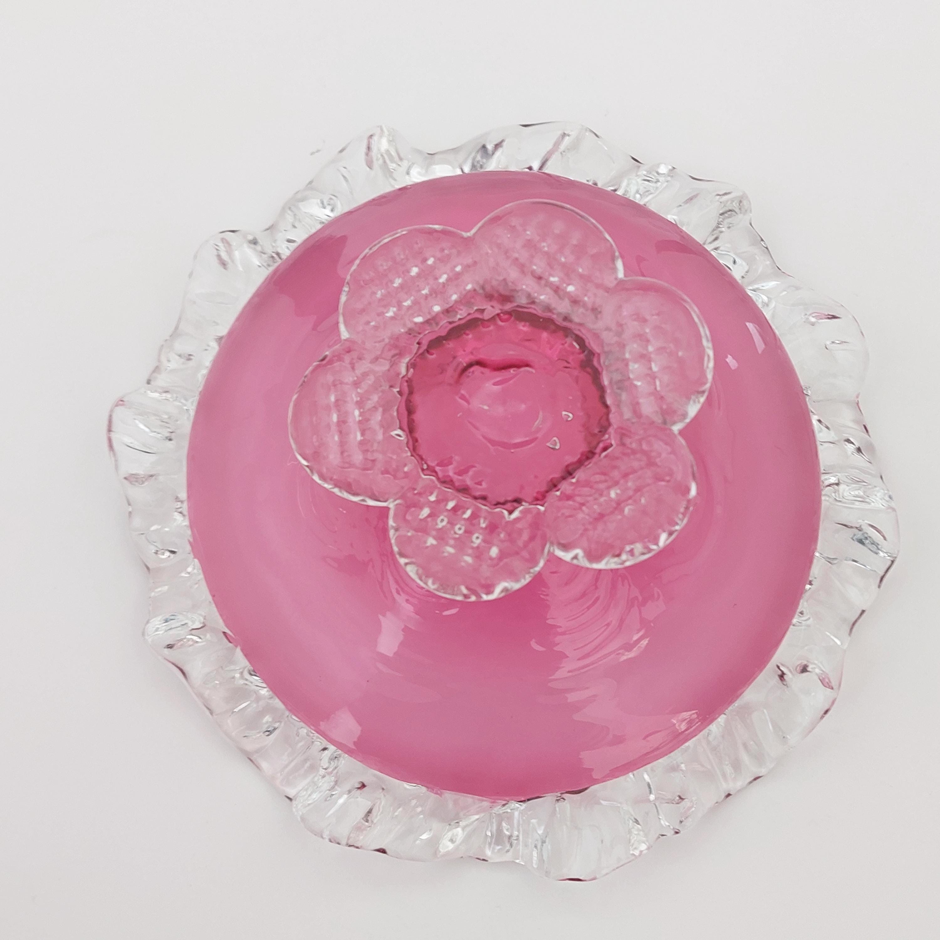 Vintage pink cranberry blown glass candy bowl. Pink swirled glass with a clear pedestal base similar to flower petals. Clear ruffled / crimped rim.