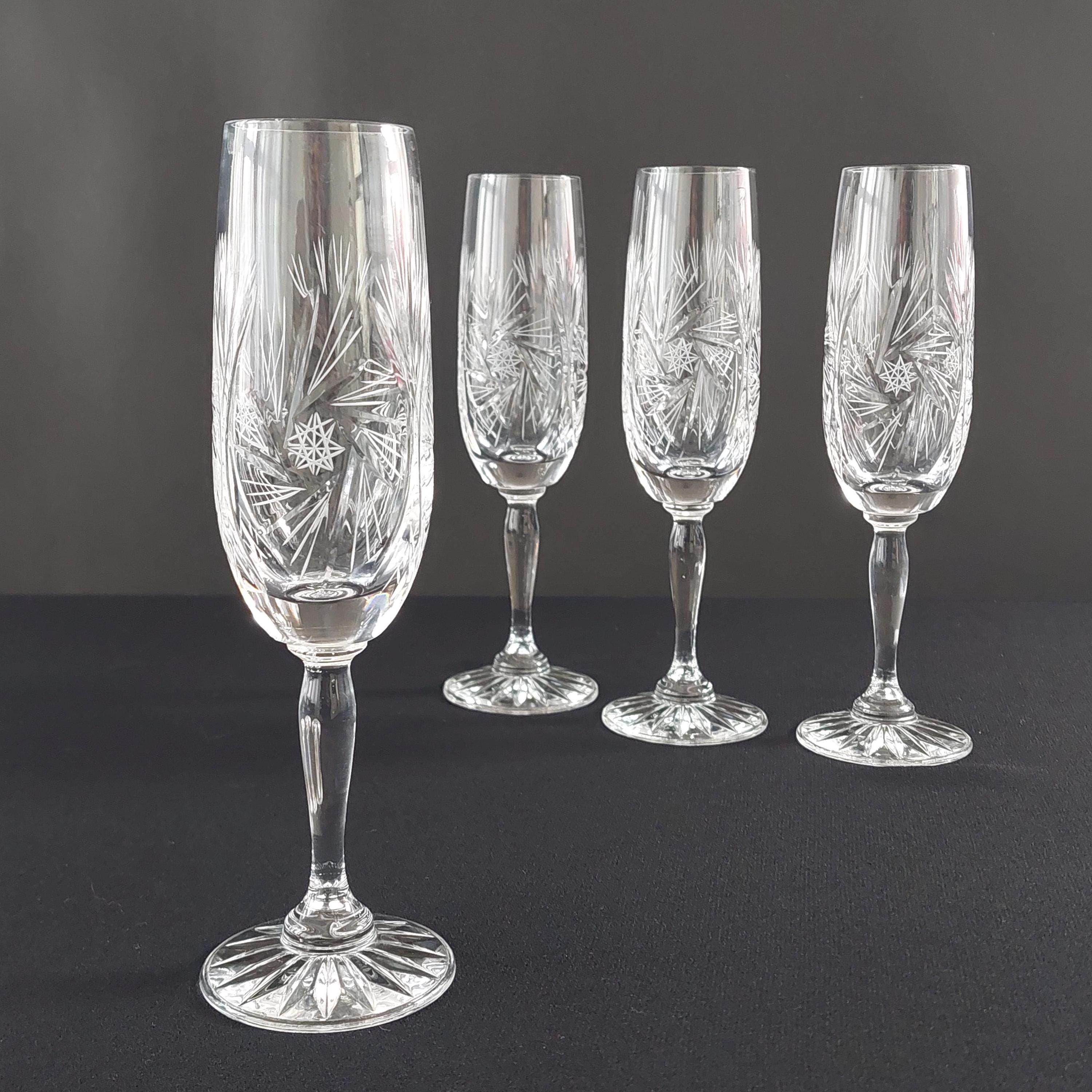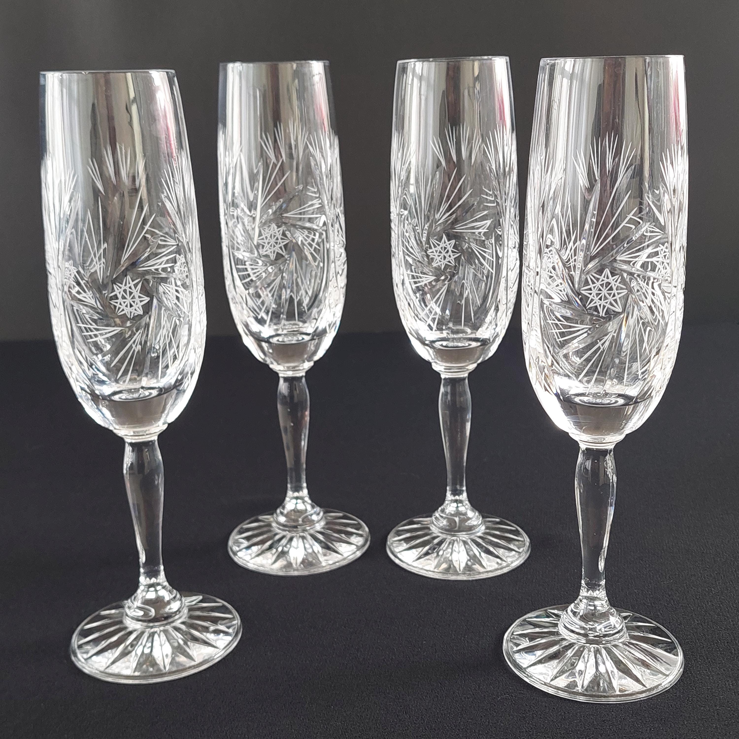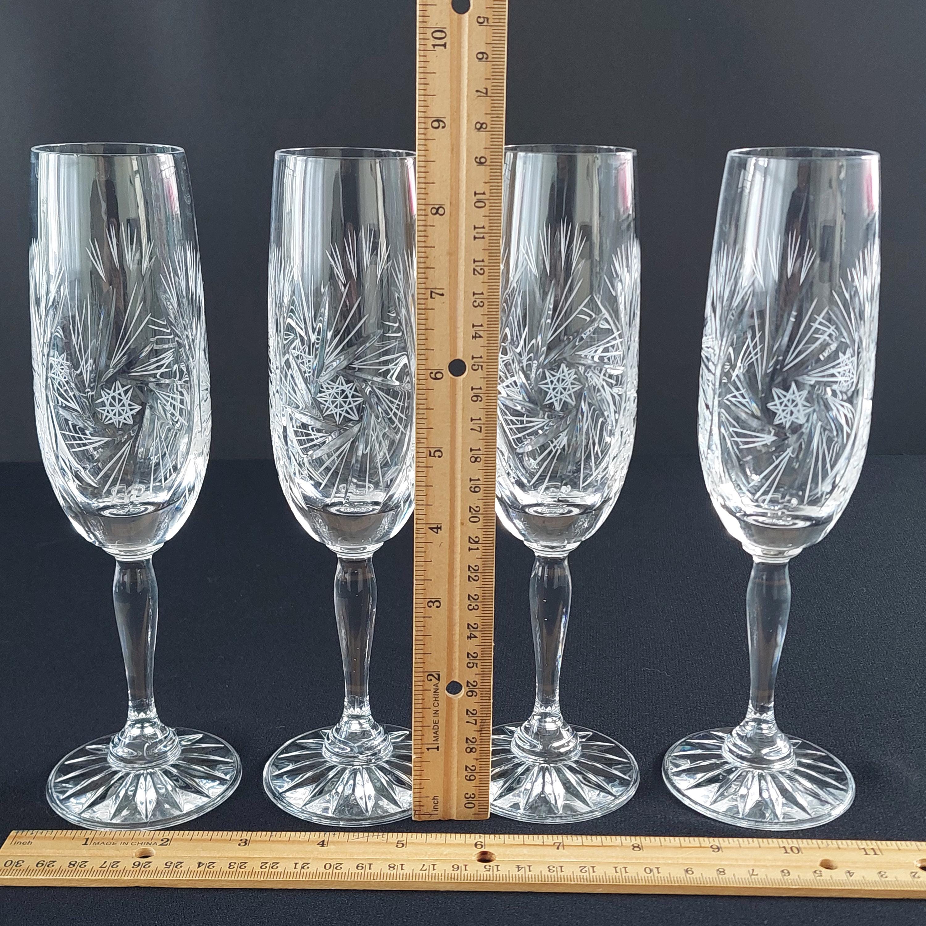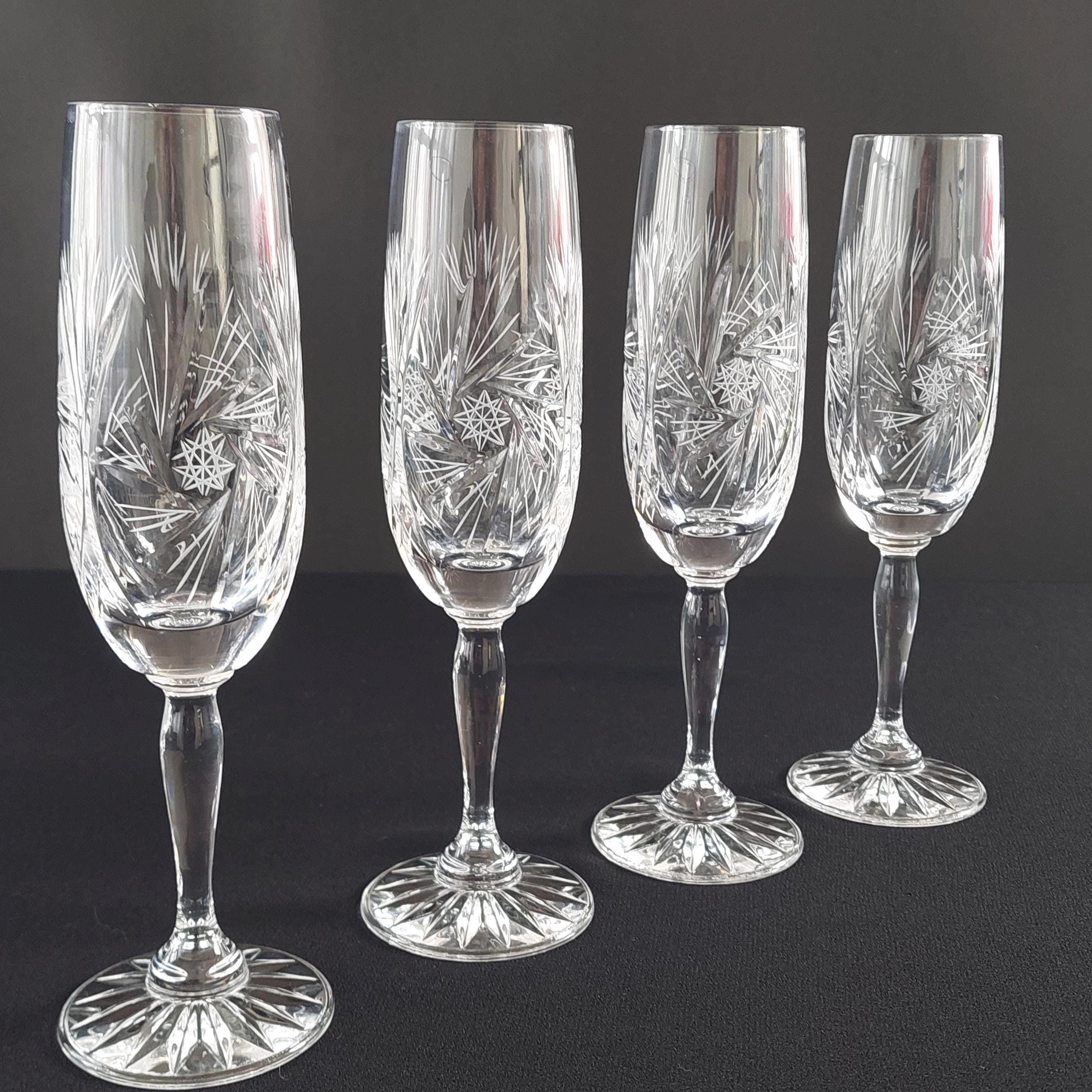 Vintage pinwheel crystal champagne flutes. Classic design is characterized by a rotating star-like motif, often referred to as a "pinwheel" or "starburst," Flutes make a lovely 'ping'
