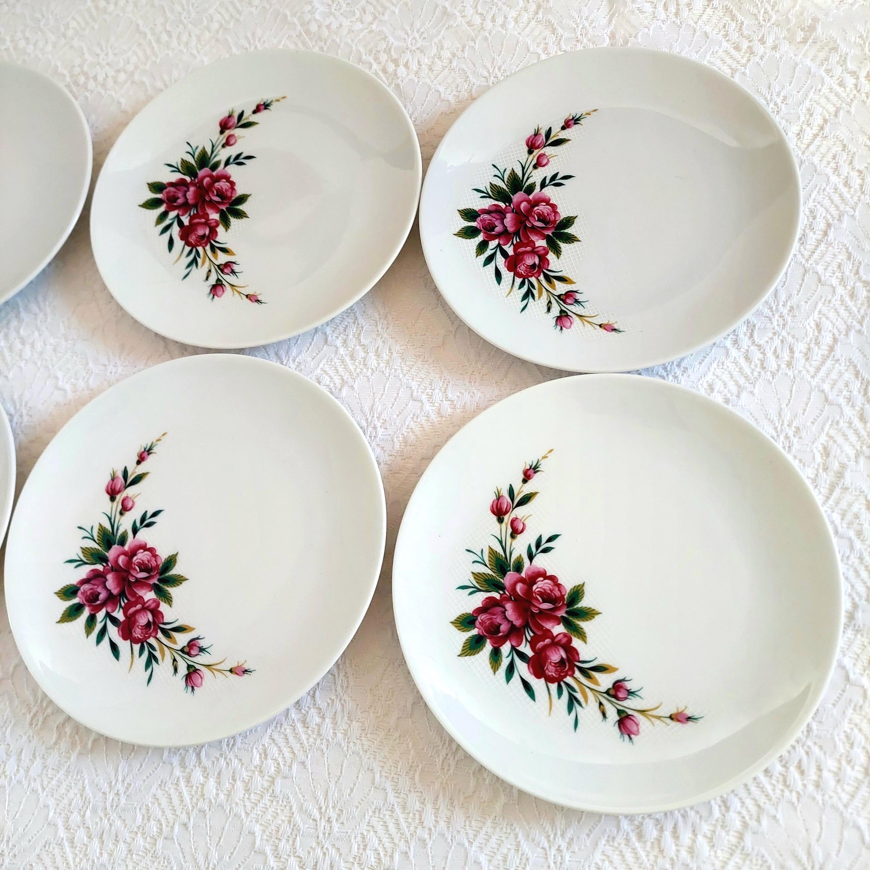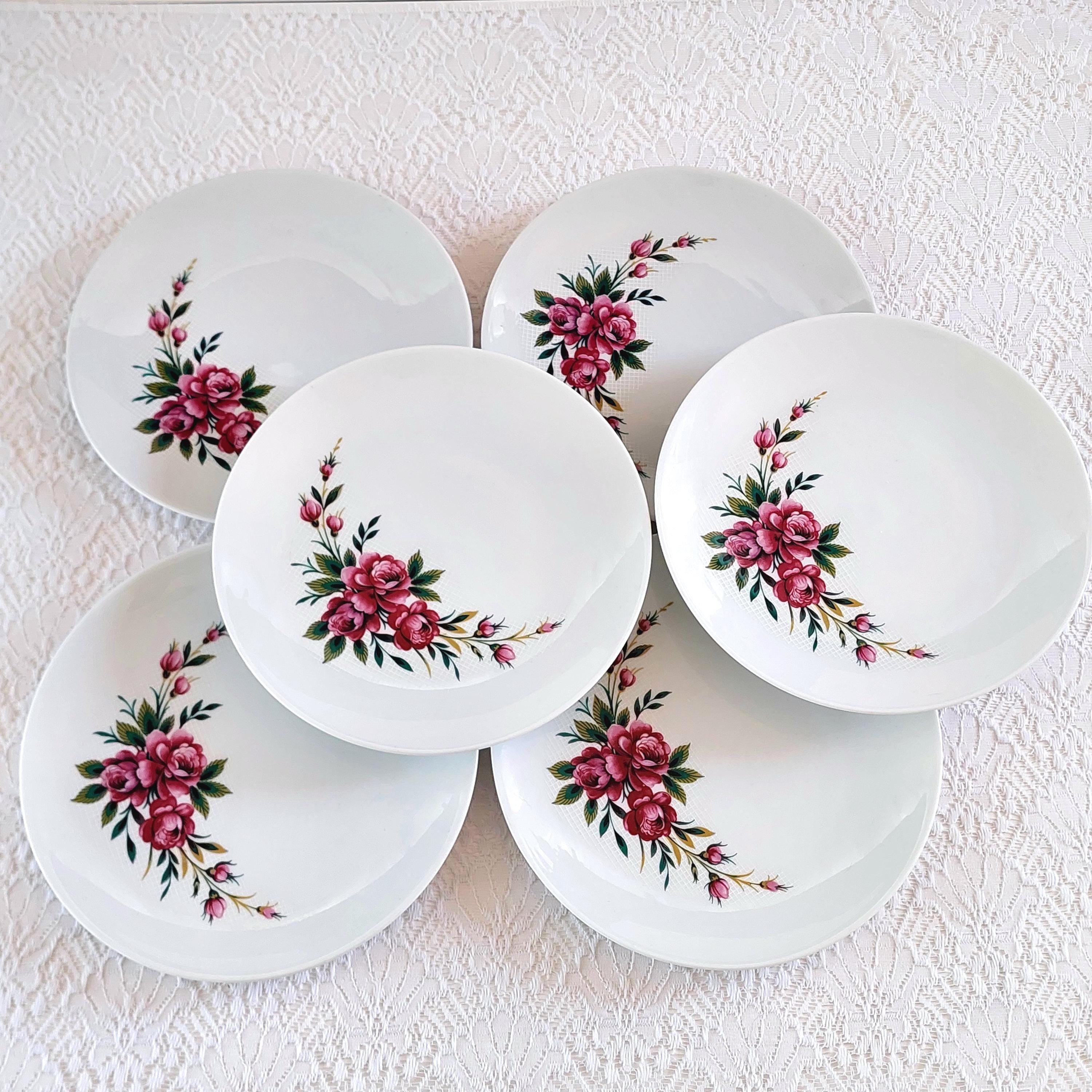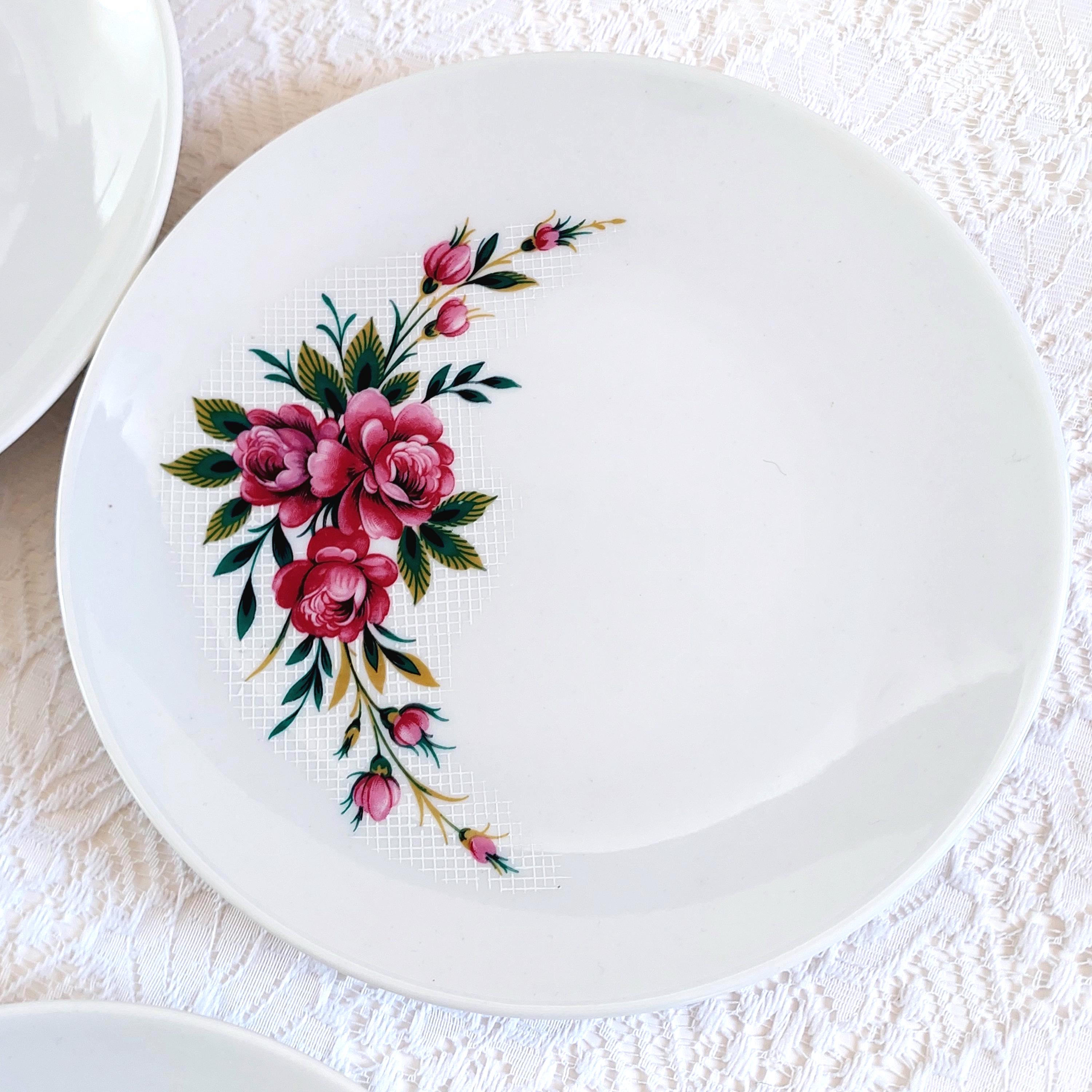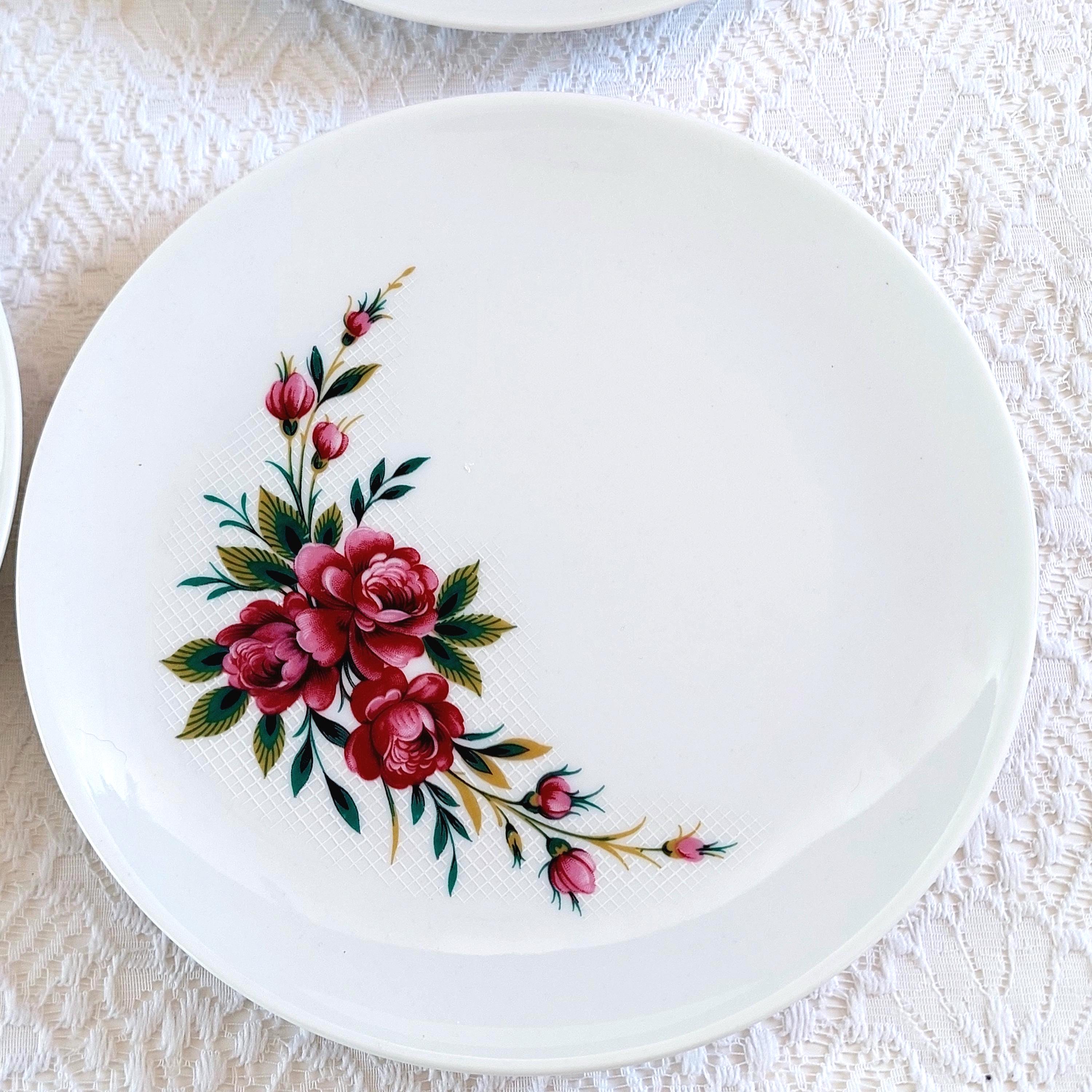 Vintage Schumann Germany snow-white porcelain dessert plates featuring clusters of pink roses on a white lattice or crosshatch background. Made in Germany, circa 1950-1960s