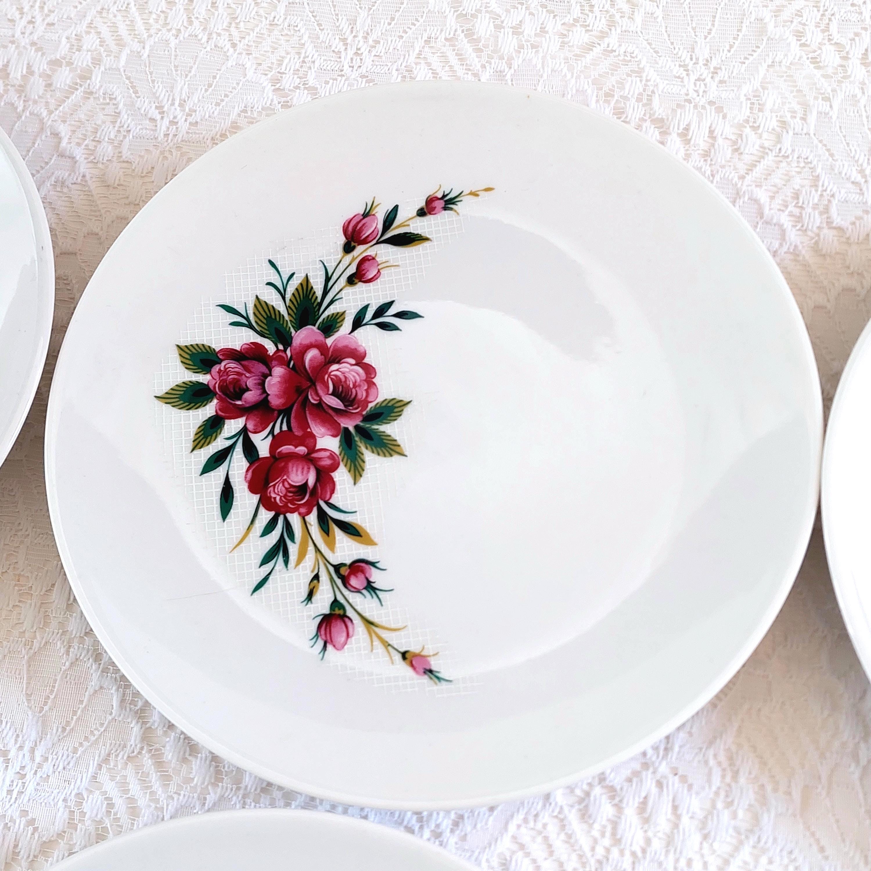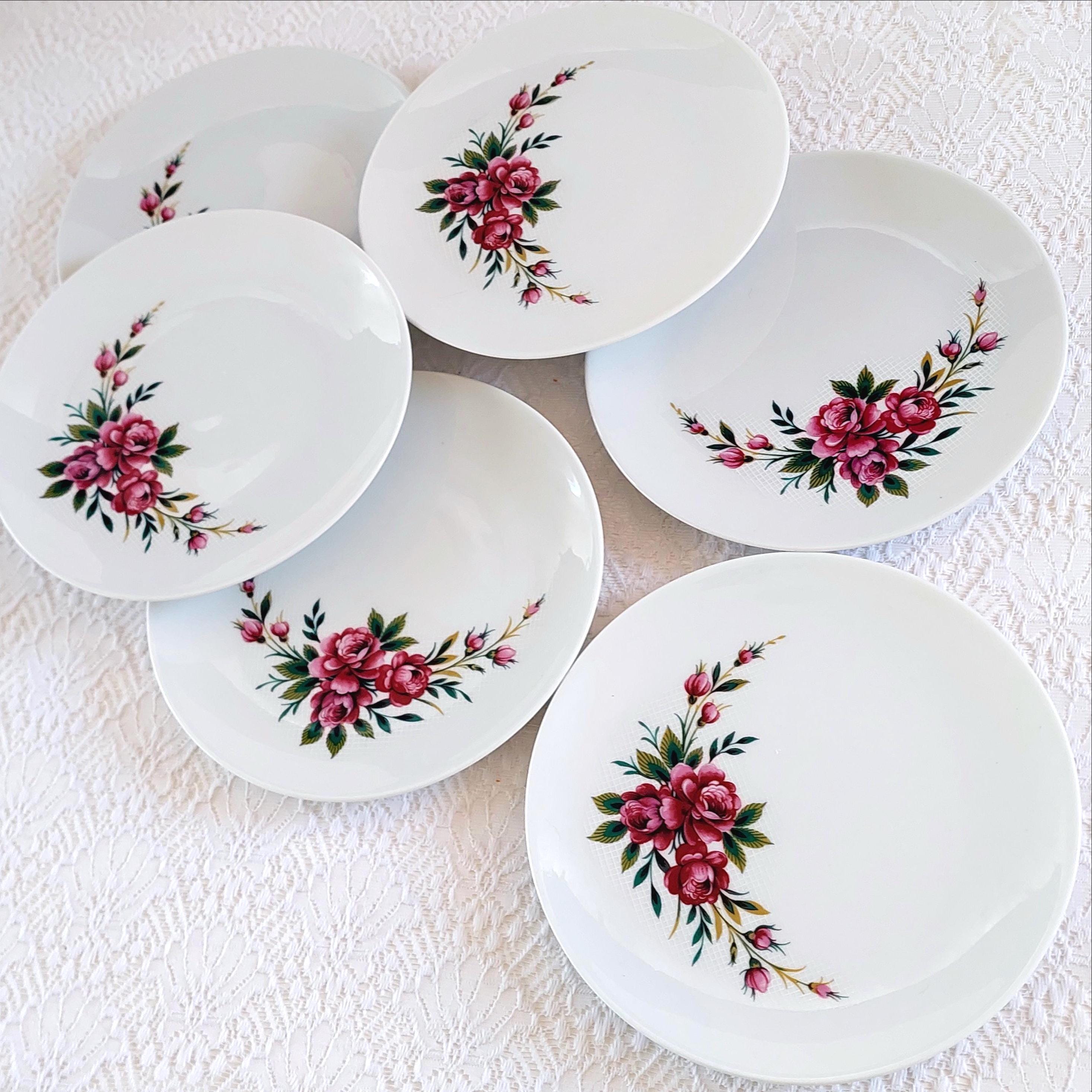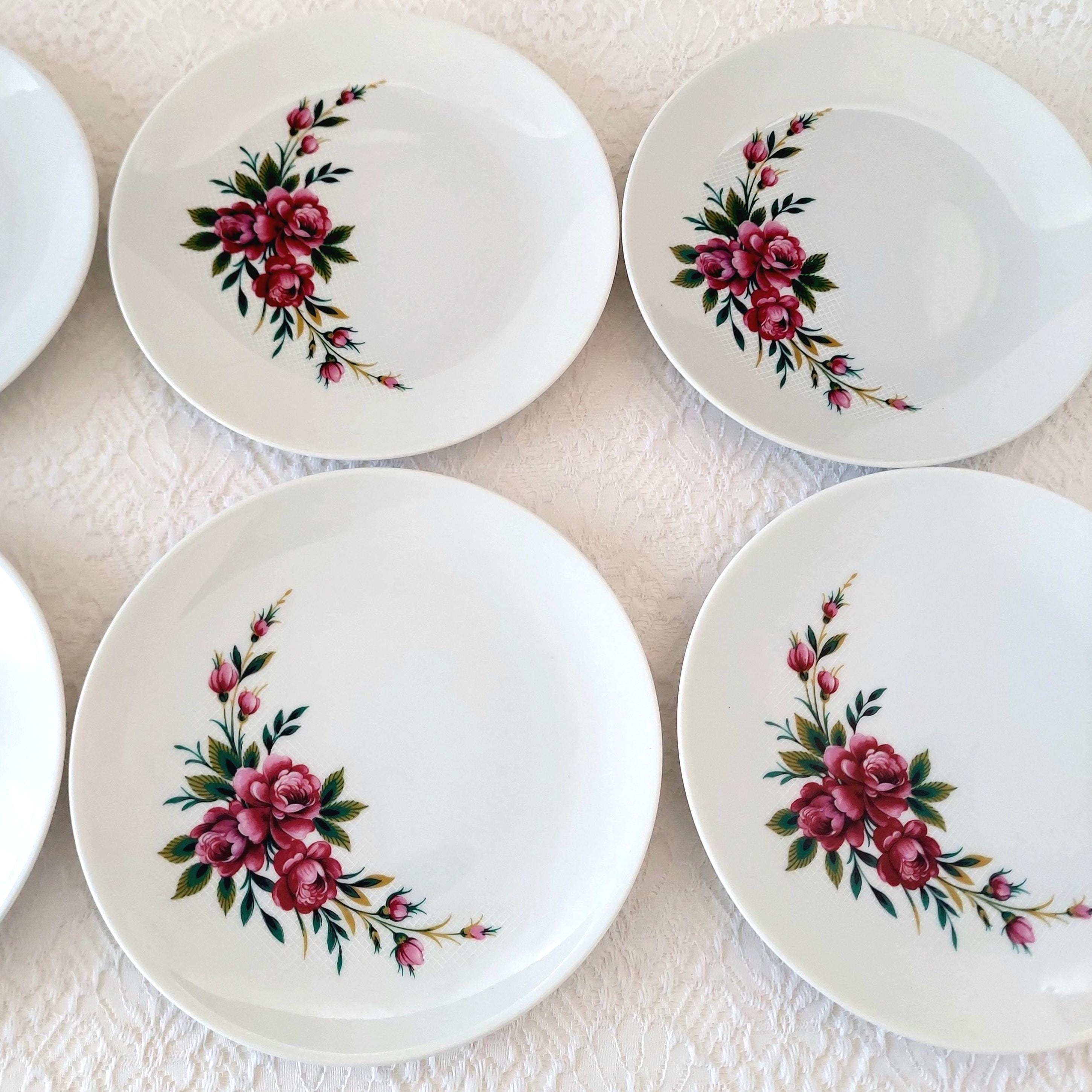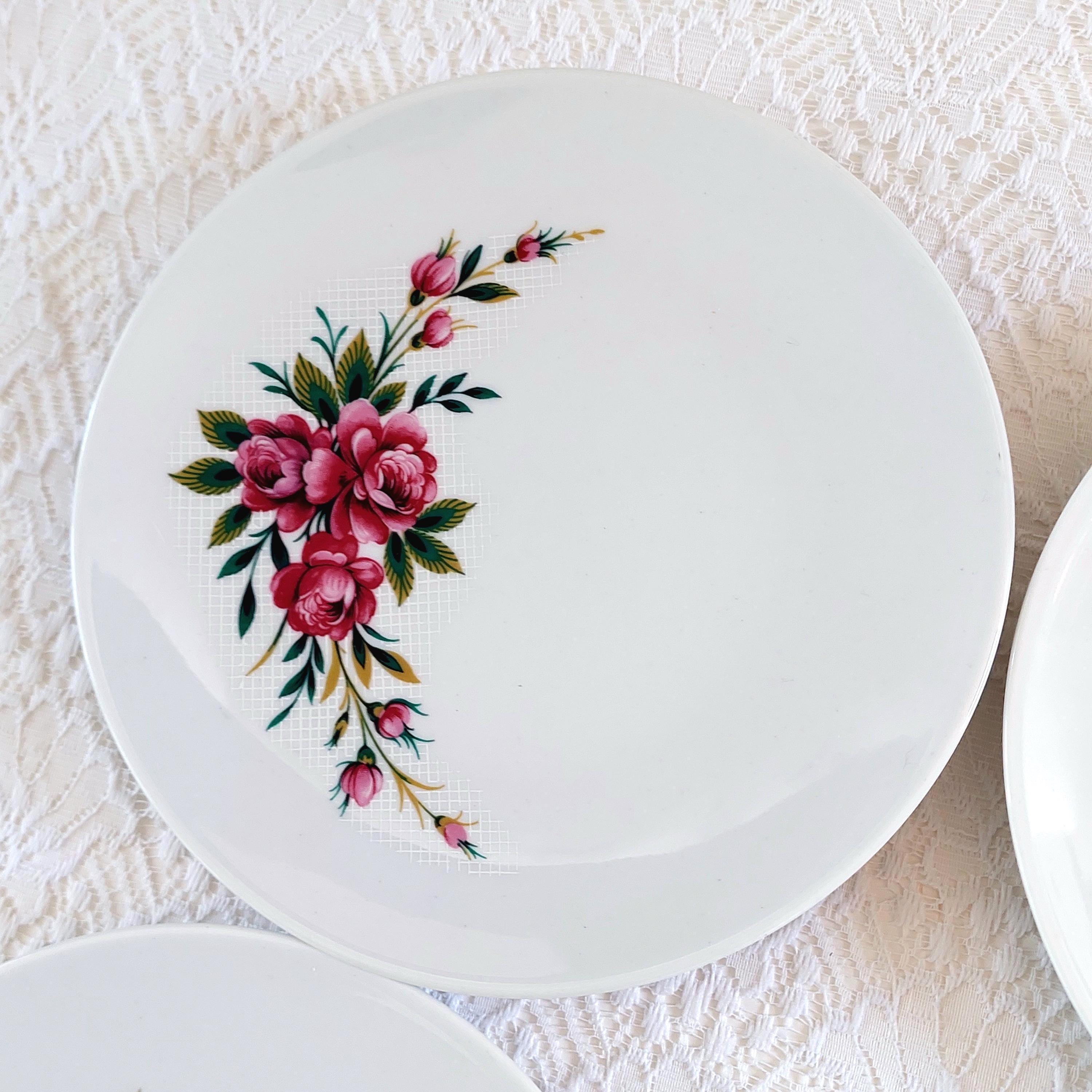 Vintage Schumann Germany snow-white porcelain dessert plates featuring clusters of pink roses on a white lattice or crosshatch background. Made in Germany, circa 1950-1960s